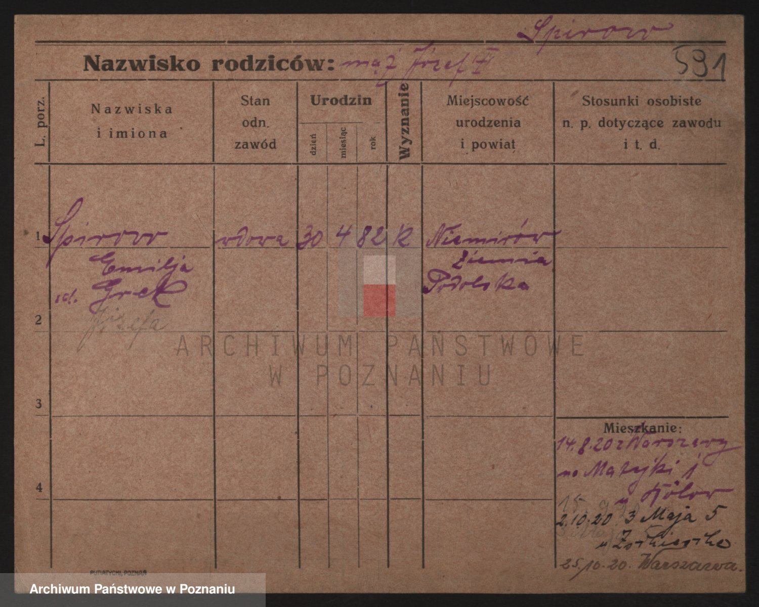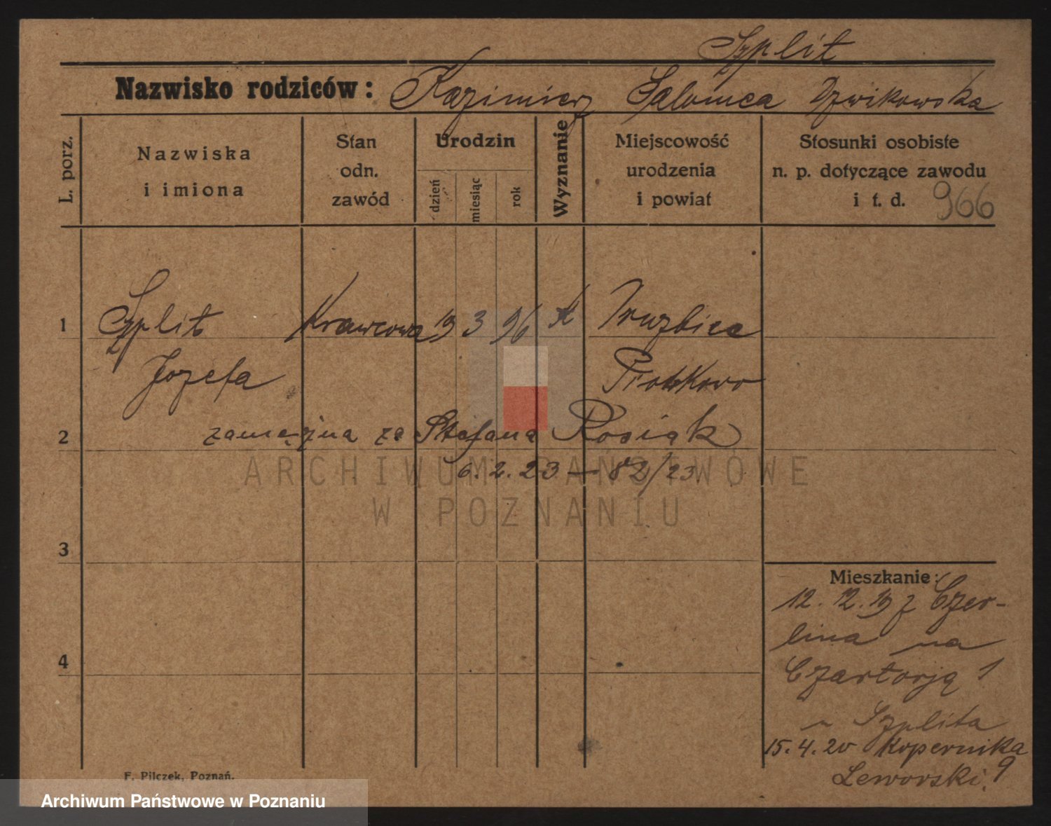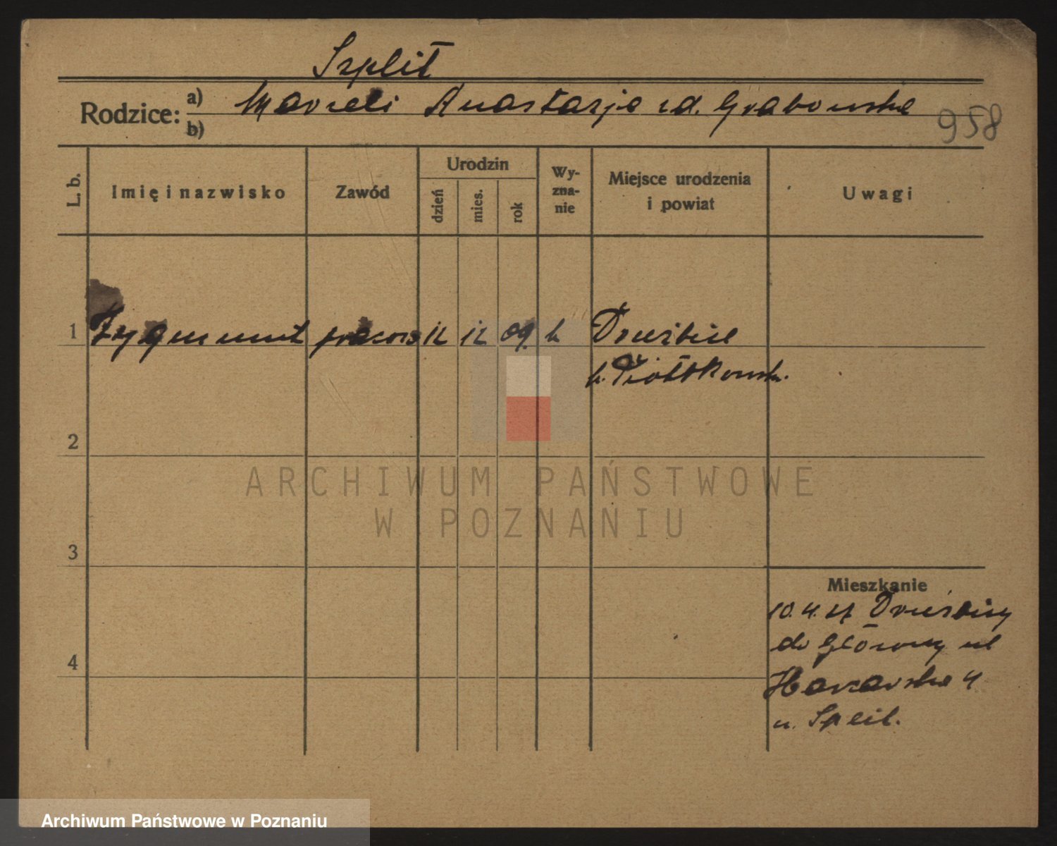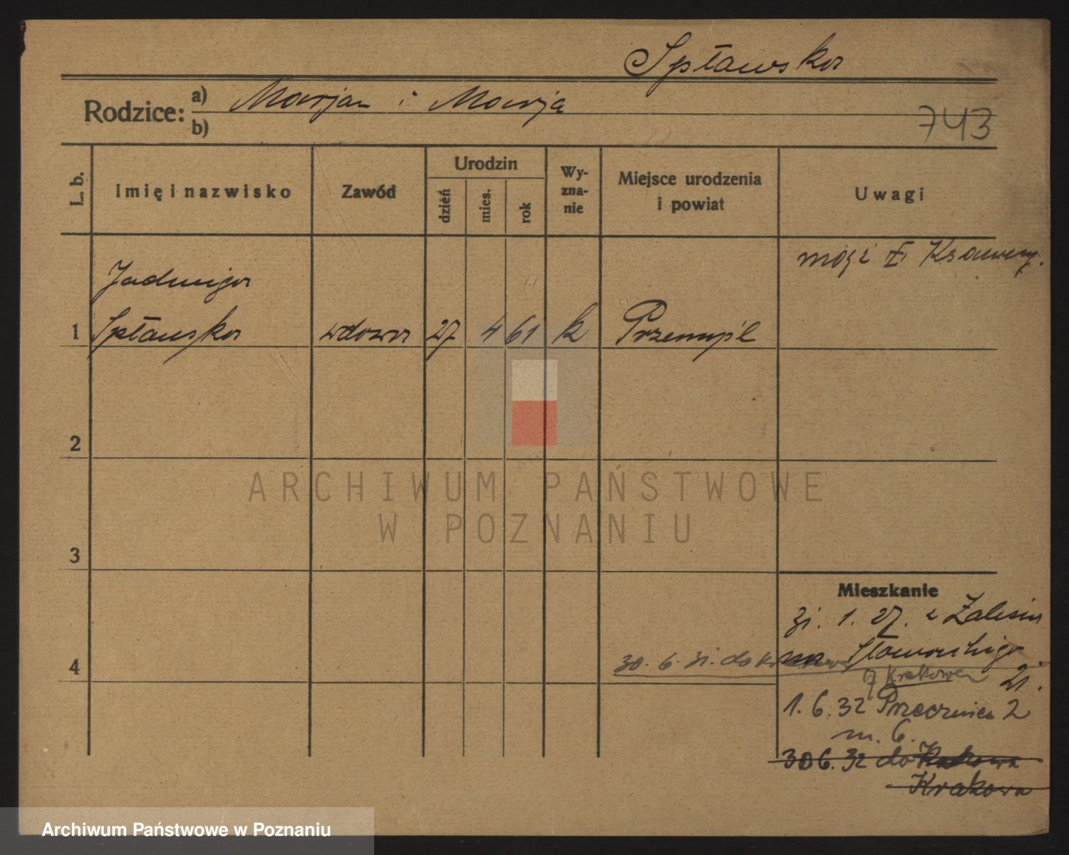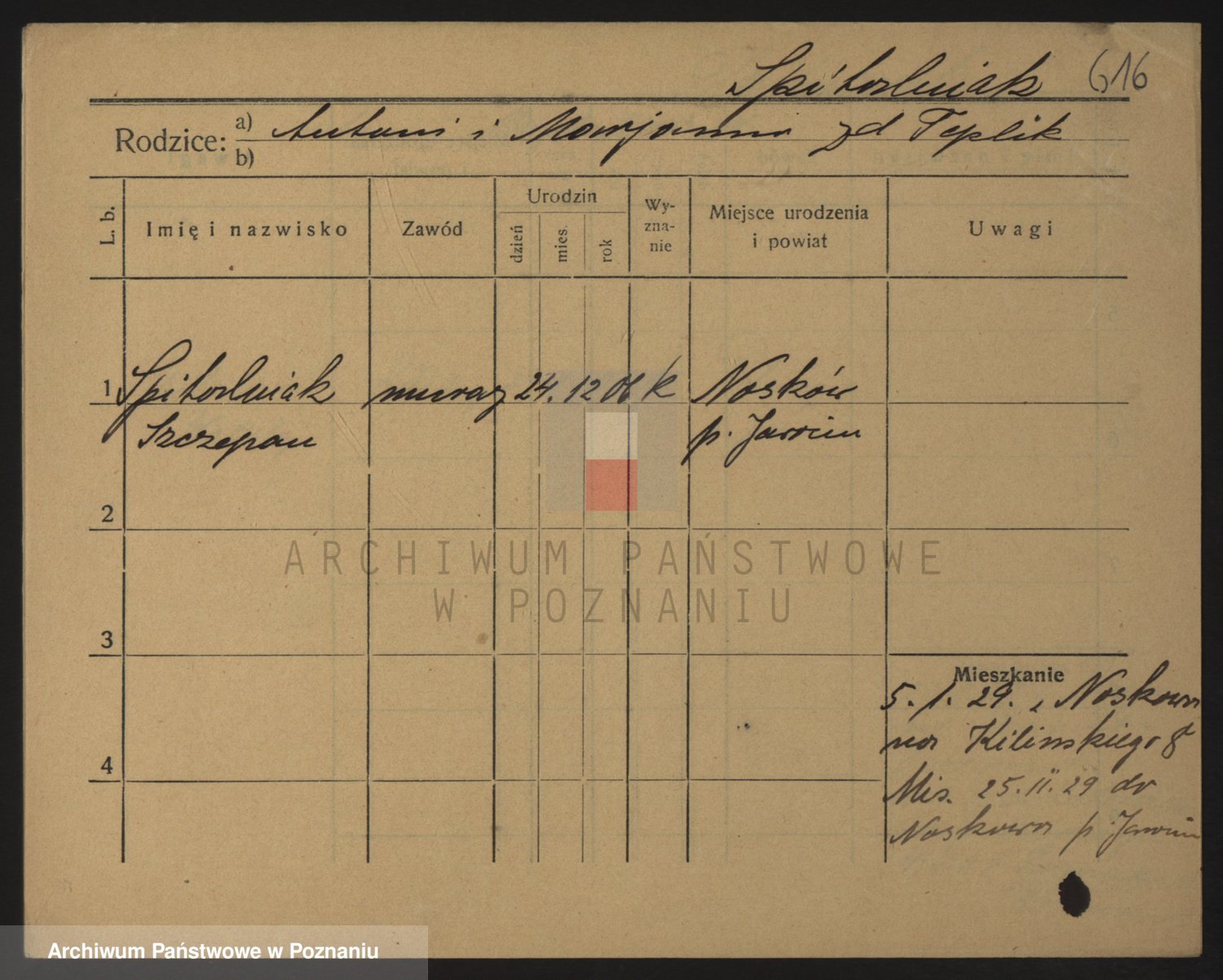Podgląd karty osobowej dostępny jest po kliknięciu na nazwisko lub ikonkę karty. Można dokonywać powiększenia (ikony na górze) lub przechodzić między kolejnymi skanami (strzałki po bokach).