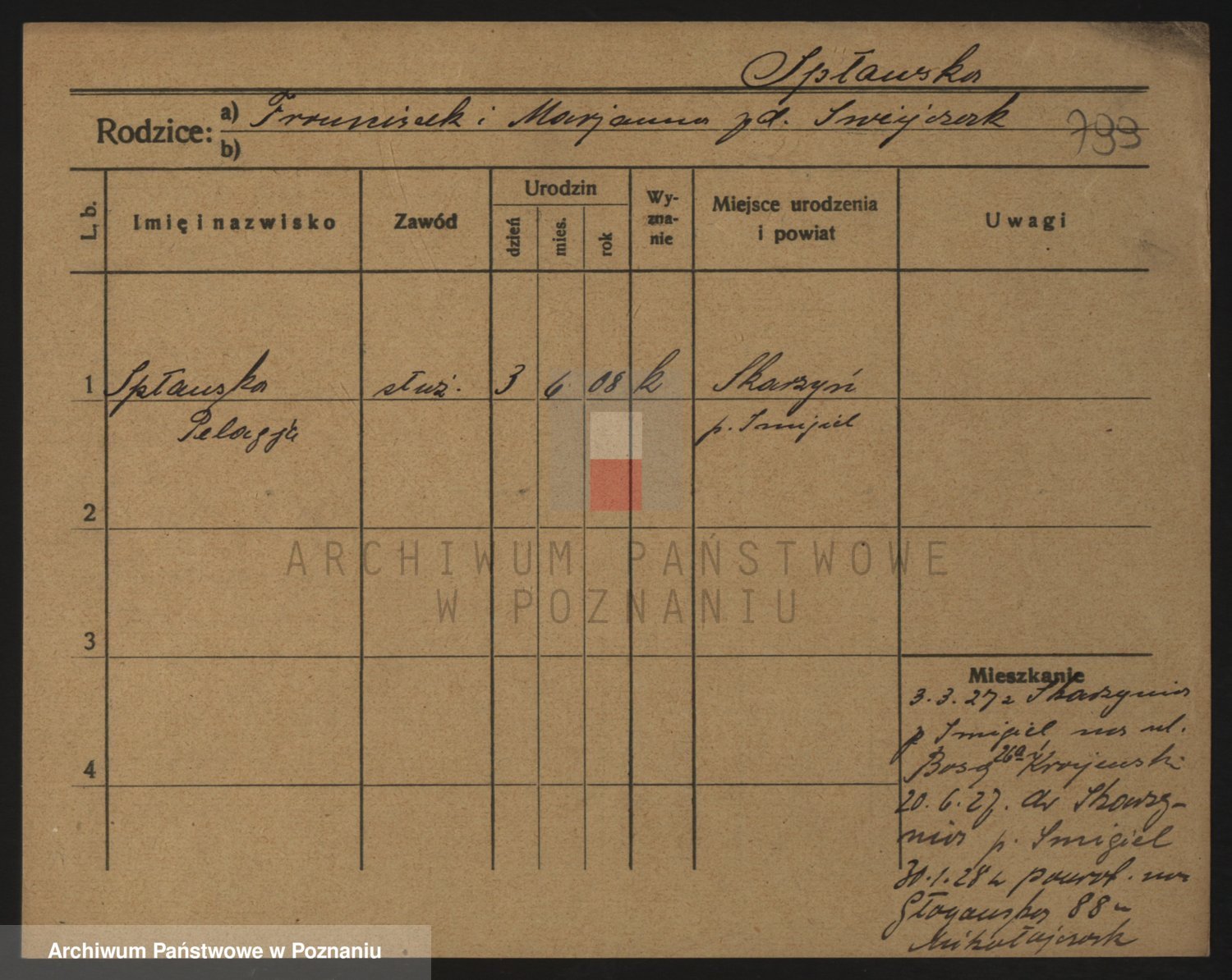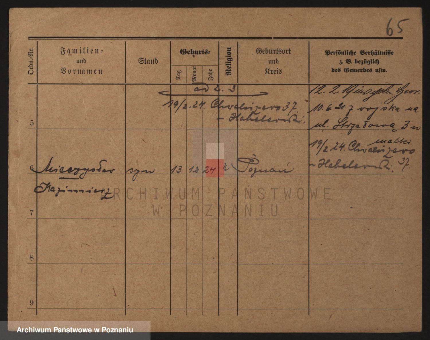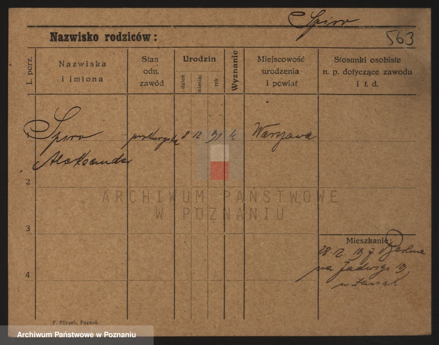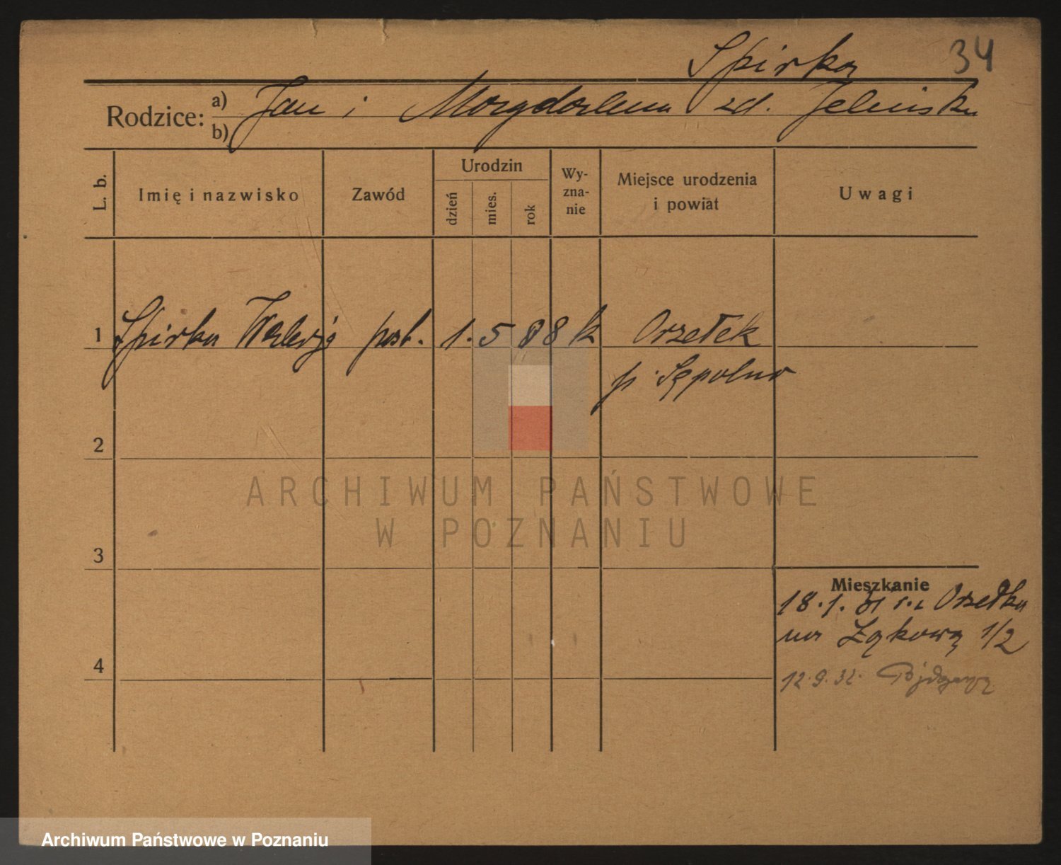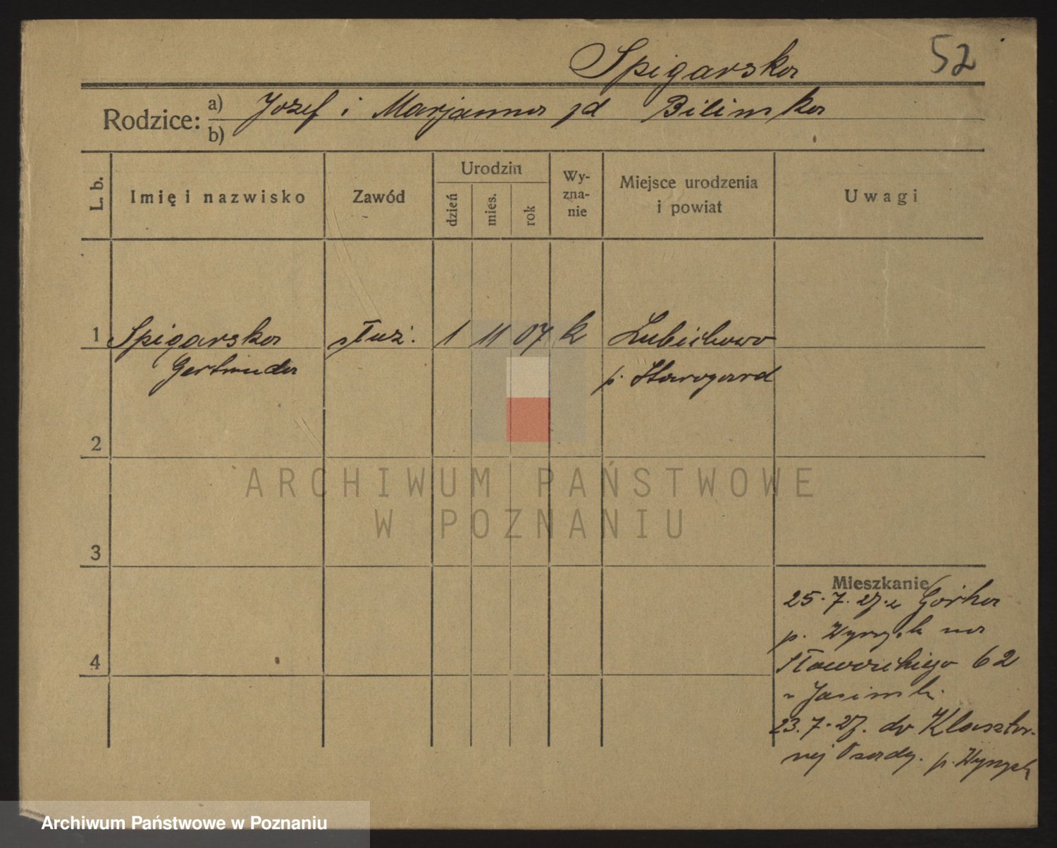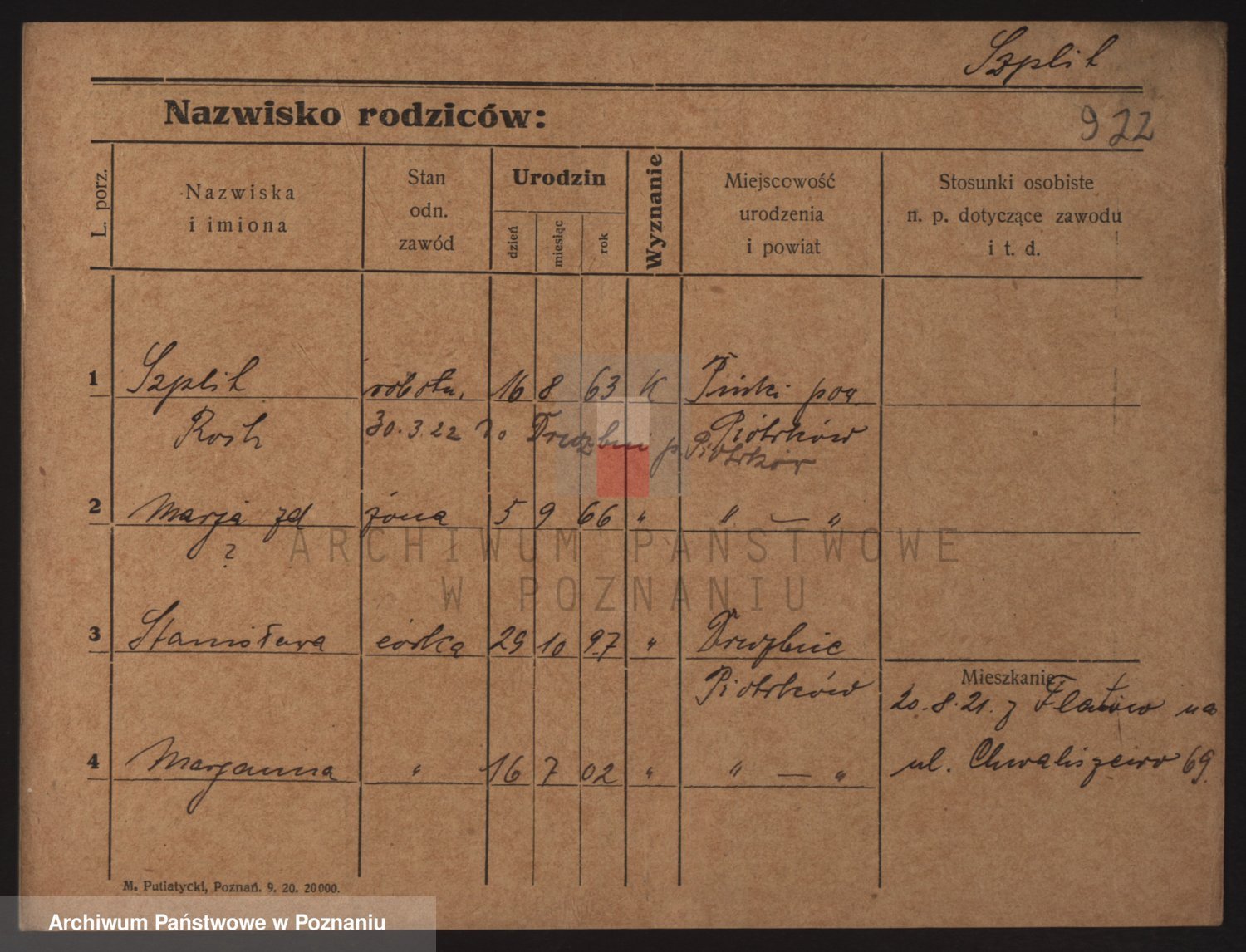 Podgląd karty osobowej dostępny jest po kliknięciu na nazwisko lub ikonkę karty. Można dokonywać powiększenia (ikony na górze) lub przechodzić między kolejnymi skanami (strzałki po bokach).