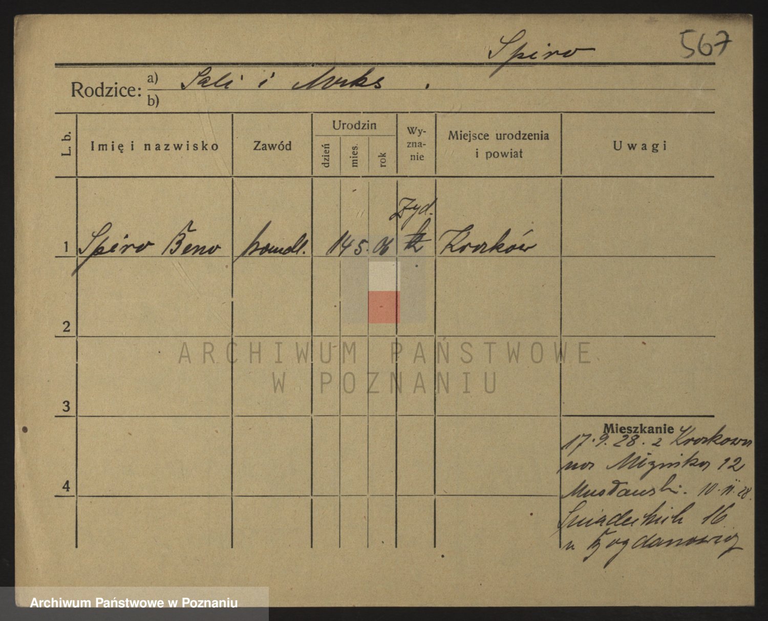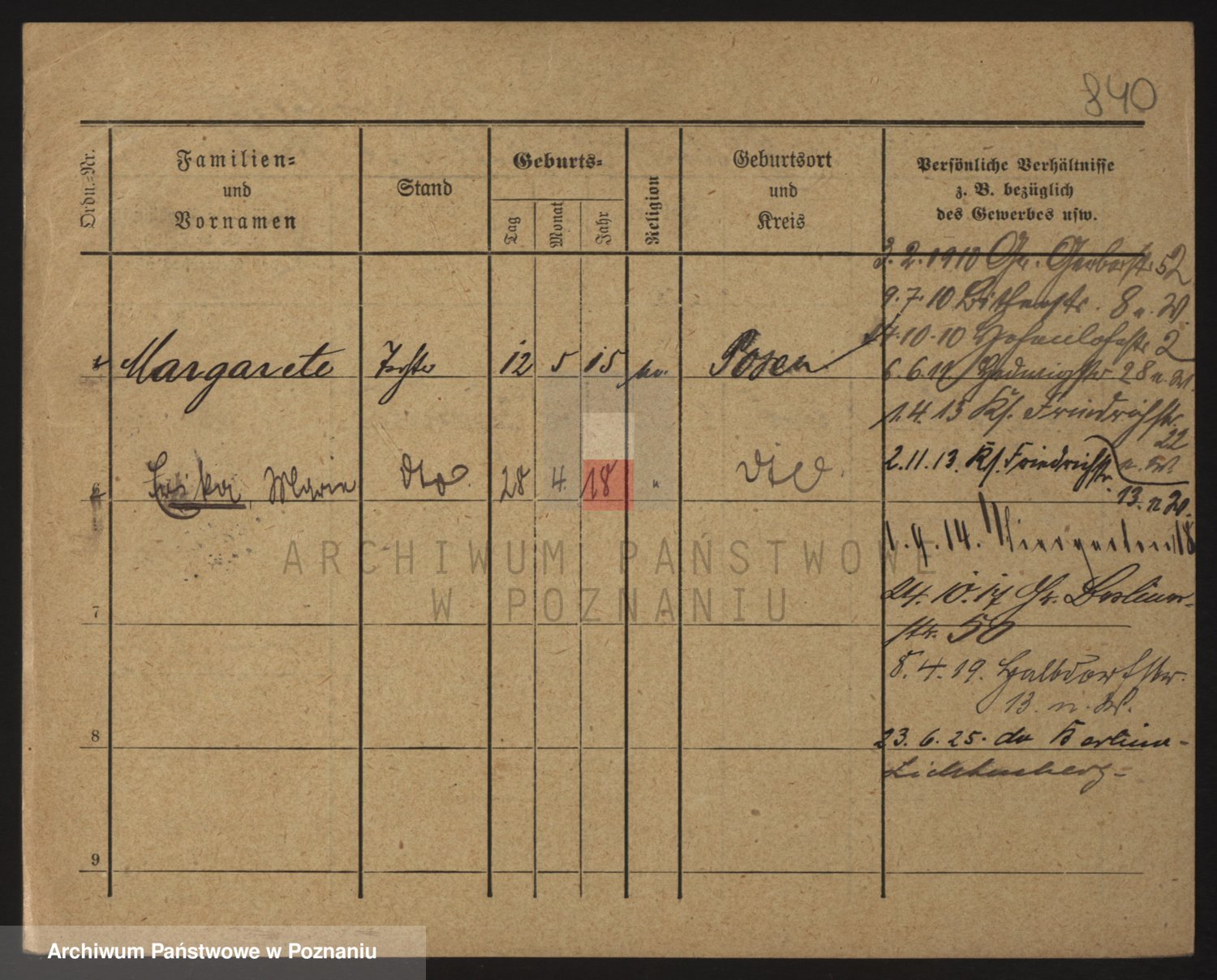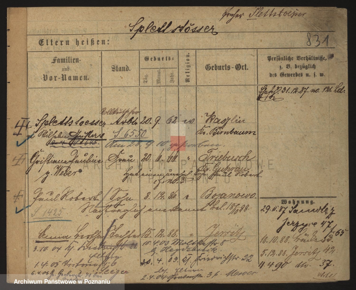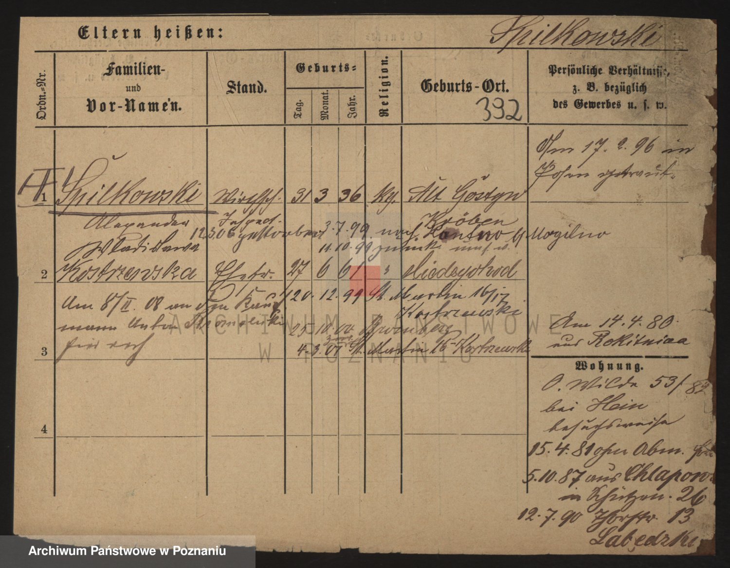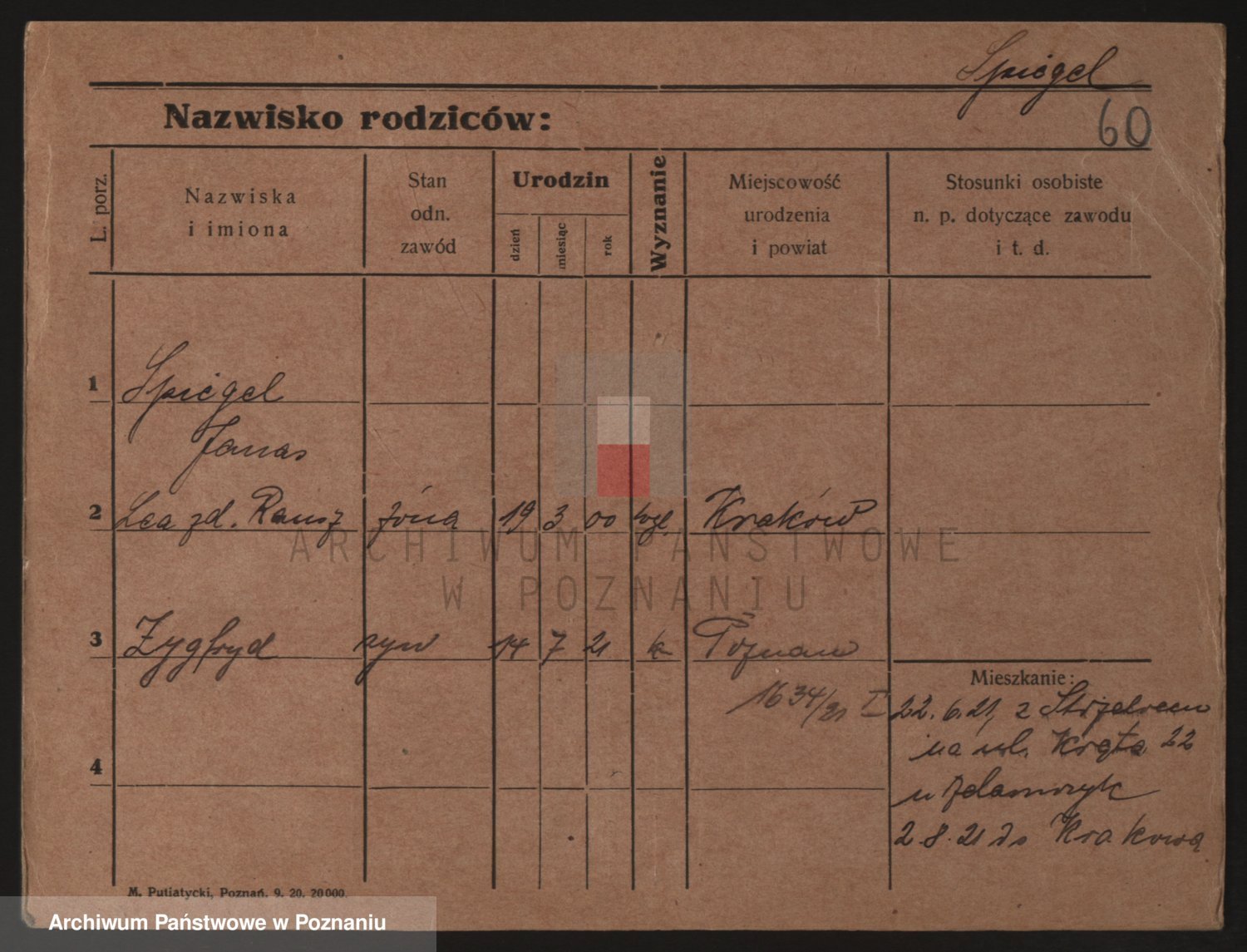 Podgląd karty osobowej dostępny jest po kliknięciu na nazwisko lub ikonkę karty. Można dokonywać powiększenia (ikony na górze) lub przechodzić między kolejnymi skanami (strzałki po bokach).