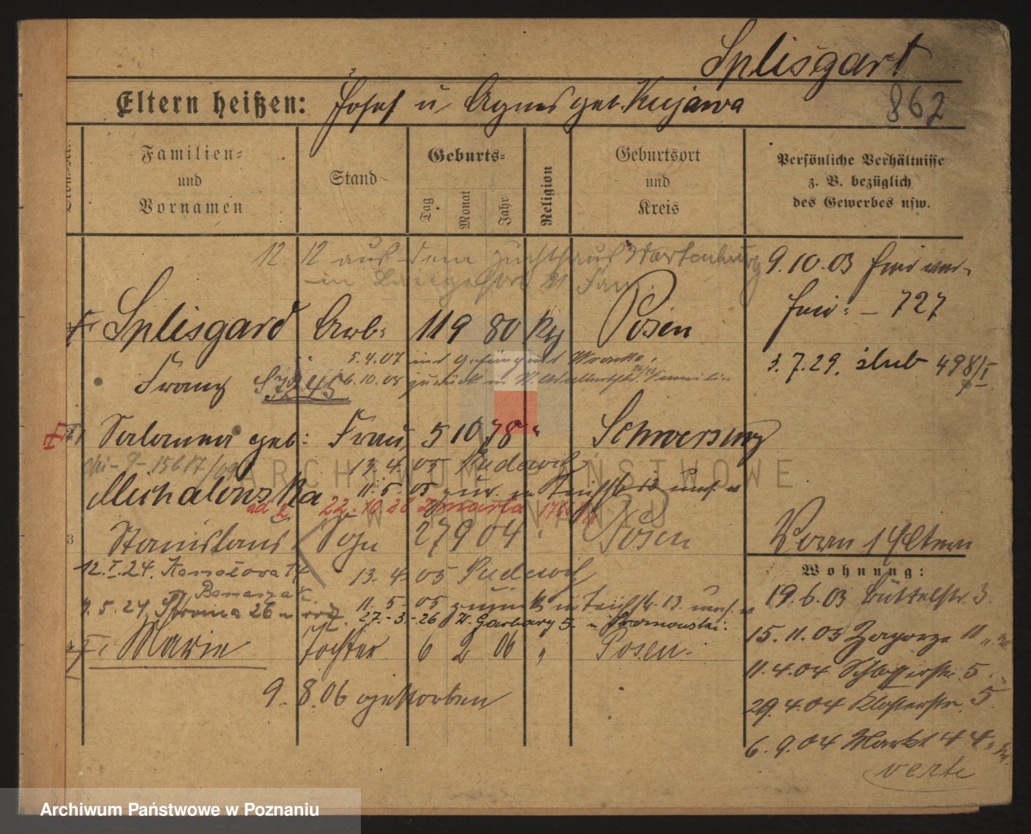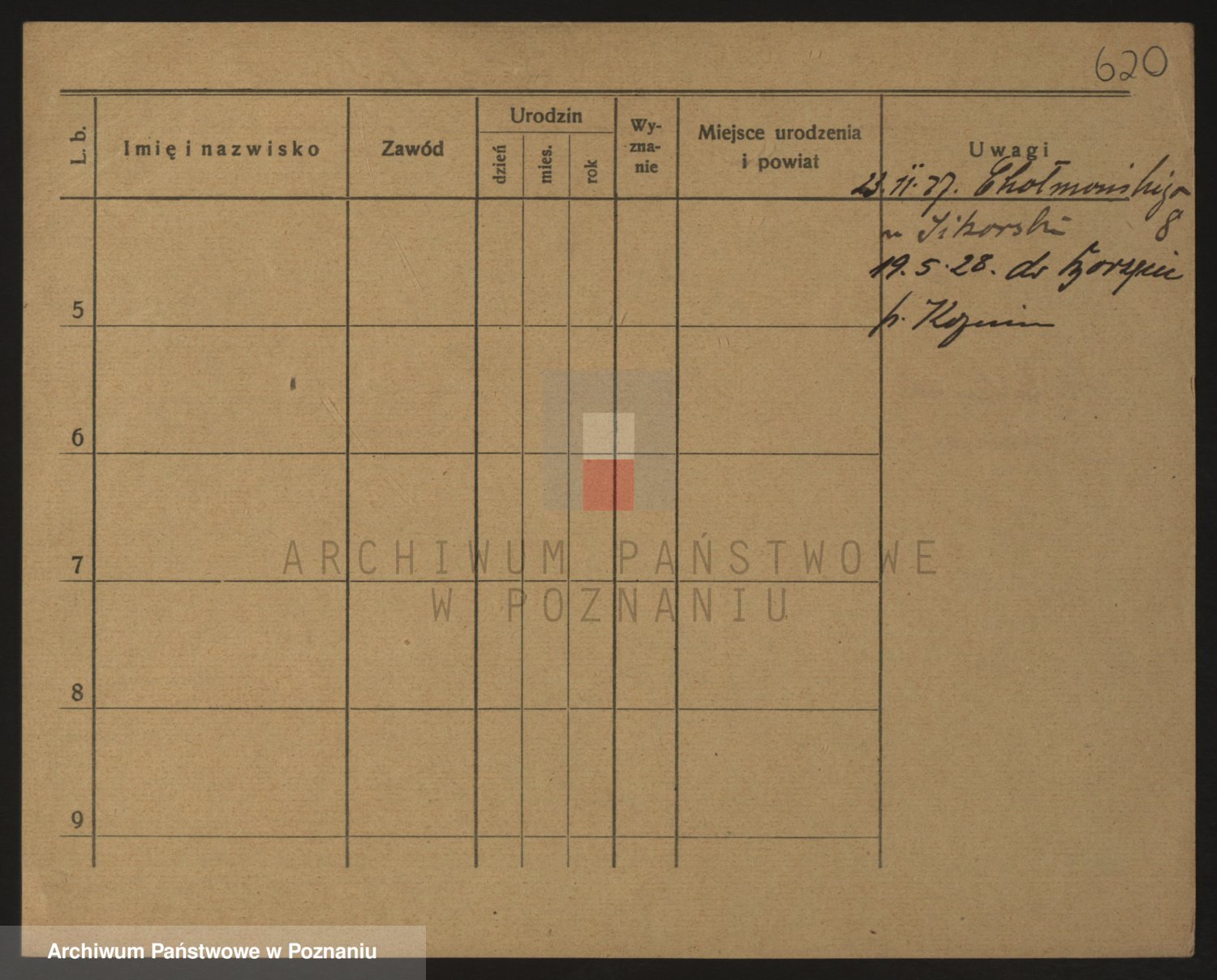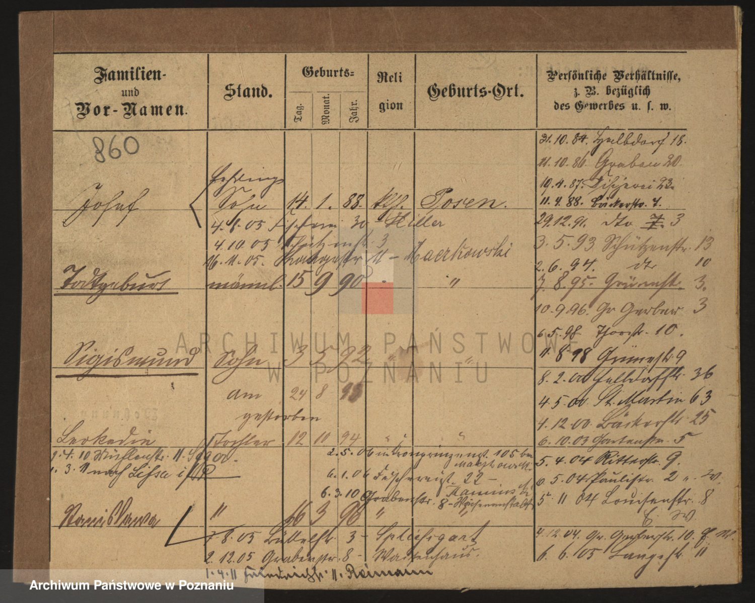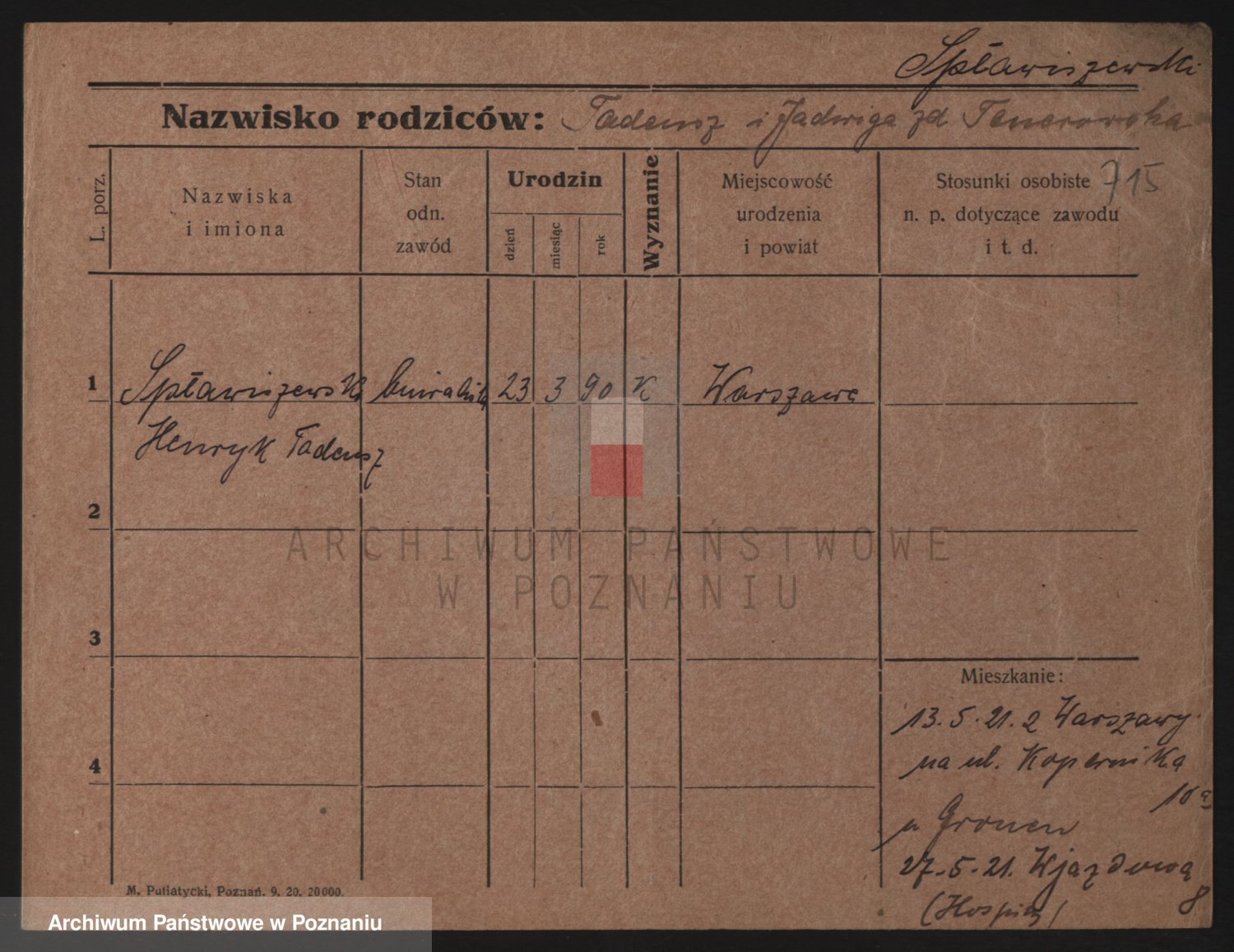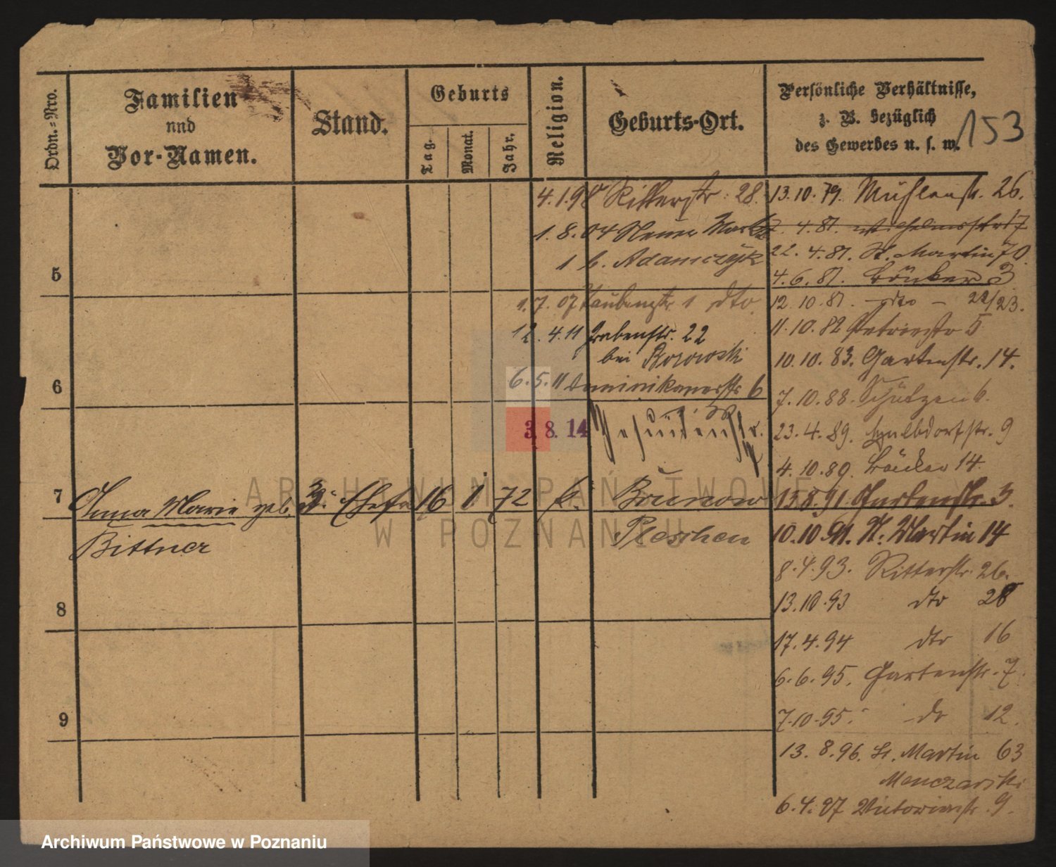 Podgląd karty osobowej dostępny jest po kliknięciu na nazwisko lub ikonkę karty. Można dokonywać powiększenia (ikony na górze) lub przechodzić między kolejnymi skanami (strzałki po bokach).