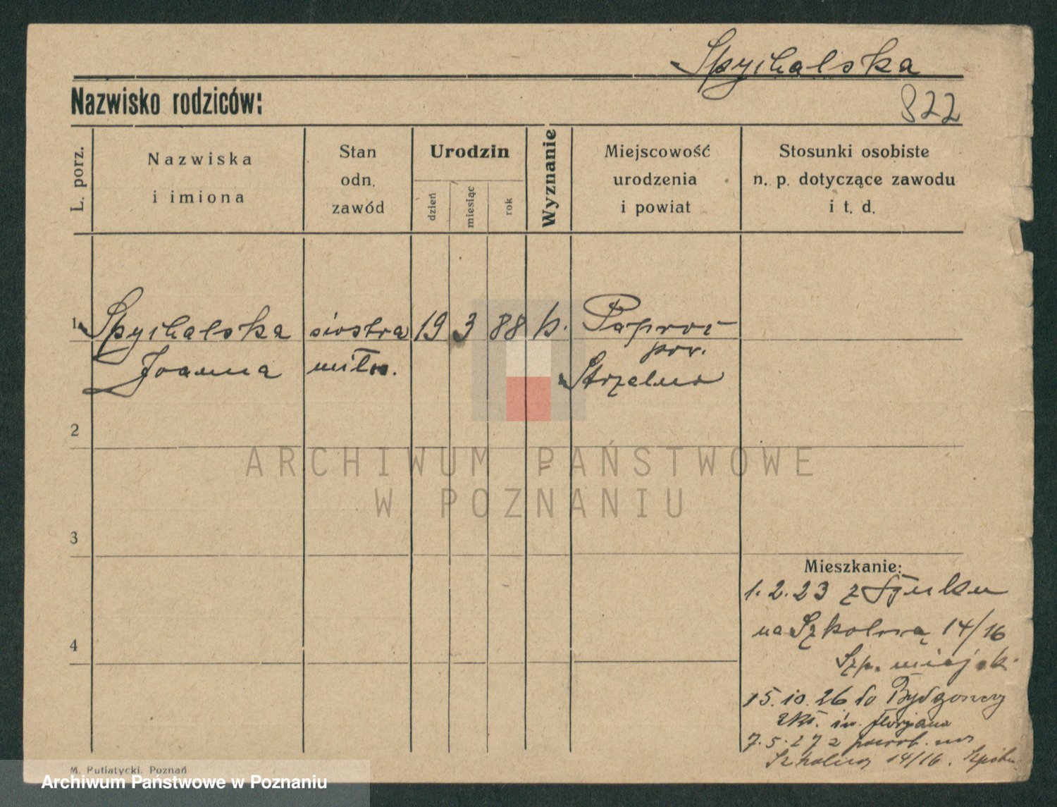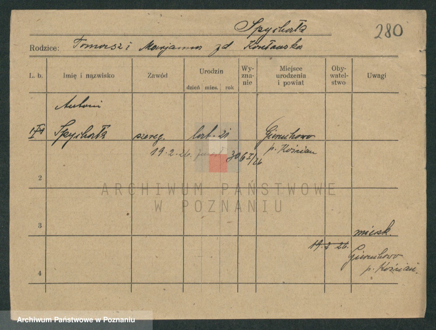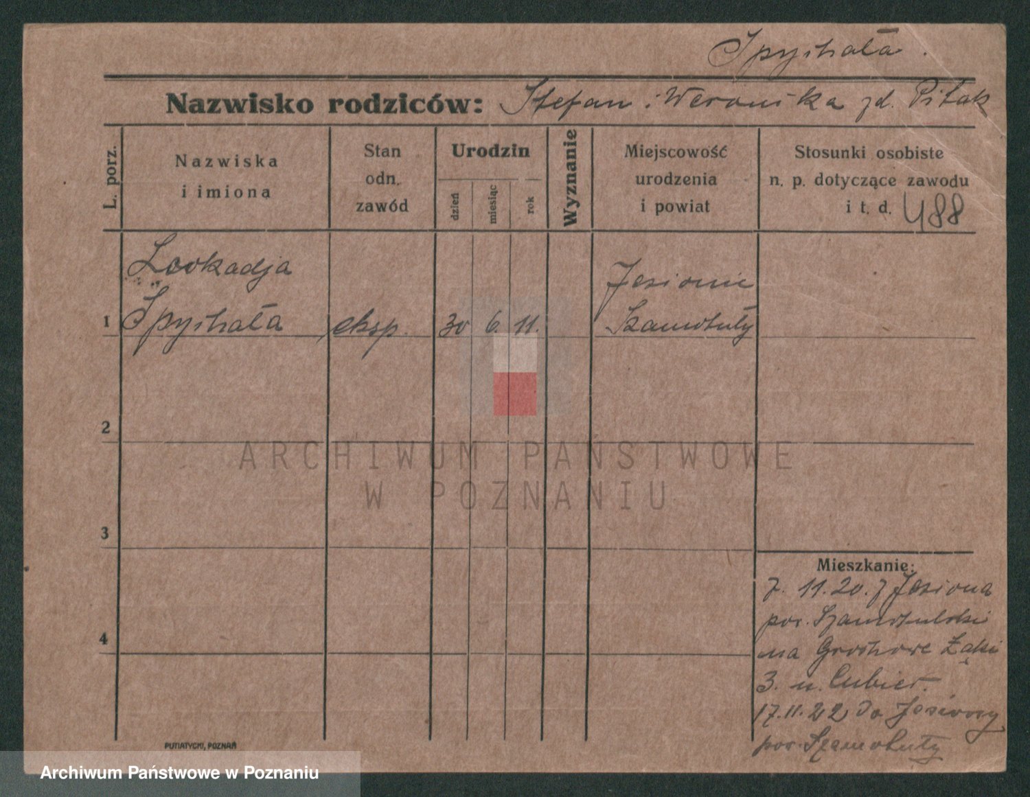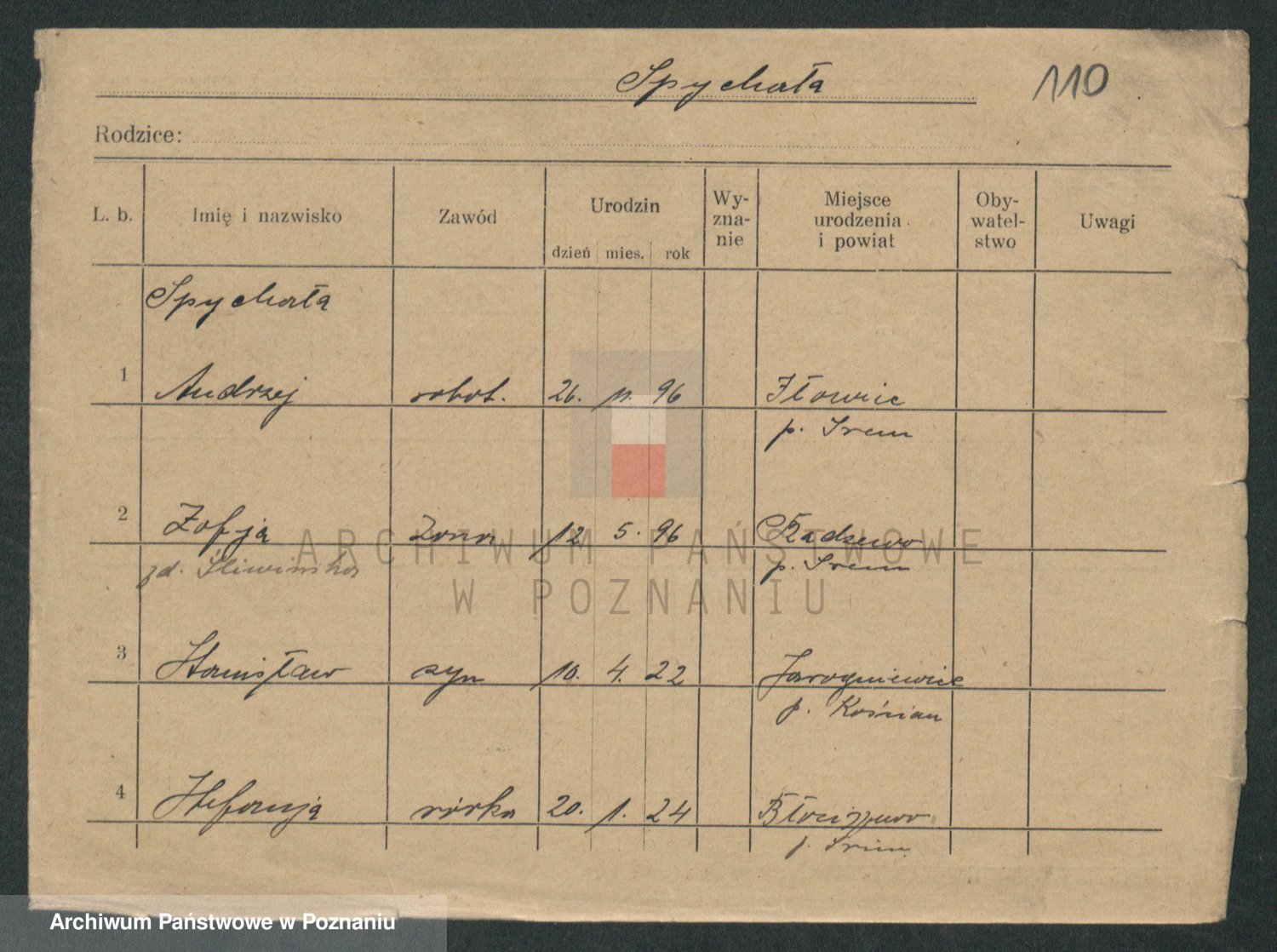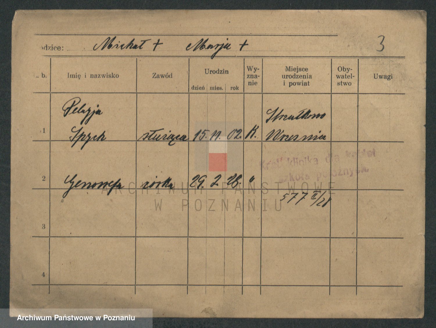 Podgląd karty osobowej dostępny jest po kliknięciu na nazwisko lub ikonkę karty. Można dokonywać powiększenia (ikony na górze) lub przechodzić między kolejnymi skanami (strzałki po bokach).