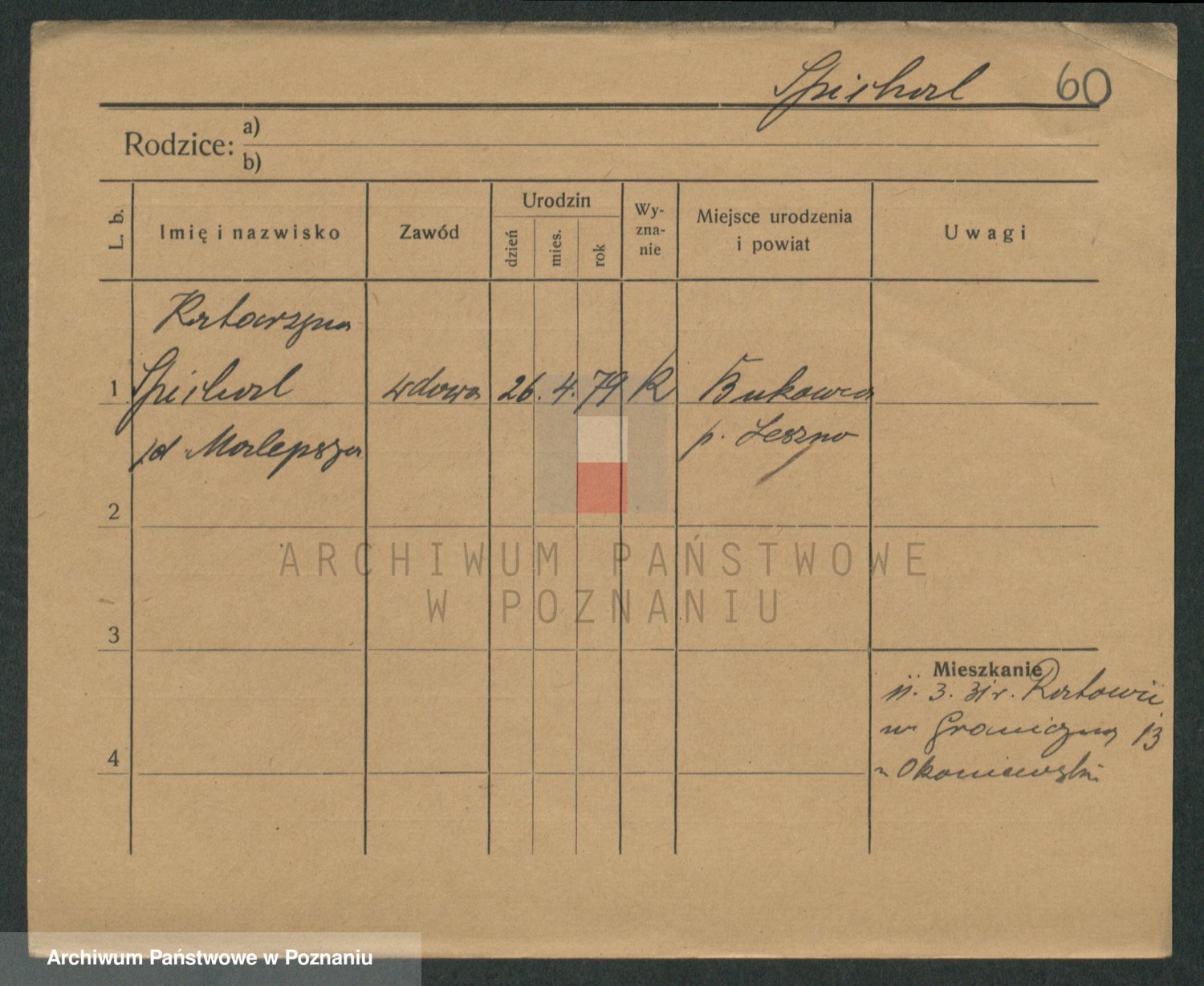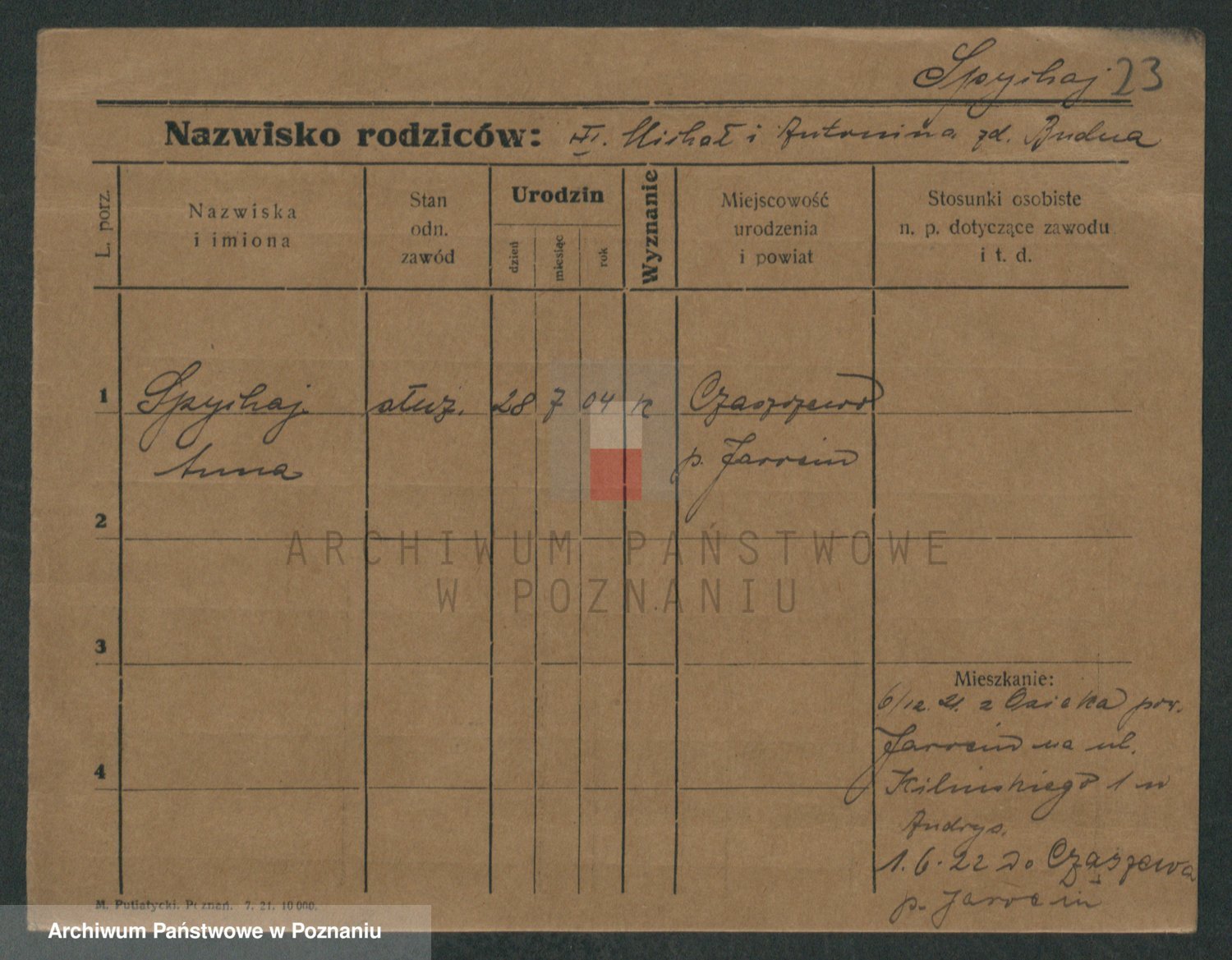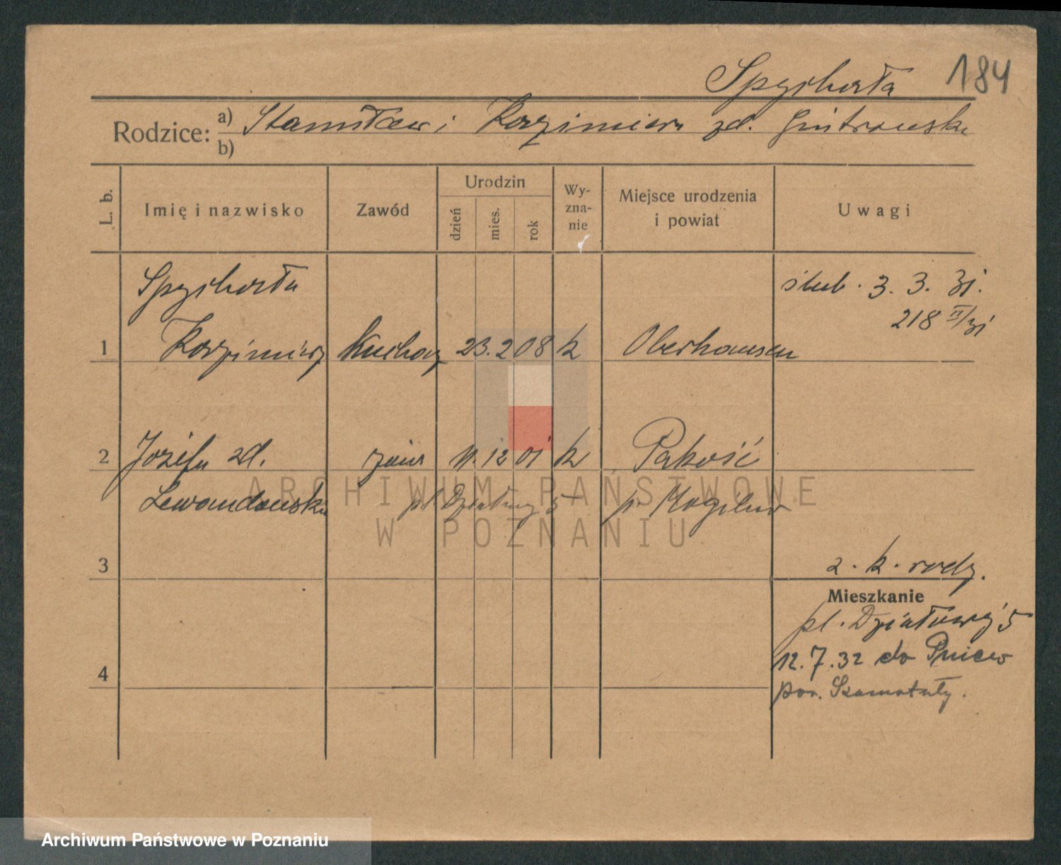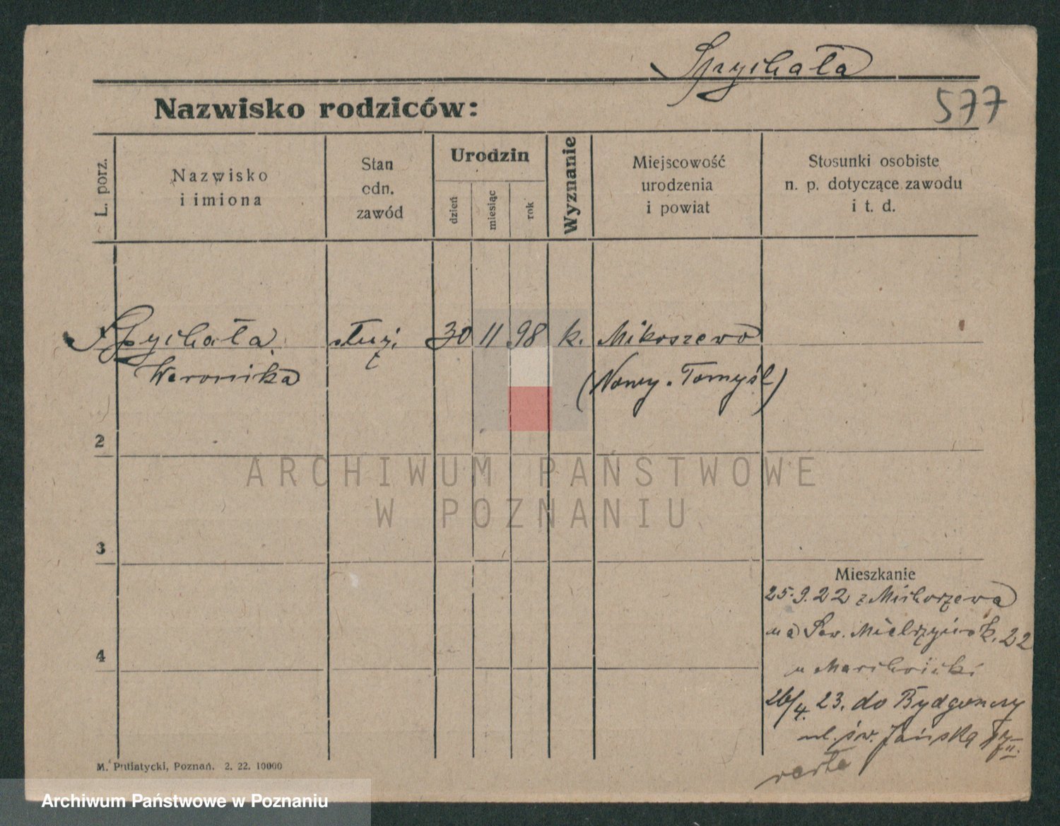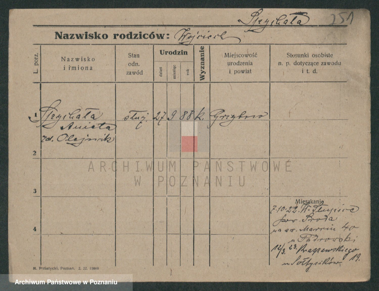 Podgląd karty osobowej dostępny jest po kliknięciu na nazwisko lub ikonkę karty. Można dokonywać powiększenia (ikony na górze) lub przechodzić między kolejnymi skanami (strzałki po bokach).