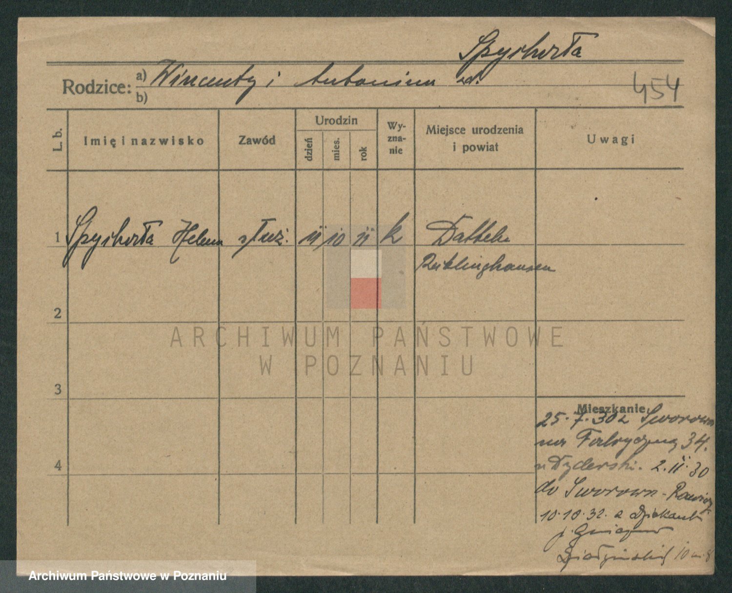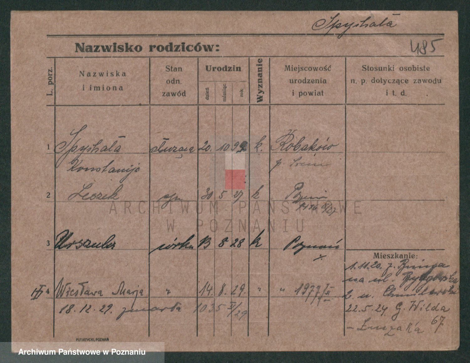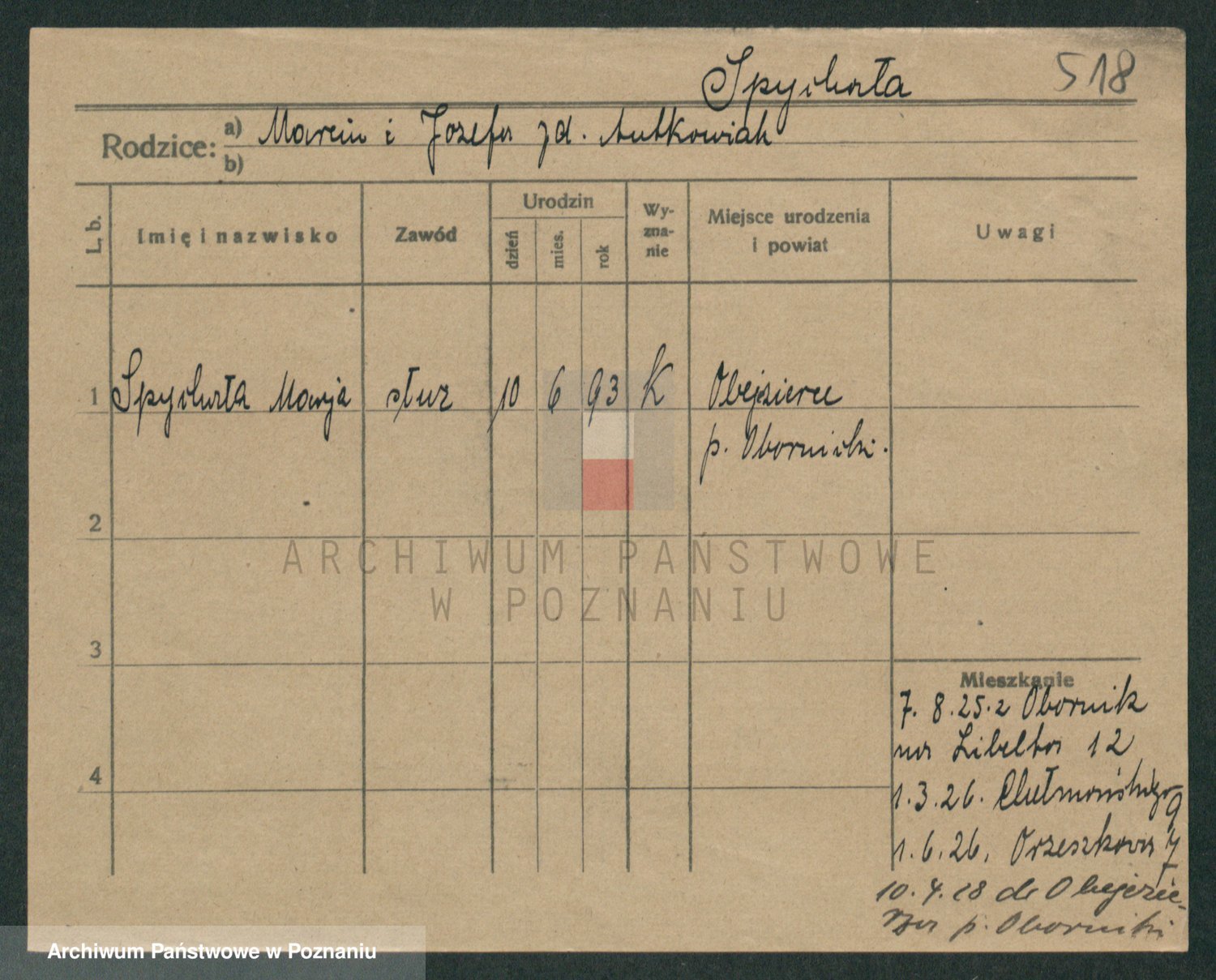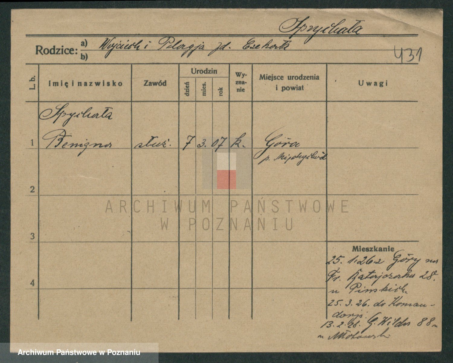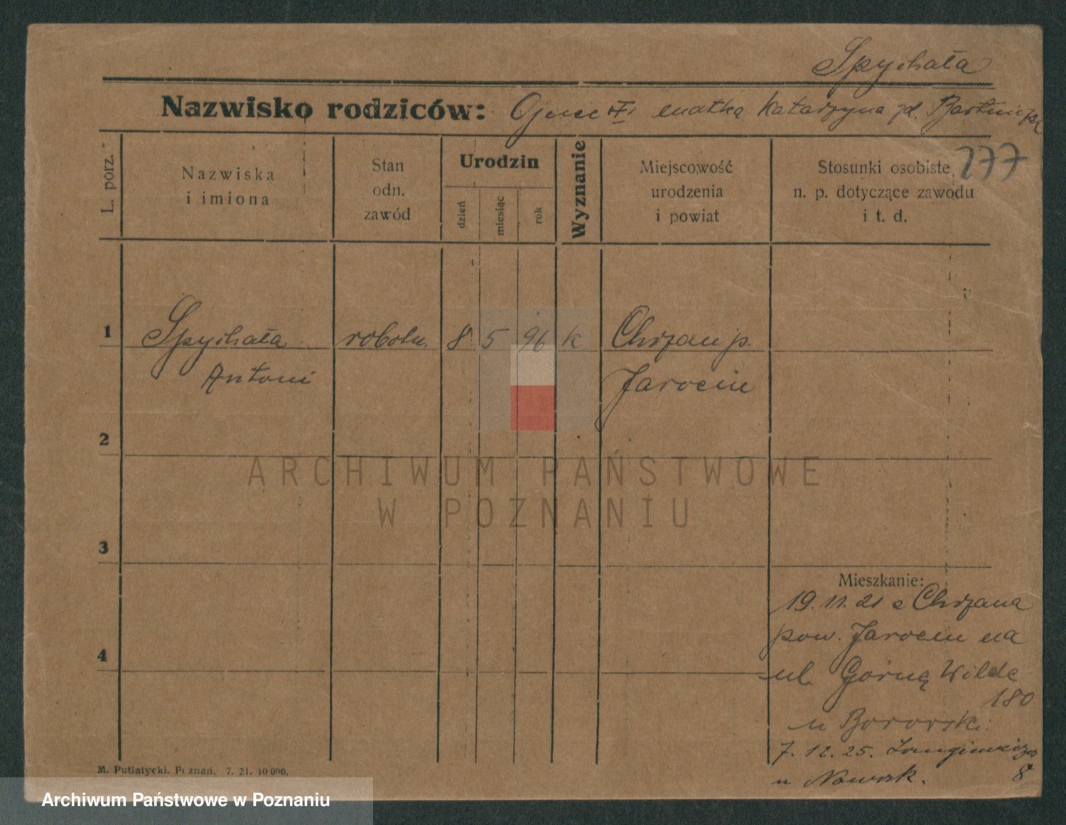 Podgląd karty osobowej dostępny jest po kliknięciu na nazwisko lub ikonkę karty. Można dokonywać powiększenia (ikony na górze) lub przechodzić między kolejnymi skanami (strzałki po bokach).