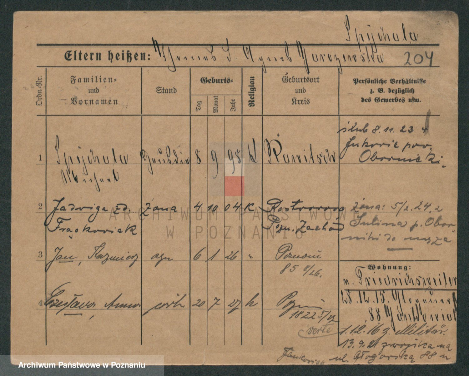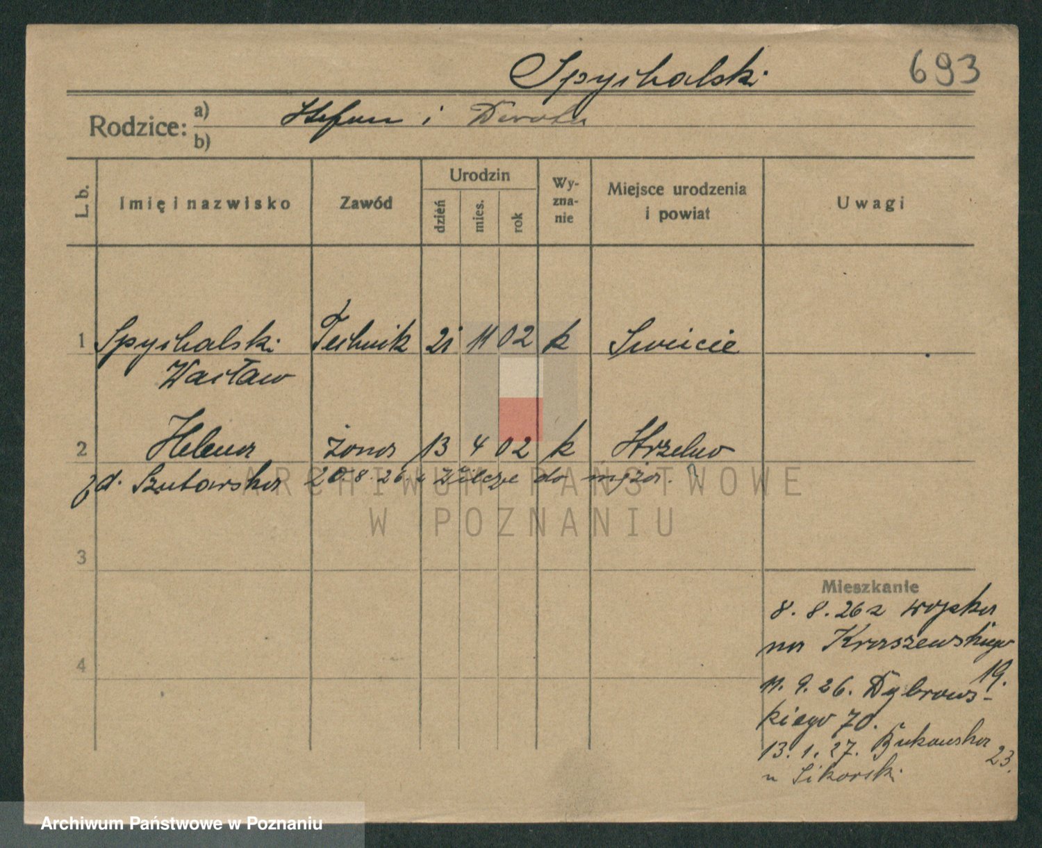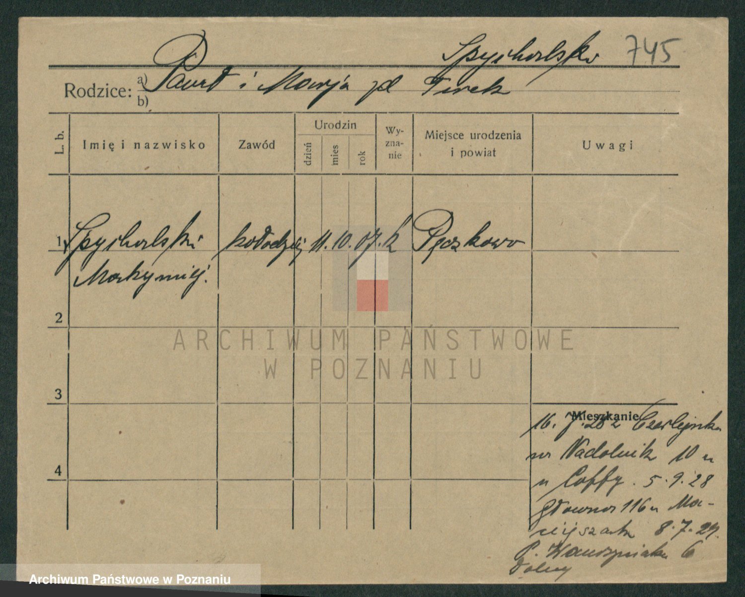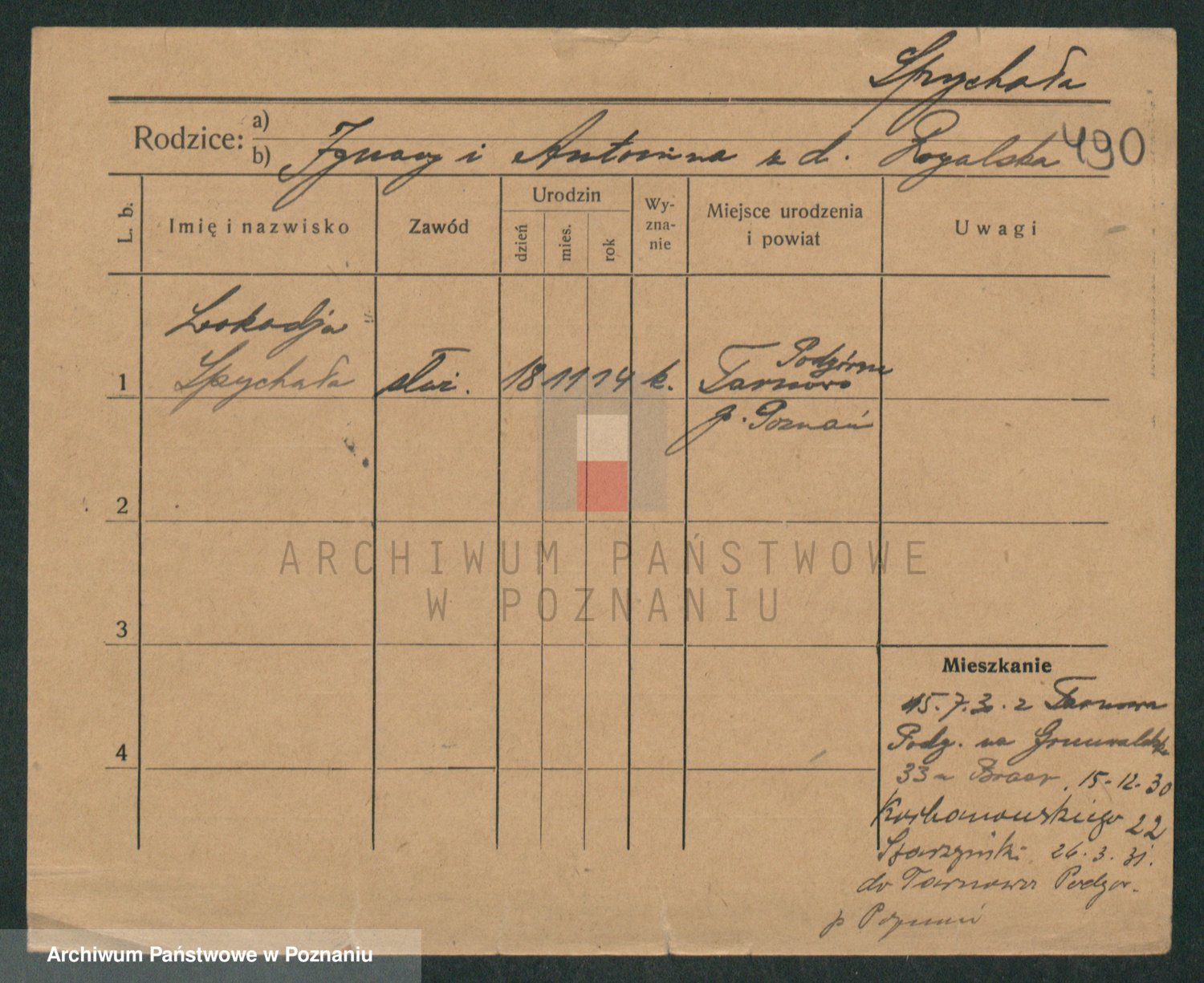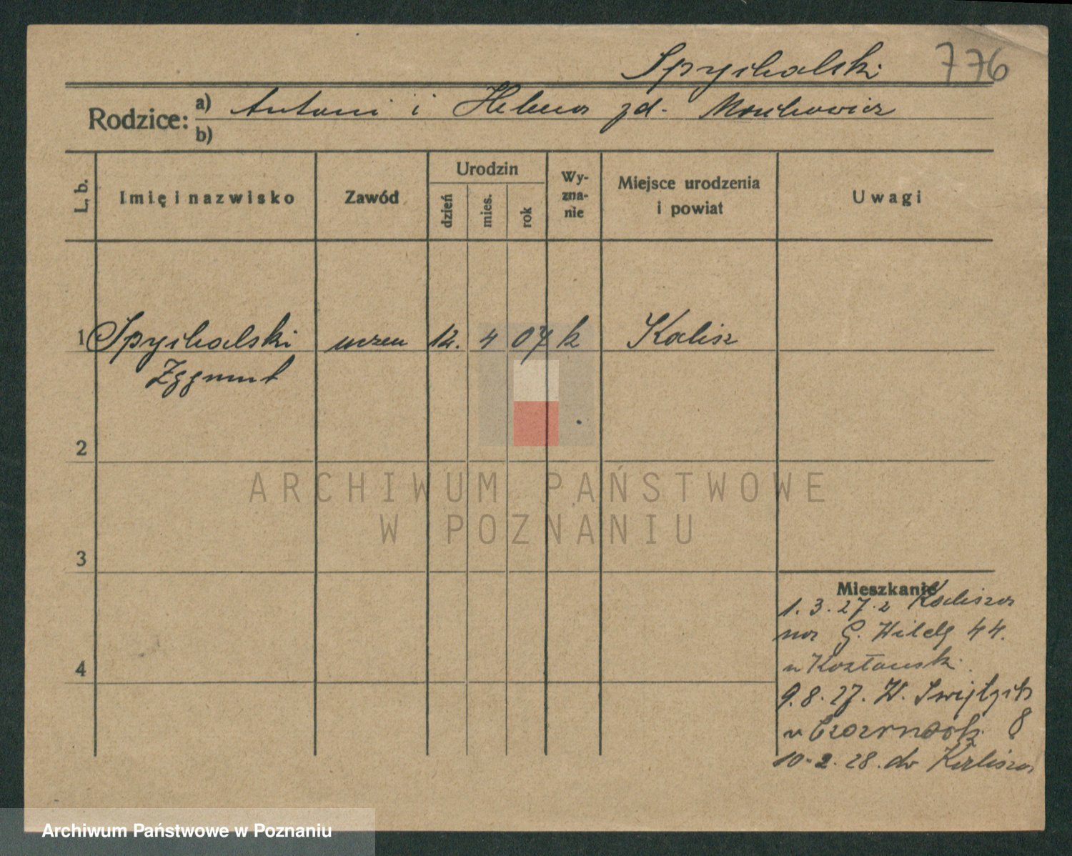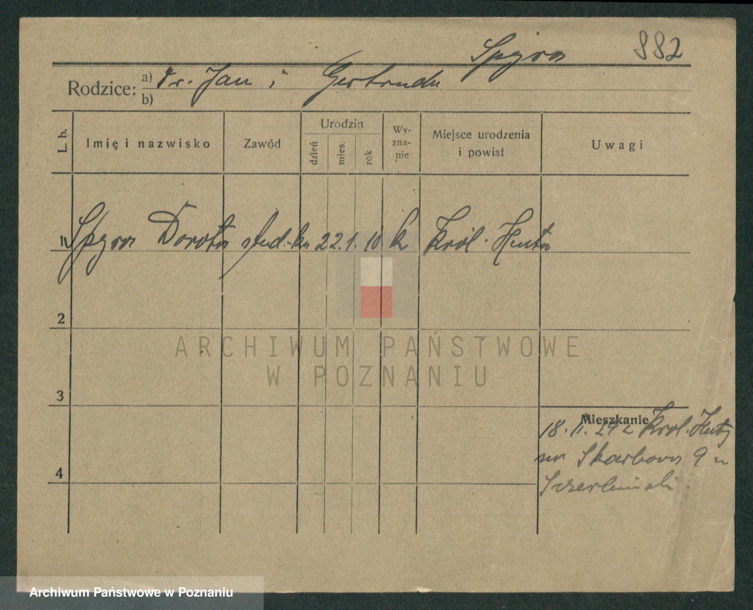 Podgląd karty osobowej dostępny jest po kliknięciu na nazwisko lub ikonkę karty. Można dokonywać powiększenia (ikony na górze) lub przechodzić między kolejnymi skanami (strzałki po bokach).