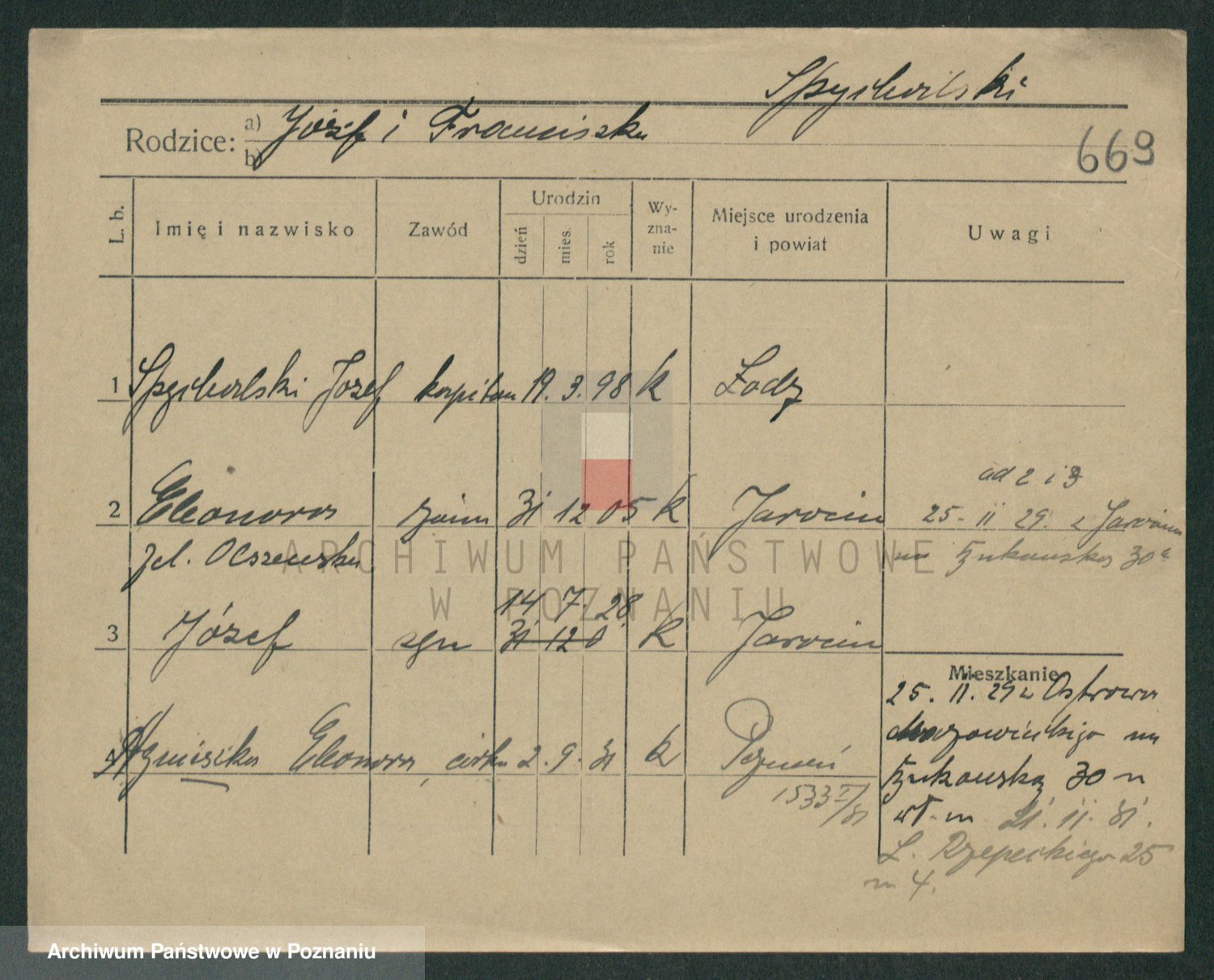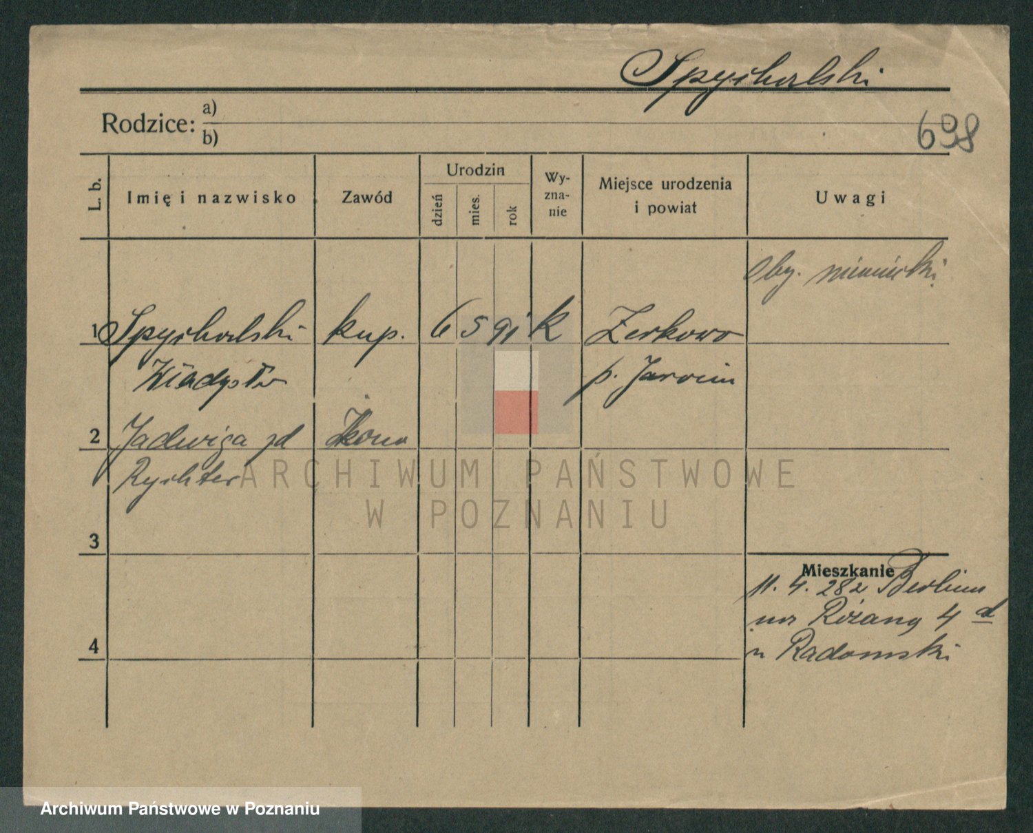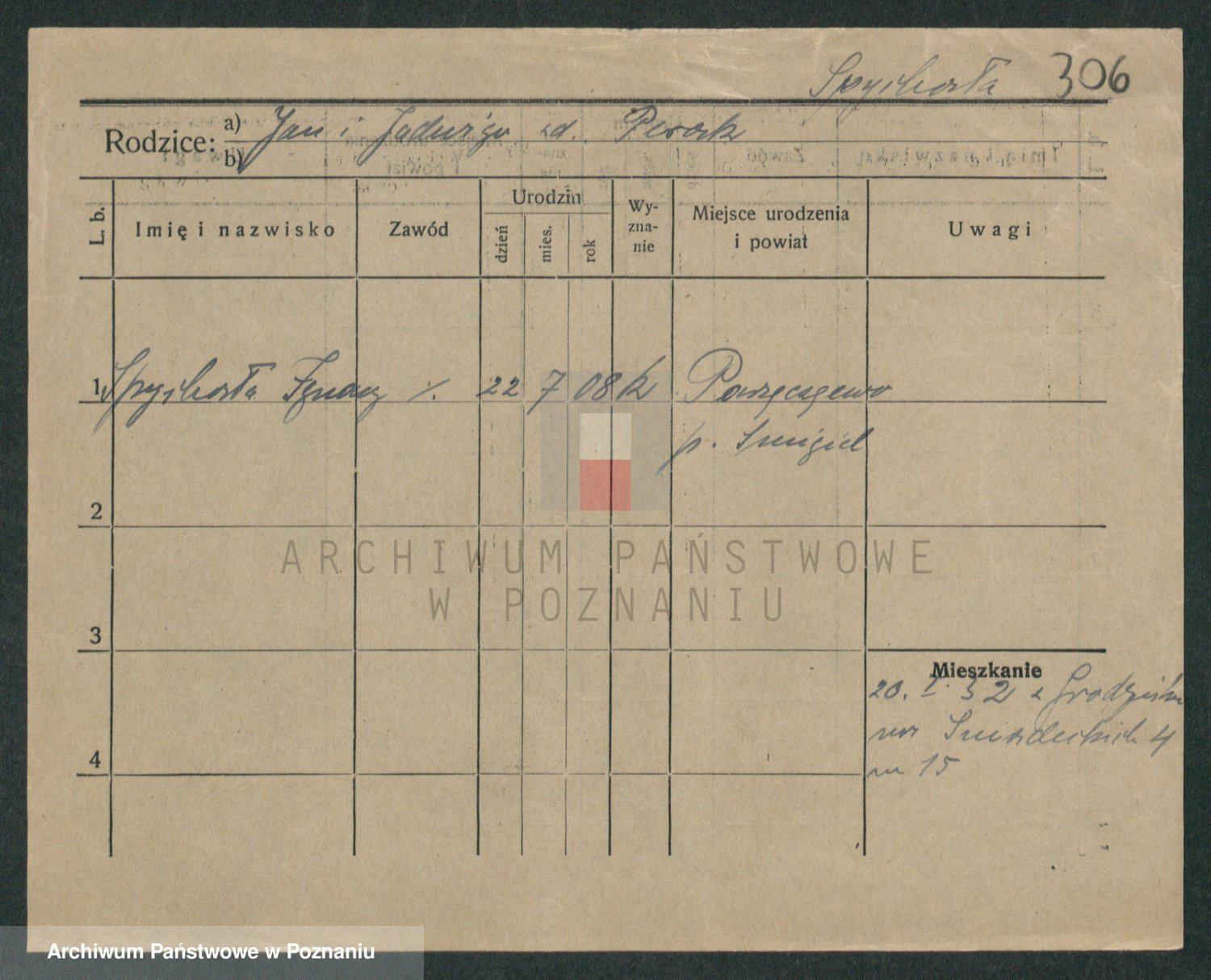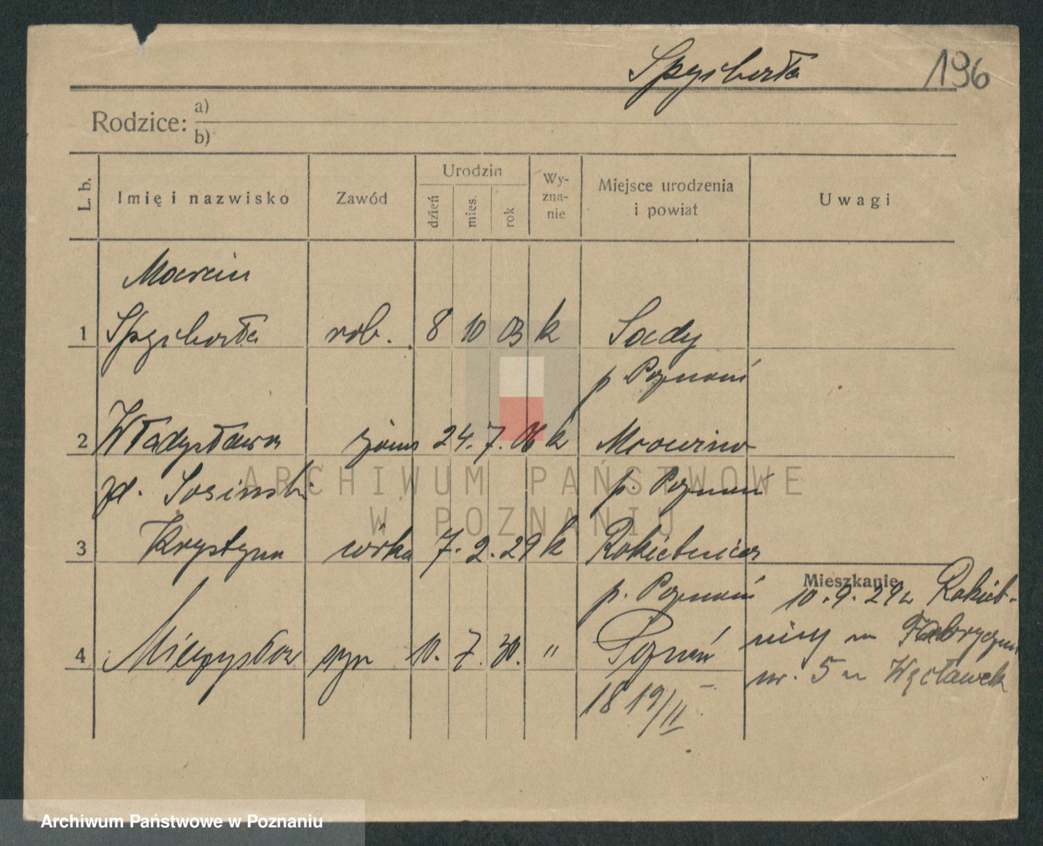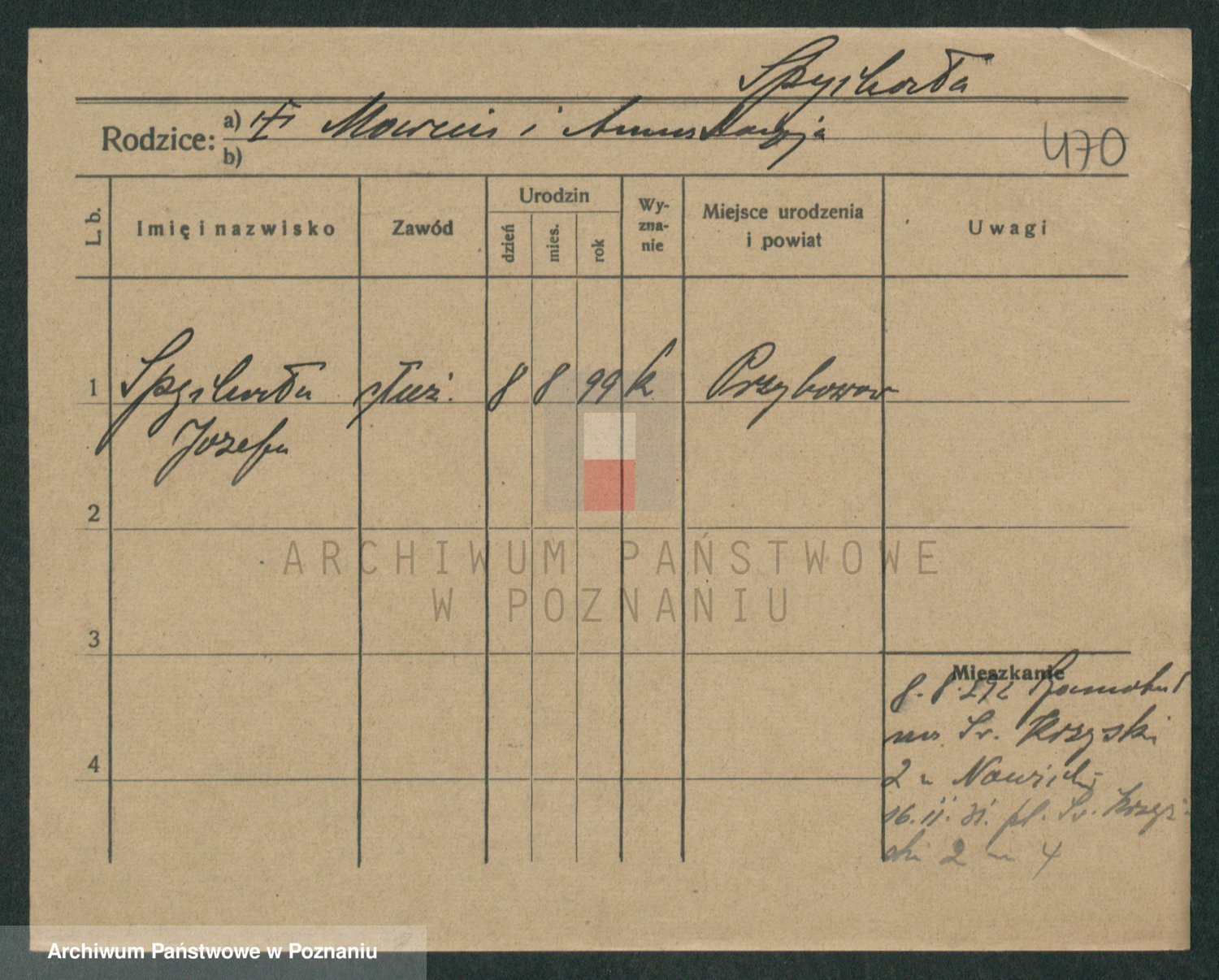 Podgląd karty osobowej dostępny jest po kliknięciu na nazwisko lub ikonkę karty. Można dokonywać powiększenia (ikony na górze) lub przechodzić między kolejnymi skanami (strzałki po bokach).