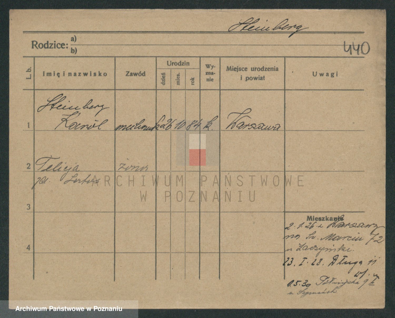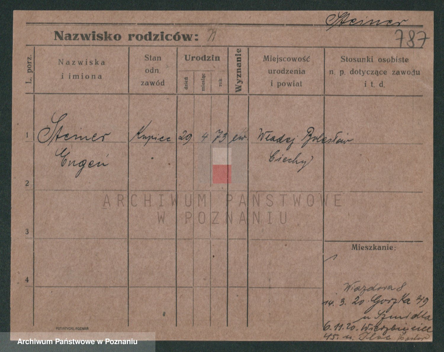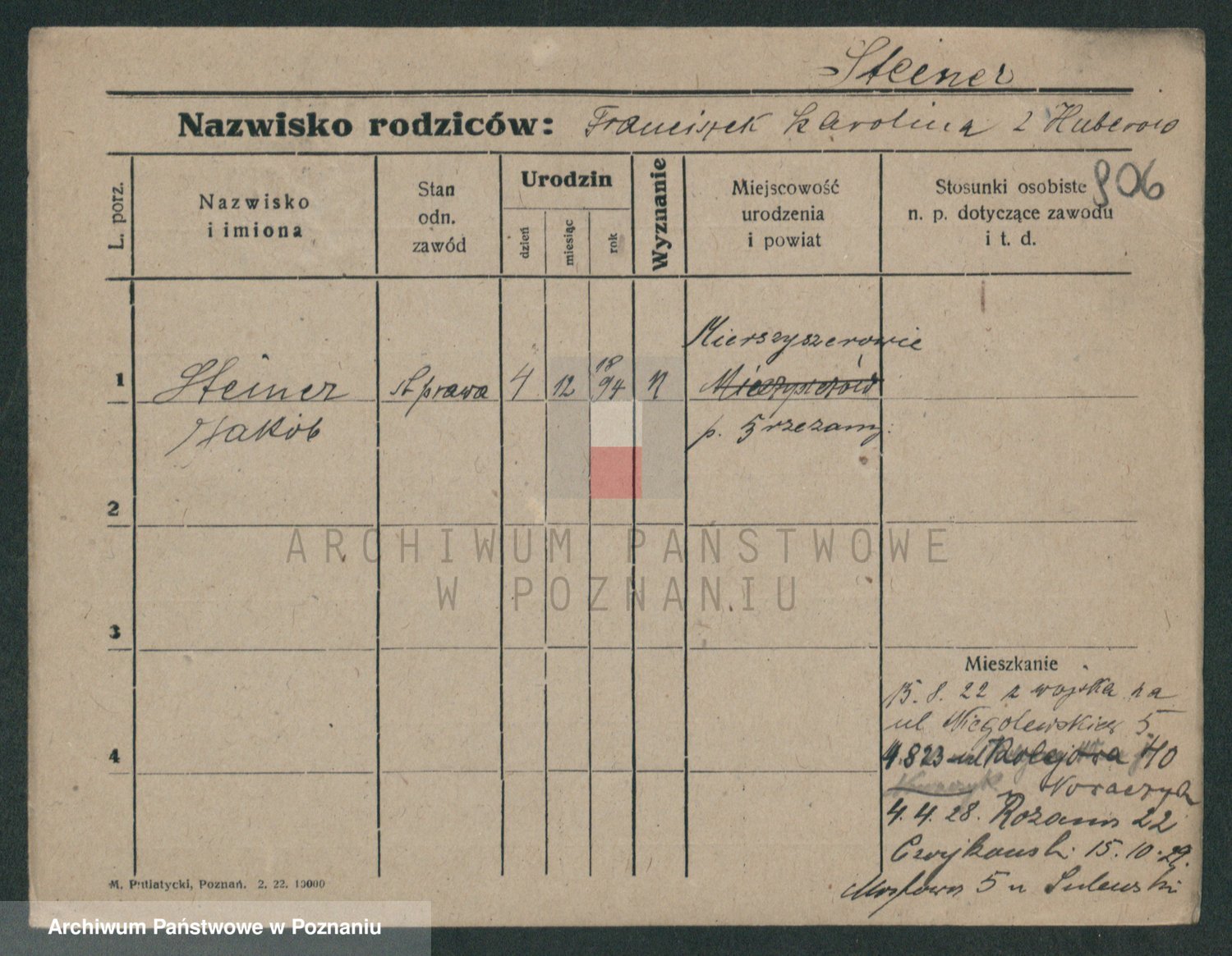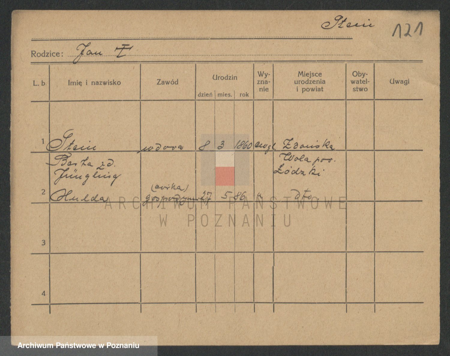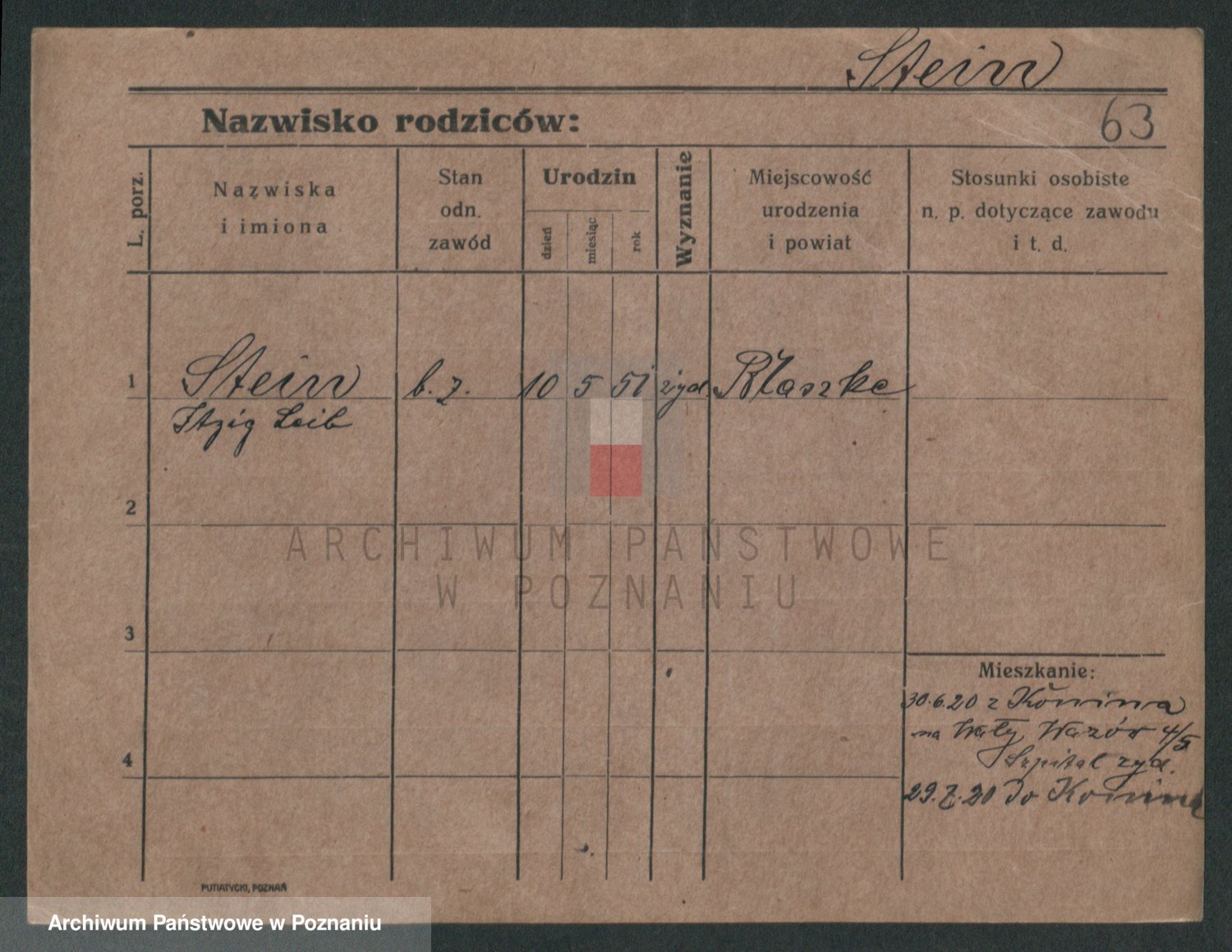 Podgląd karty osobowej dostępny jest po kliknięciu na nazwisko lub ikonkę karty. Można dokonywać powiększenia (ikony na górze) lub przechodzić między kolejnymi skanami (strzałki po bokach).
