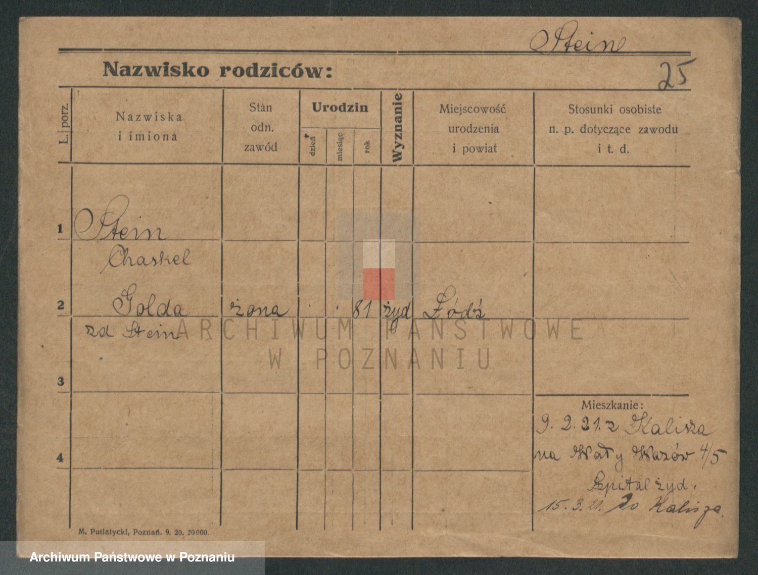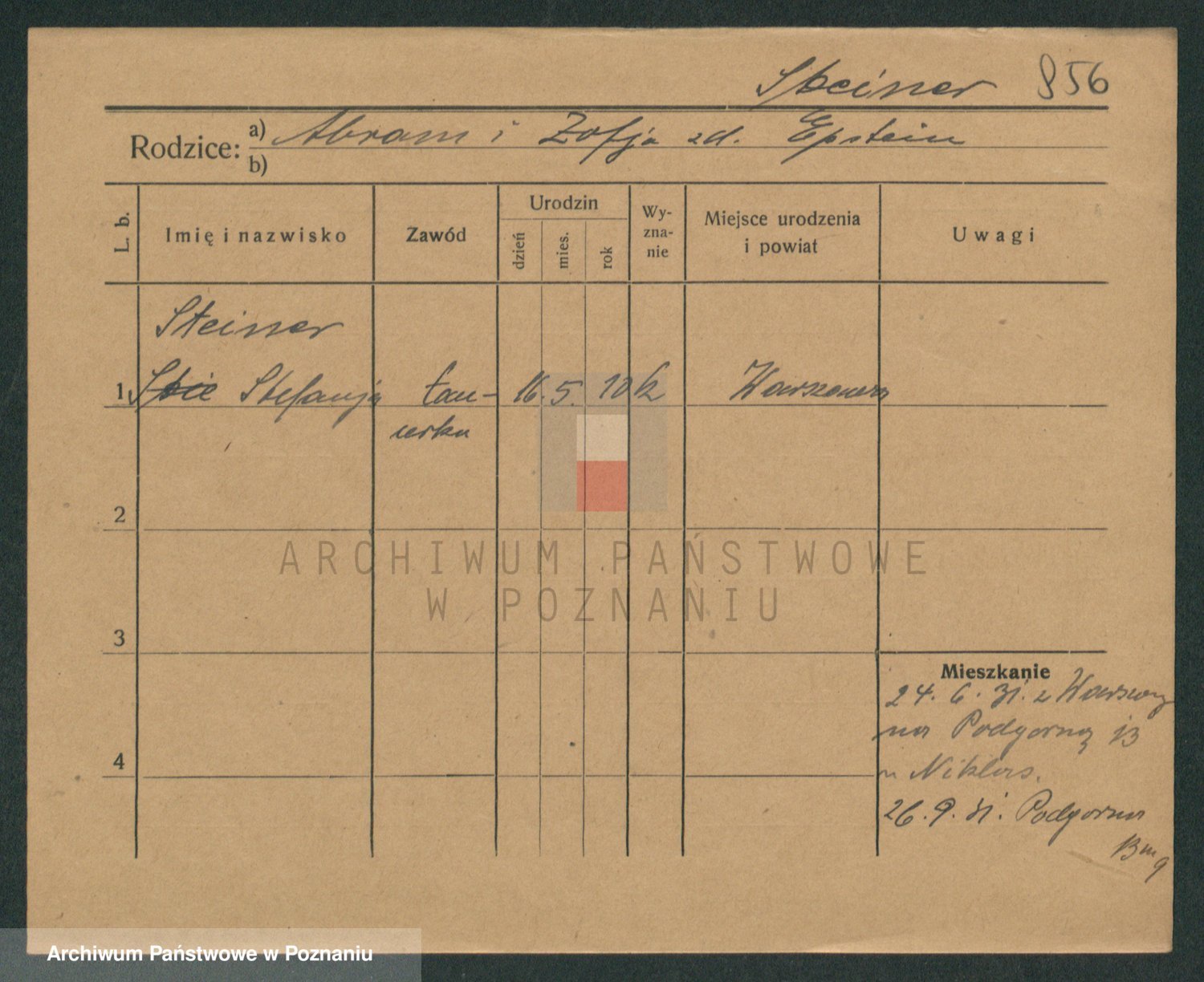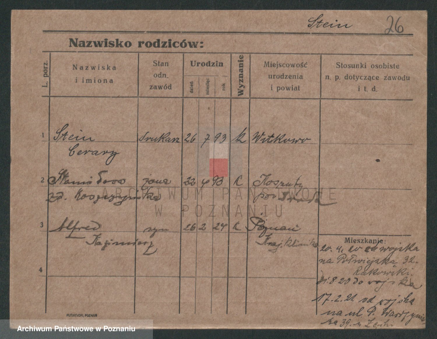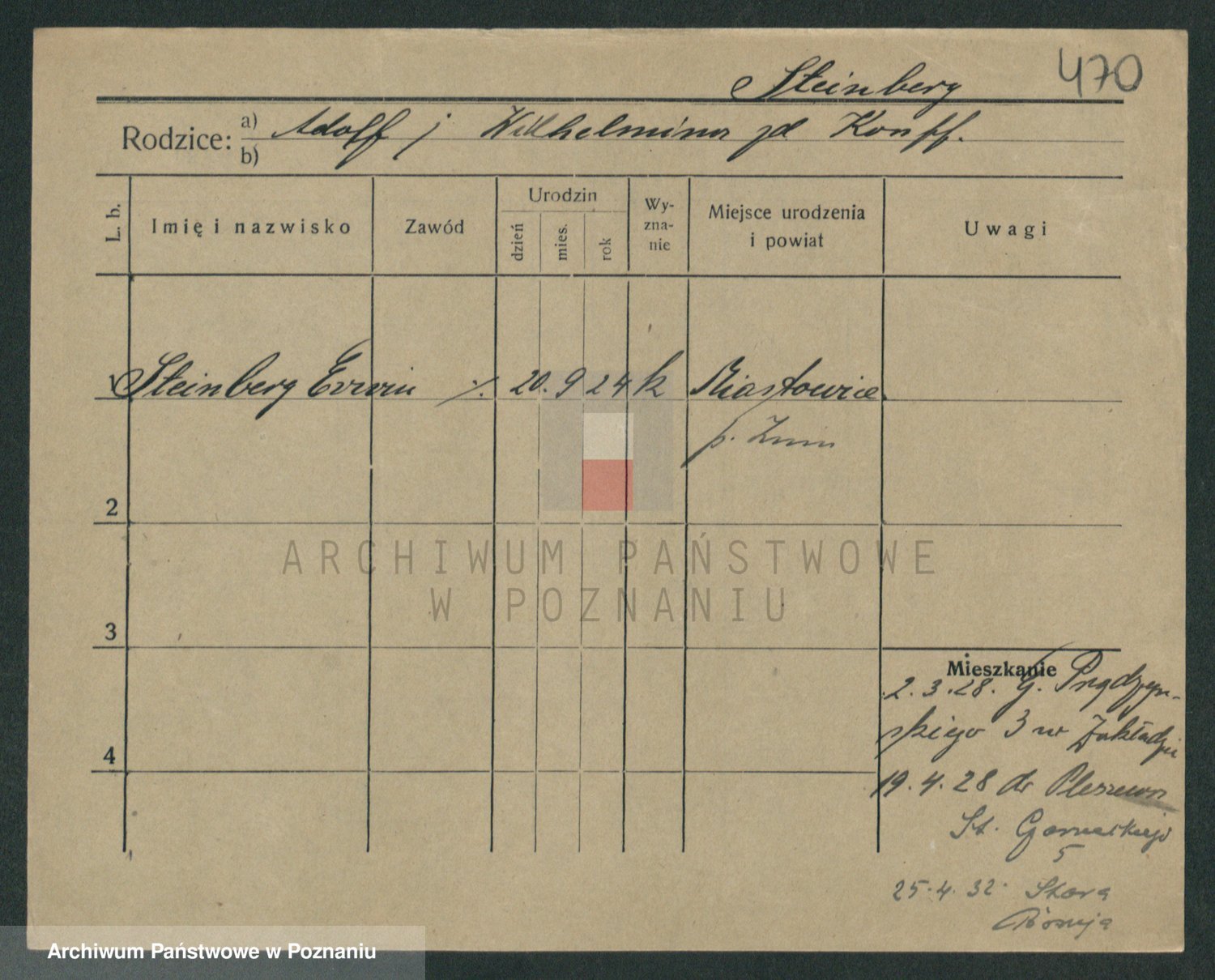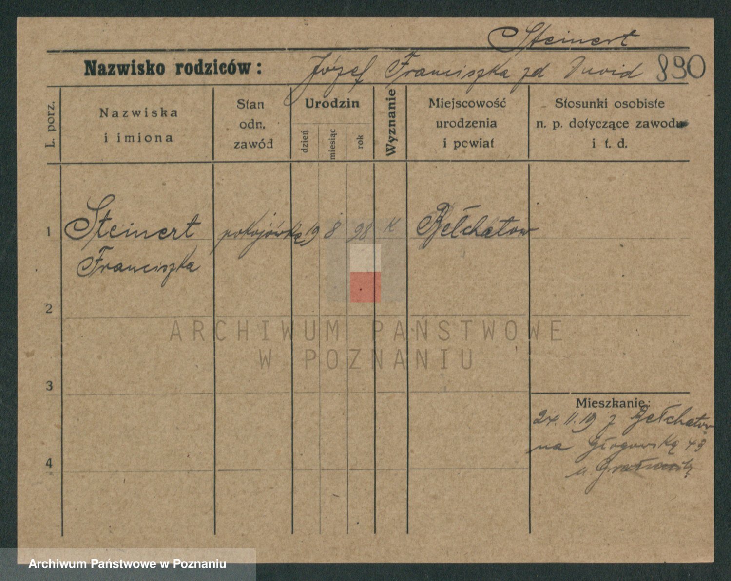 Podgląd karty osobowej dostępny jest po kliknięciu na nazwisko lub ikonkę karty. Można dokonywać powiększenia (ikony na górze) lub przechodzić między kolejnymi skanami (strzałki po bokach).