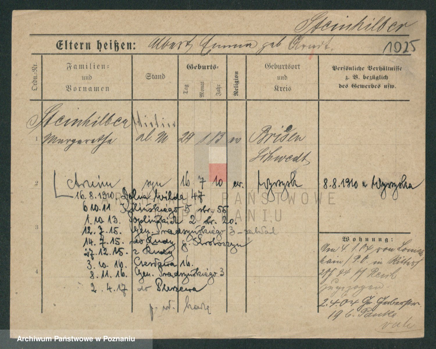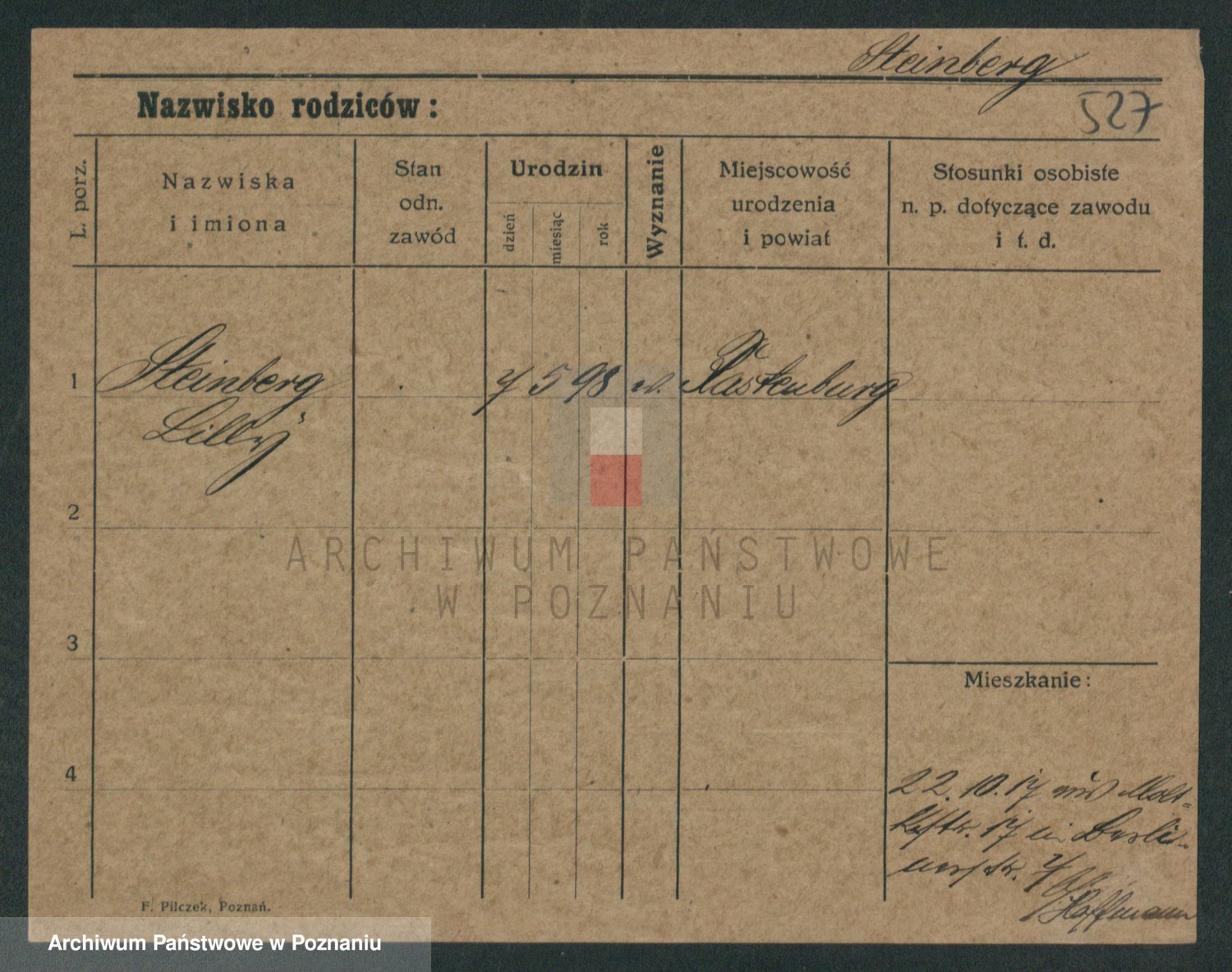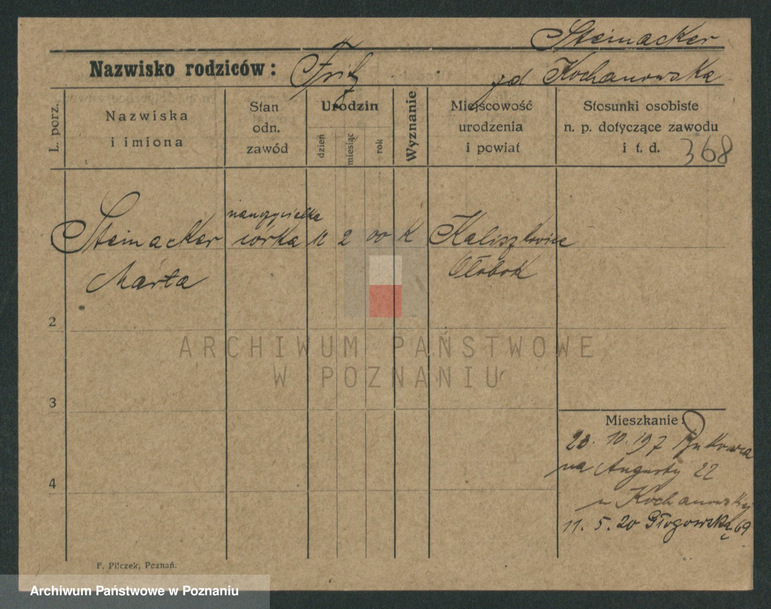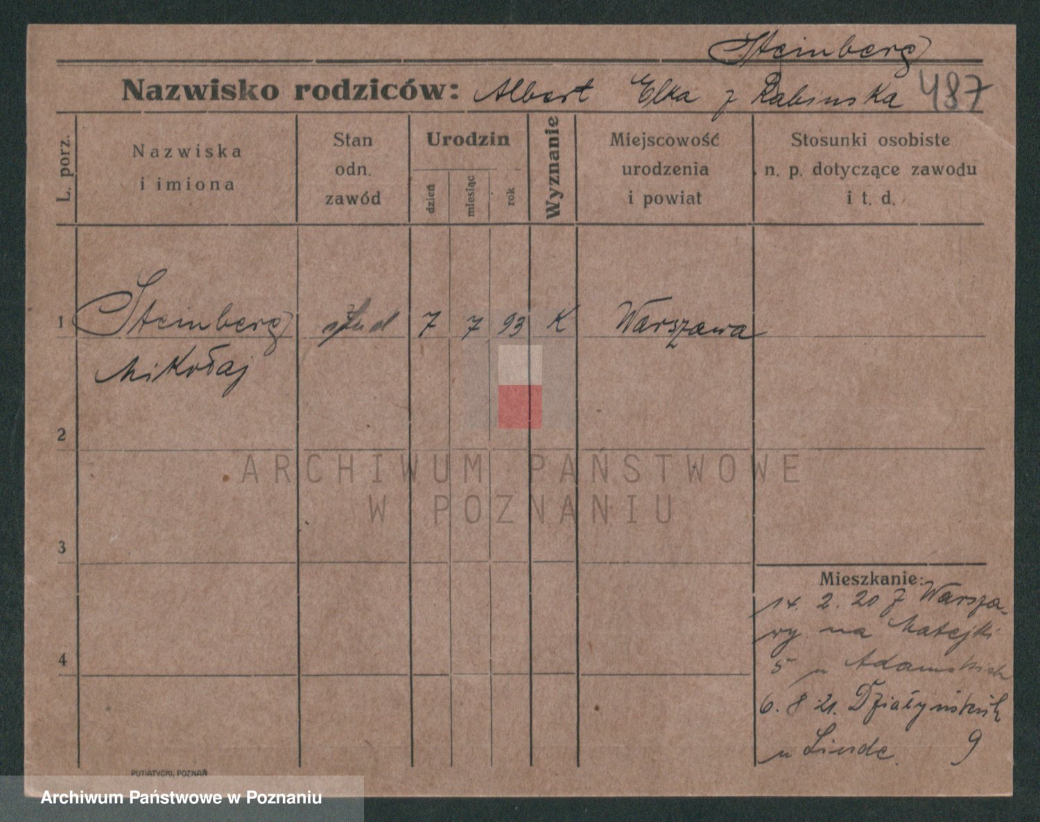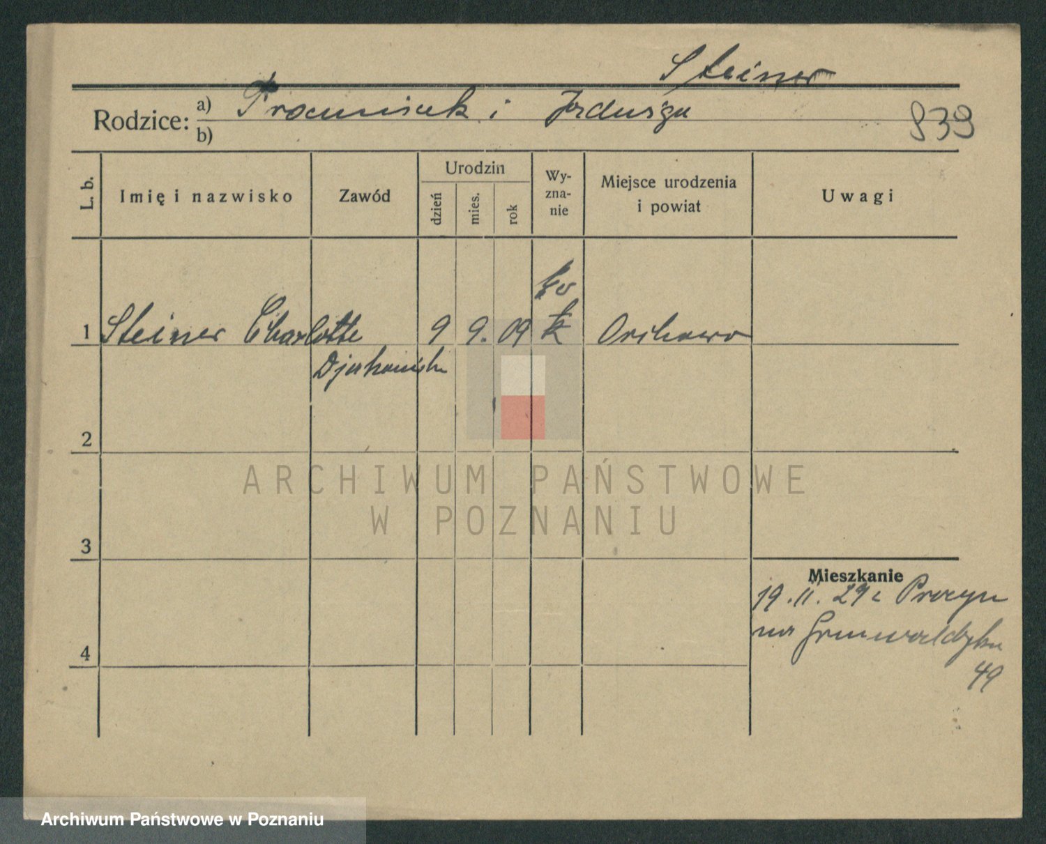 Podgląd karty osobowej dostępny jest po kliknięciu na nazwisko lub ikonkę karty. Można dokonywać powiększenia (ikony na górze) lub przechodzić między kolejnymi skanami (strzałki po bokach).