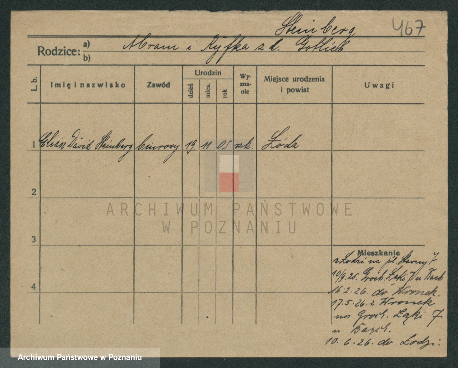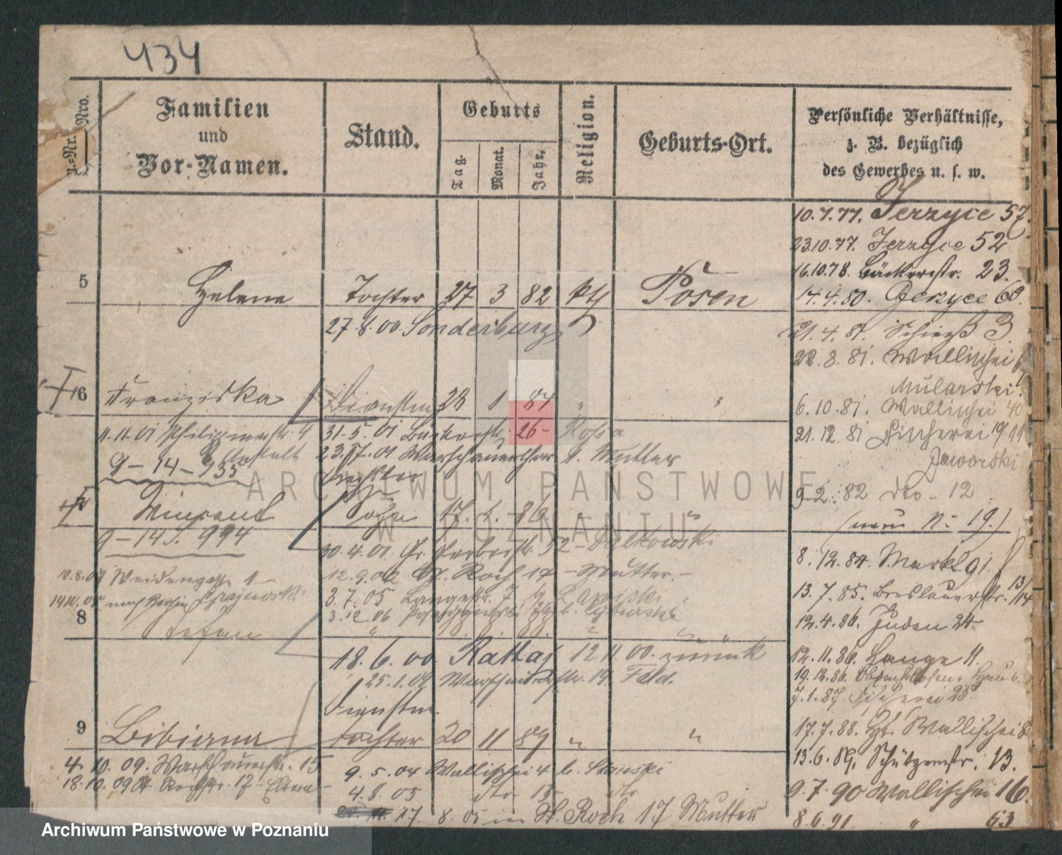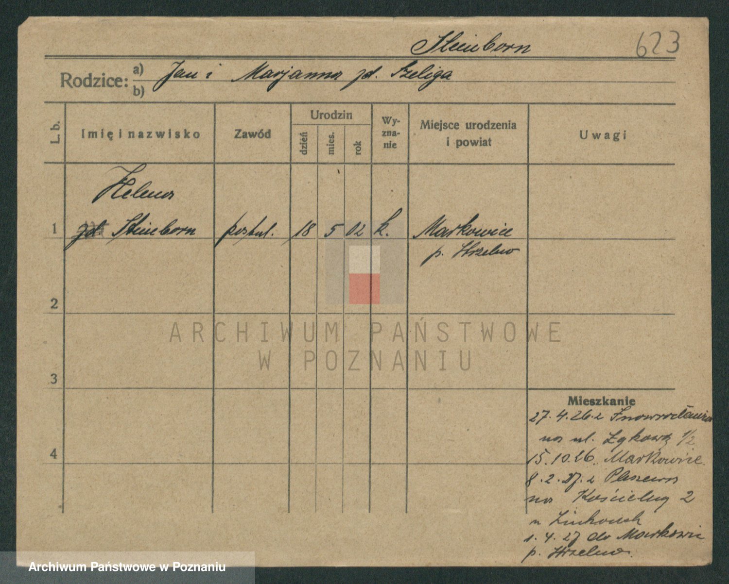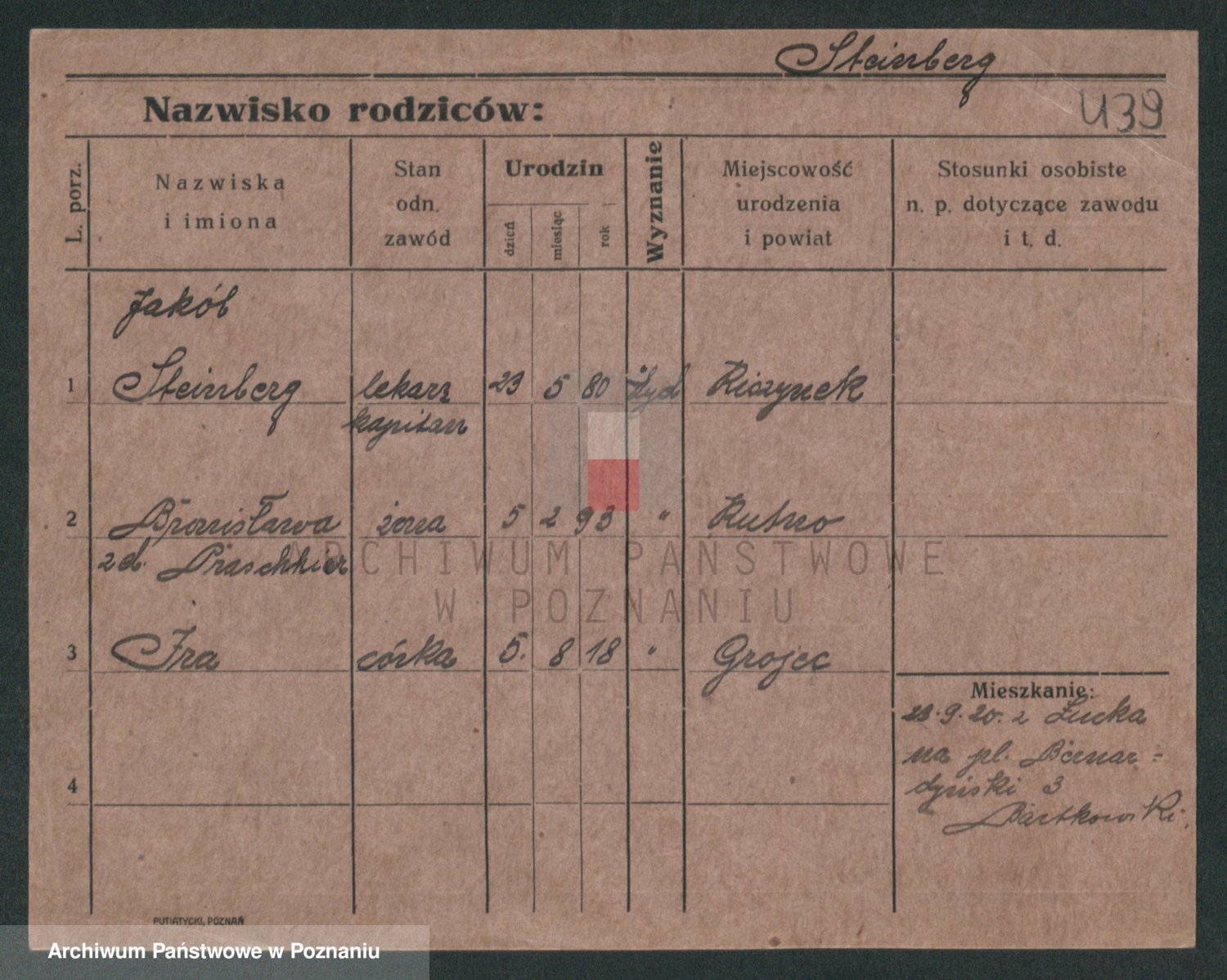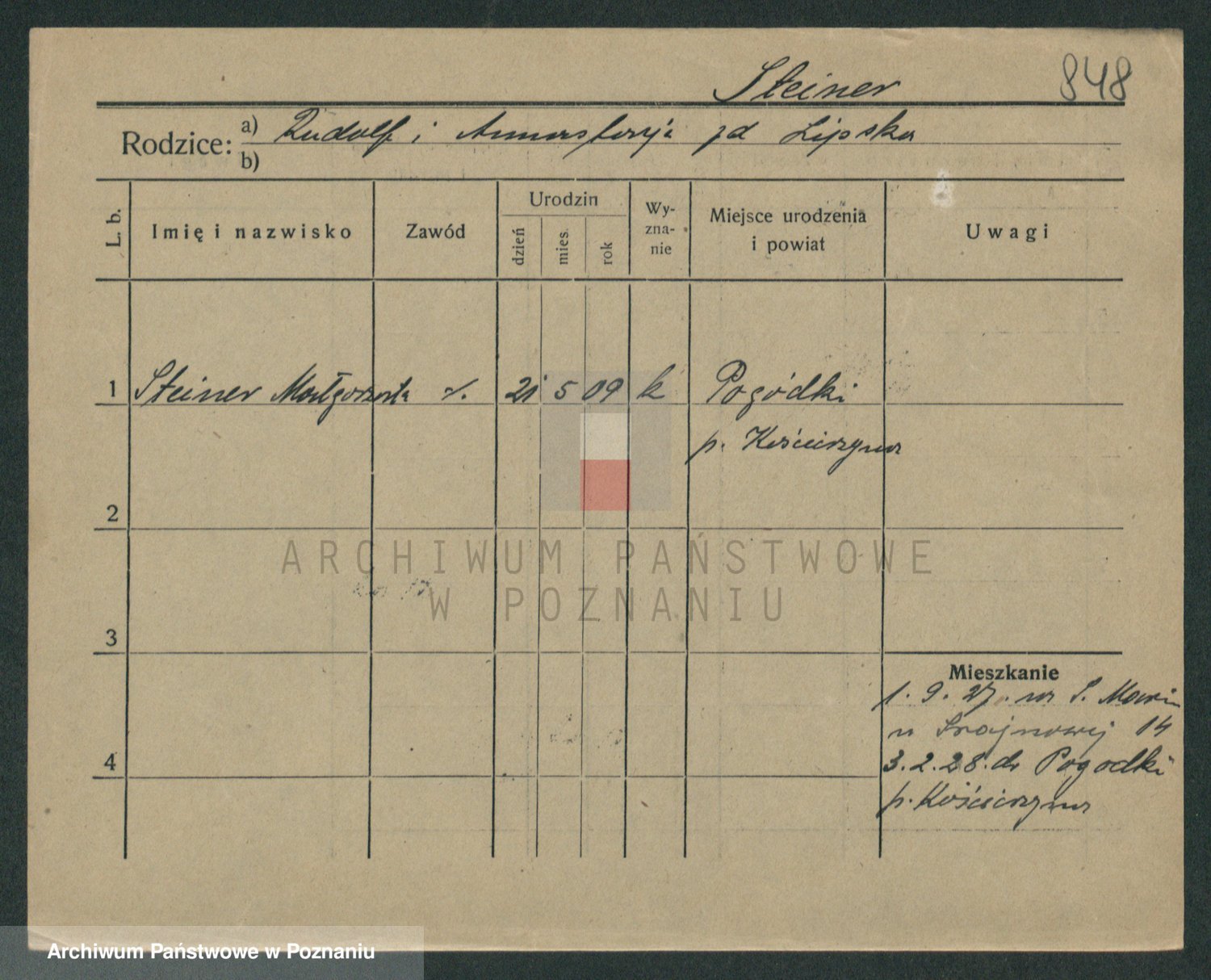 Podgląd karty osobowej dostępny jest po kliknięciu na nazwisko lub ikonkę karty. Można dokonywać powiększenia (ikony na górze) lub przechodzić między kolejnymi skanami (strzałki po bokach).
