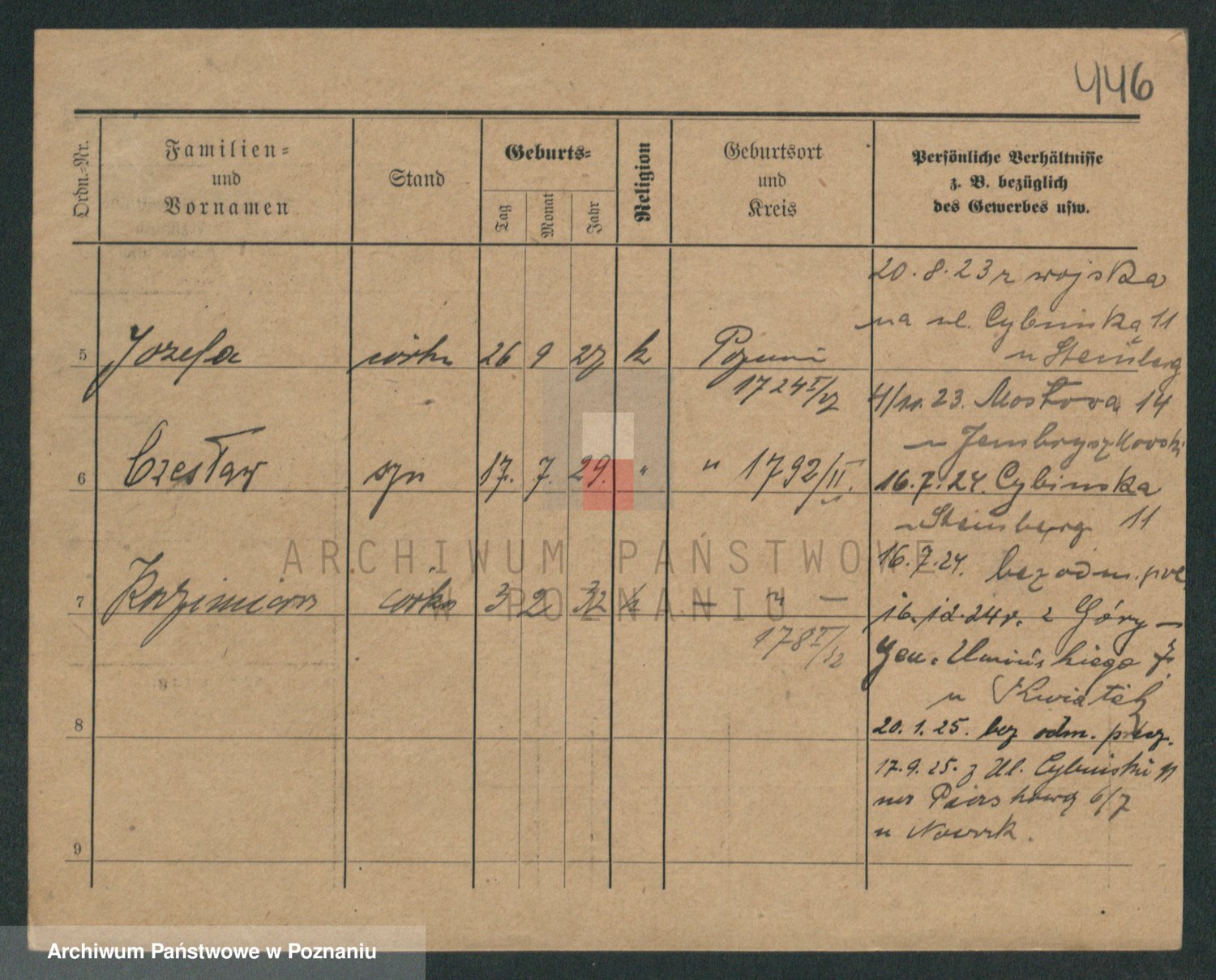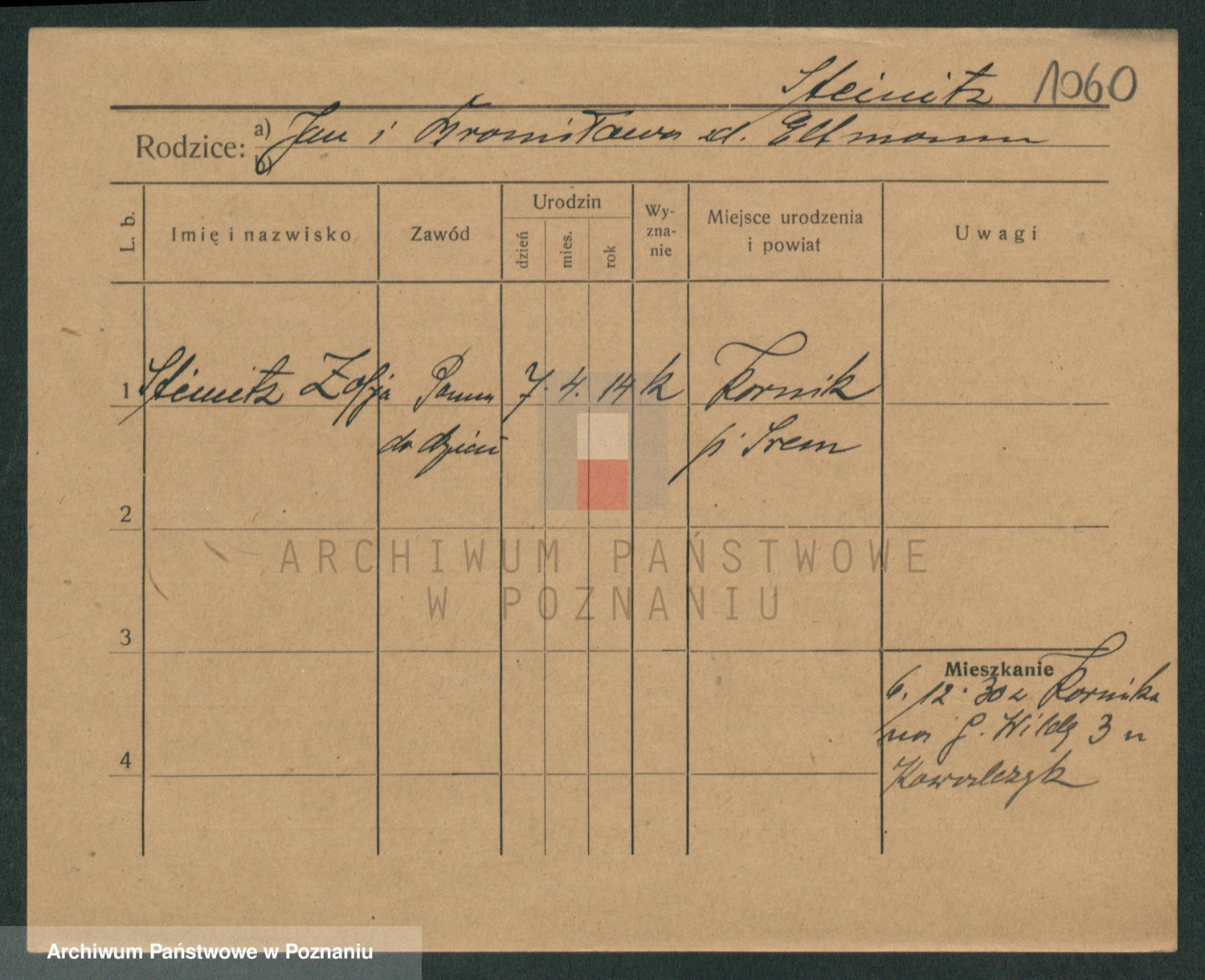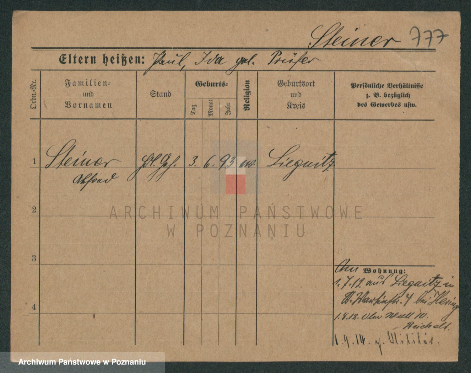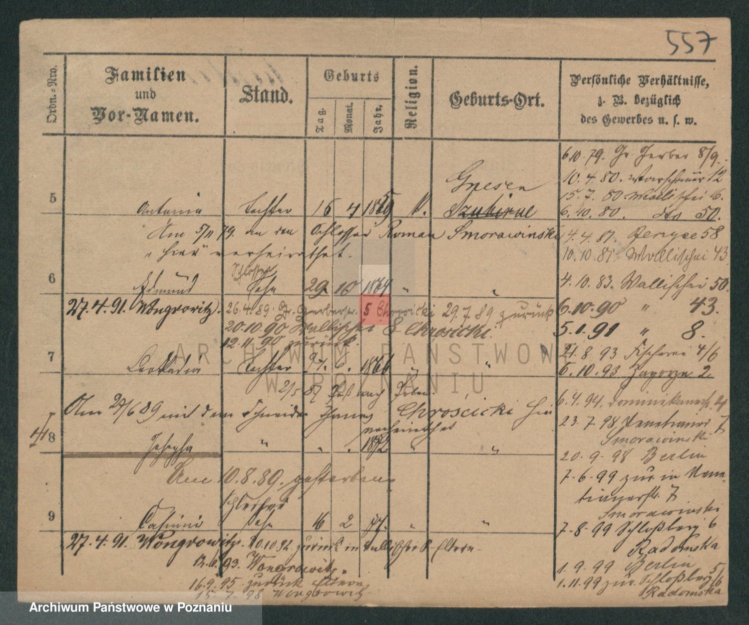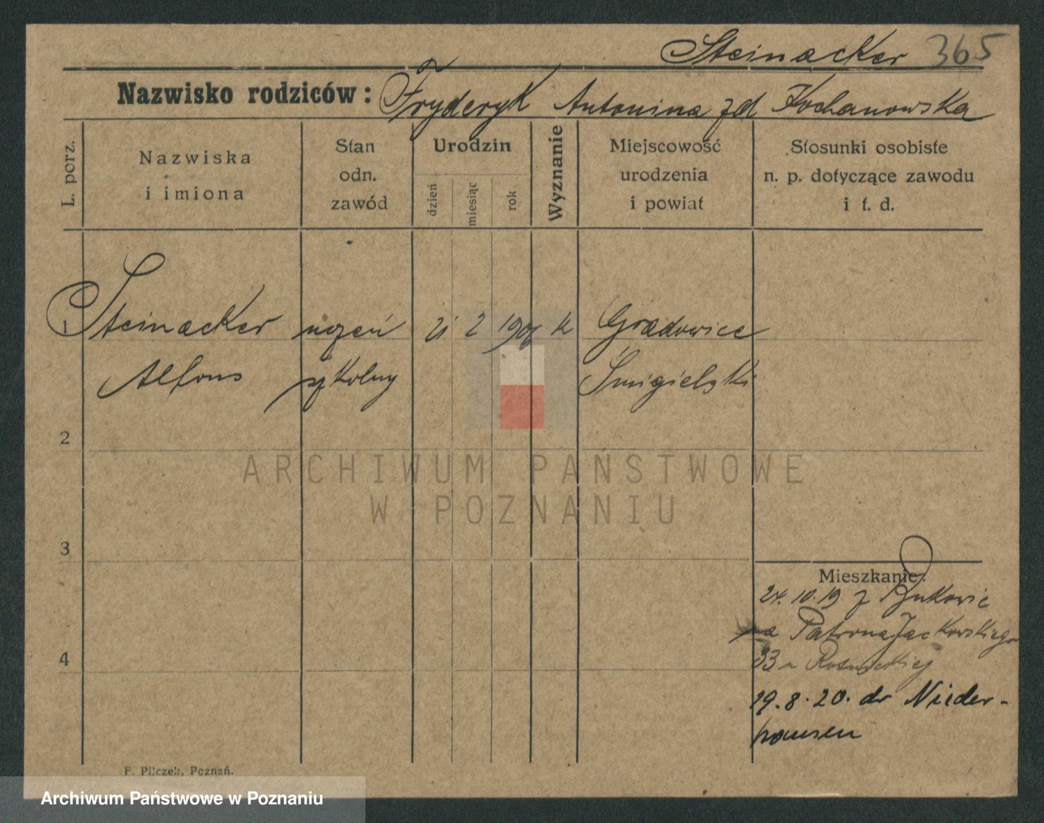 Podgląd karty osobowej dostępny jest po kliknięciu na nazwisko lub ikonkę karty. Można dokonywać powiększenia (ikony na górze) lub przechodzić między kolejnymi skanami (strzałki po bokach).