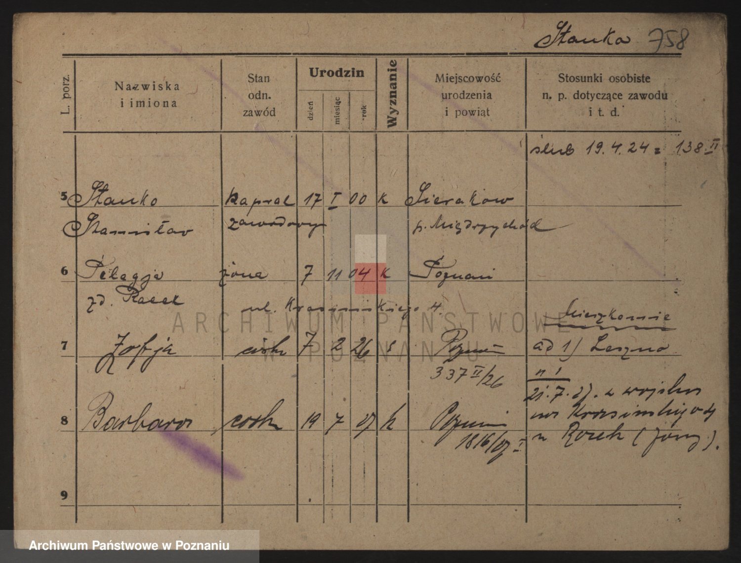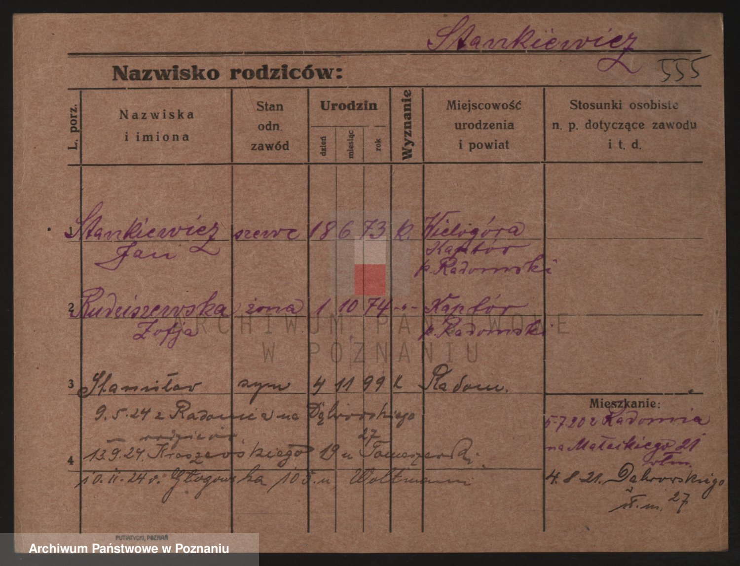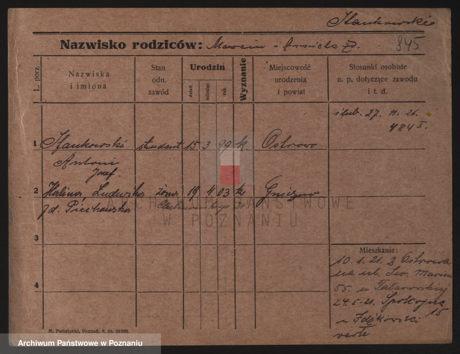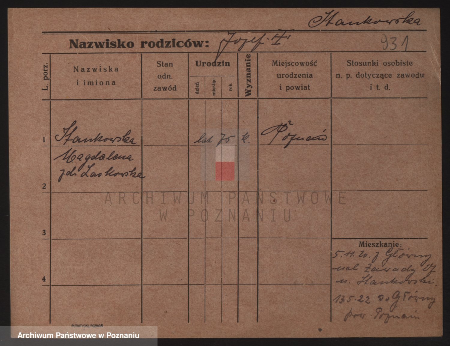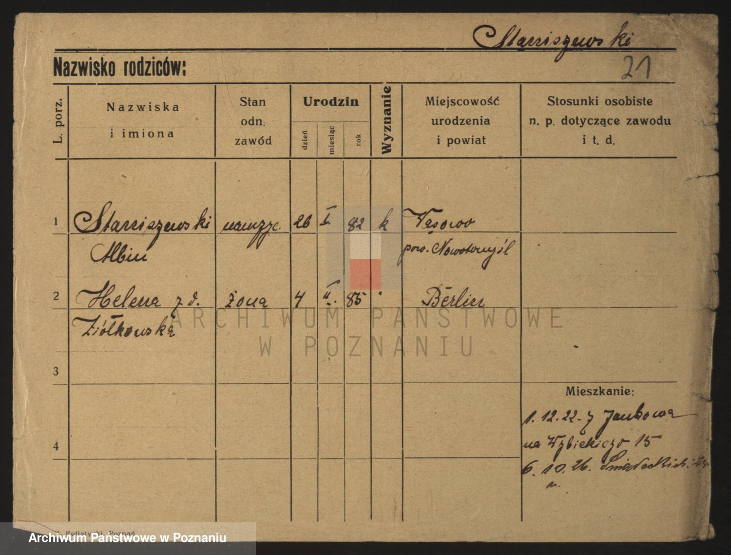 Podgląd karty osobowej dostępny jest po kliknięciu na nazwisko lub ikonkę karty. Można dokonywać powiększenia (ikony na górze) lub przechodzić między kolejnymi skanami (strzałki po bokach).