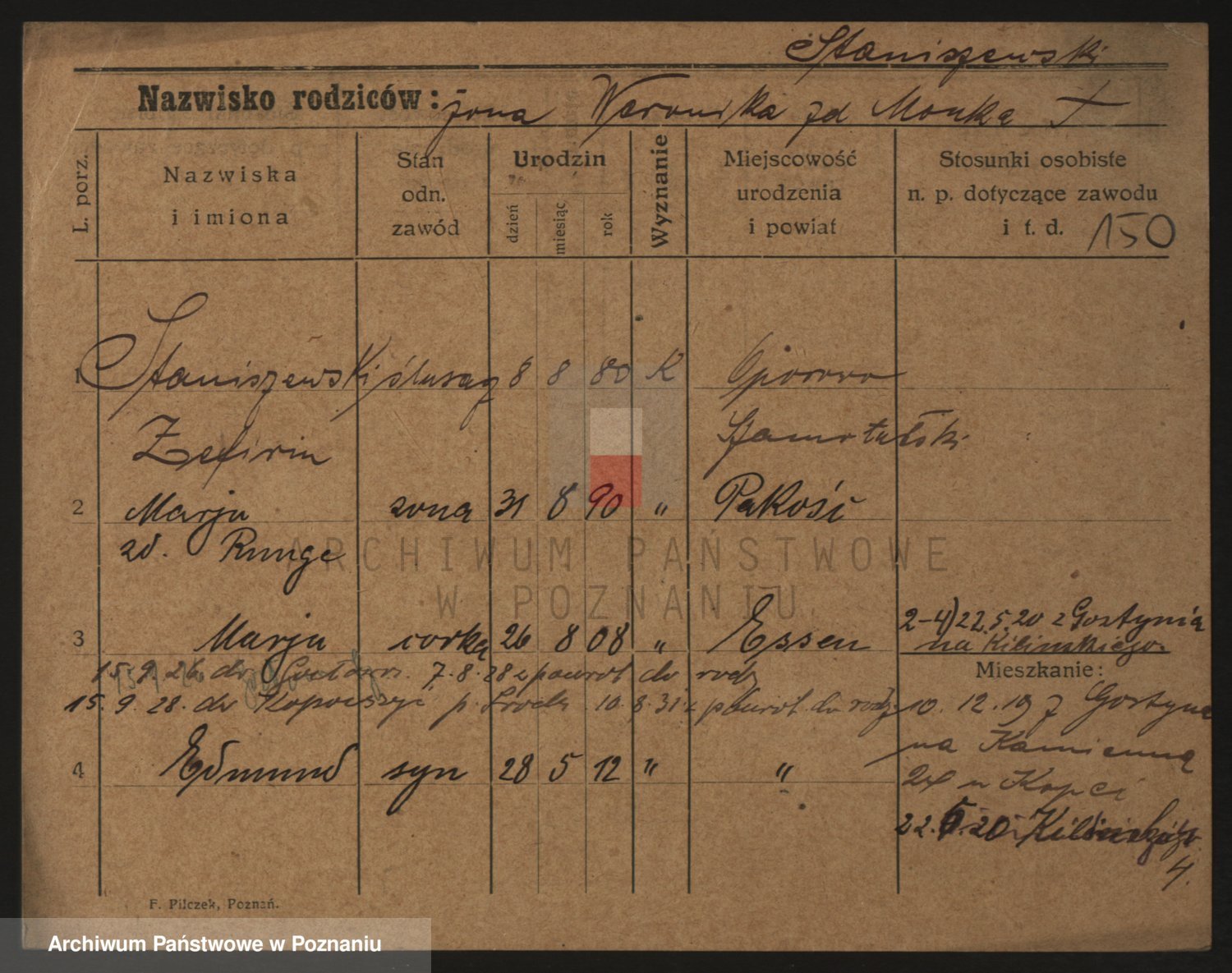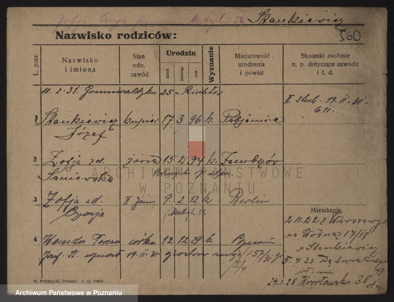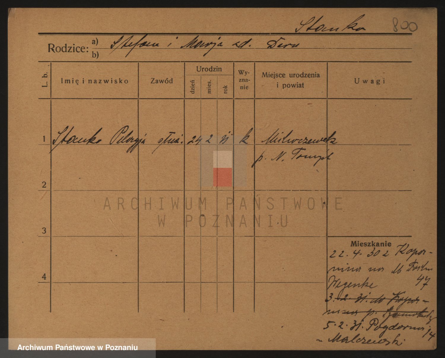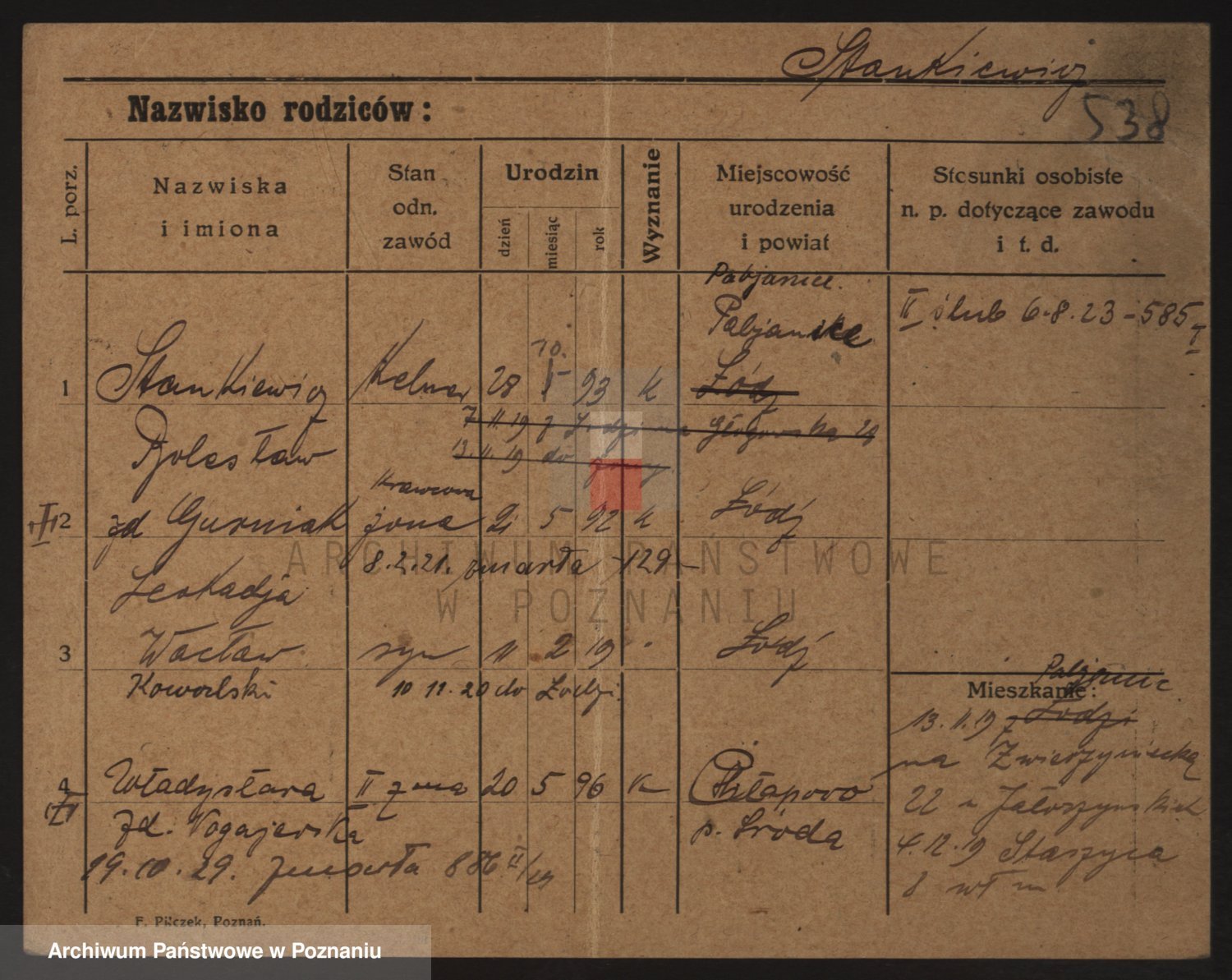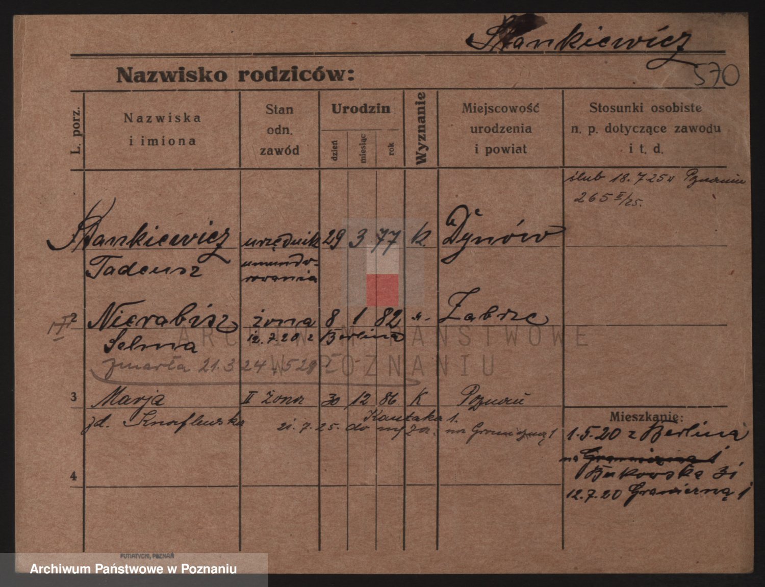 Podgląd karty osobowej dostępny jest po kliknięciu na nazwisko lub ikonkę karty. Można dokonywać powiększenia (ikony na górze) lub przechodzić między kolejnymi skanami (strzałki po bokach).