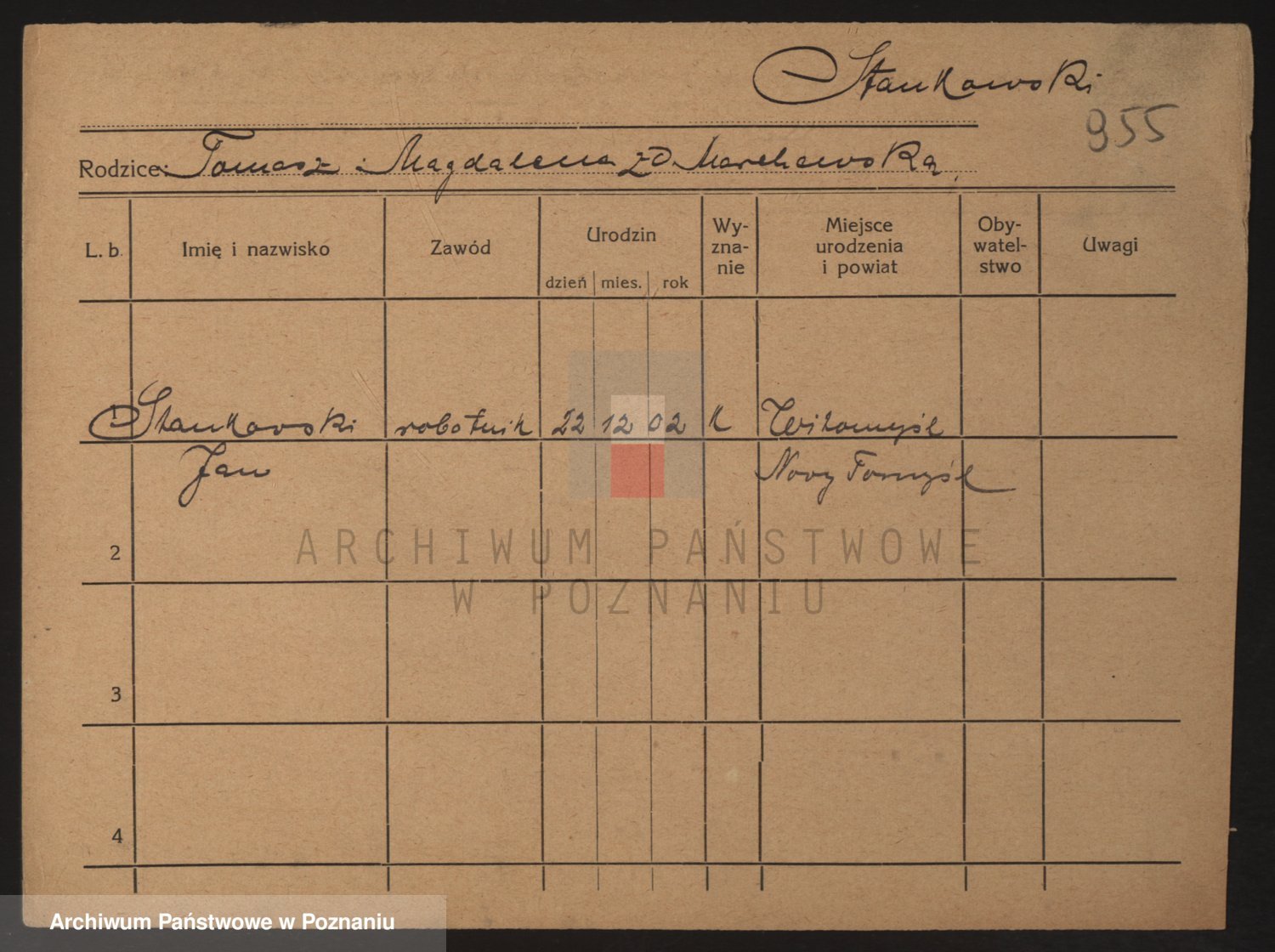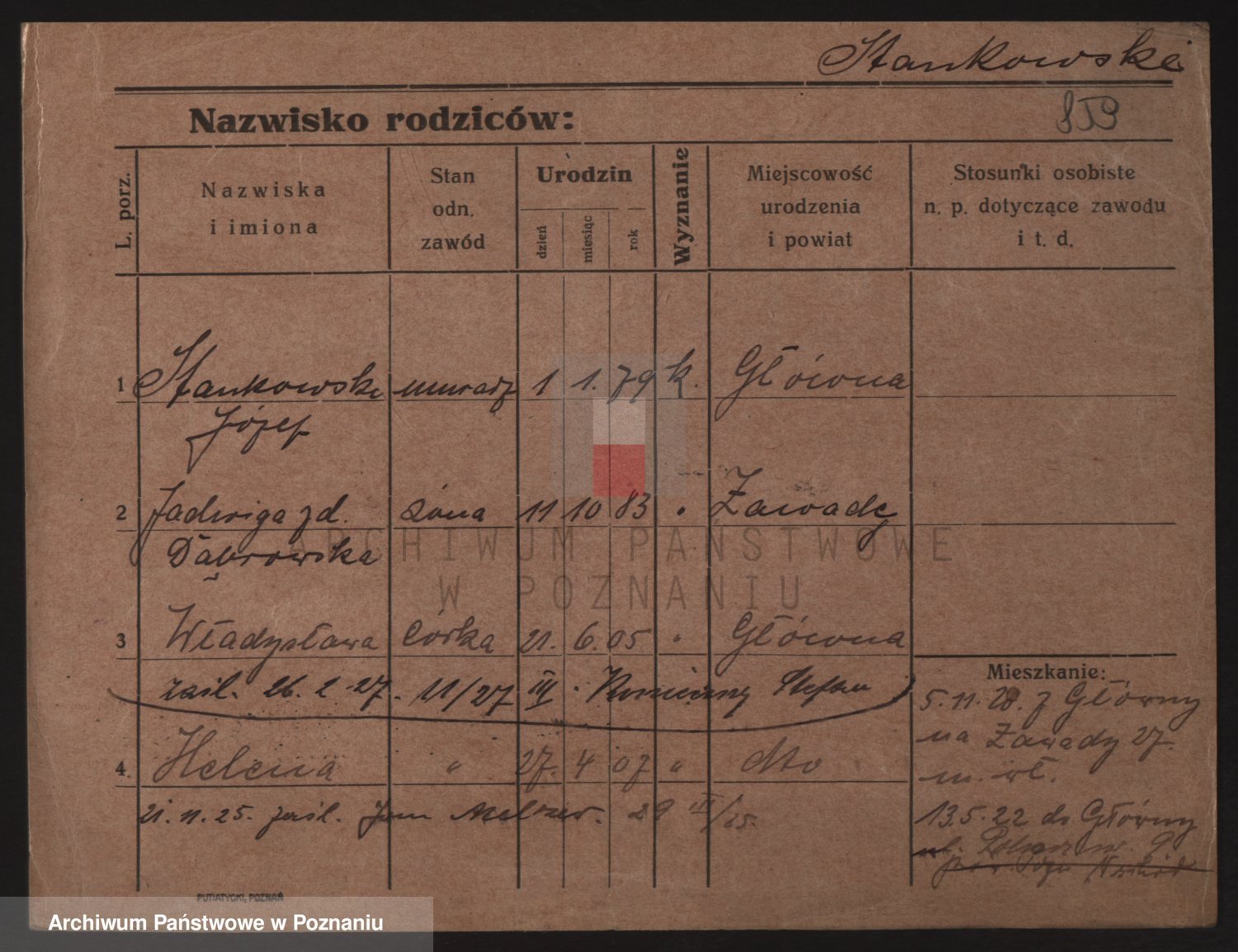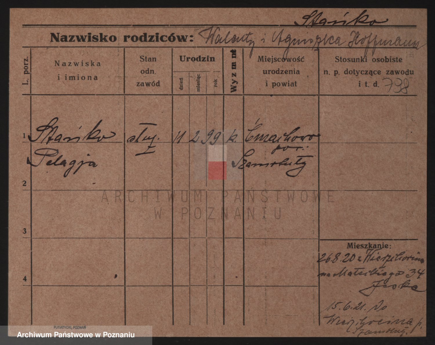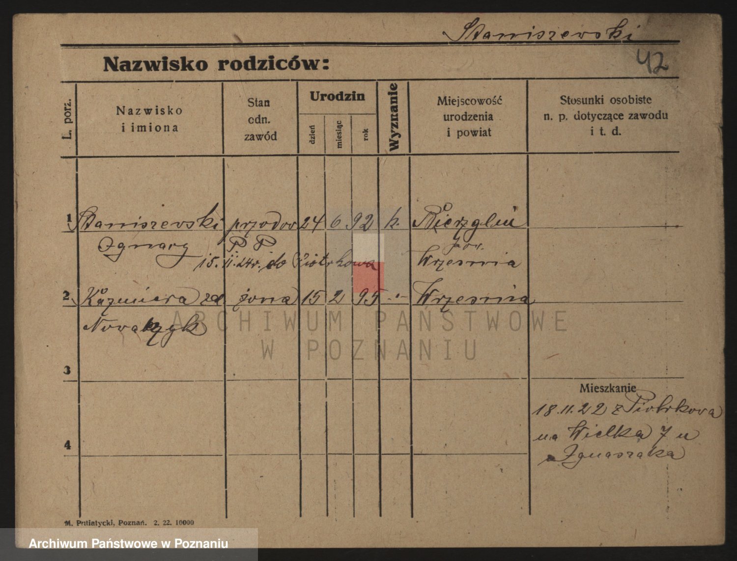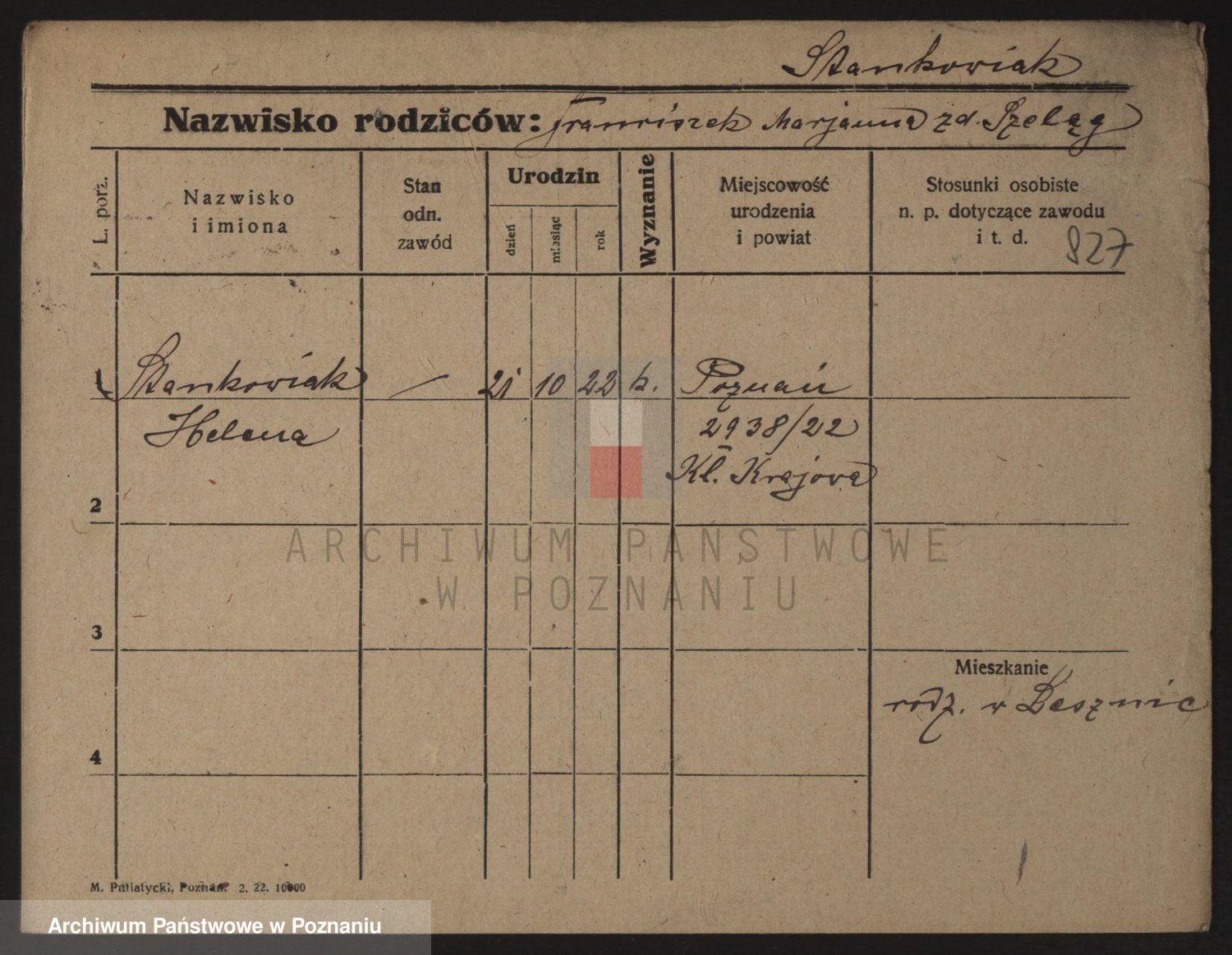Podgląd karty osobowej dostępny jest po kliknięciu na nazwisko lub ikonkę karty. Można dokonywać powiększenia (ikony na górze) lub przechodzić między kolejnymi skanami (strzałki po bokach).