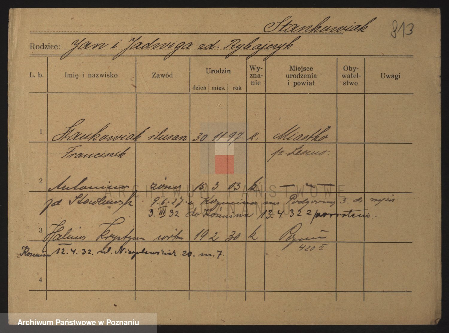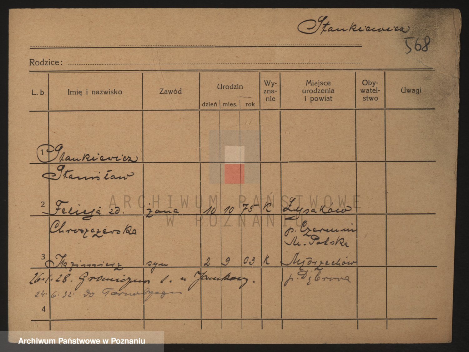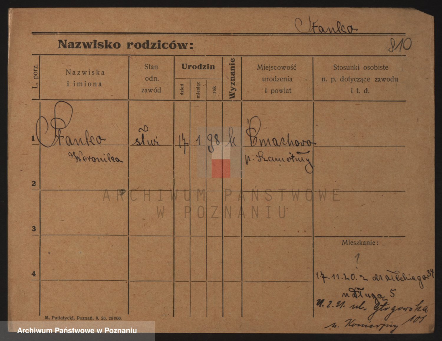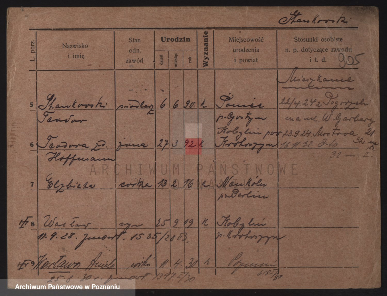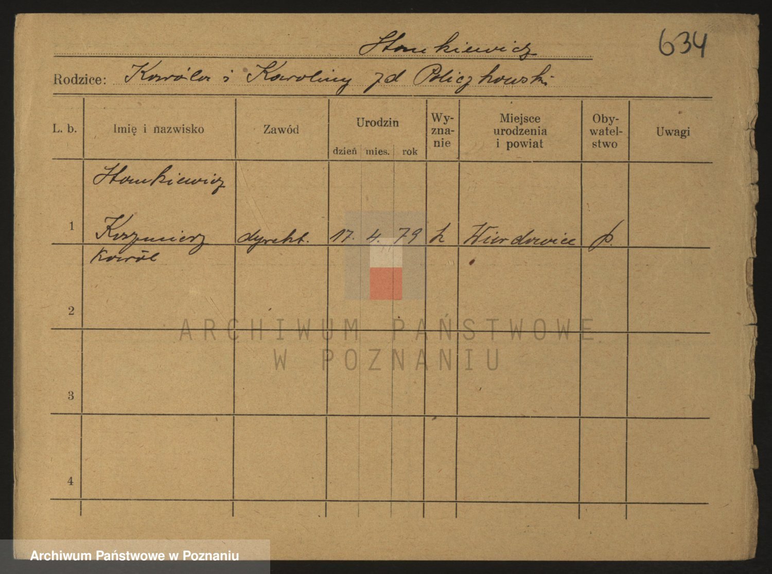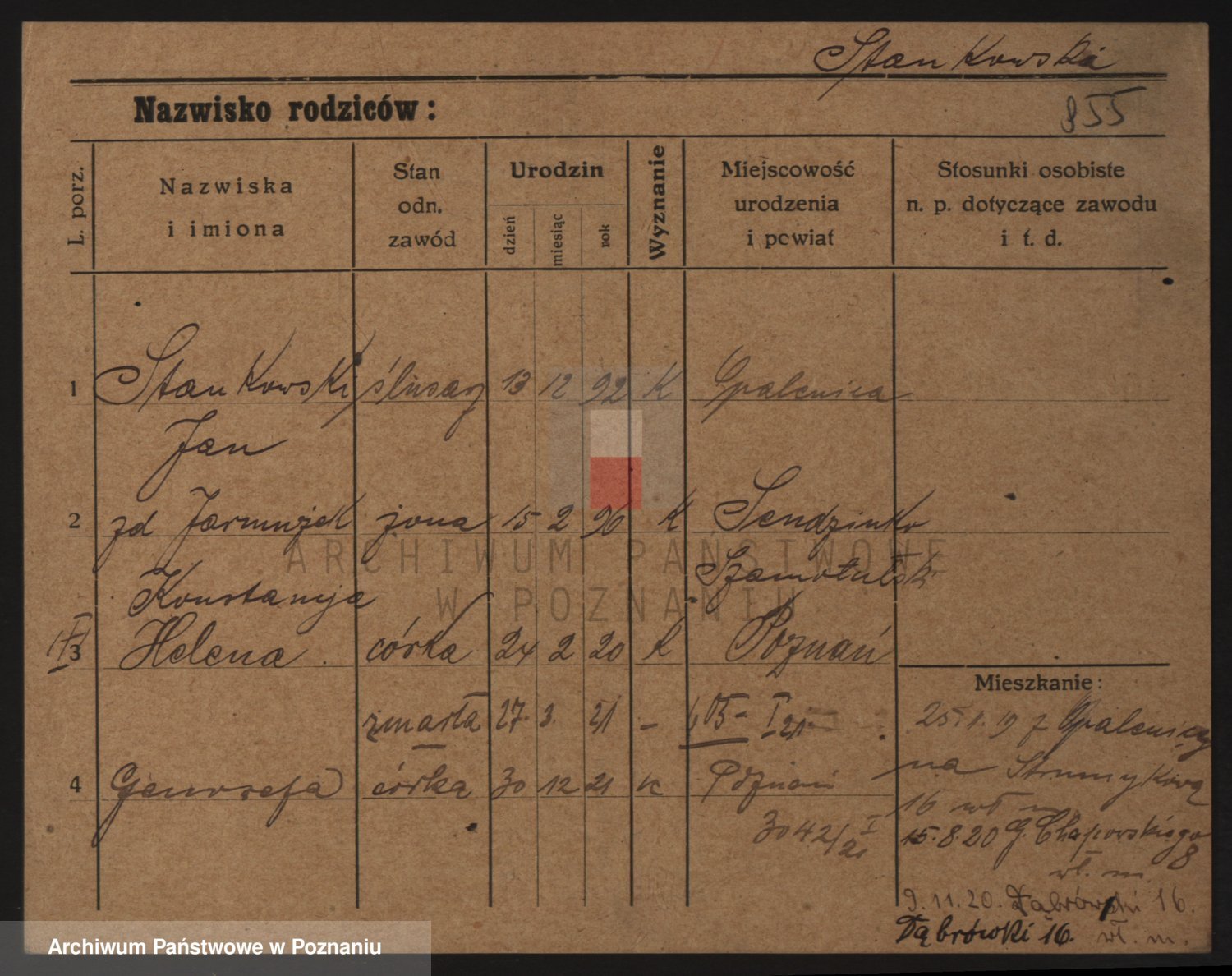 Podgląd karty osobowej dostępny jest po kliknięciu na nazwisko lub ikonkę karty. Można dokonywać powiększenia (ikony na górze) lub przechodzić między kolejnymi skanami (strzałki po bokach).