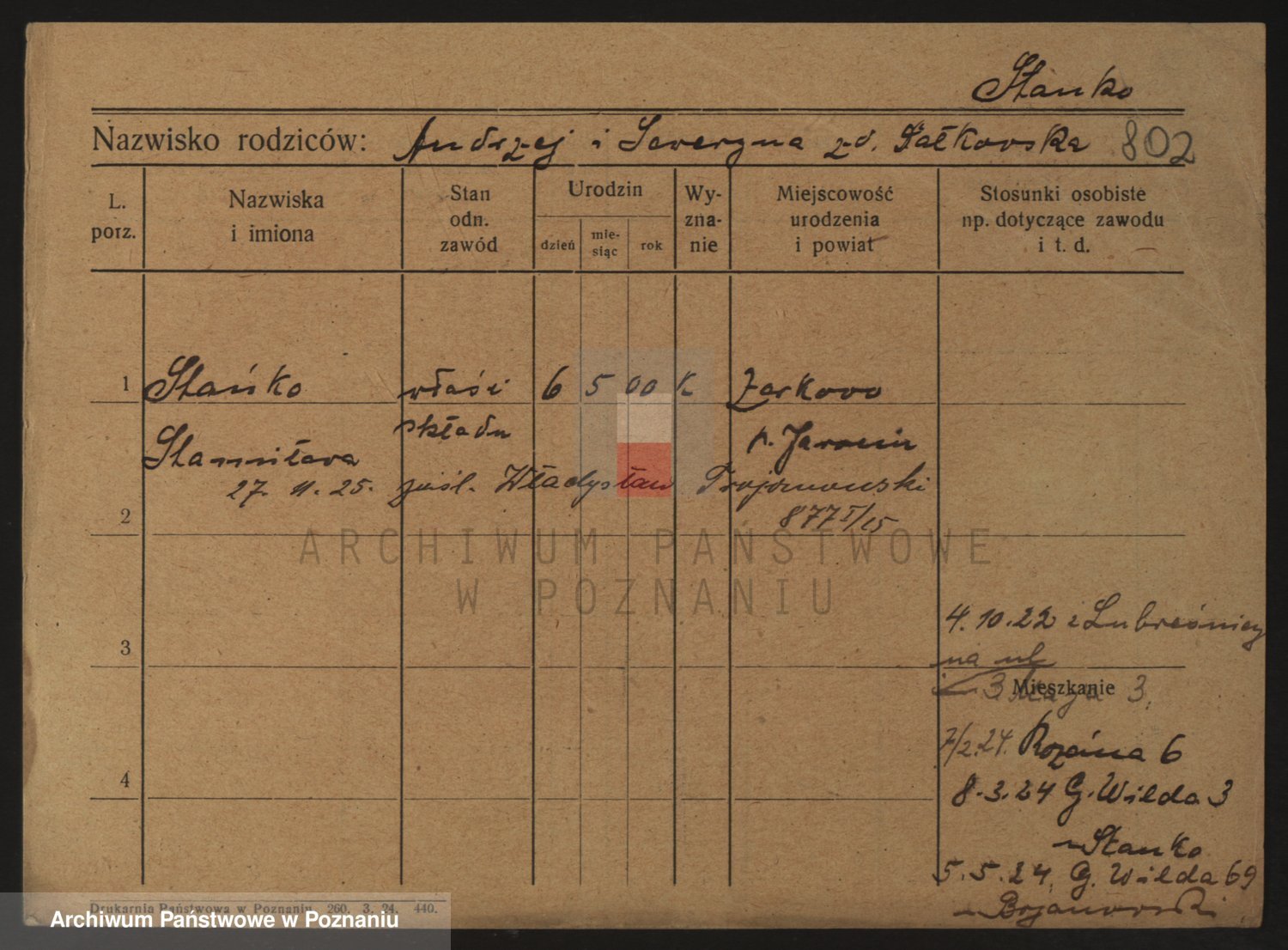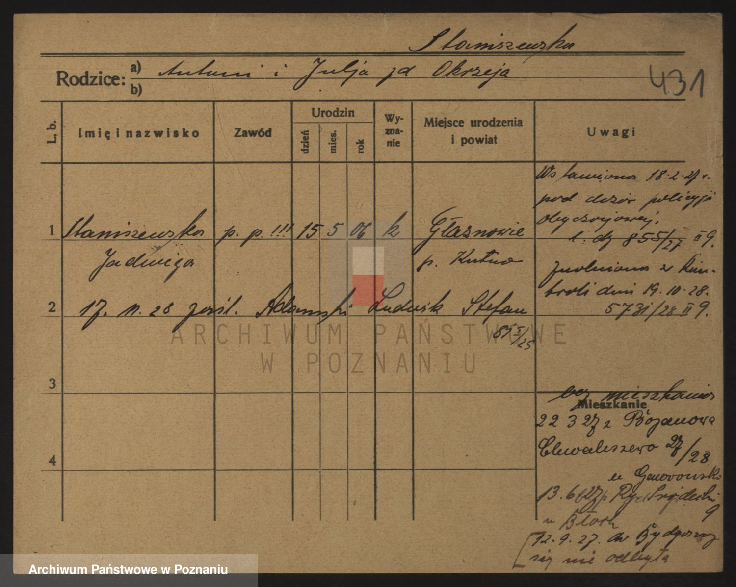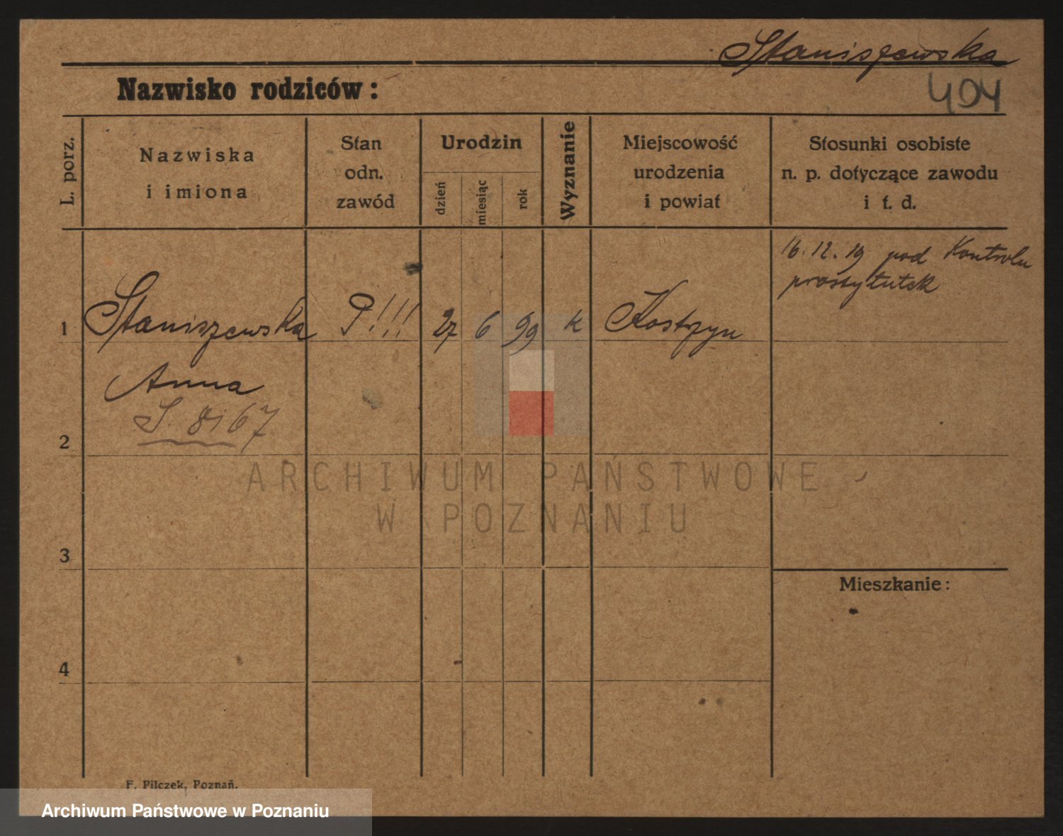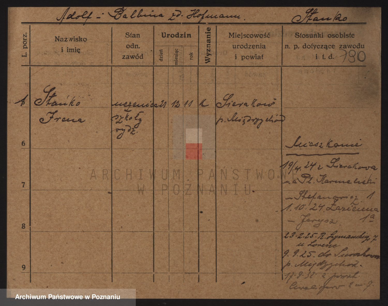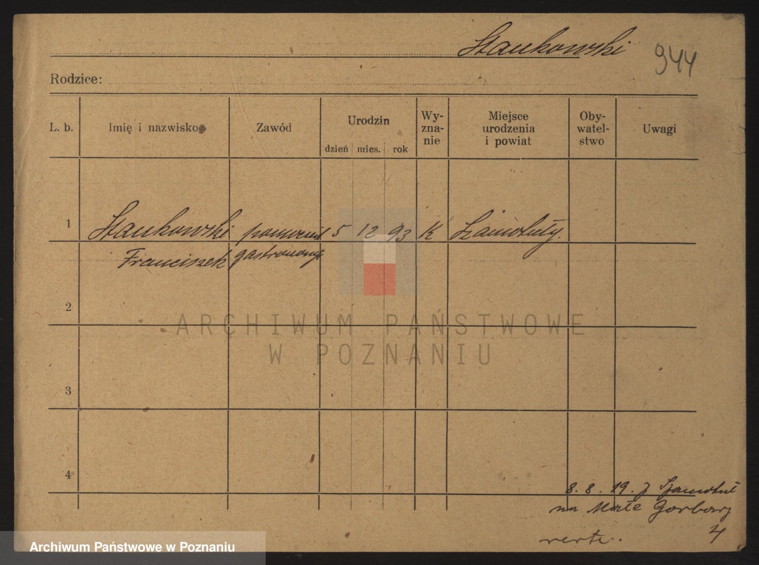 Podgląd karty osobowej dostępny jest po kliknięciu na nazwisko lub ikonkę karty. Można dokonywać powiększenia (ikony na górze) lub przechodzić między kolejnymi skanami (strzałki po bokach).