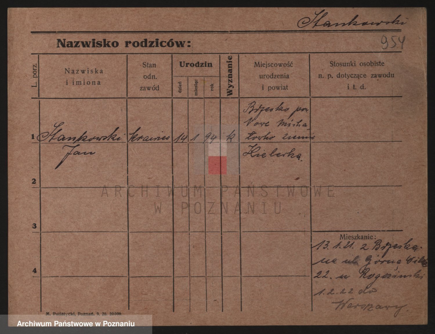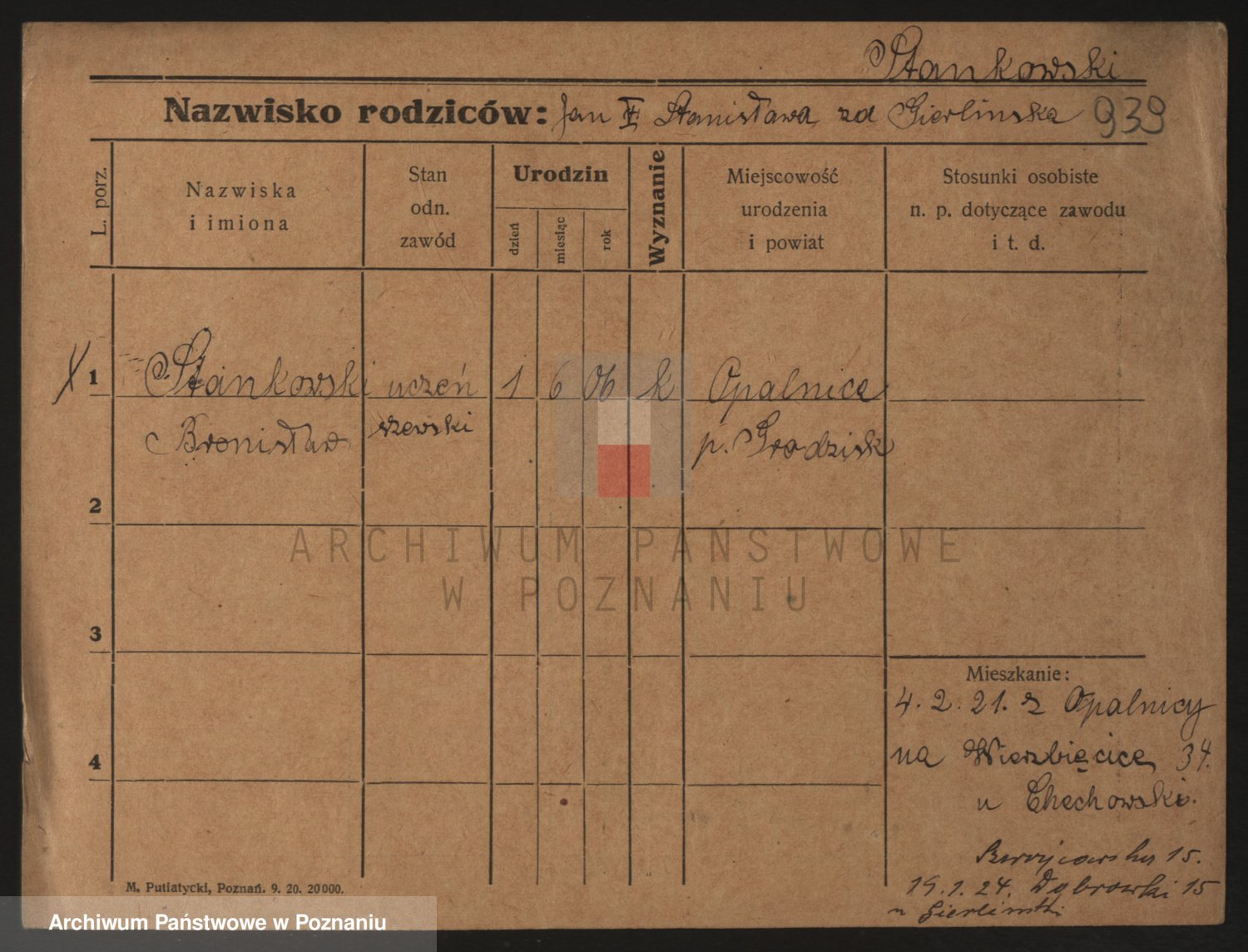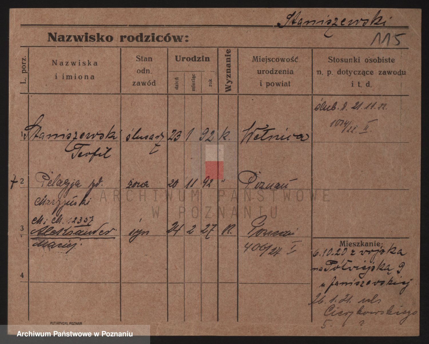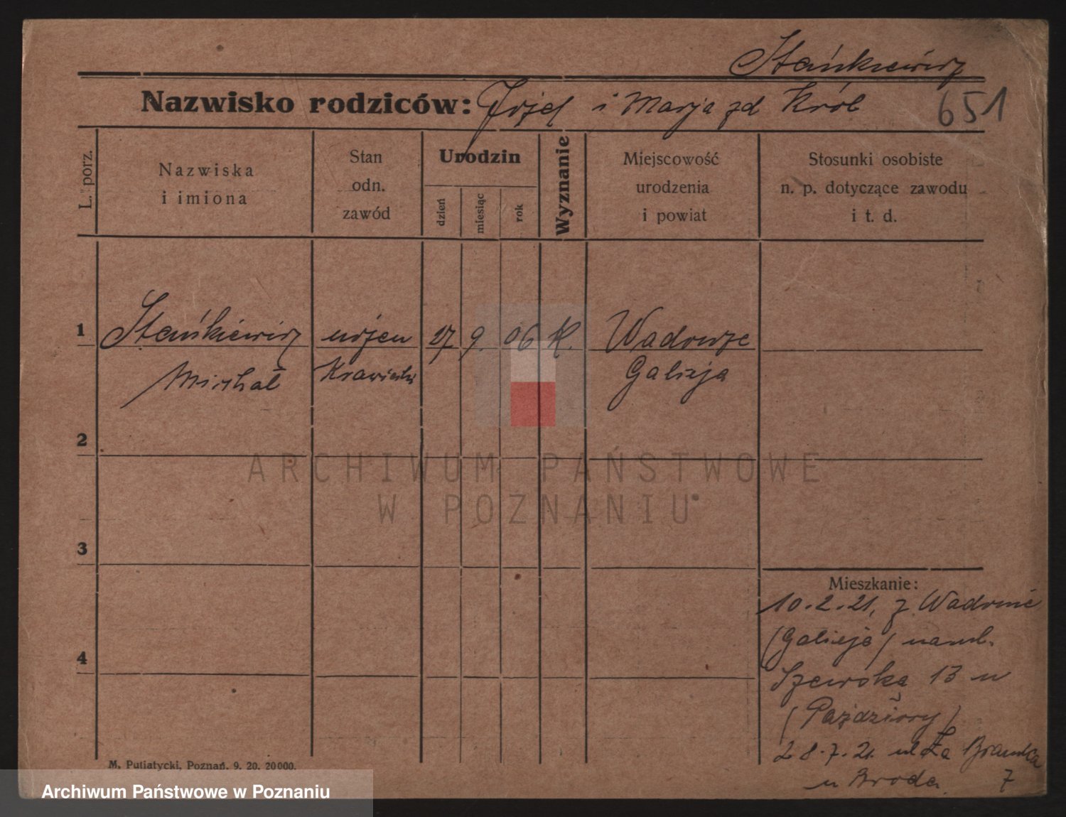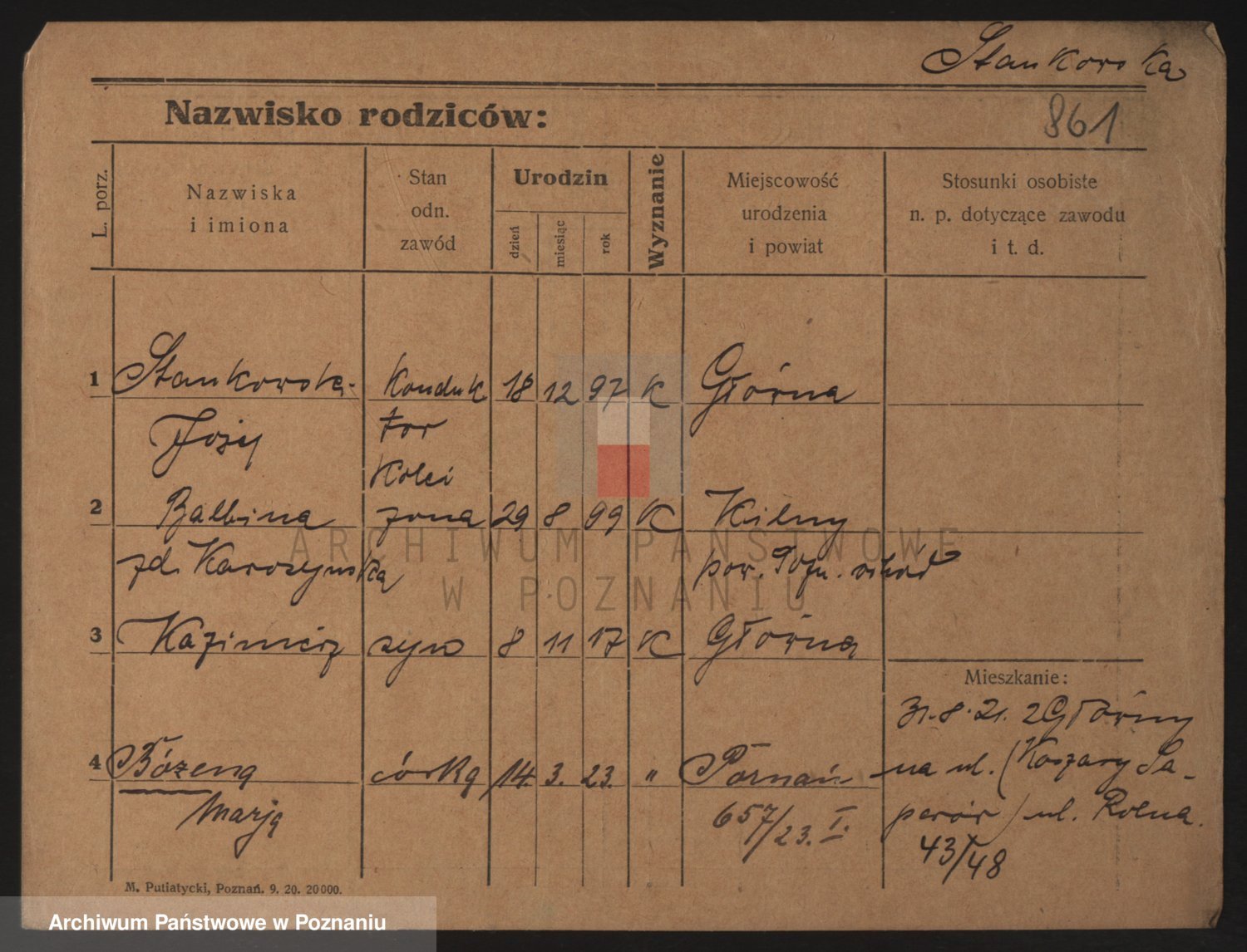 Podgląd karty osobowej dostępny jest po kliknięciu na nazwisko lub ikonkę karty. Można dokonywać powiększenia (ikony na górze) lub przechodzić między kolejnymi skanami (strzałki po bokach).