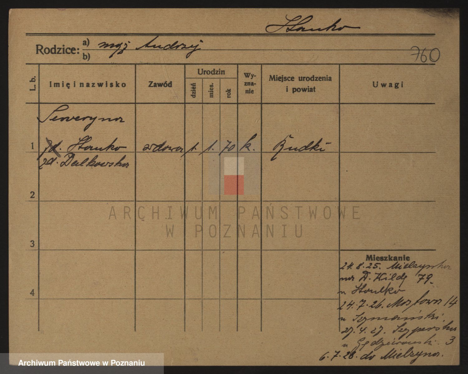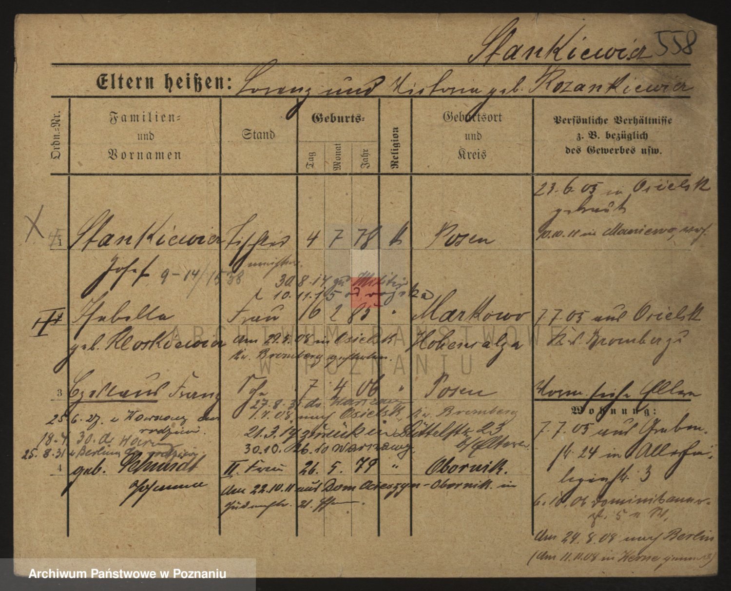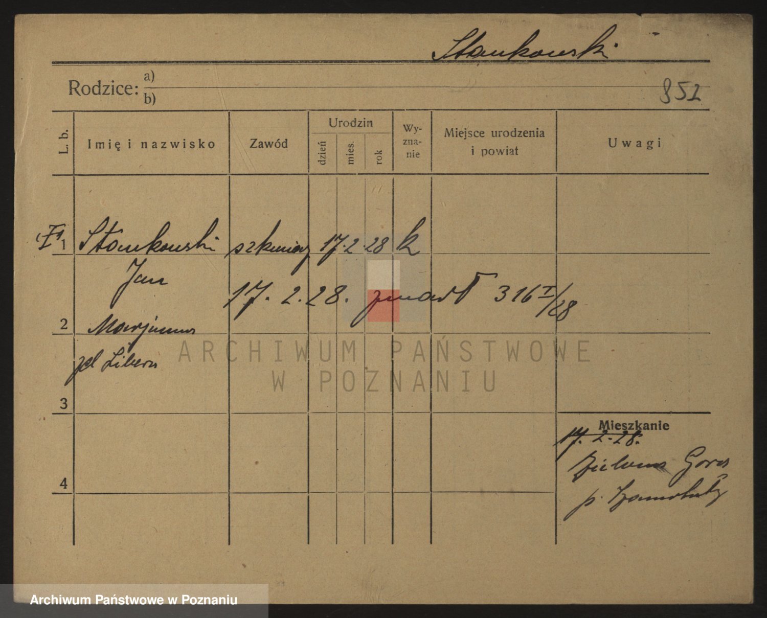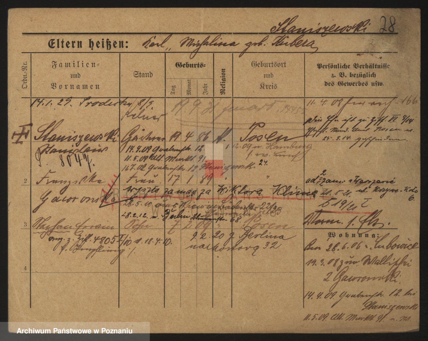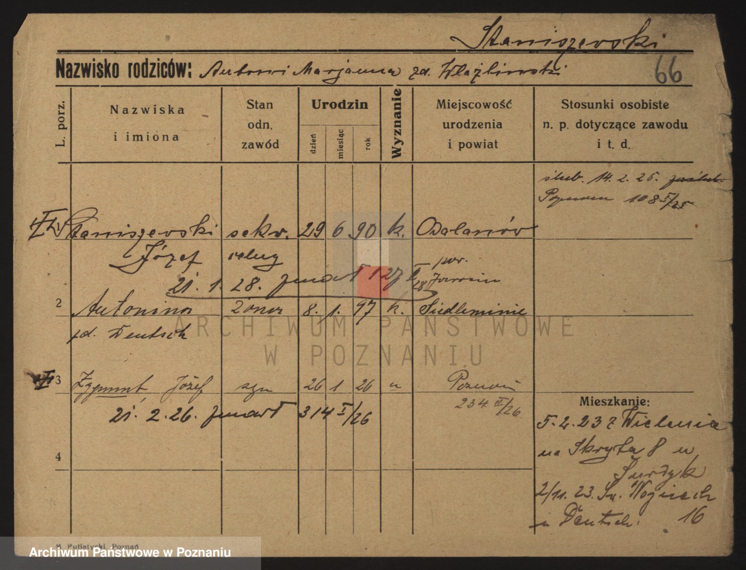 Podgląd karty osobowej dostępny jest po kliknięciu na nazwisko lub ikonkę karty. Można dokonywać powiększenia (ikony na górze) lub przechodzić między kolejnymi skanami (strzałki po bokach).