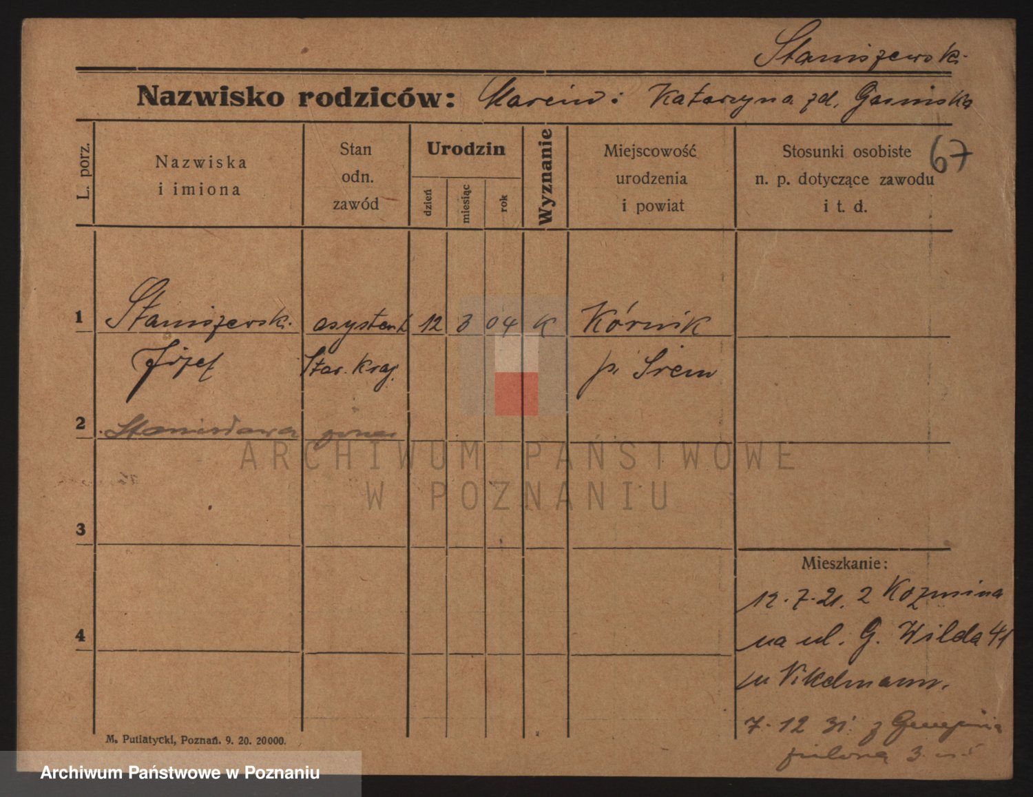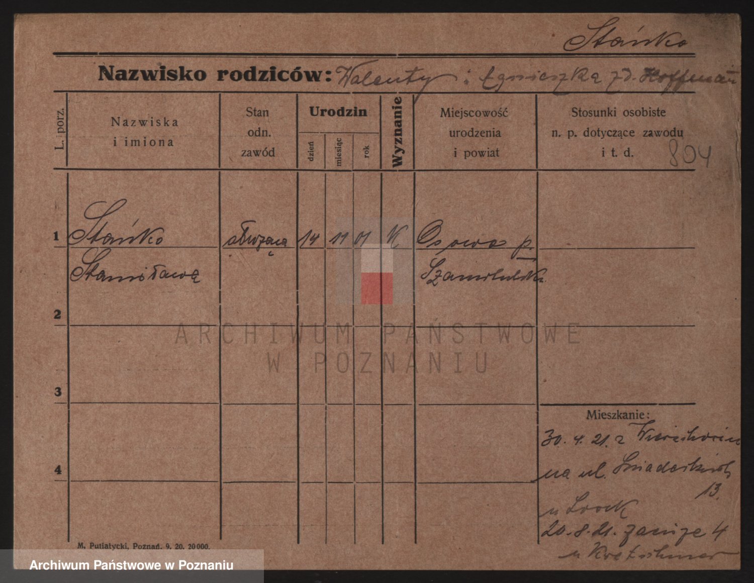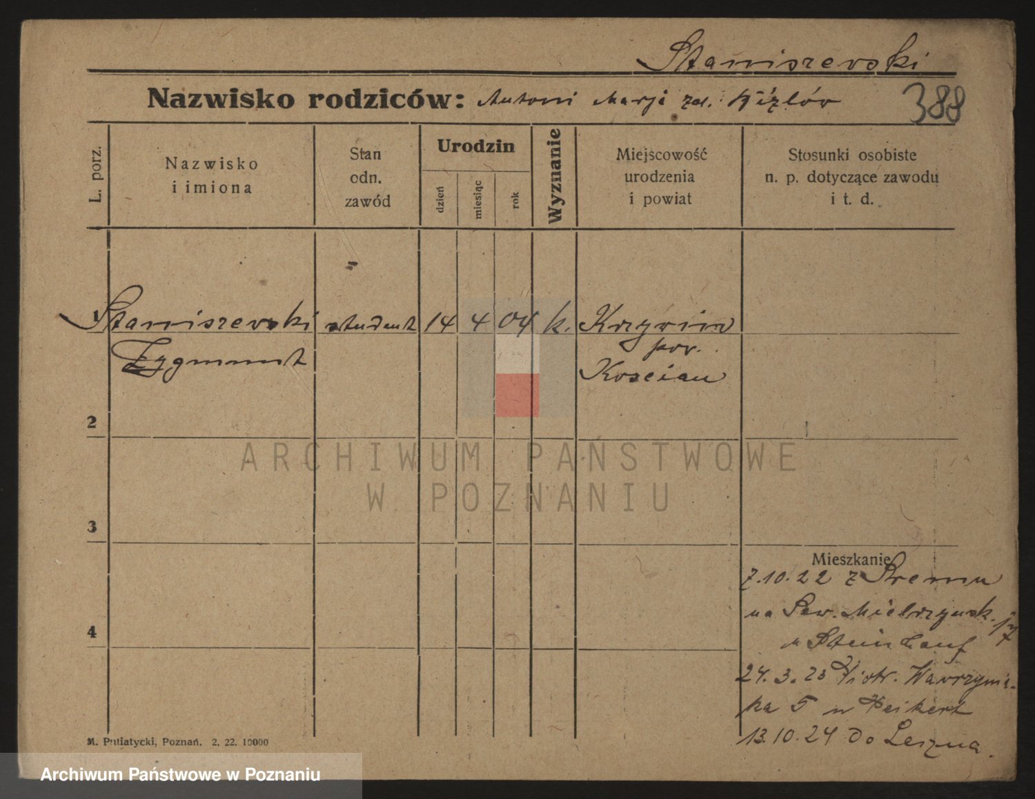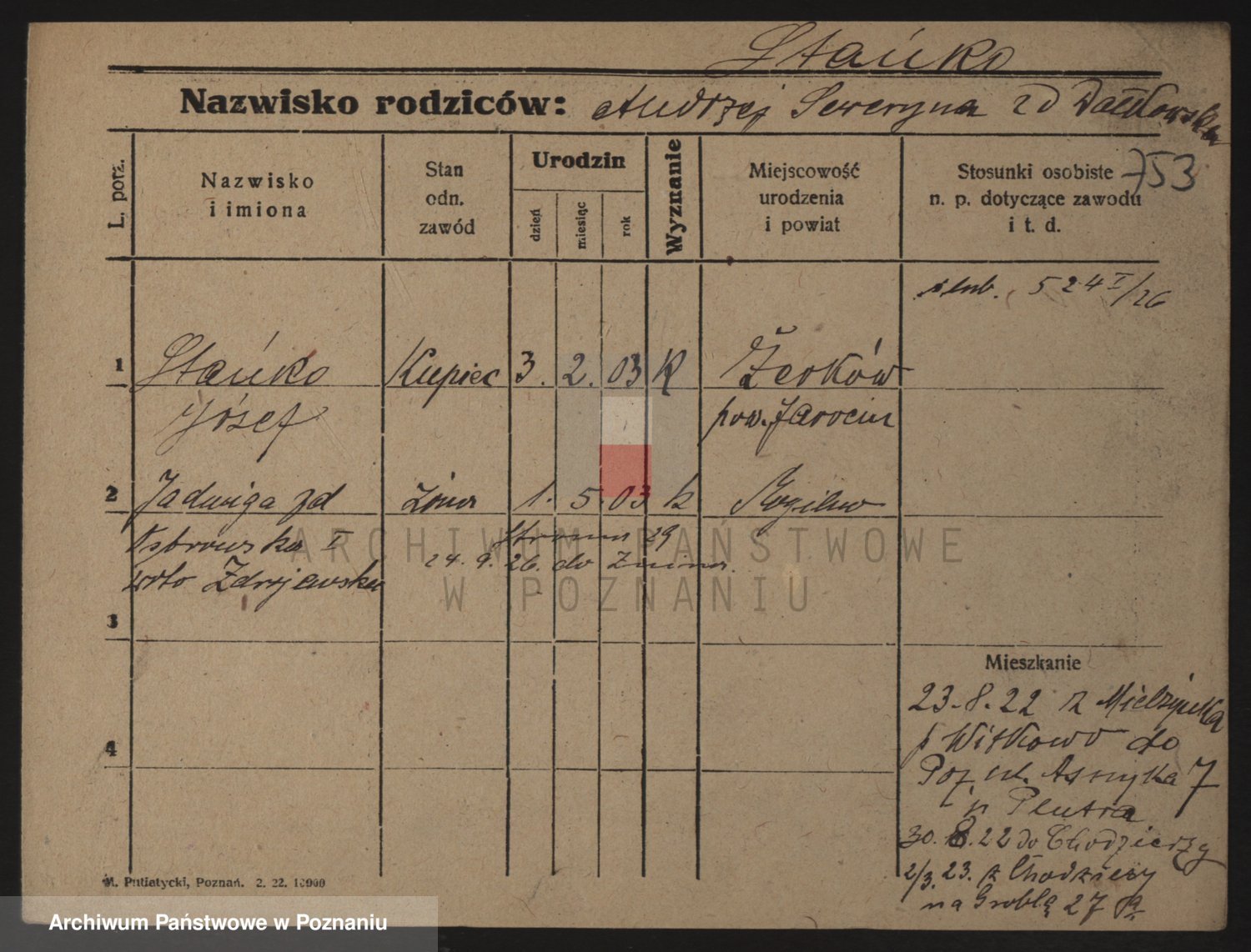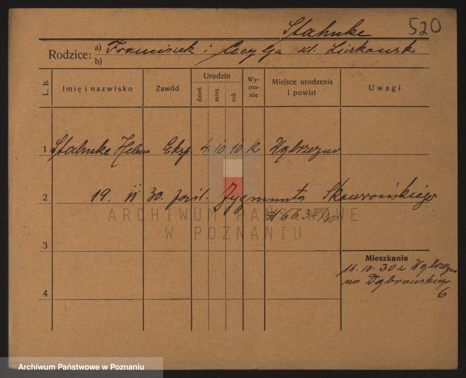 Podgląd karty osobowej dostępny jest po kliknięciu na nazwisko lub ikonkę karty. Można dokonywać powiększenia (ikony na górze) lub przechodzić między kolejnymi skanami (strzałki po bokach).
