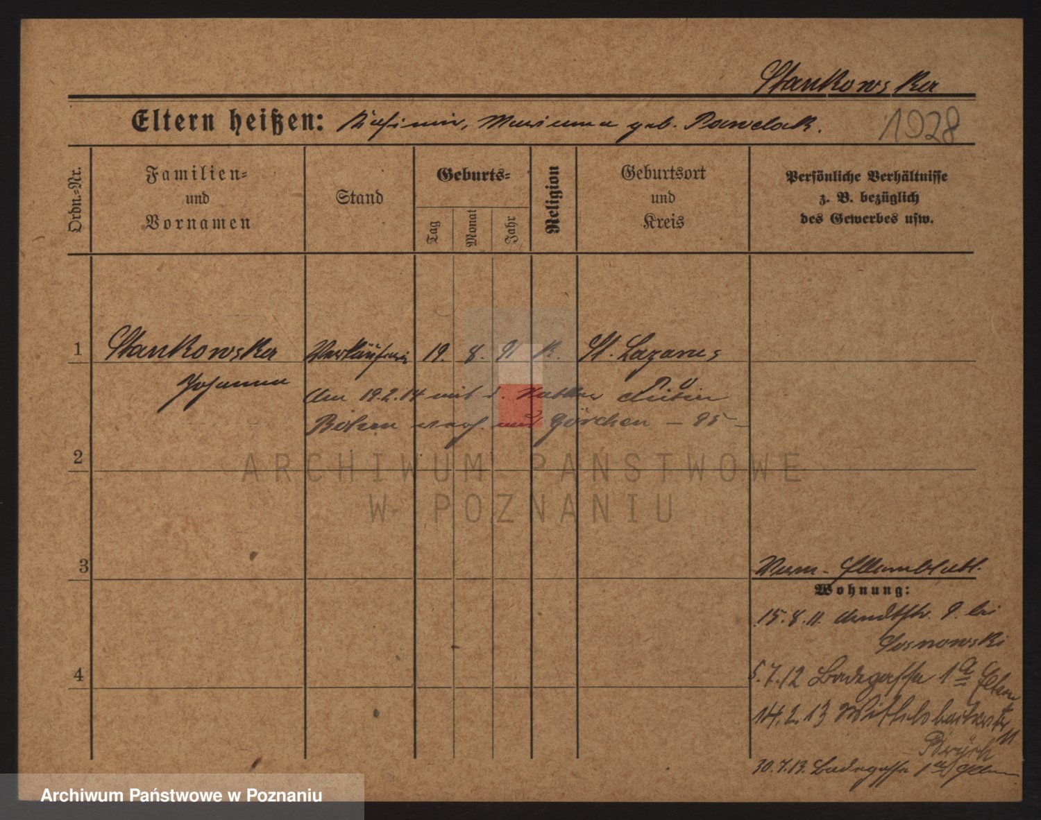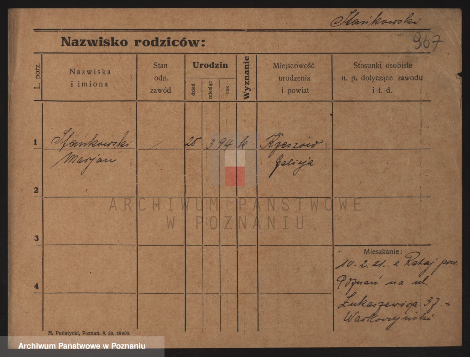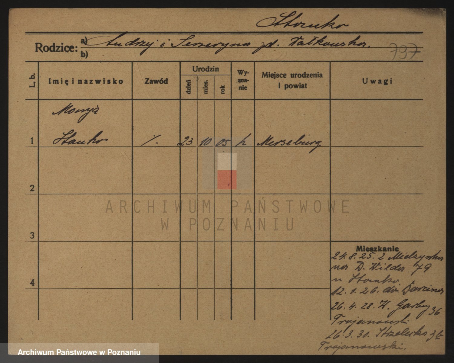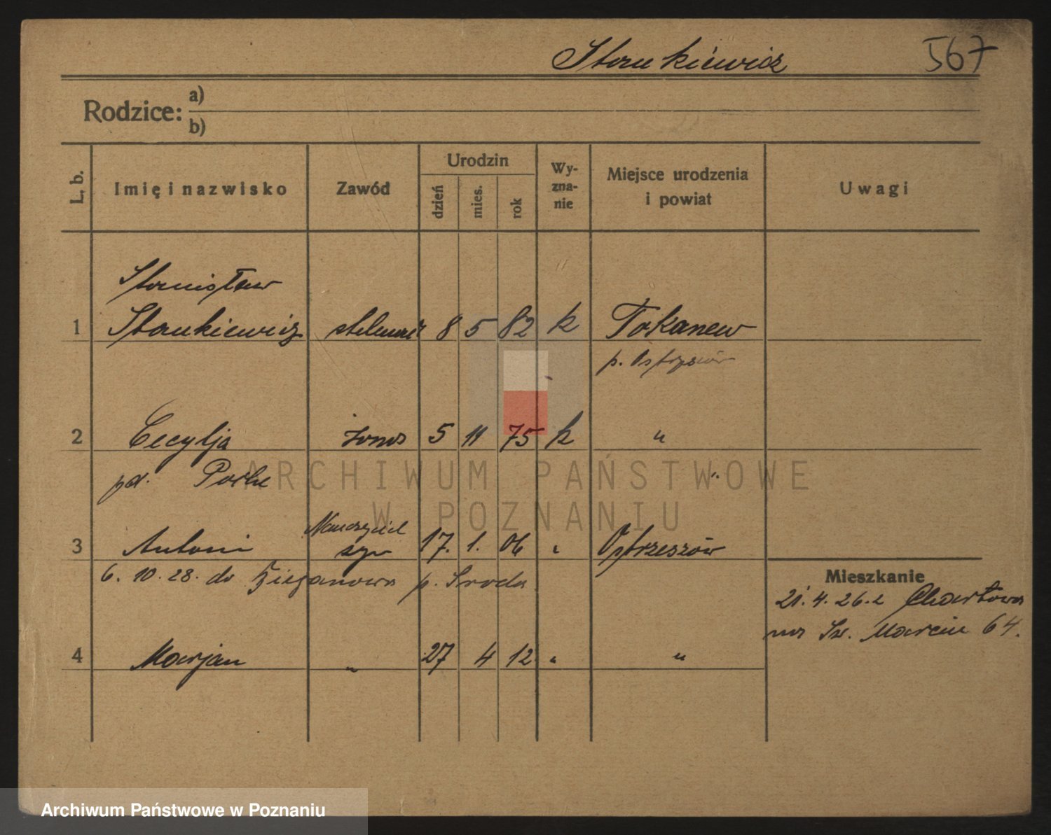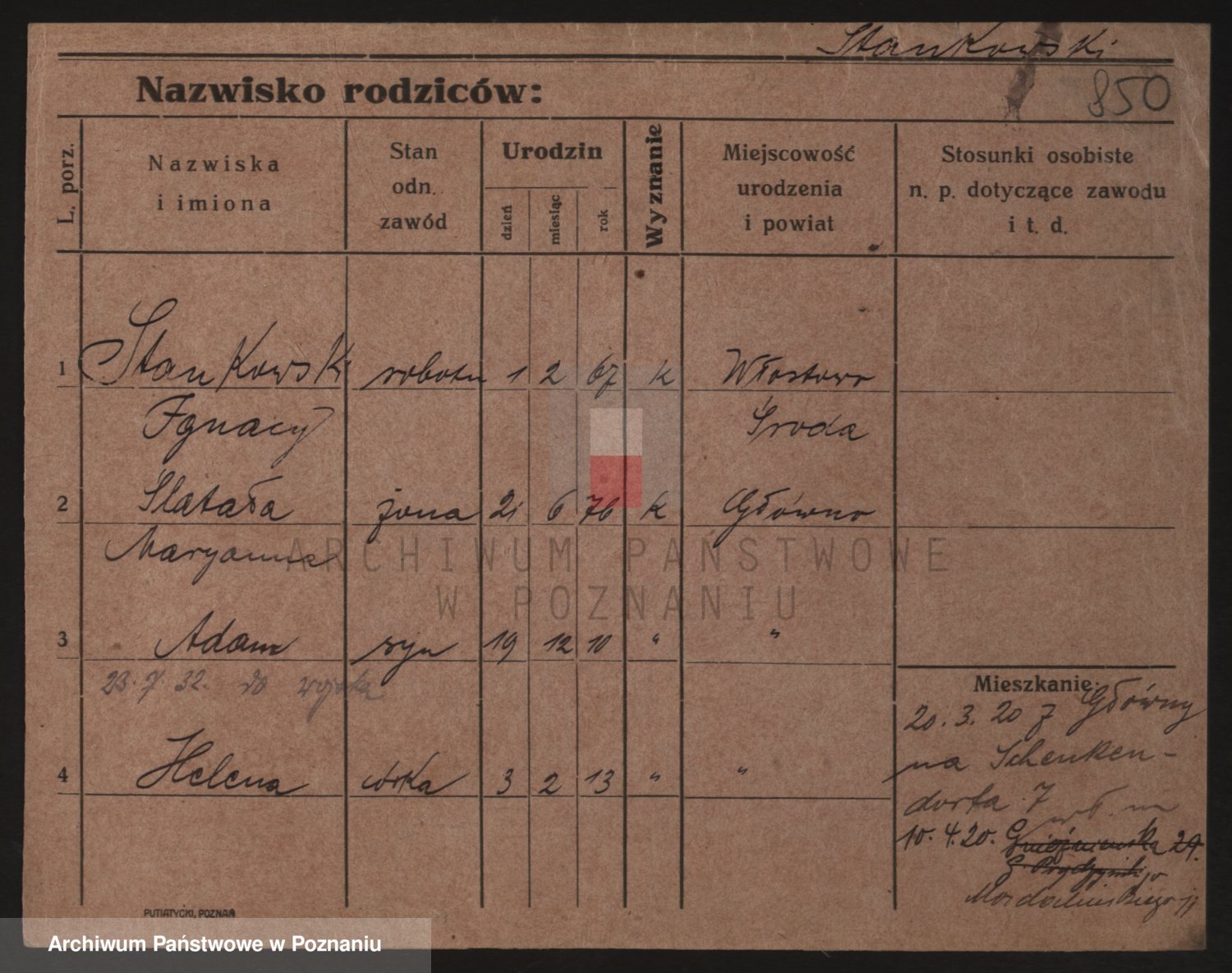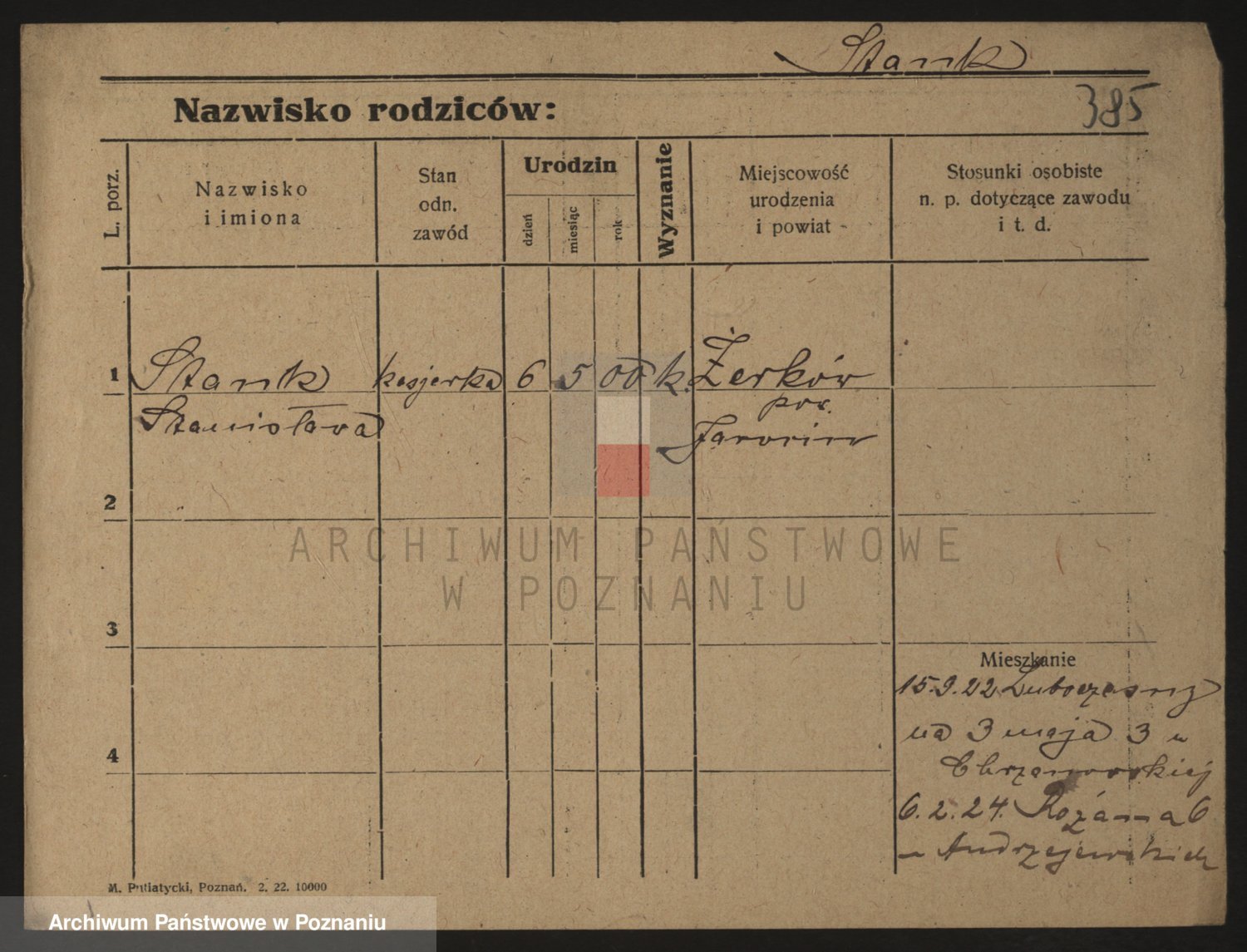Podgląd karty osobowej dostępny jest po kliknięciu na nazwisko lub ikonkę karty. Można dokonywać powiększenia (ikony na górze) lub przechodzić między kolejnymi skanami (strzałki po bokach).