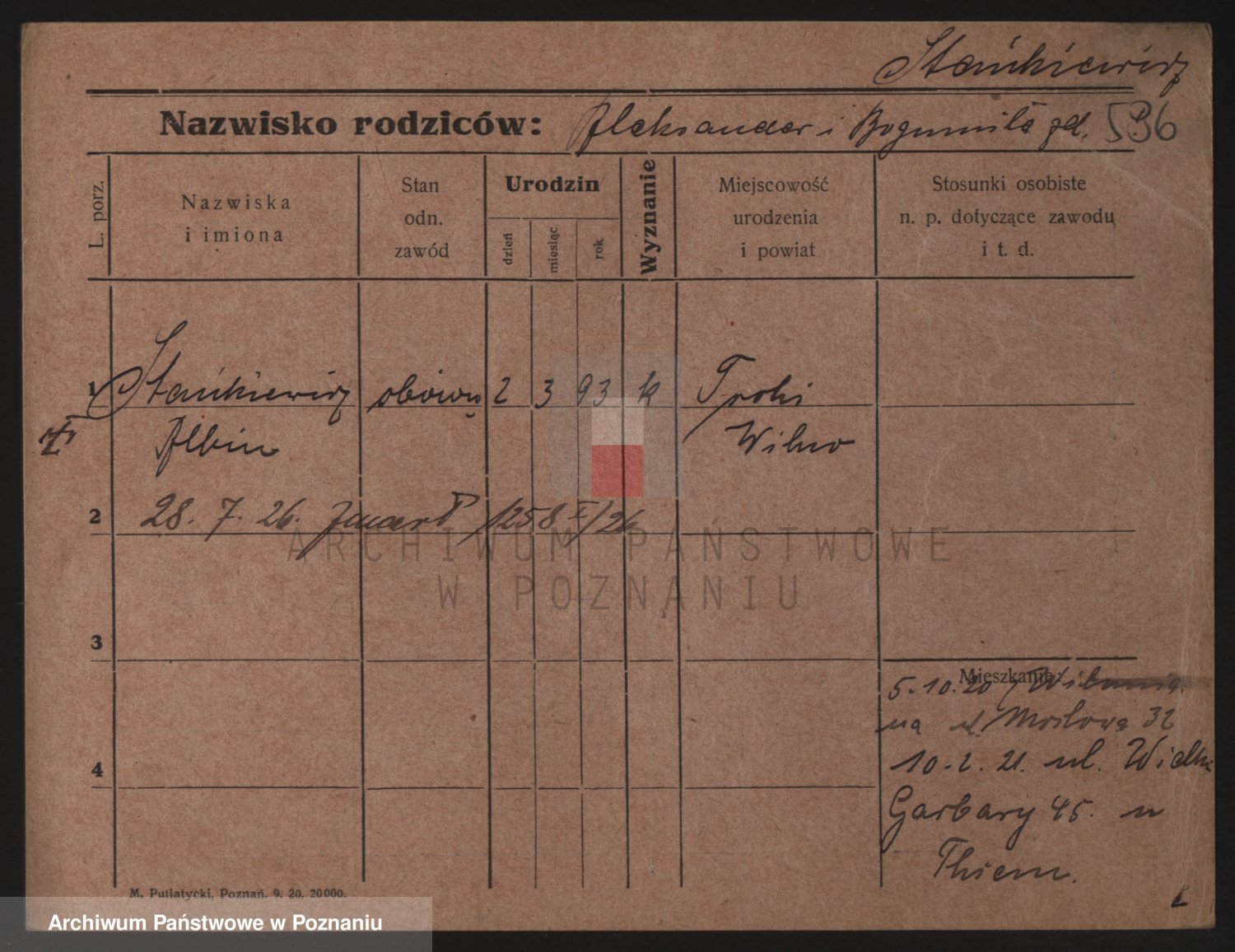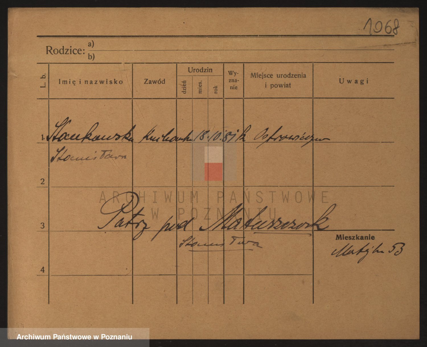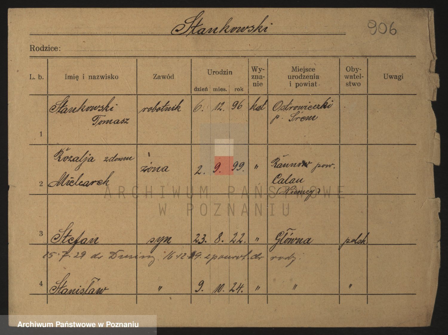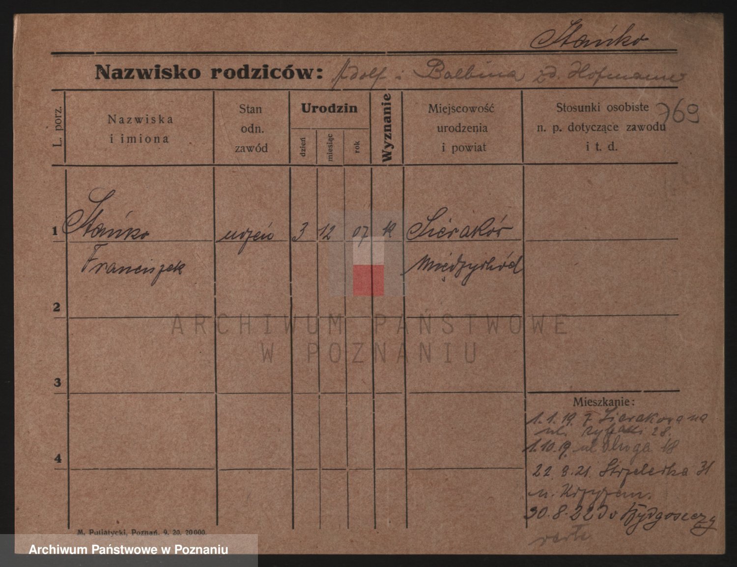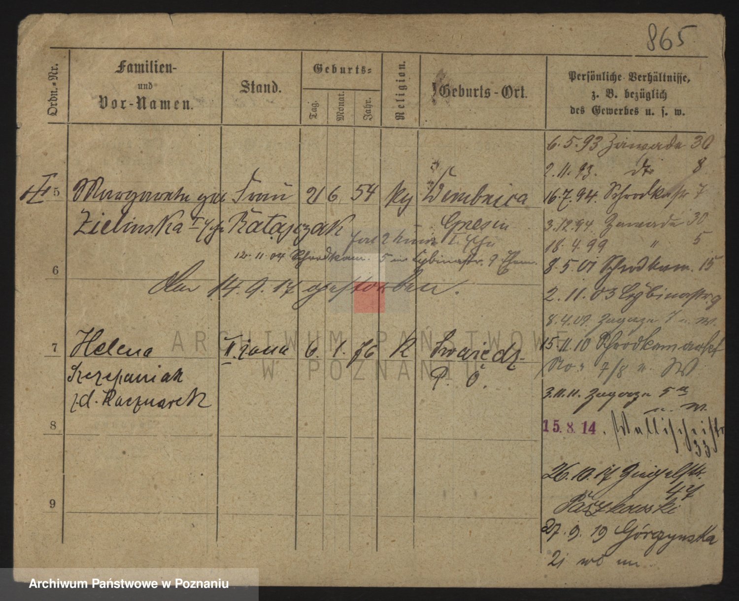 Podgląd karty osobowej dostępny jest po kliknięciu na nazwisko lub ikonkę karty. Można dokonywać powiększenia (ikony na górze) lub przechodzić między kolejnymi skanami (strzałki po bokach).