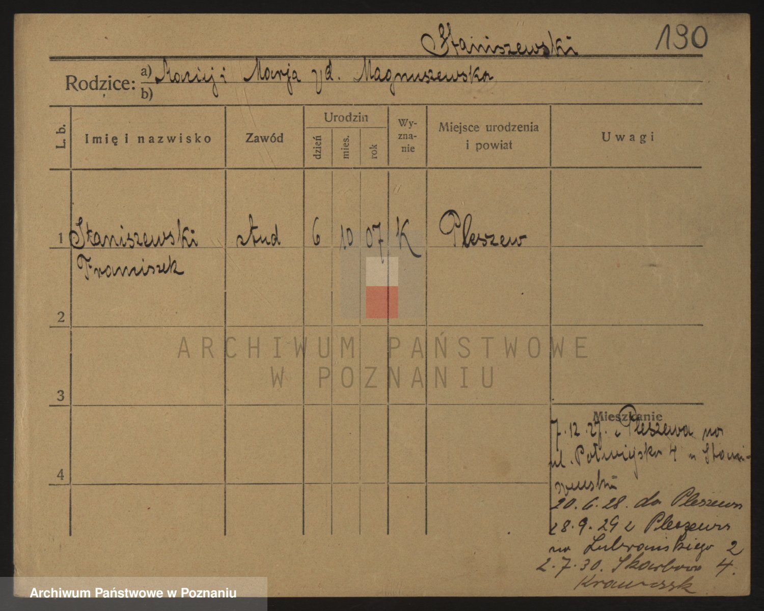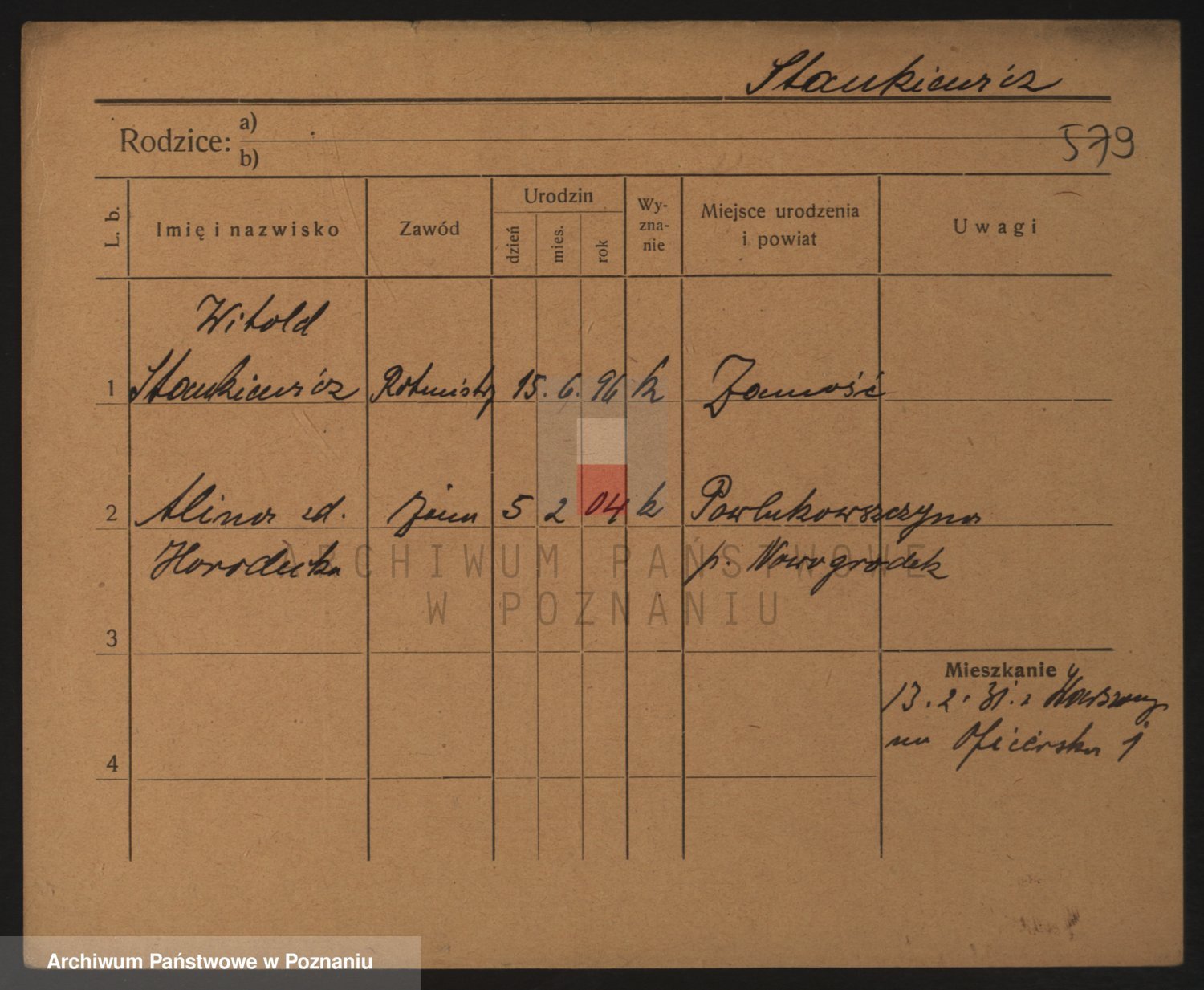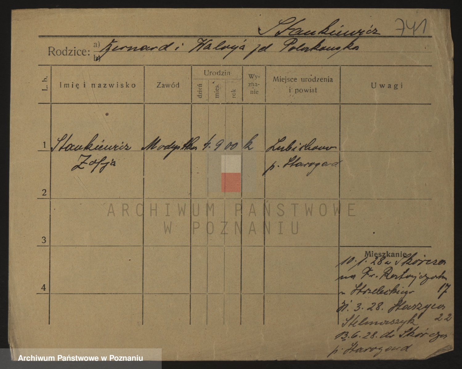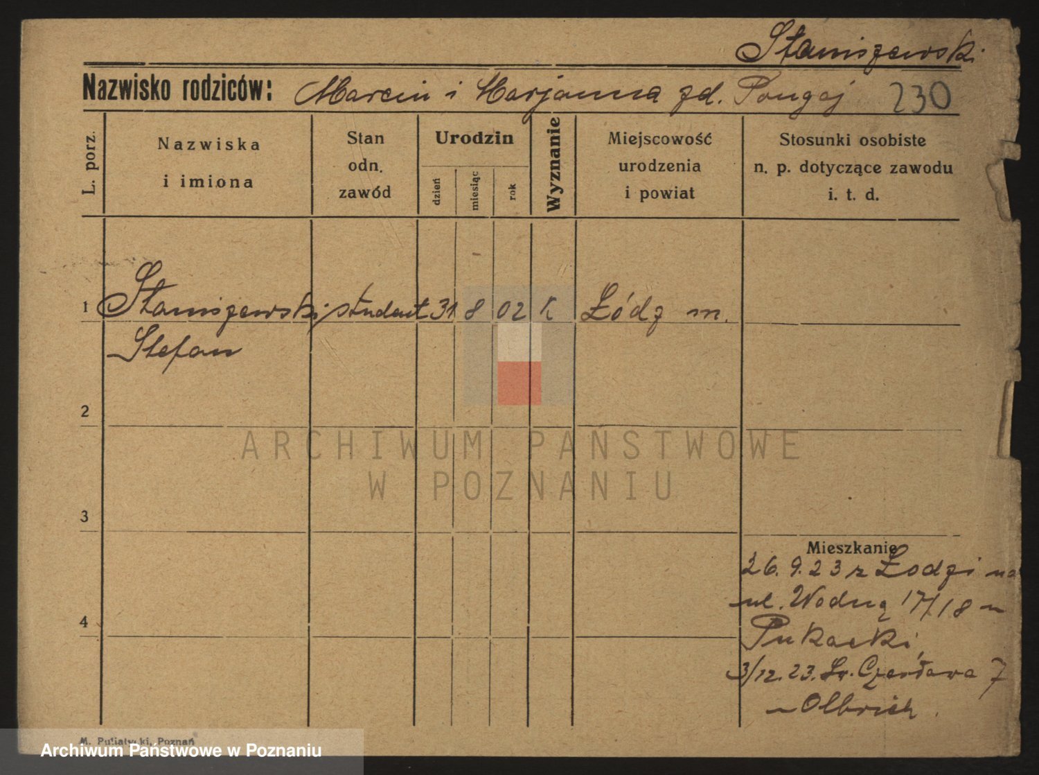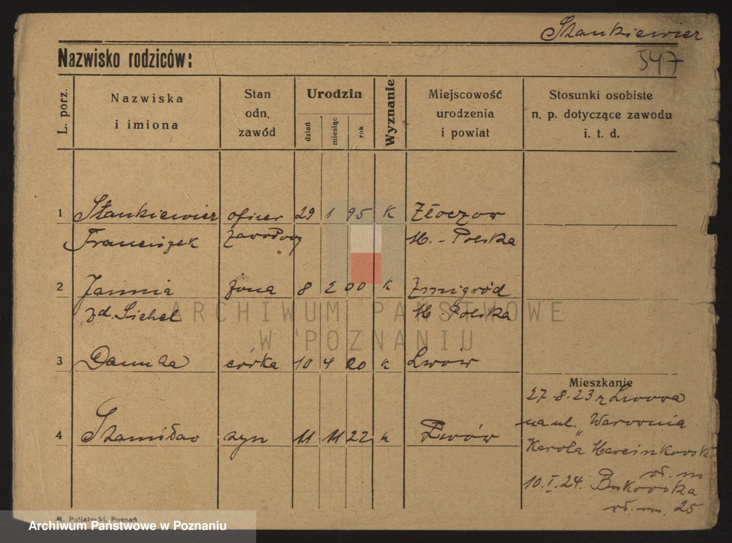 Podgląd karty osobowej dostępny jest po kliknięciu na nazwisko lub ikonkę karty. Można dokonywać powiększenia (ikony na górze) lub przechodzić między kolejnymi skanami (strzałki po bokach).