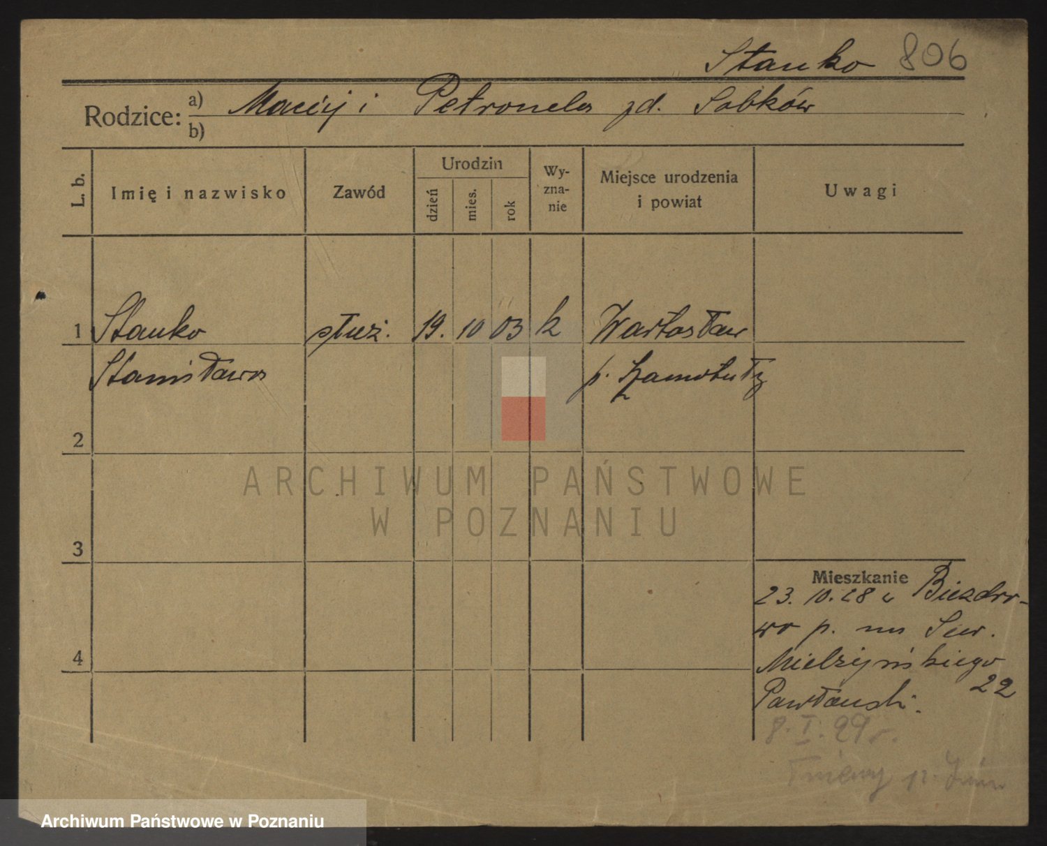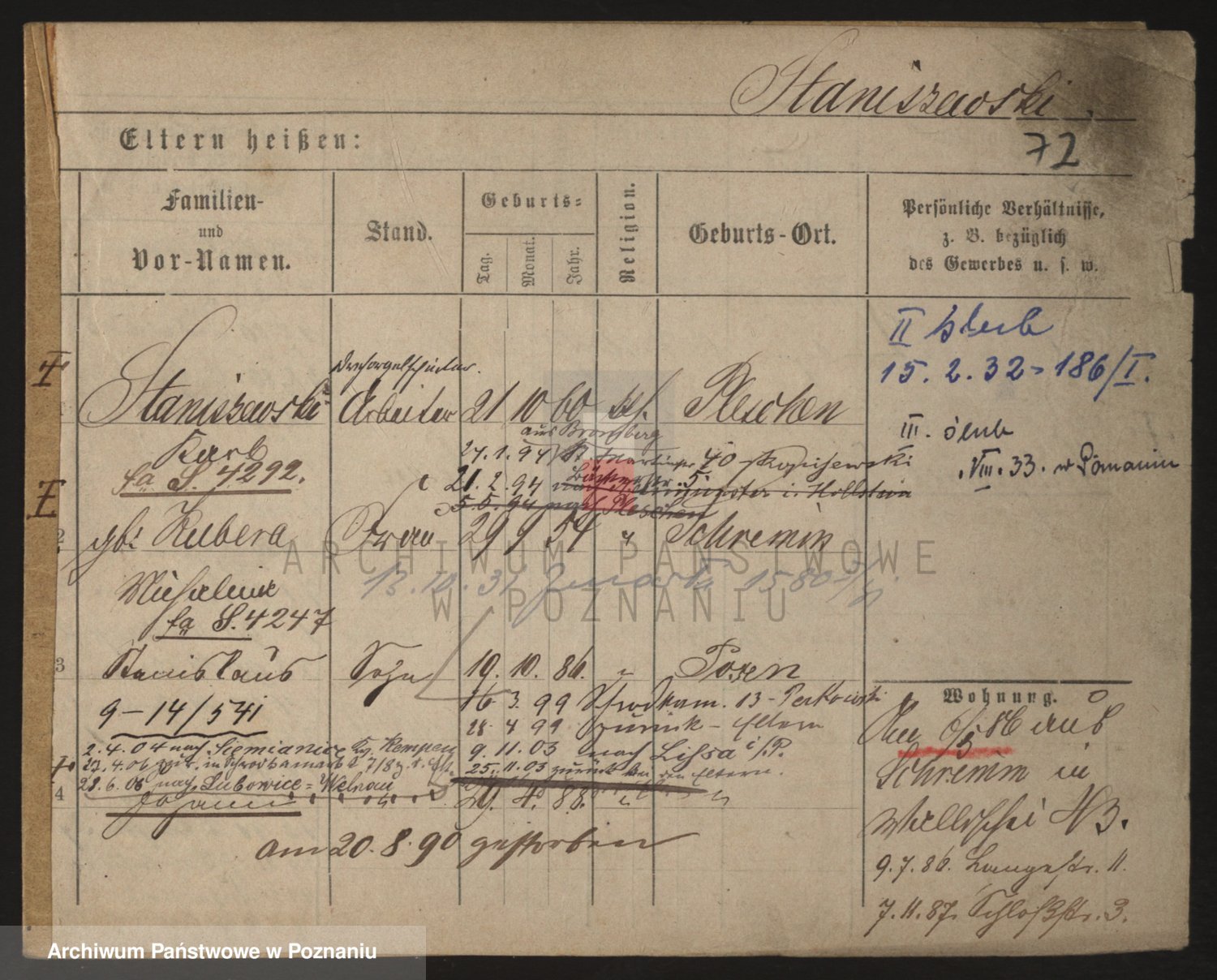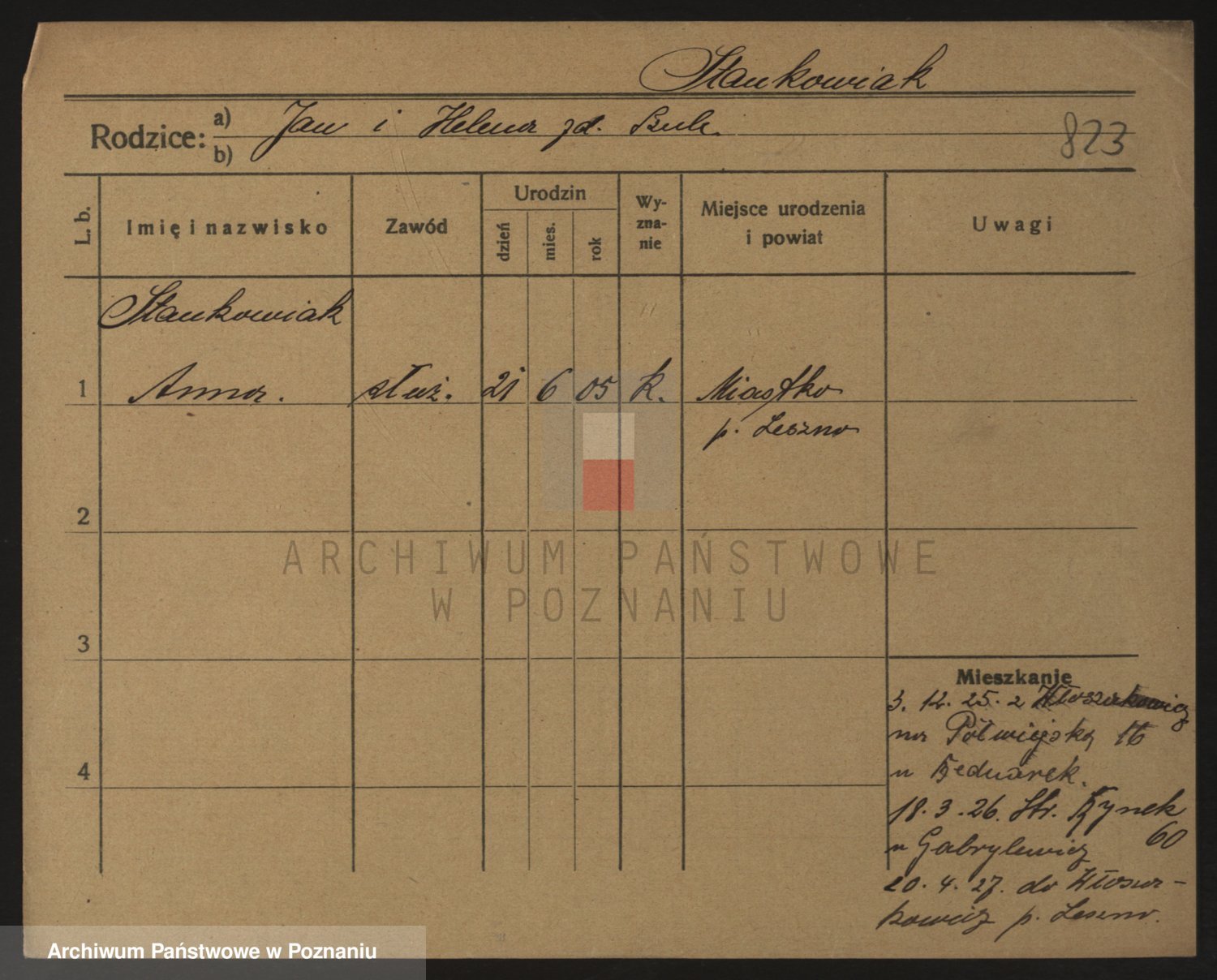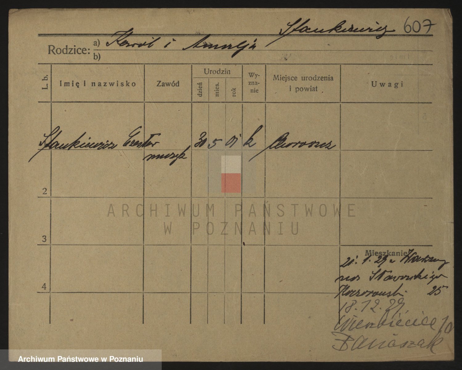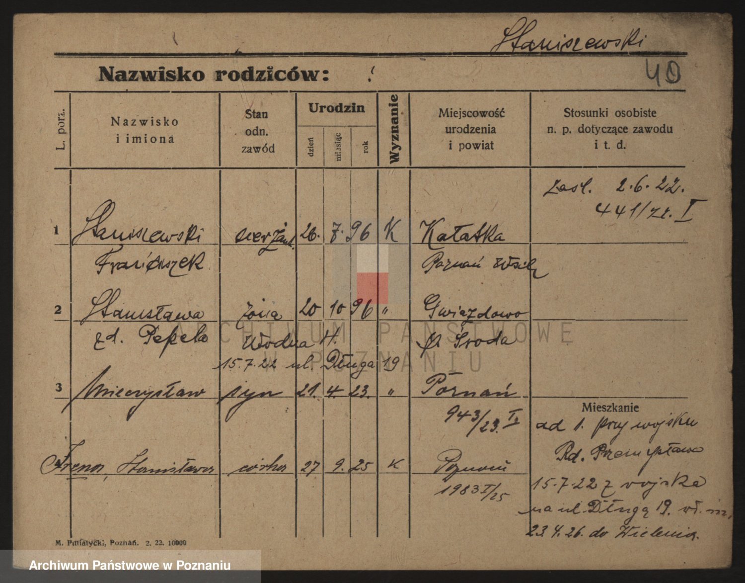 Podgląd karty osobowej dostępny jest po kliknięciu na nazwisko lub ikonkę karty. Można dokonywać powiększenia (ikony na górze) lub przechodzić między kolejnymi skanami (strzałki po bokach).