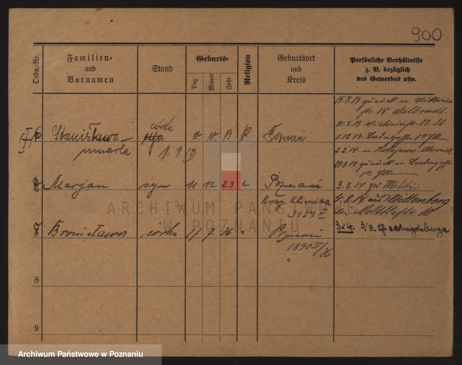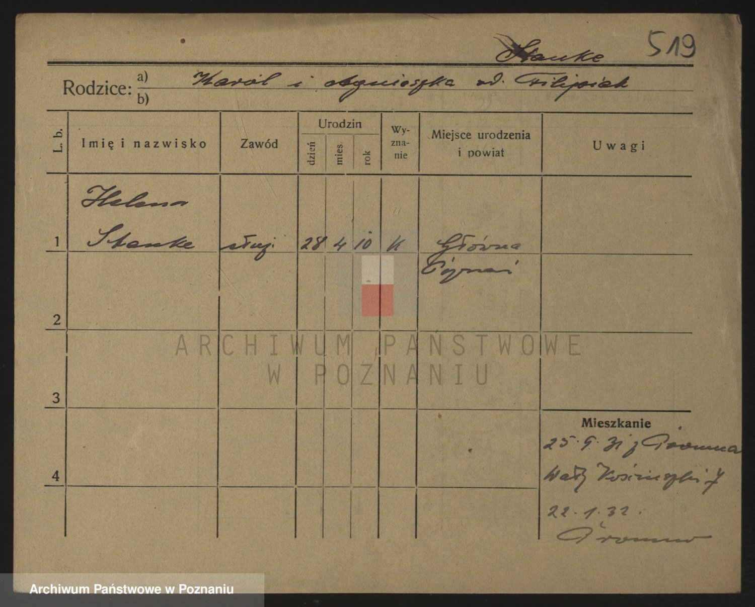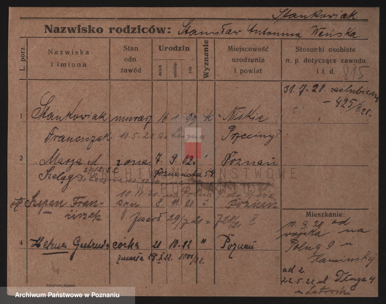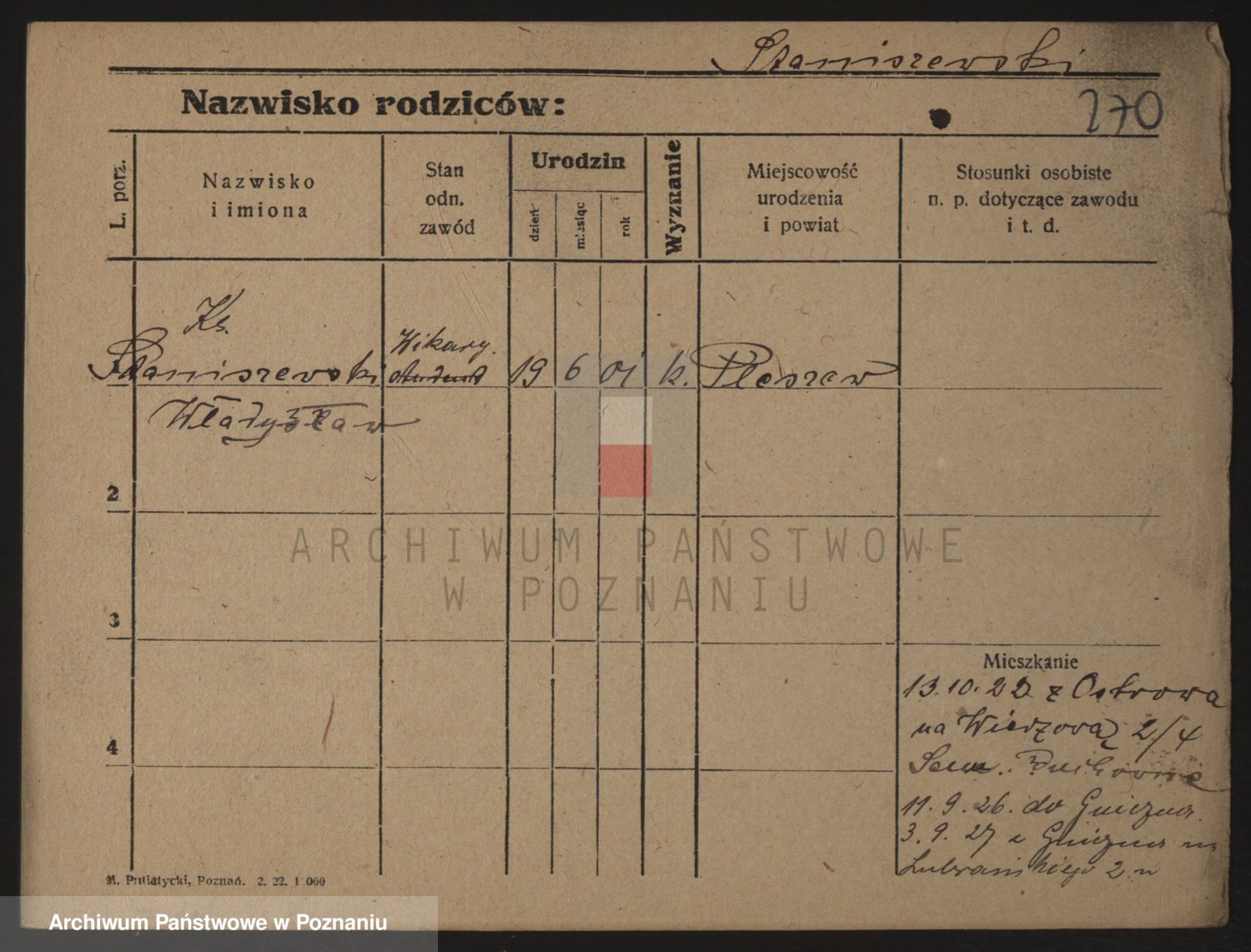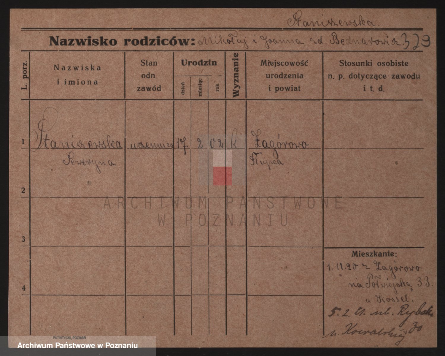 Podgląd karty osobowej dostępny jest po kliknięciu na nazwisko lub ikonkę karty. Można dokonywać powiększenia (ikony na górze) lub przechodzić między kolejnymi skanami (strzałki po bokach).