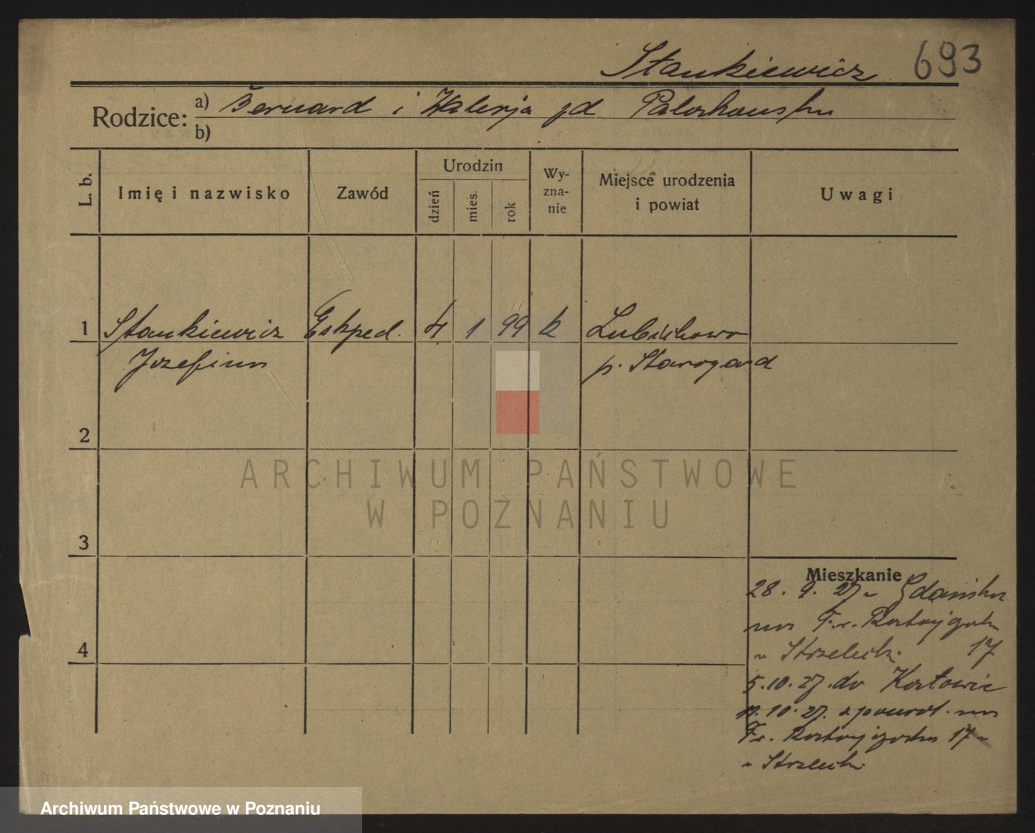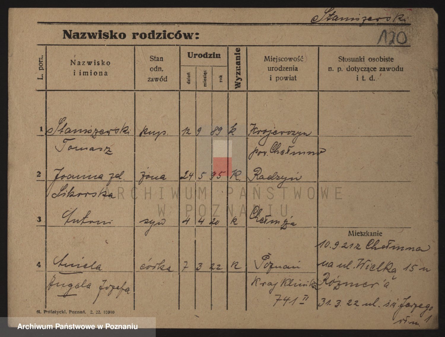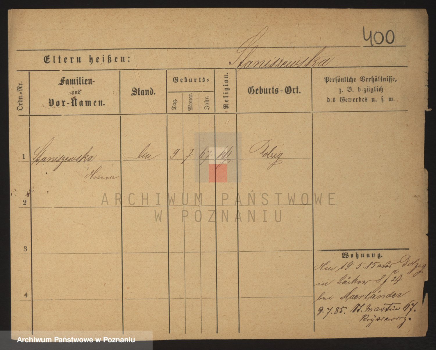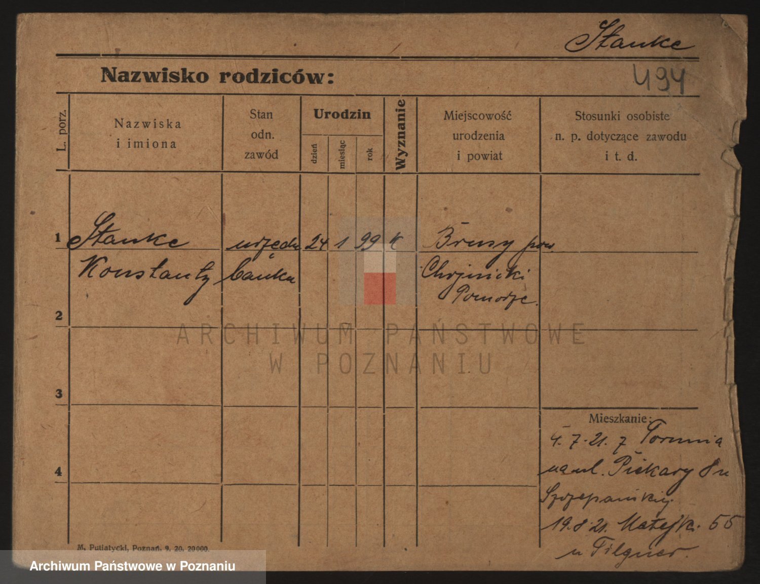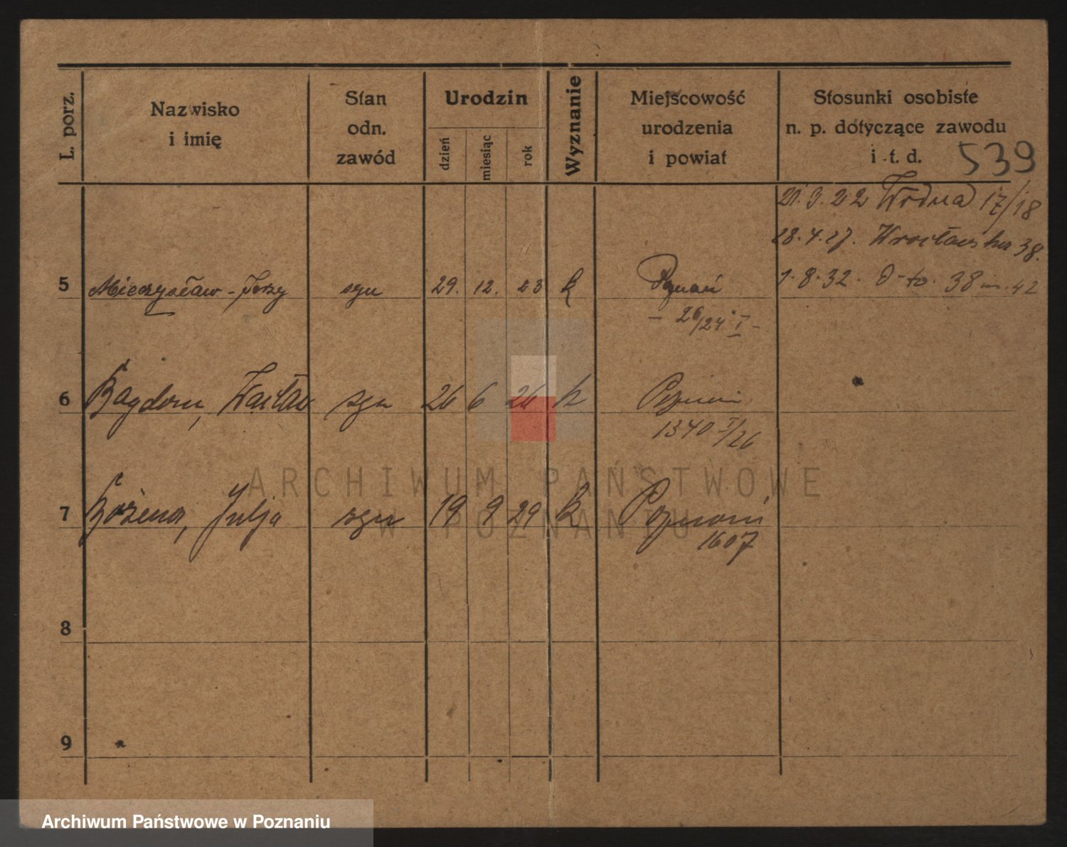 Podgląd karty osobowej dostępny jest po kliknięciu na nazwisko lub ikonkę karty. Można dokonywać powiększenia (ikony na górze) lub przechodzić między kolejnymi skanami (strzałki po bokach).