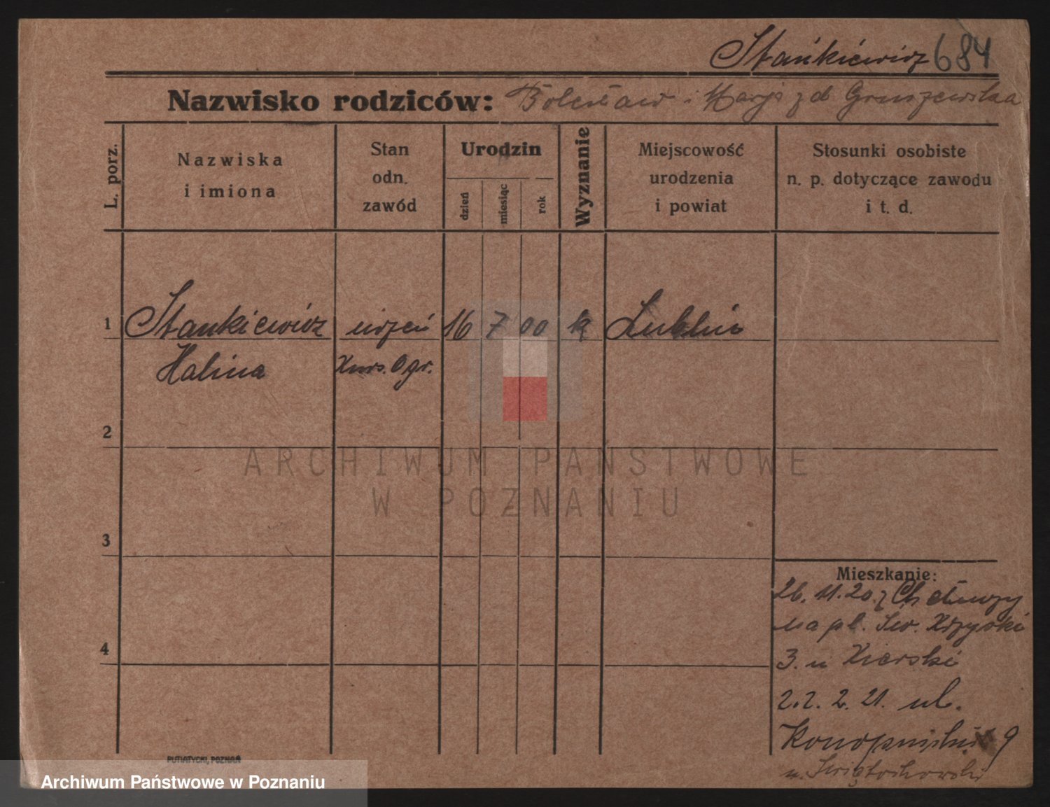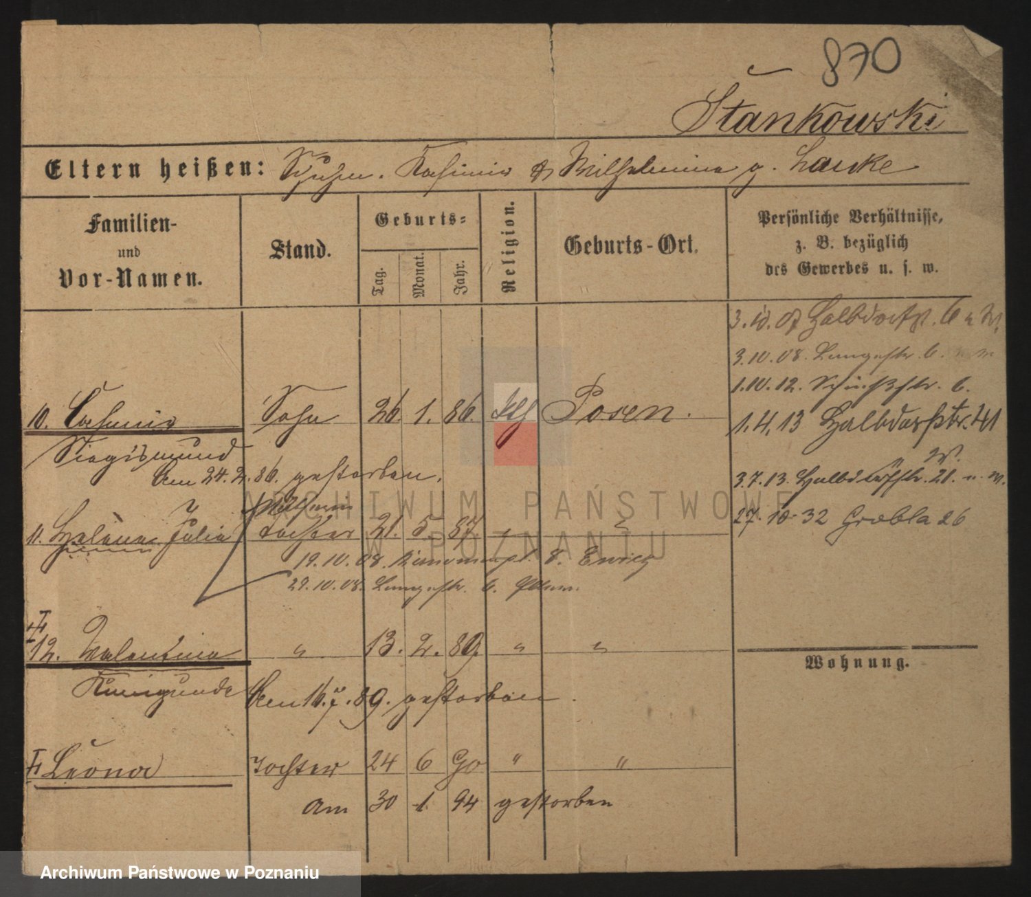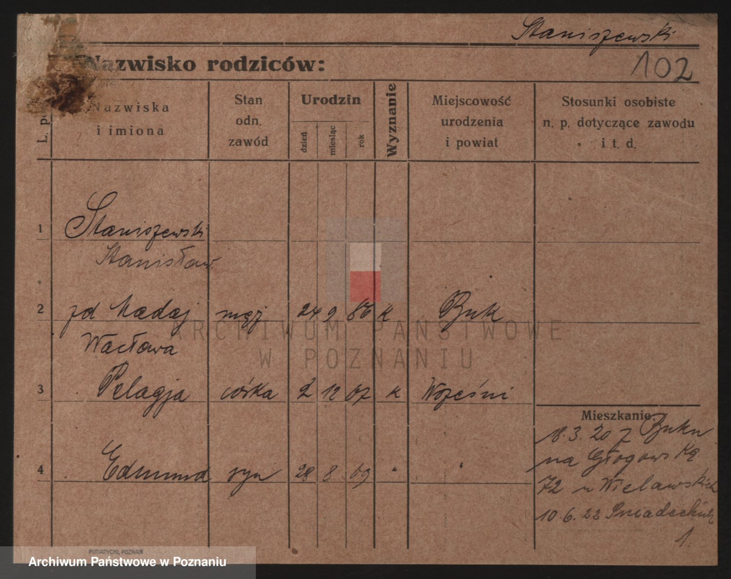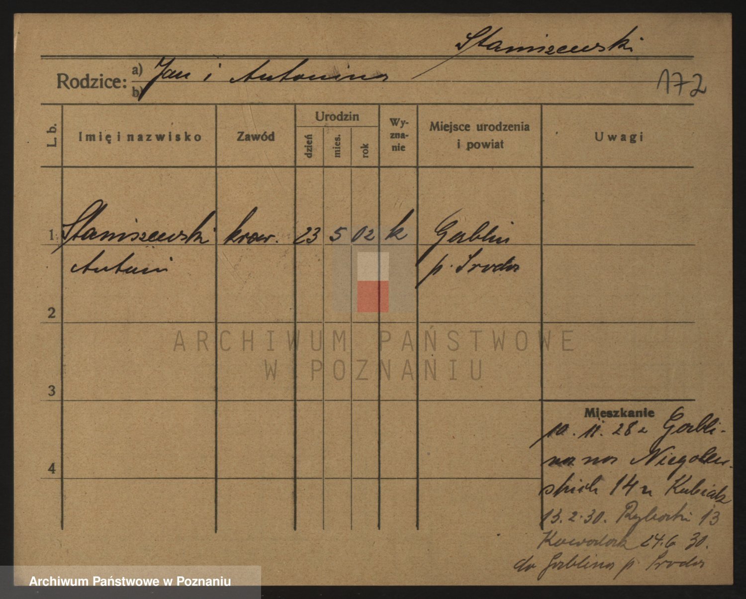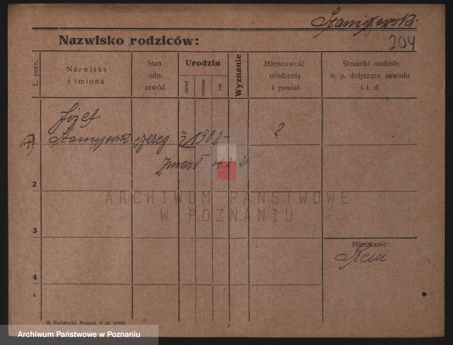 Podgląd karty osobowej dostępny jest po kliknięciu na nazwisko lub ikonkę karty. Można dokonywać powiększenia (ikony na górze) lub przechodzić między kolejnymi skanami (strzałki po bokach).