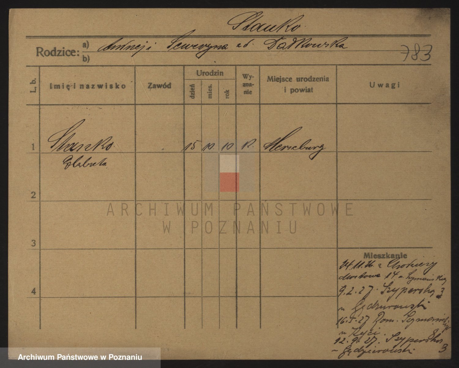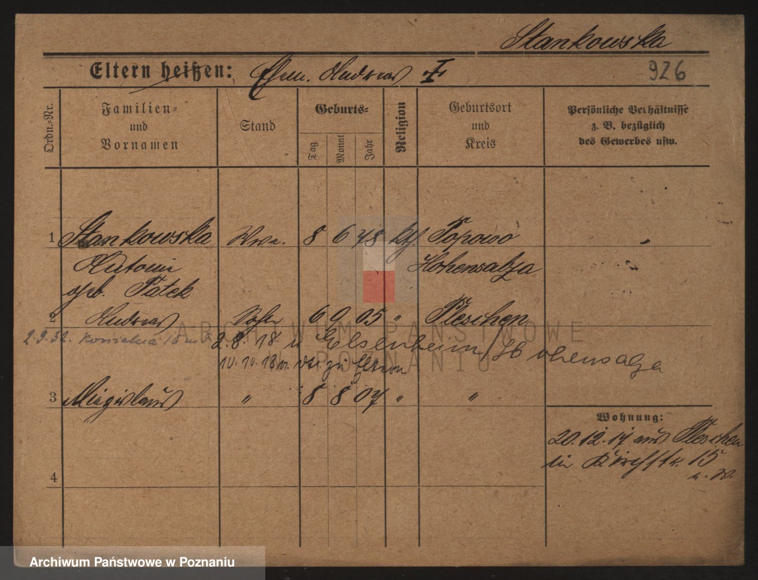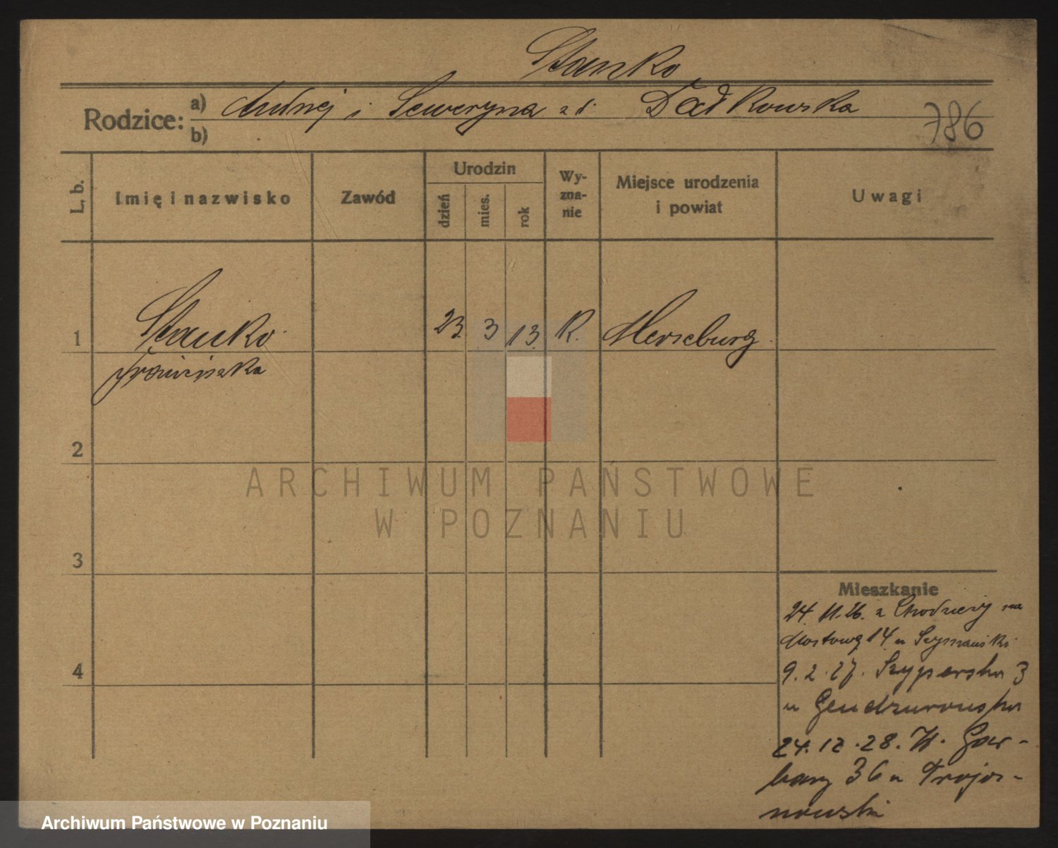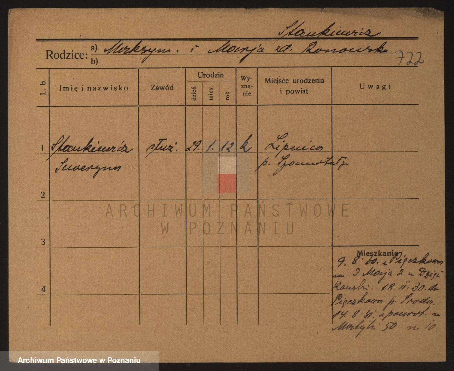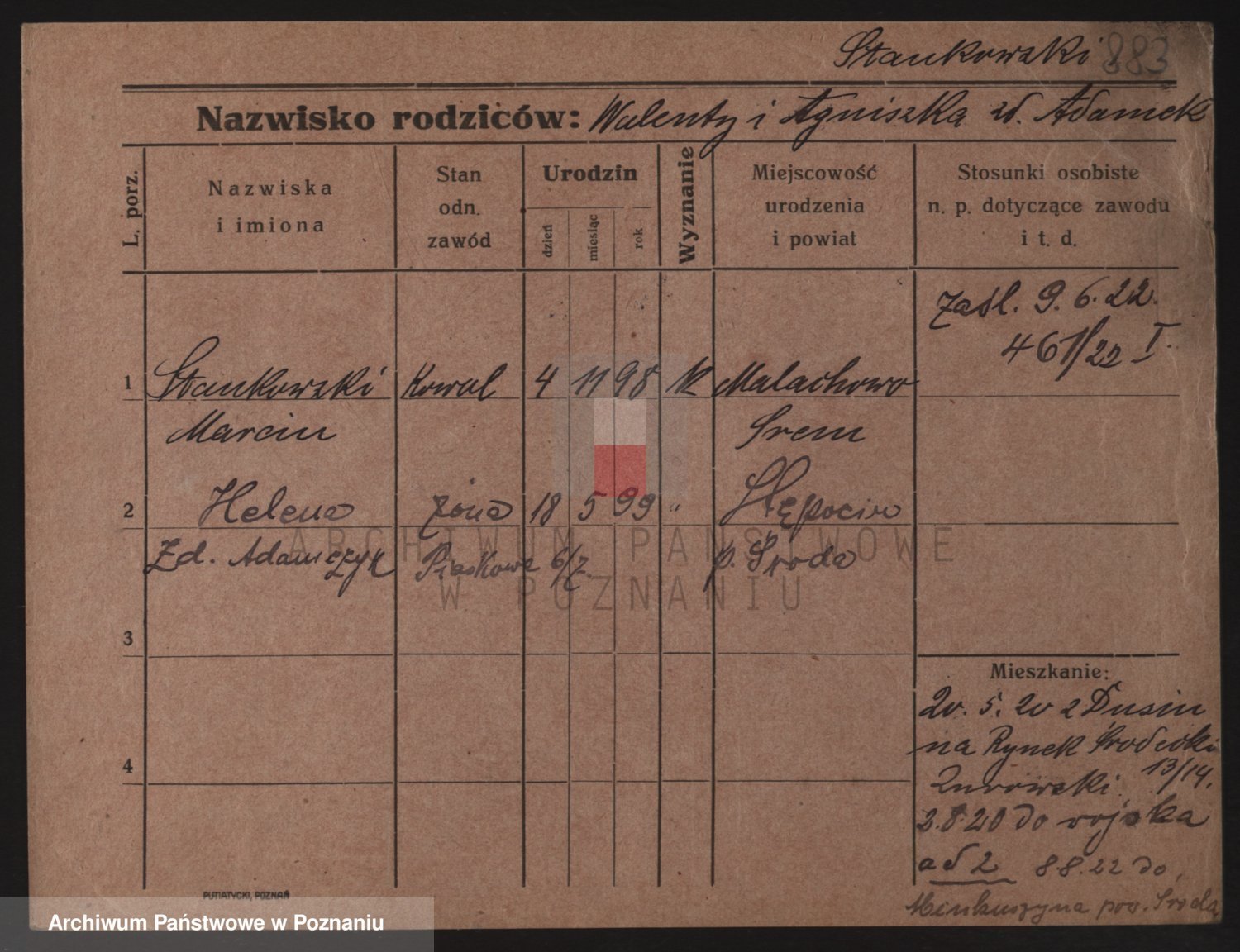 Podgląd karty osobowej dostępny jest po kliknięciu na nazwisko lub ikonkę karty. Można dokonywać powiększenia (ikony na górze) lub przechodzić między kolejnymi skanami (strzałki po bokach).