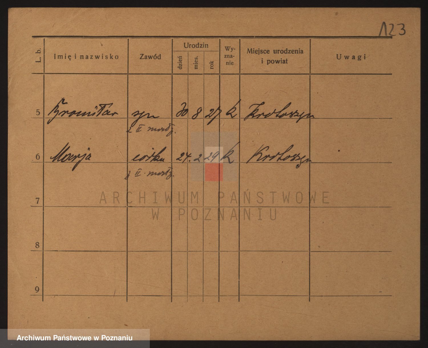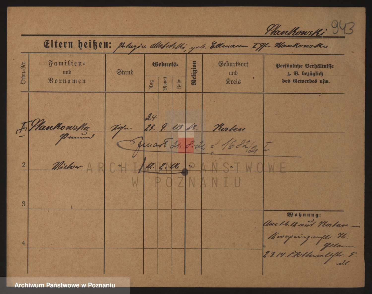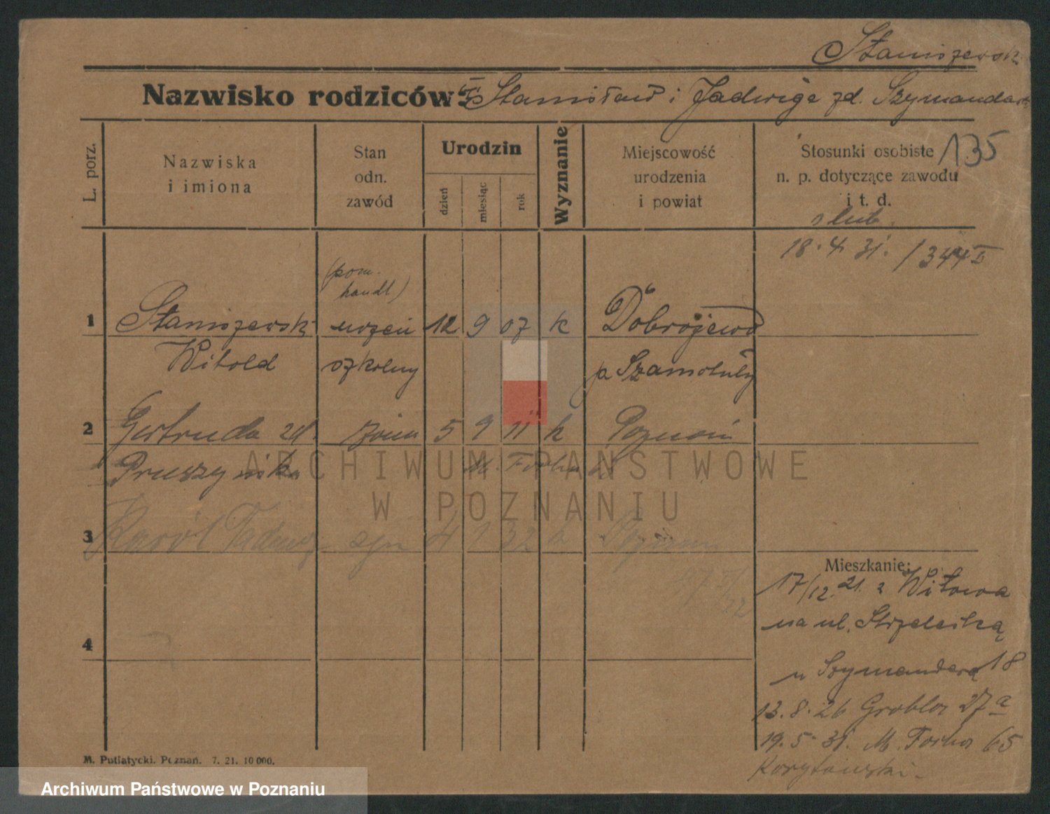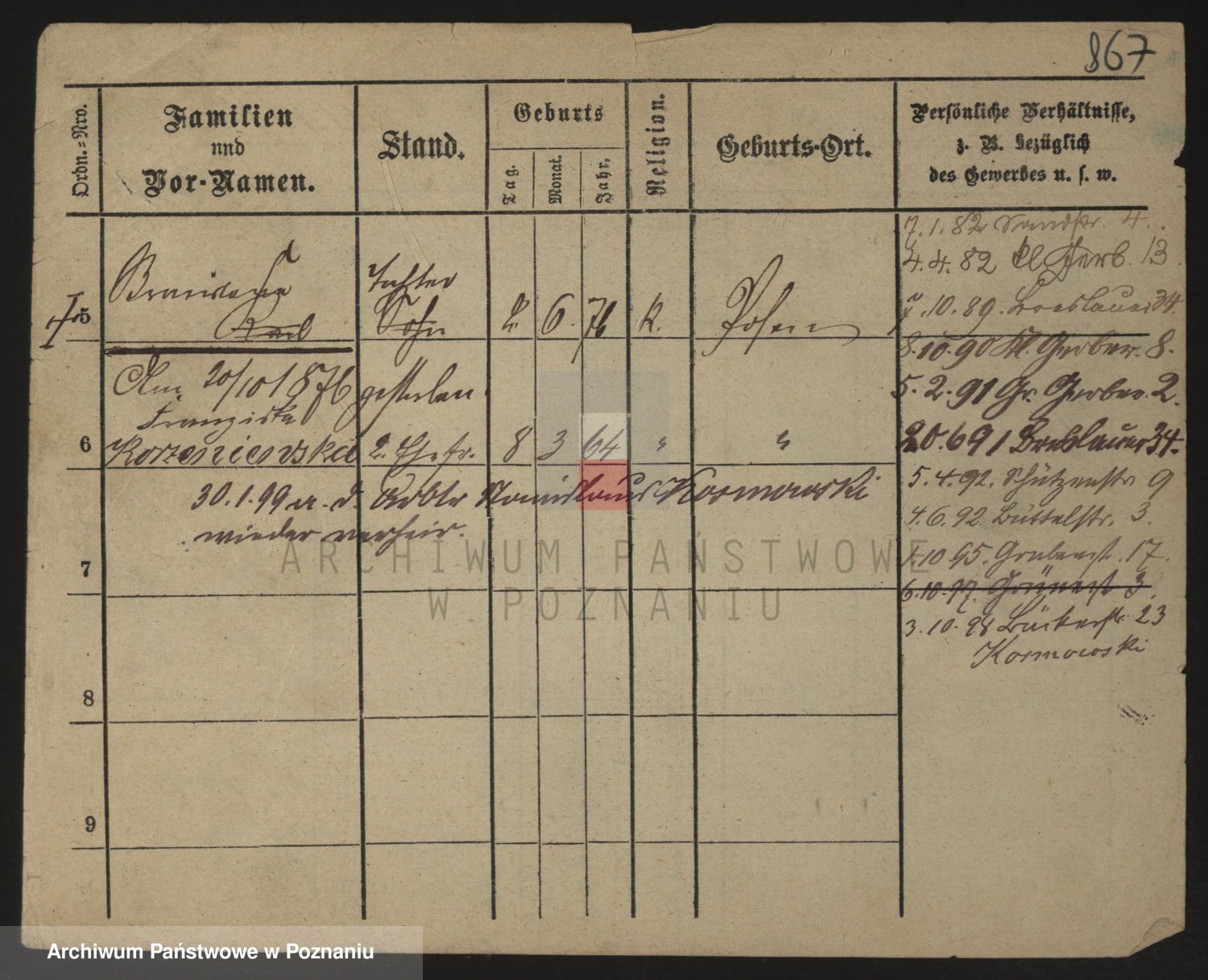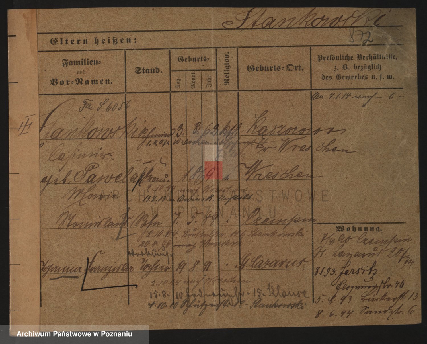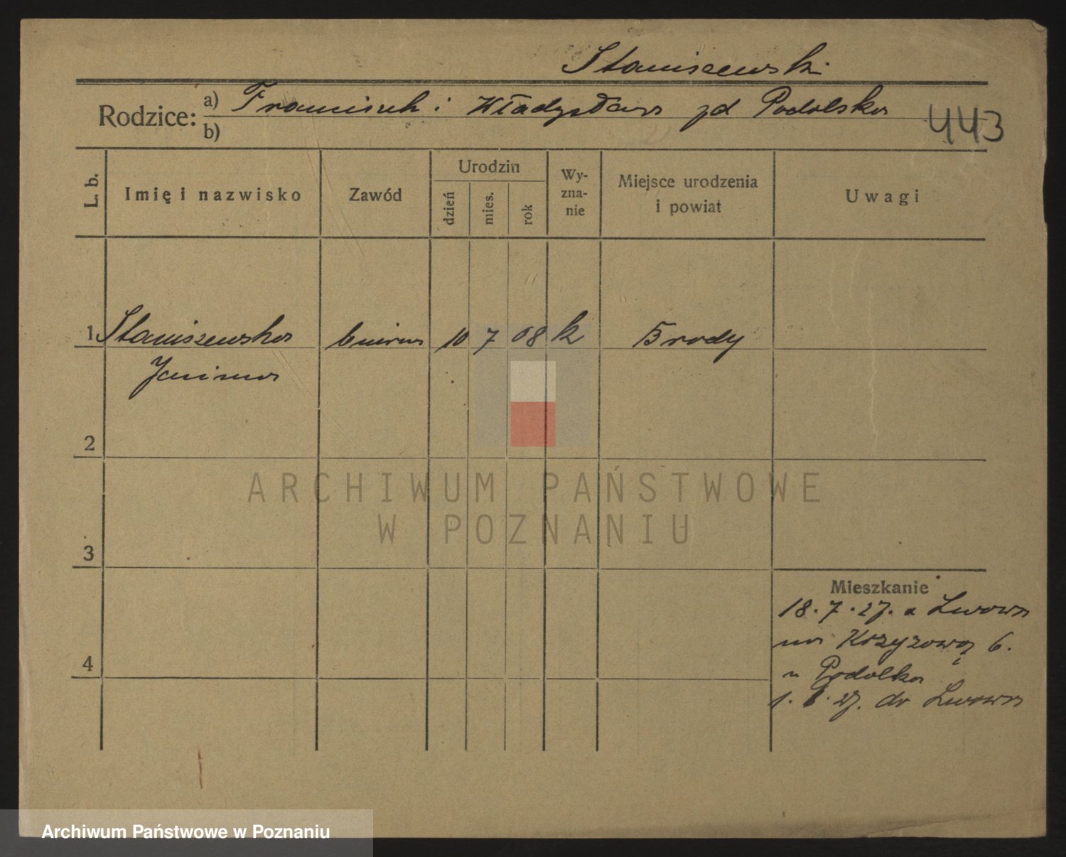 Podgląd karty osobowej dostępny jest po kliknięciu na nazwisko lub ikonkę karty. Można dokonywać powiększenia (ikony na górze) lub przechodzić między kolejnymi skanami (strzałki po bokach).