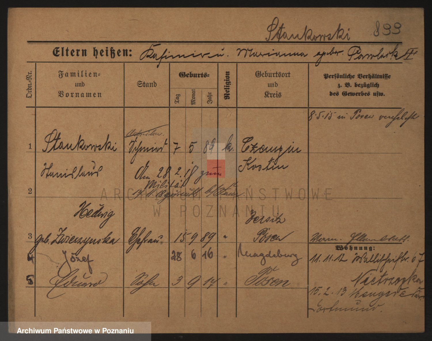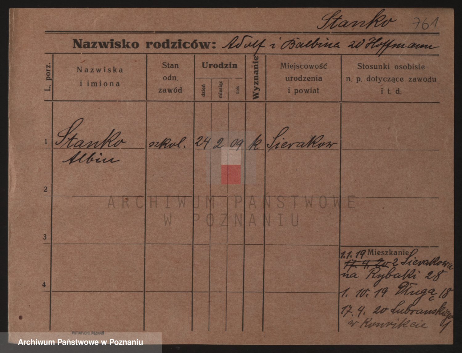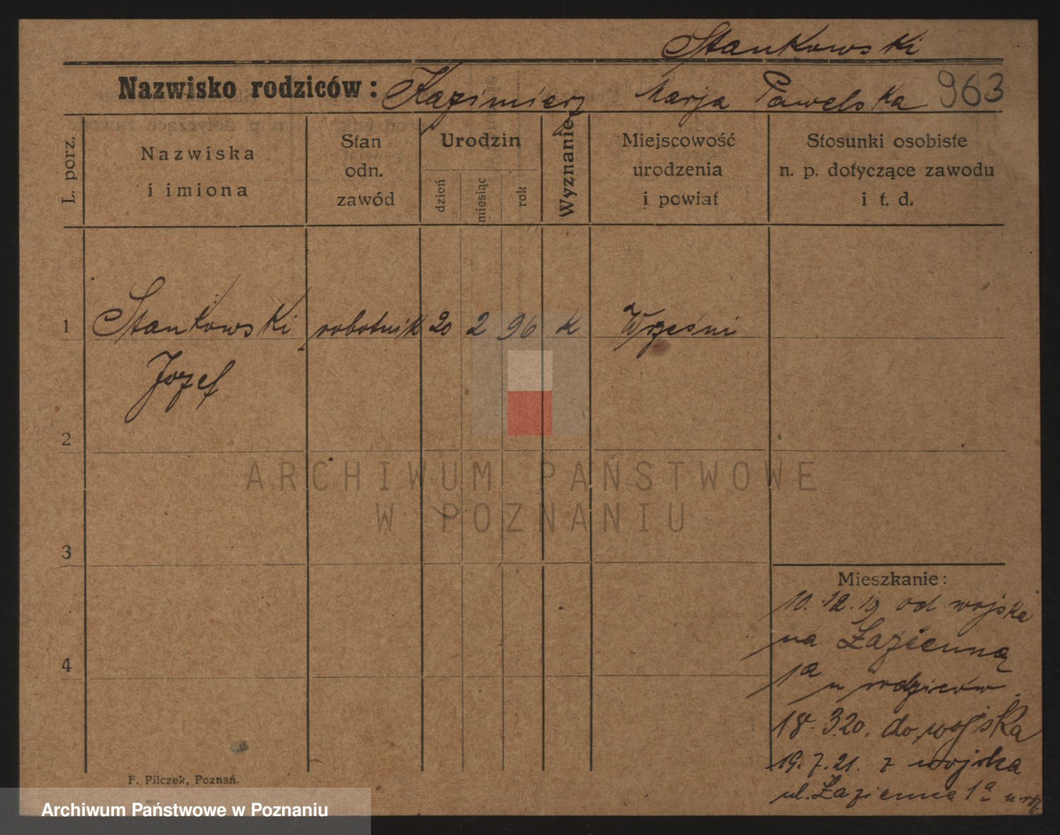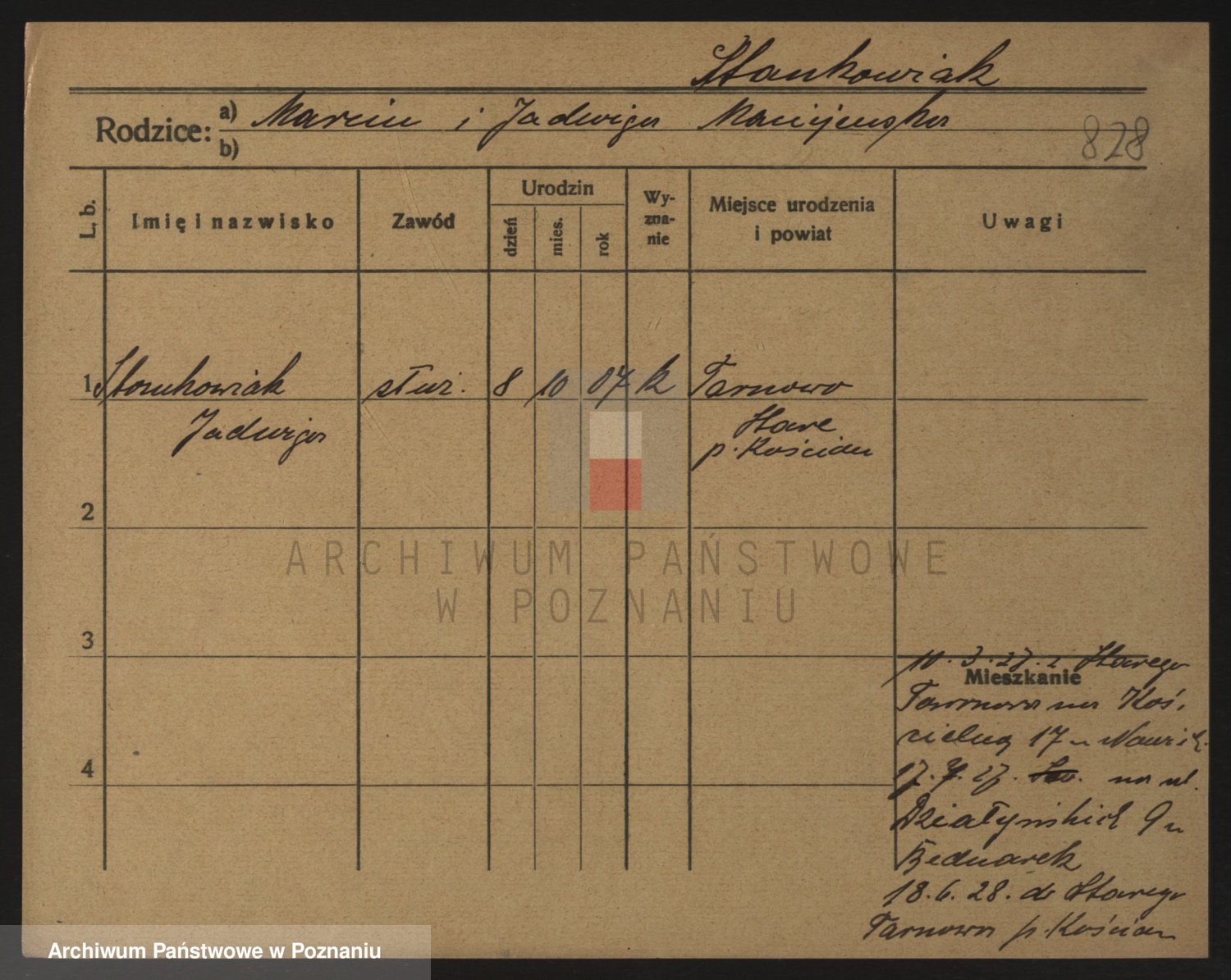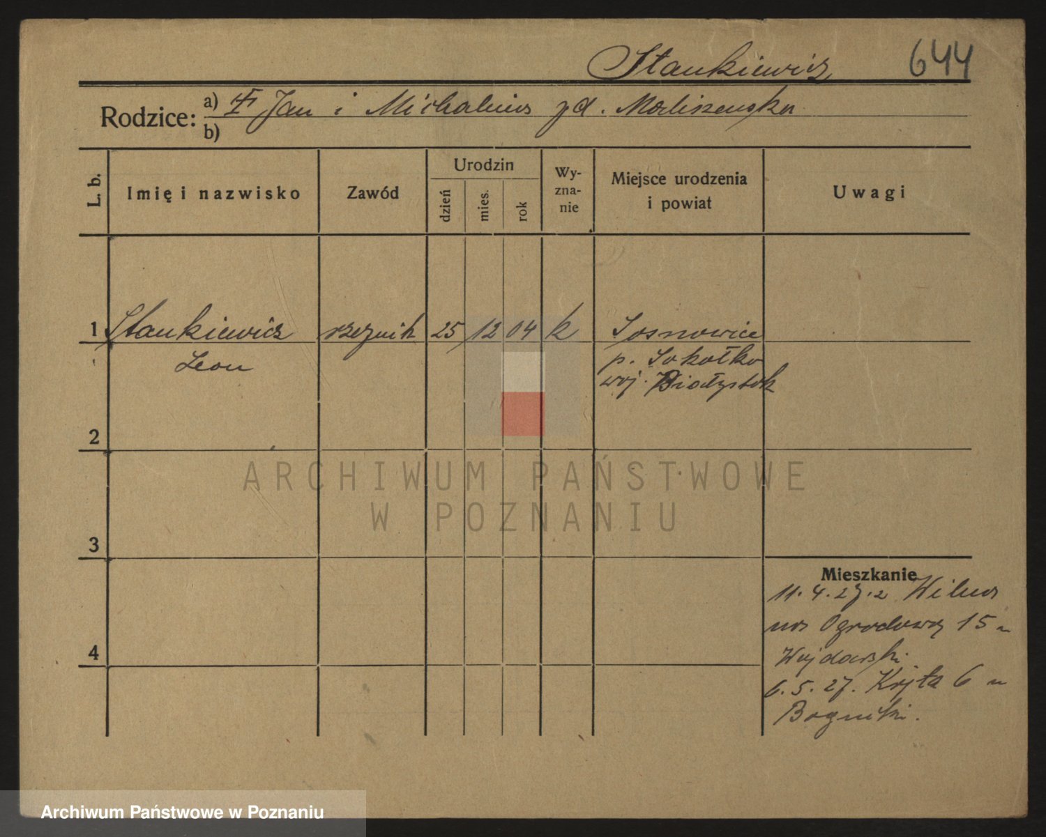 Podgląd karty osobowej dostępny jest po kliknięciu na nazwisko lub ikonkę karty. Można dokonywać powiększenia (ikony na górze) lub przechodzić między kolejnymi skanami (strzałki po bokach).