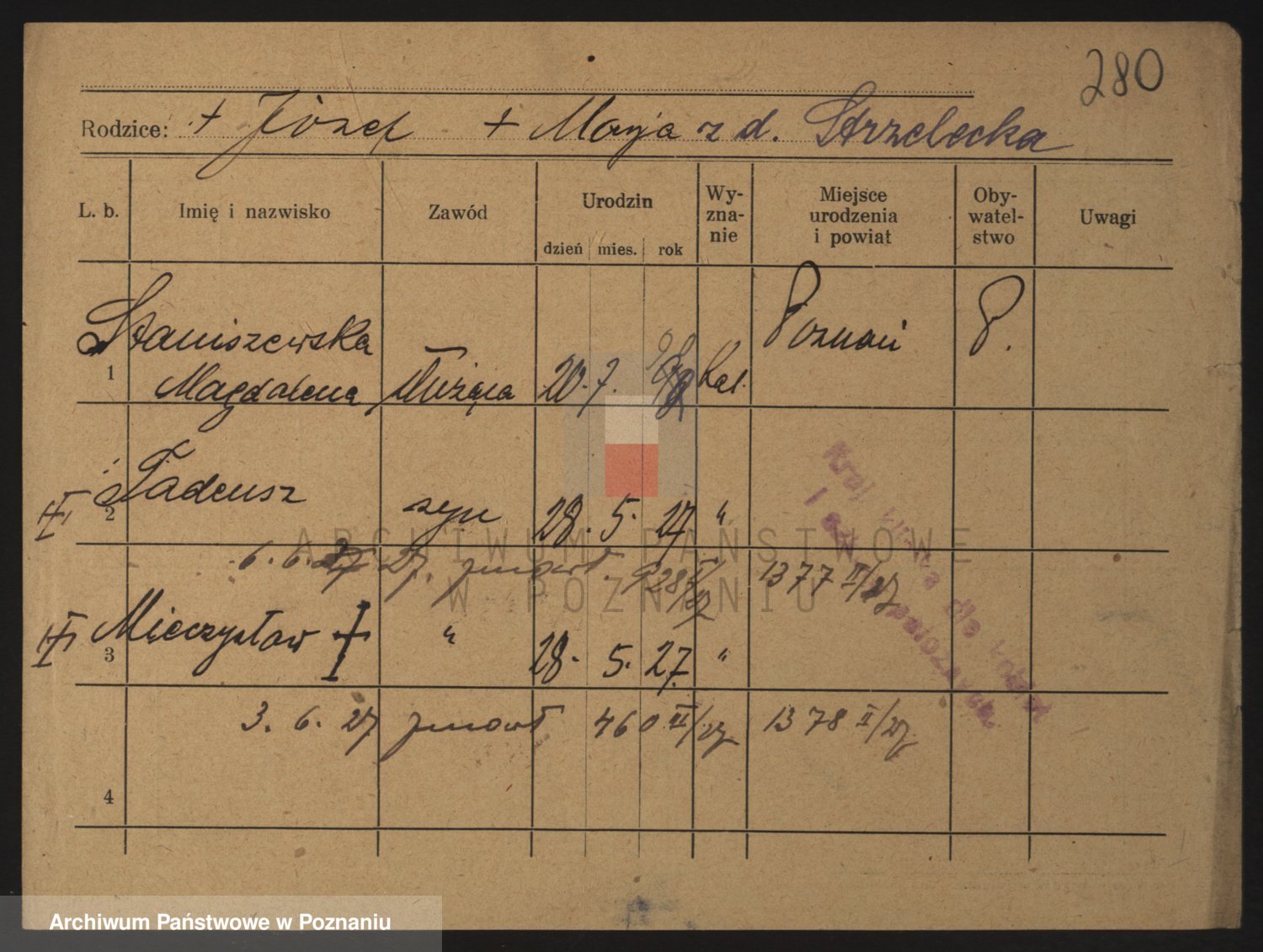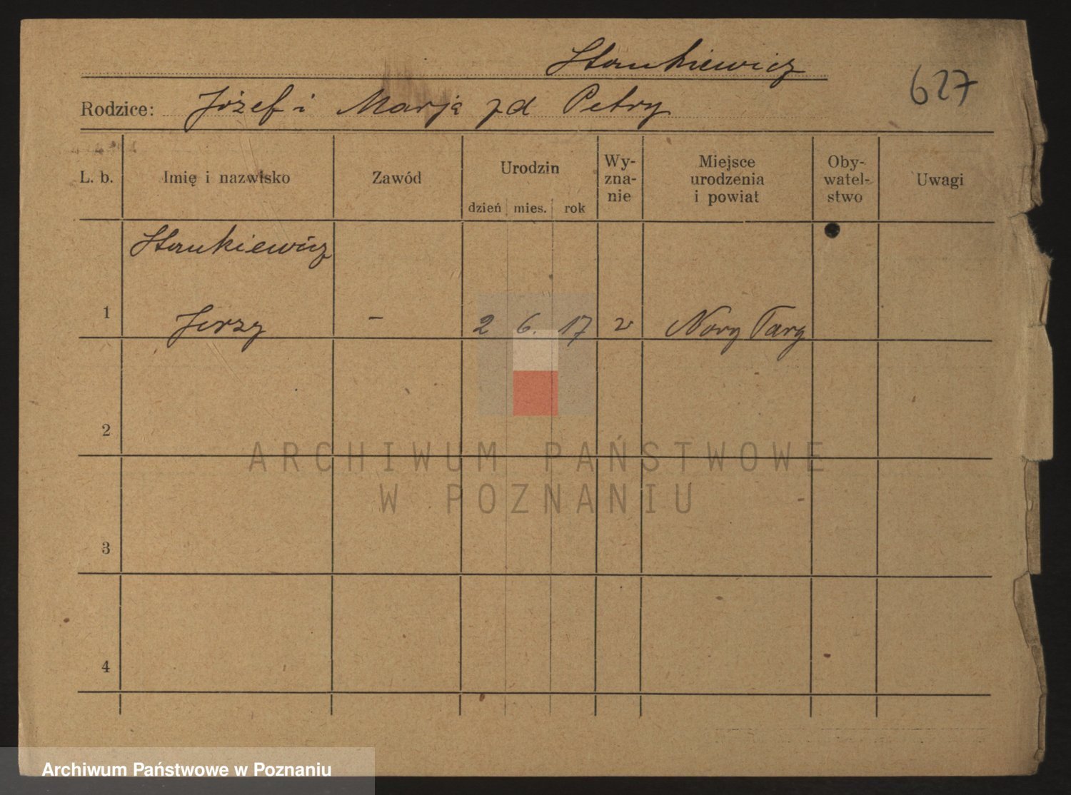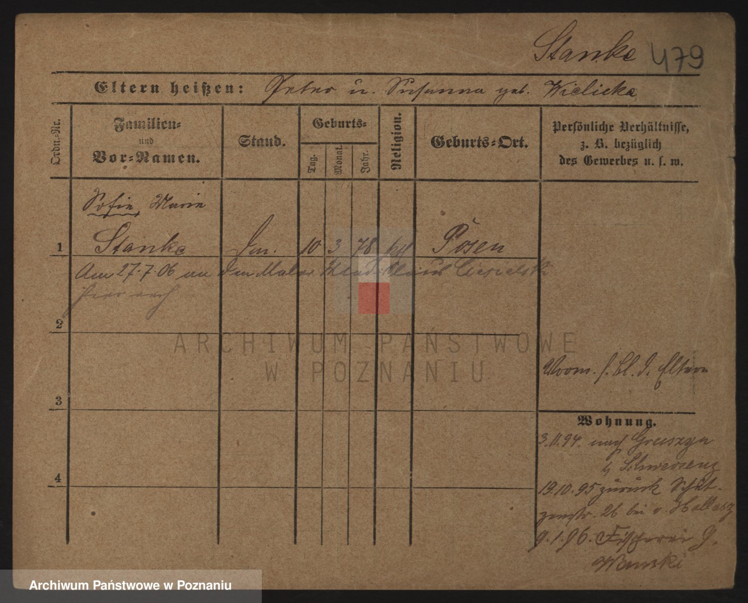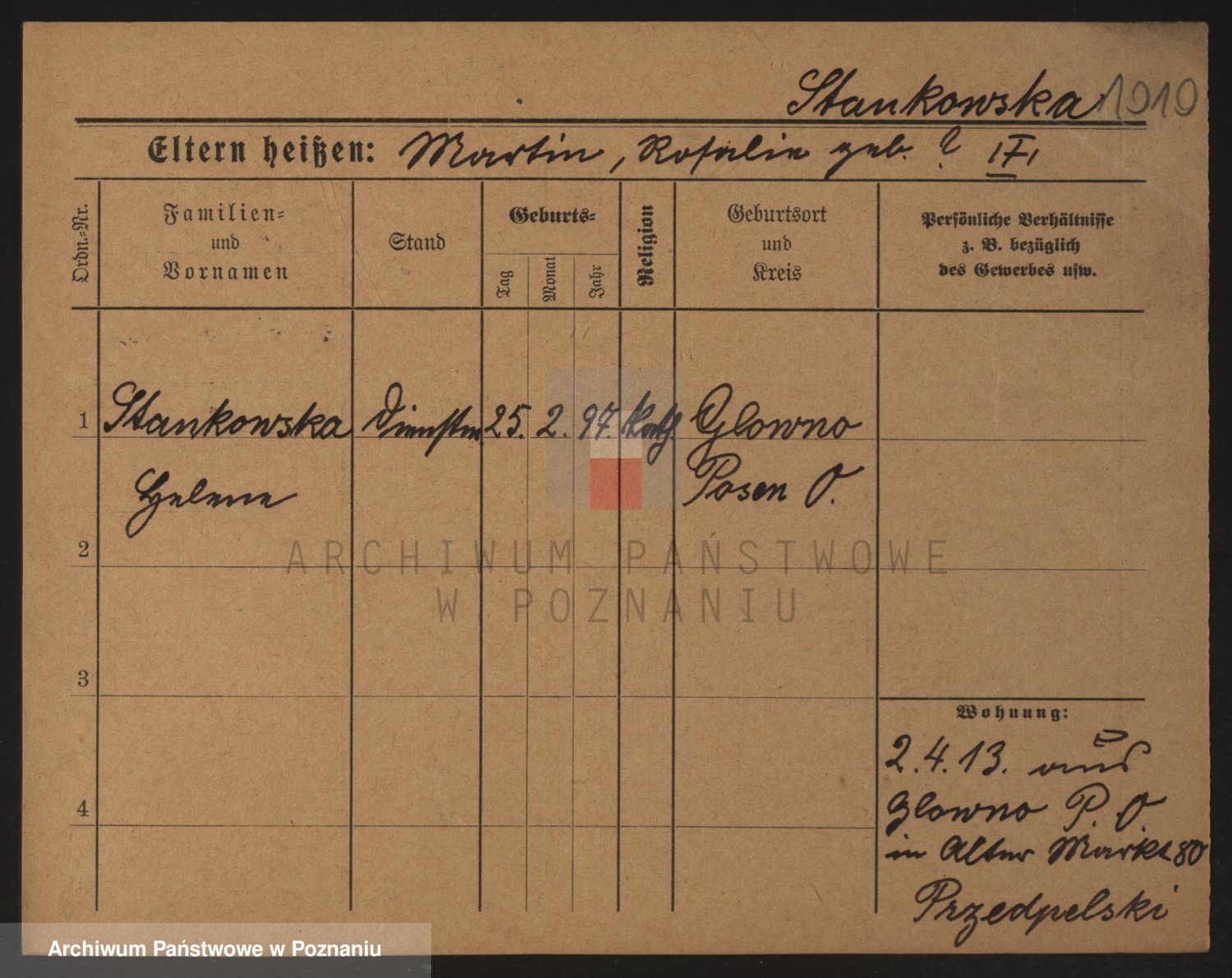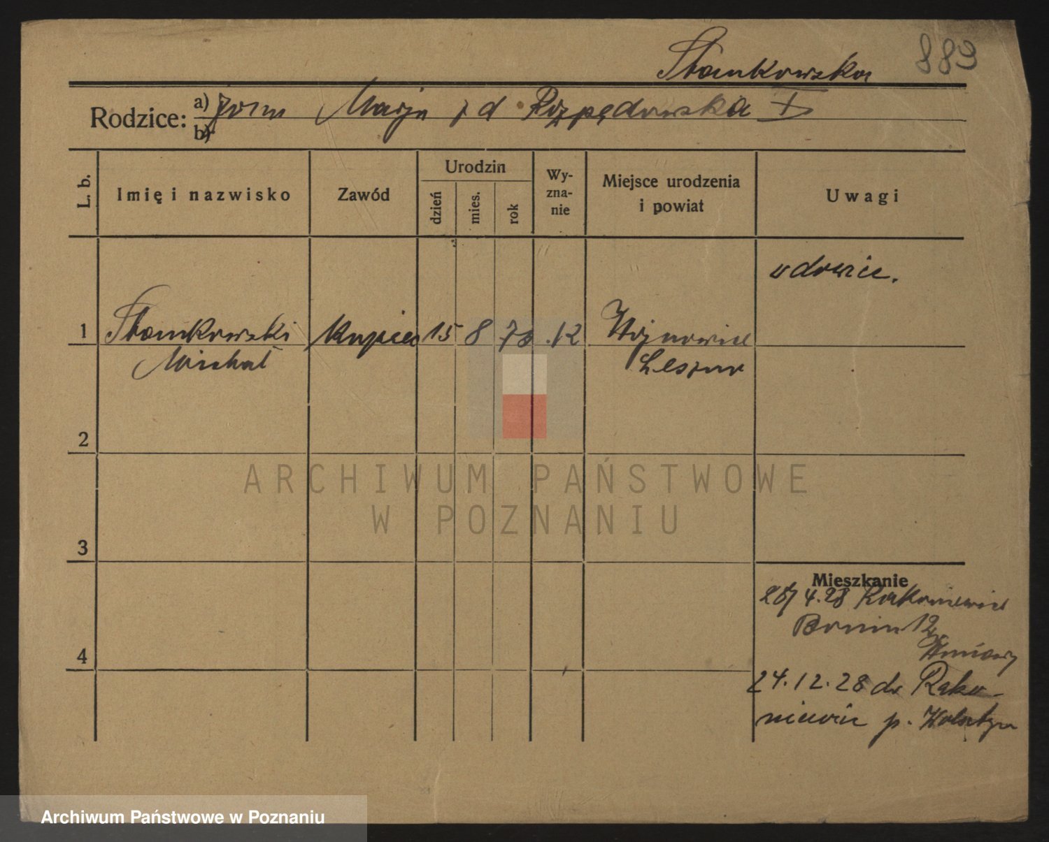 Podgląd karty osobowej dostępny jest po kliknięciu na nazwisko lub ikonkę karty. Można dokonywać powiększenia (ikony na górze) lub przechodzić między kolejnymi skanami (strzałki po bokach).