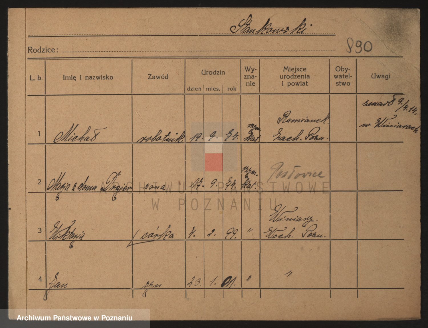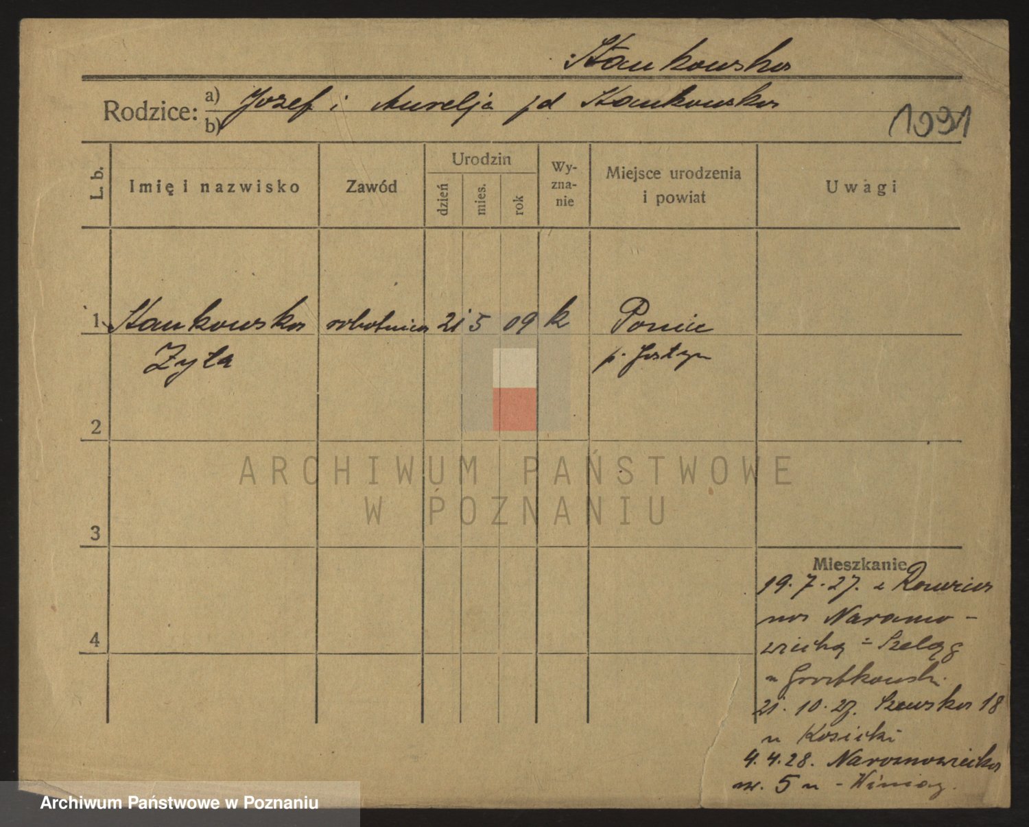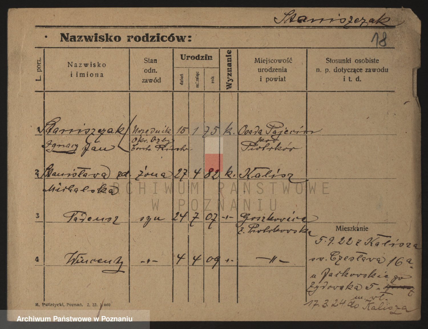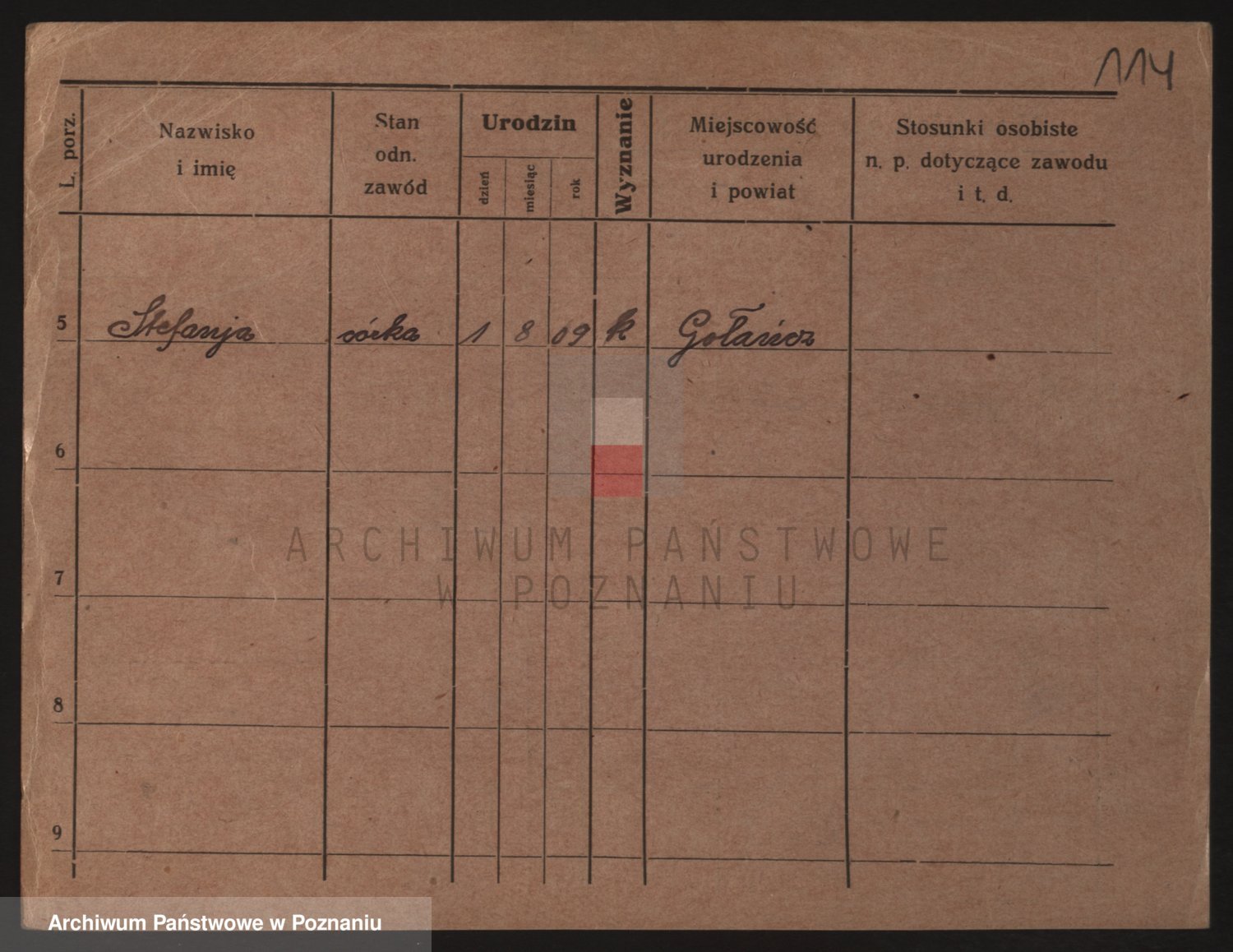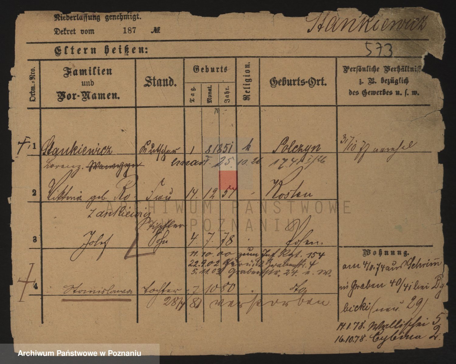 Podgląd karty osobowej dostępny jest po kliknięciu na nazwisko lub ikonkę karty. Można dokonywać powiększenia (ikony na górze) lub przechodzić między kolejnymi skanami (strzałki po bokach).