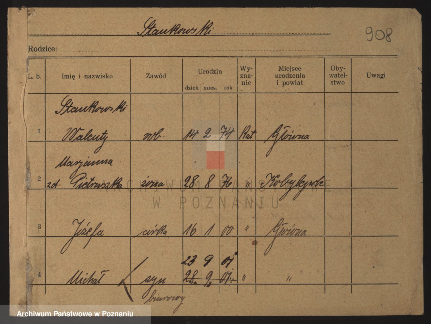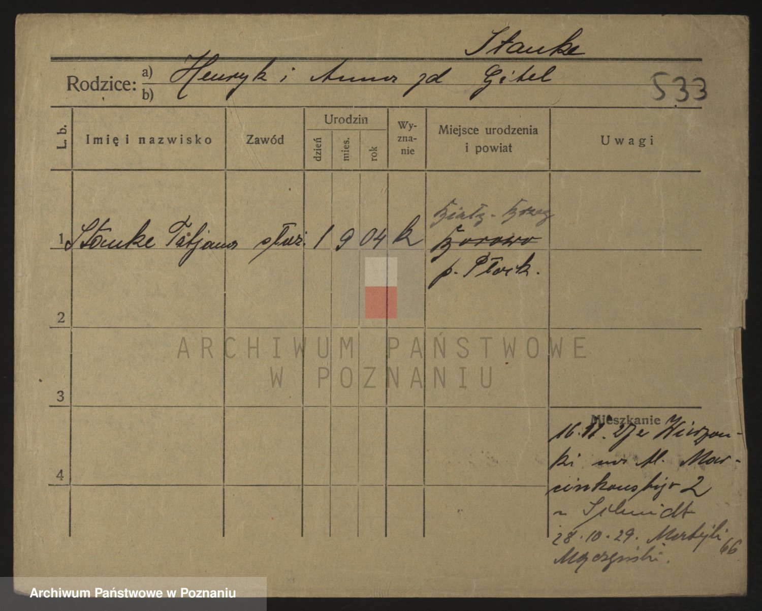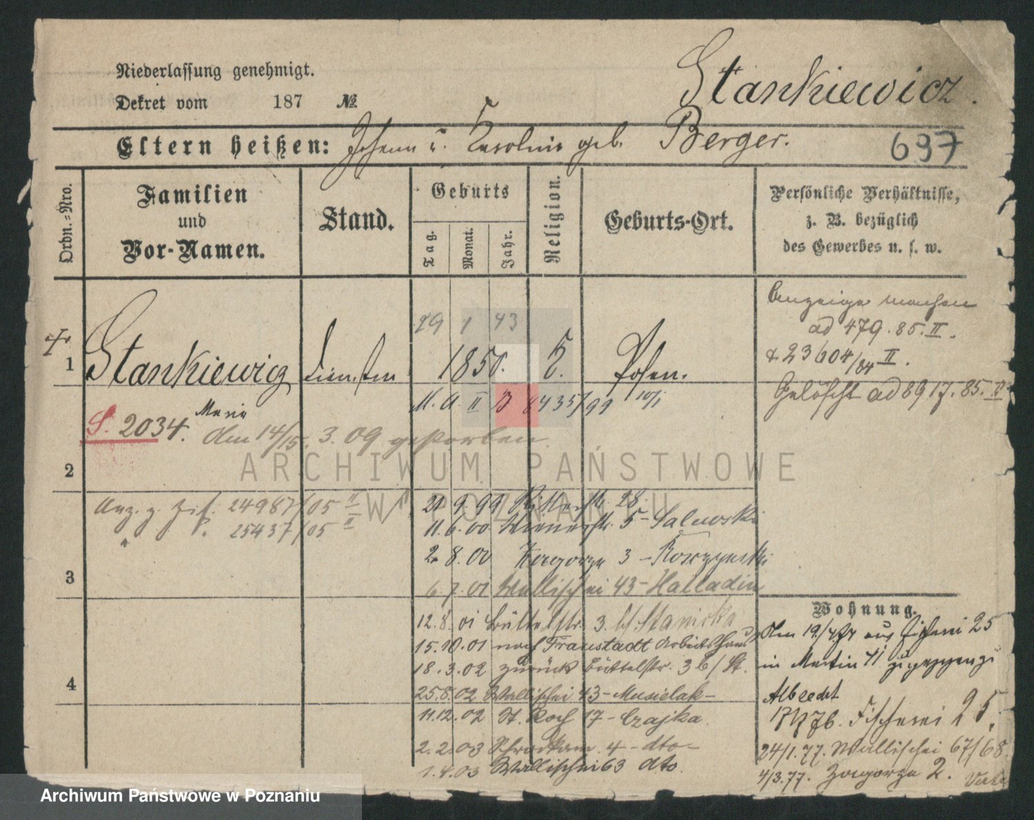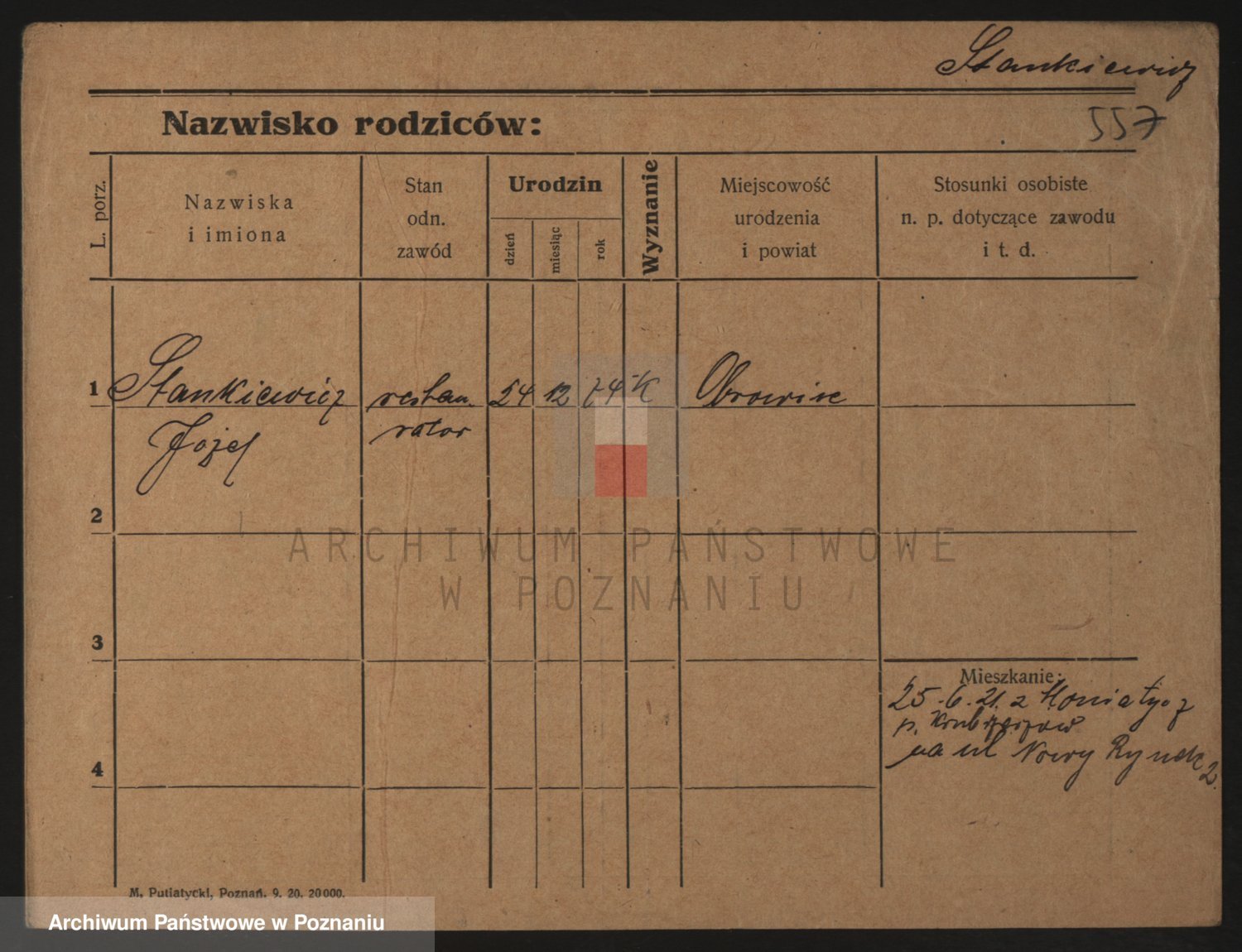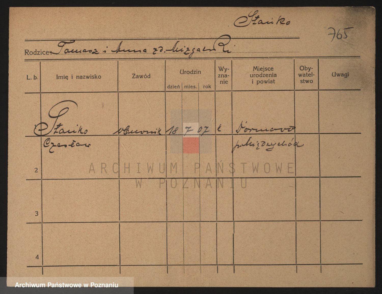 Podgląd karty osobowej dostępny jest po kliknięciu na nazwisko lub ikonkę karty. Można dokonywać powiększenia (ikony na górze) lub przechodzić między kolejnymi skanami (strzałki po bokach).