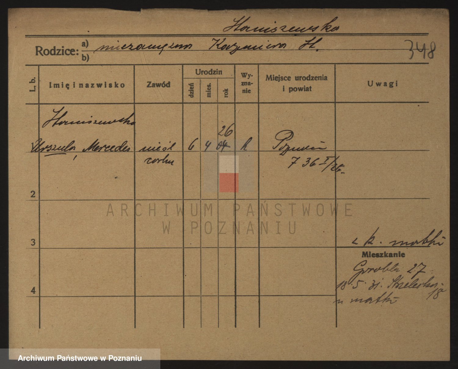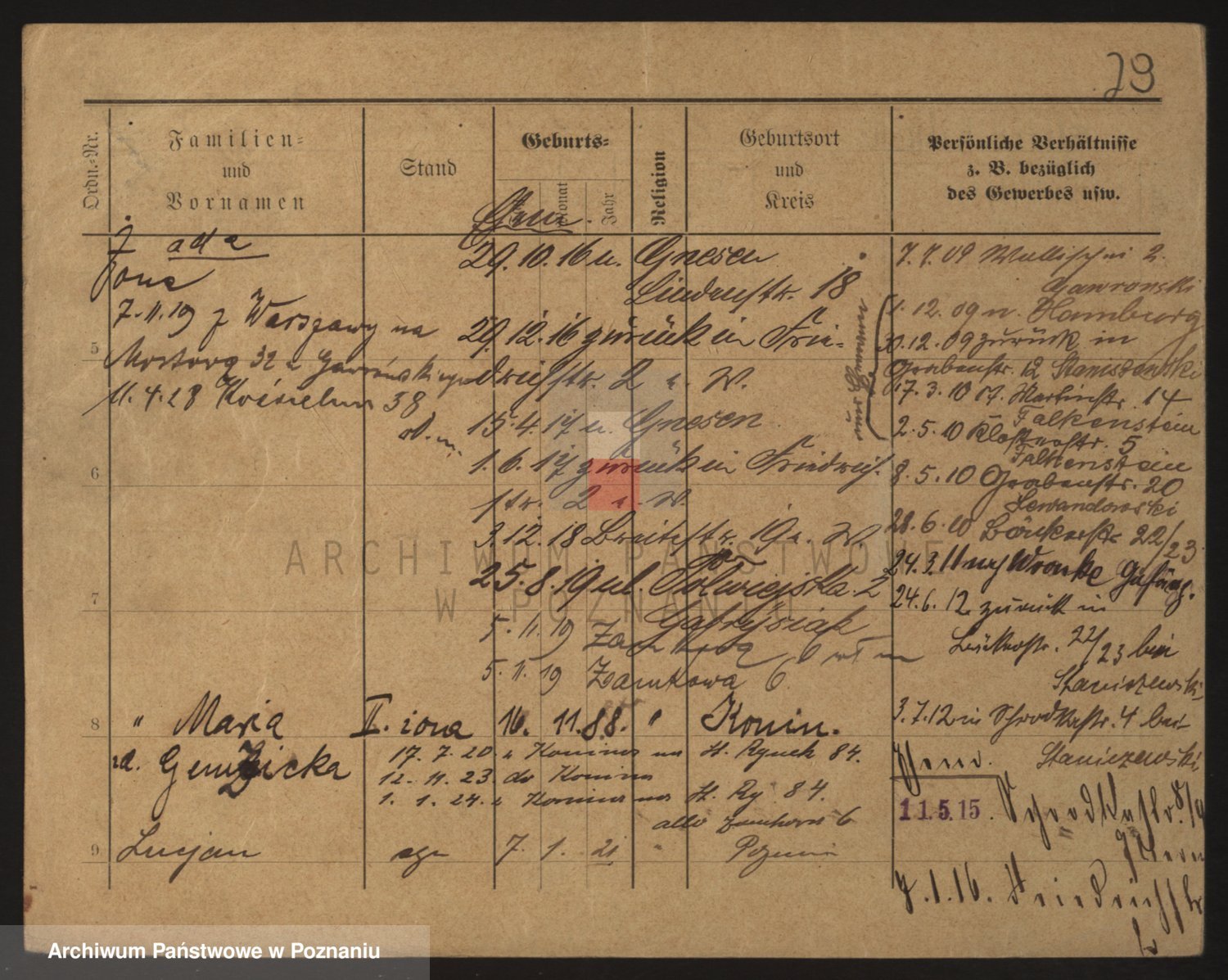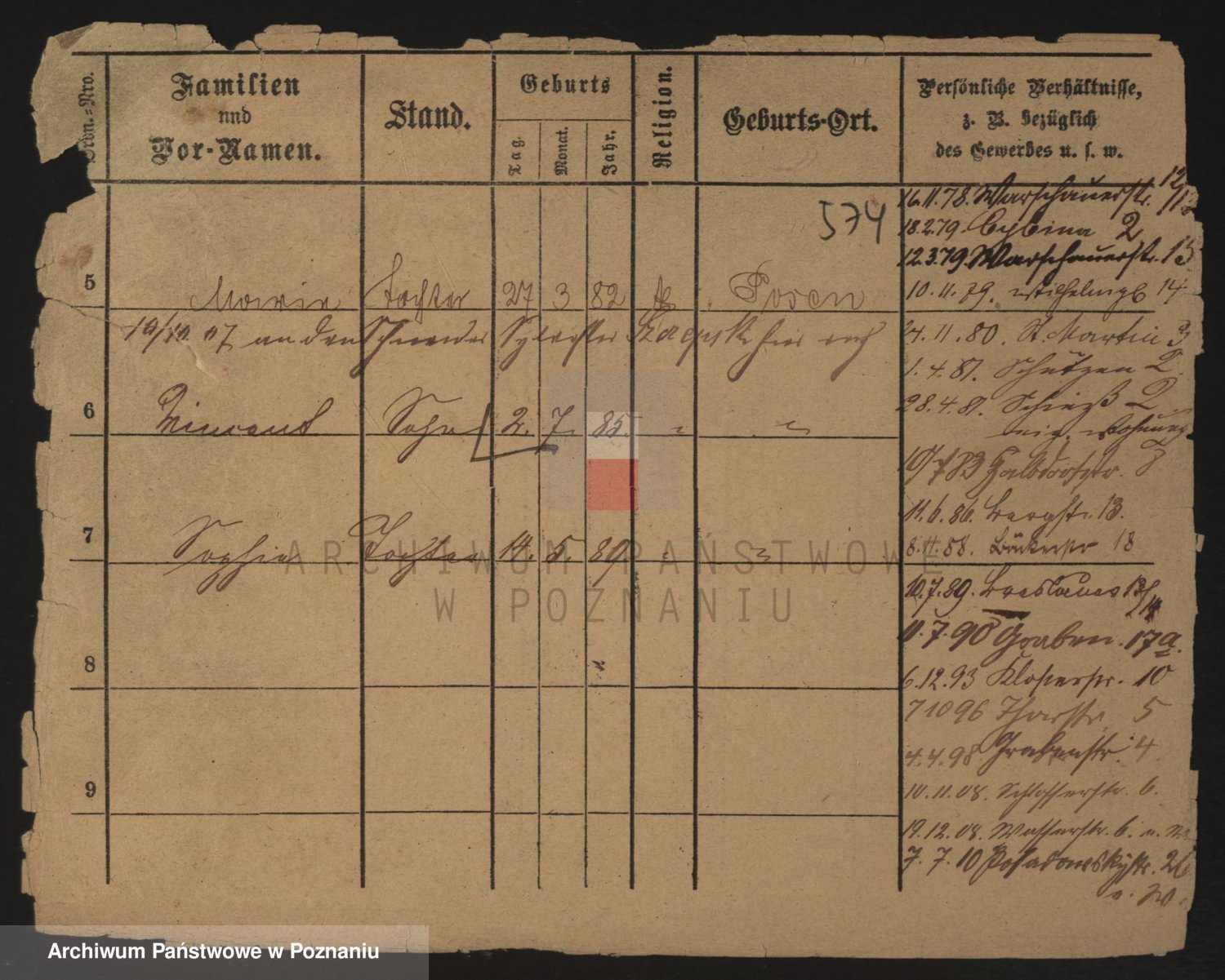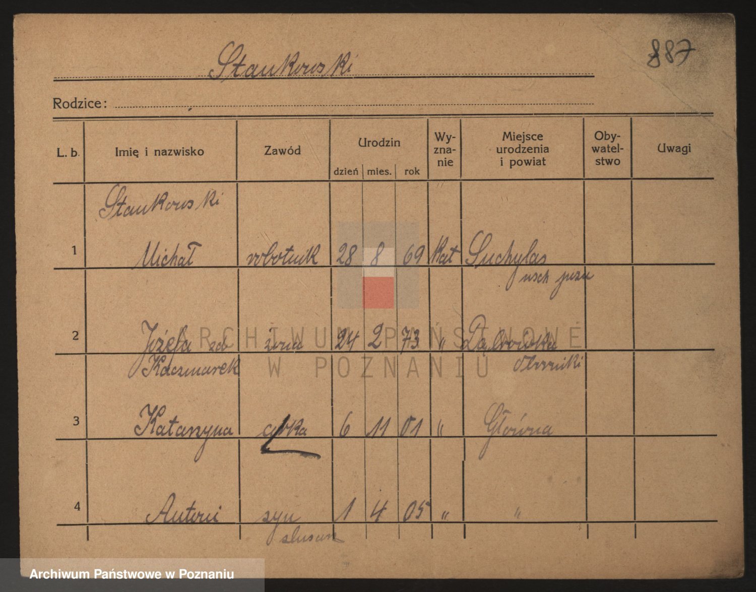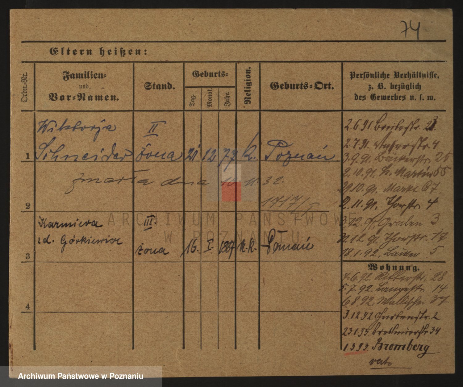 Podgląd karty osobowej dostępny jest po kliknięciu na nazwisko lub ikonkę karty. Można dokonywać powiększenia (ikony na górze) lub przechodzić między kolejnymi skanami (strzałki po bokach).