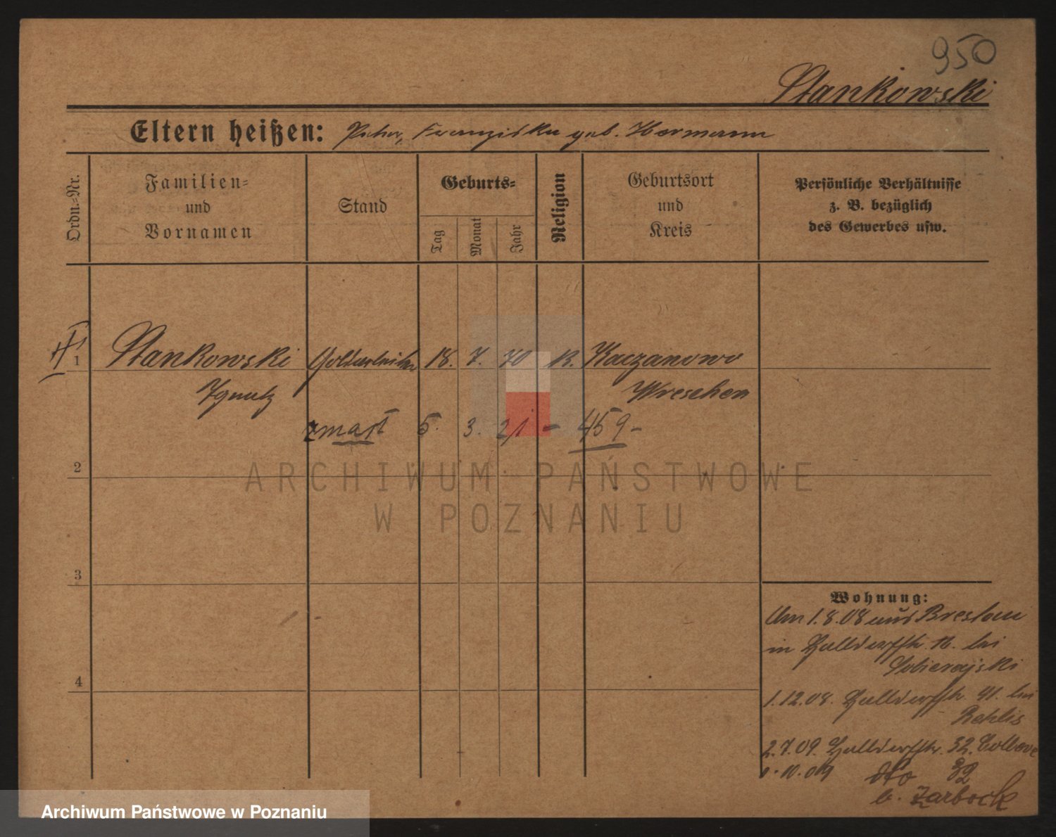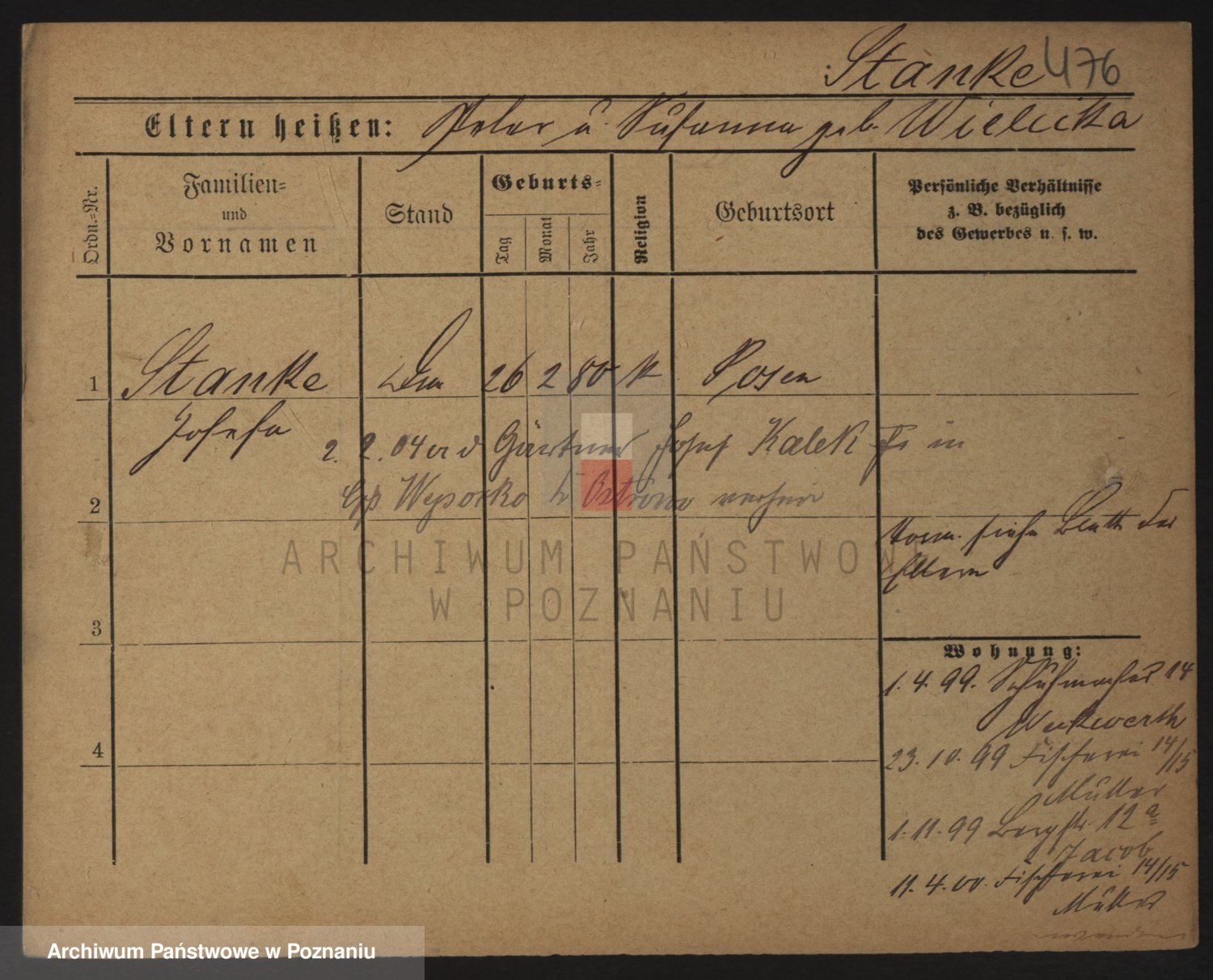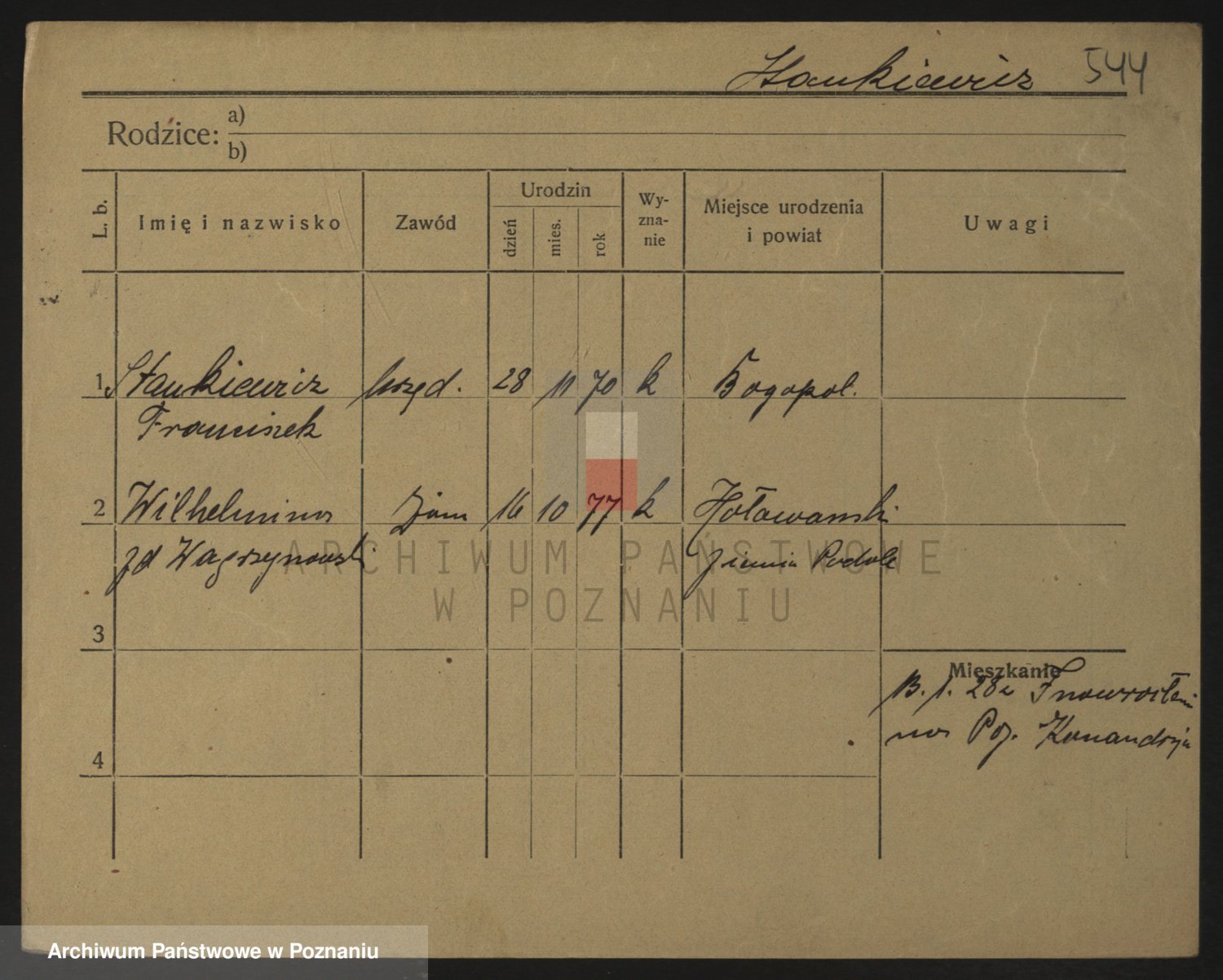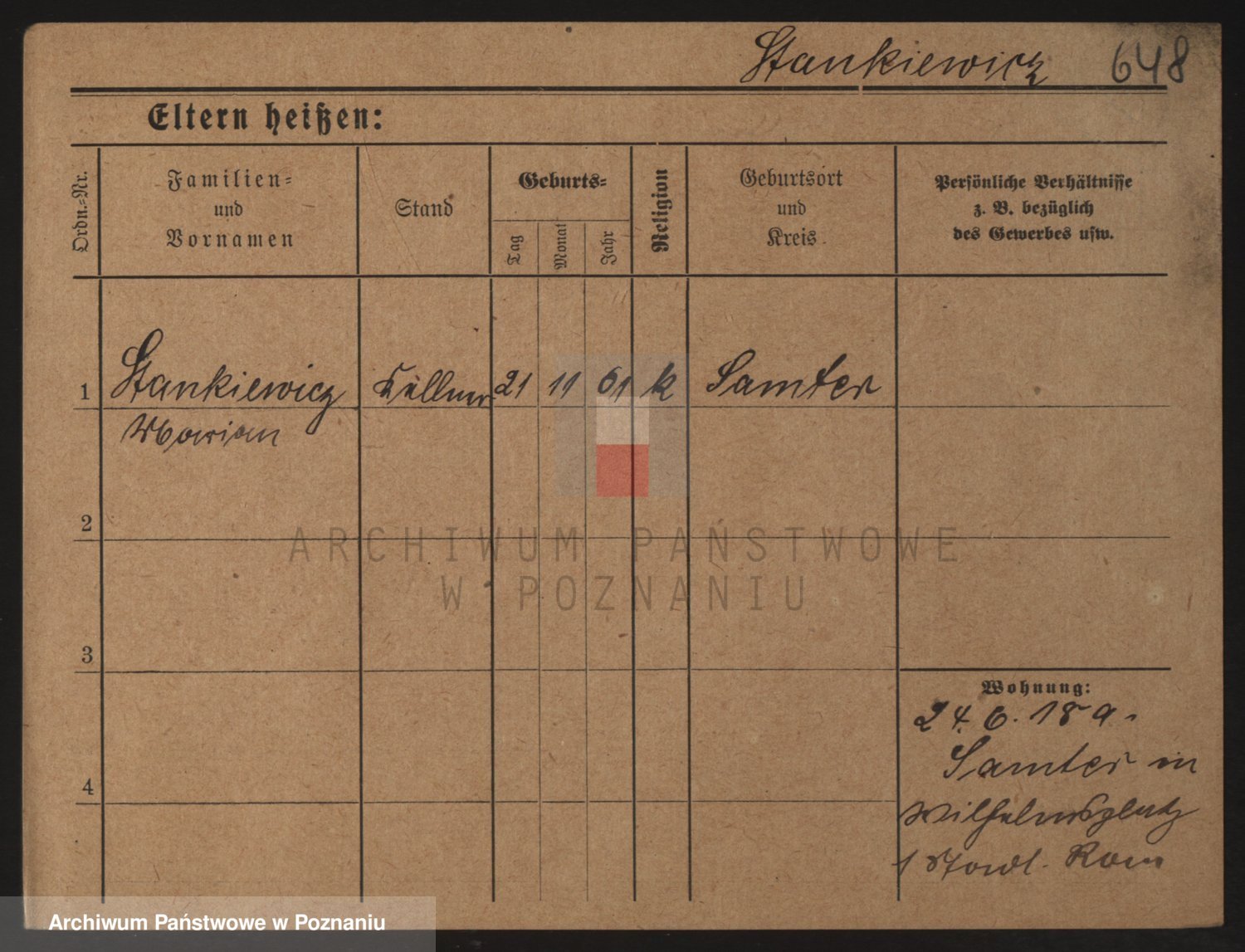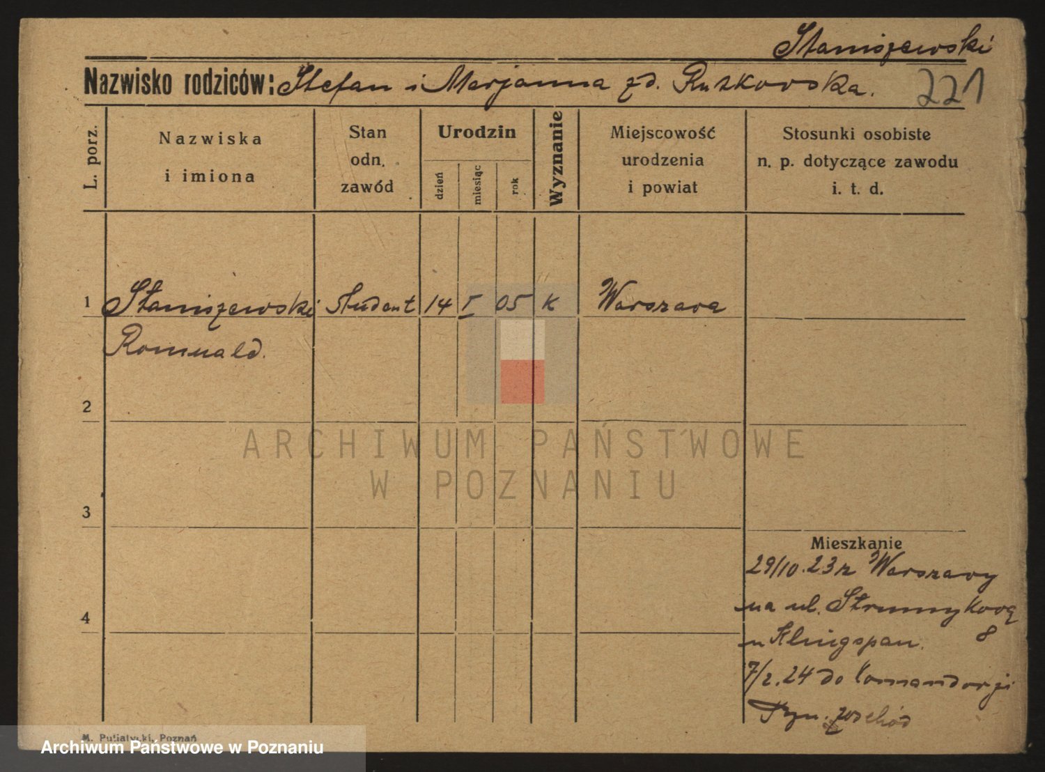 Podgląd karty osobowej dostępny jest po kliknięciu na nazwisko lub ikonkę karty. Można dokonywać powiększenia (ikony na górze) lub przechodzić między kolejnymi skanami (strzałki po bokach).