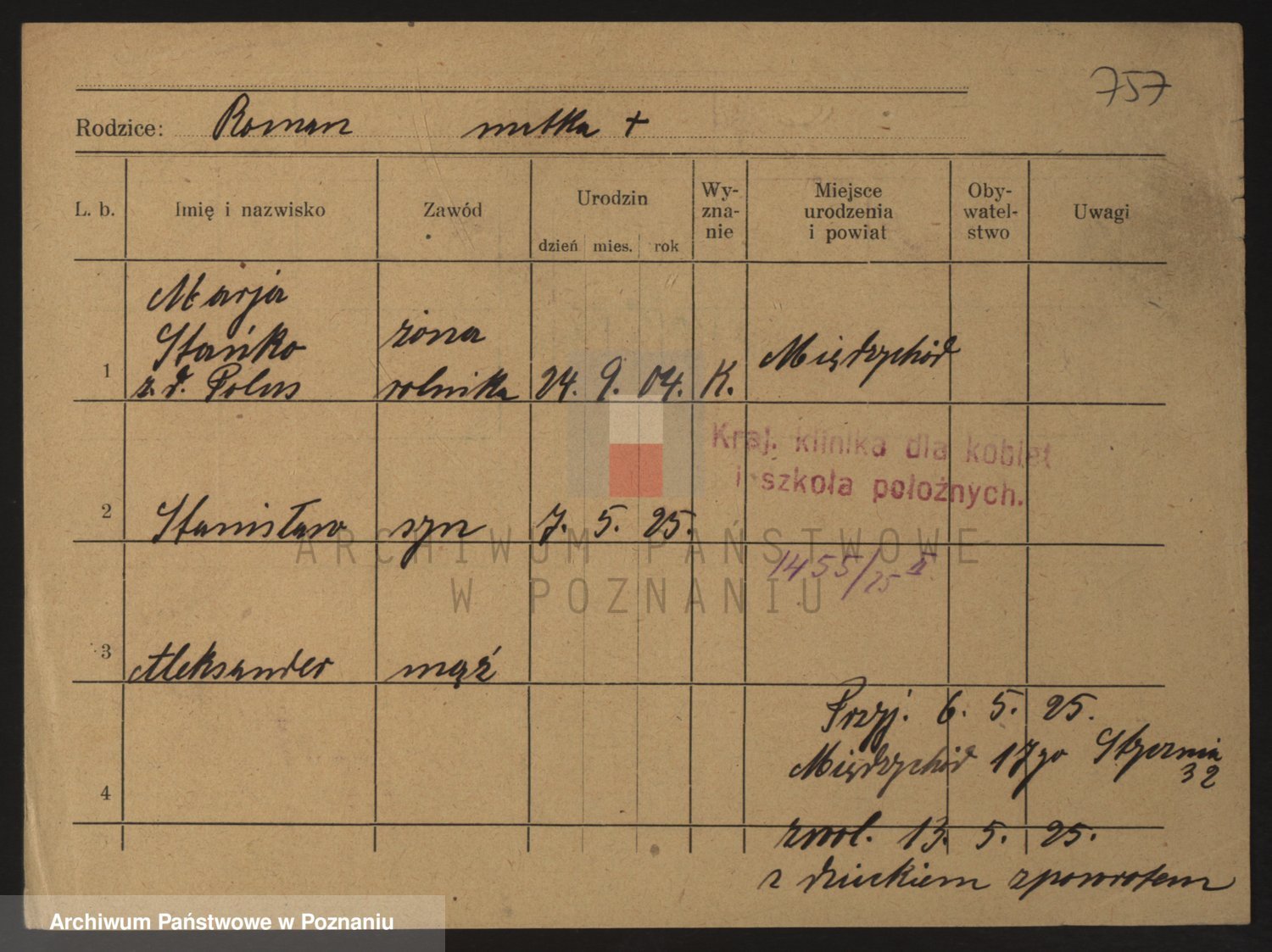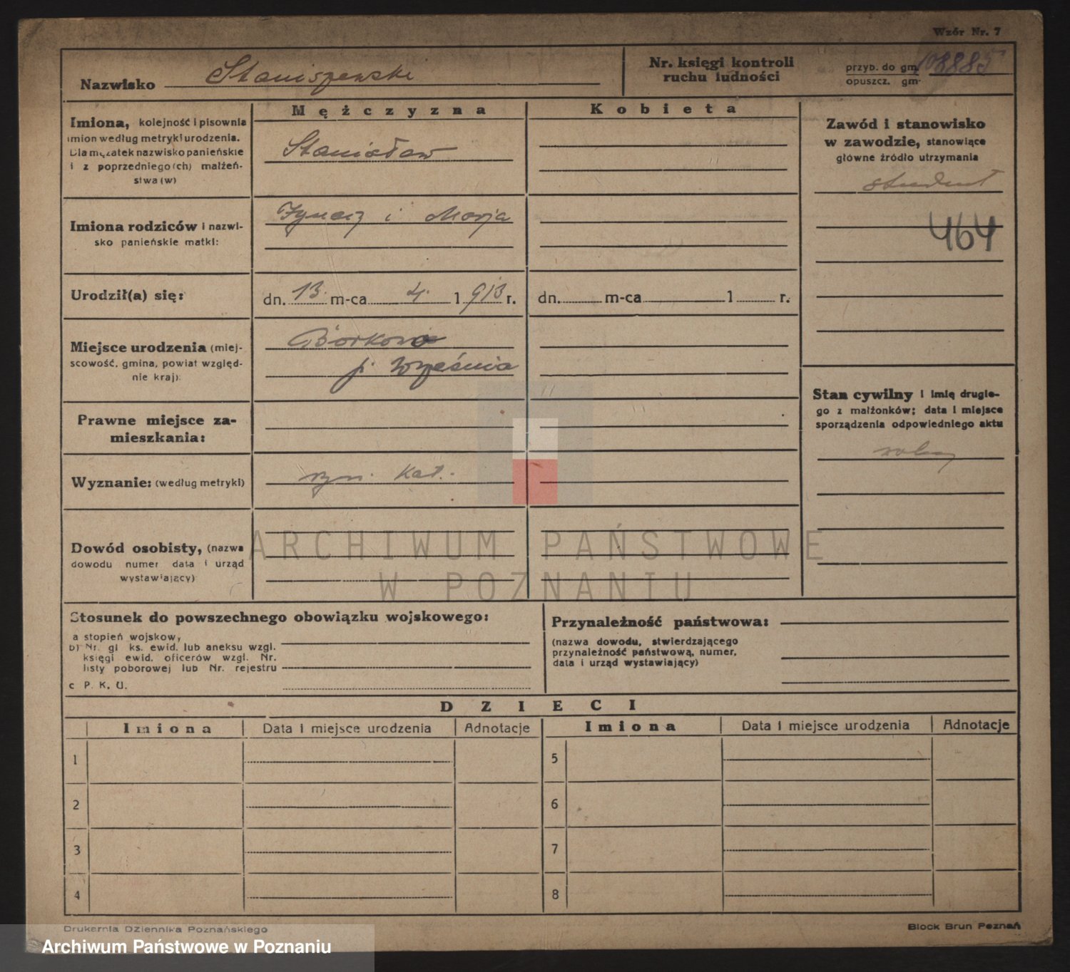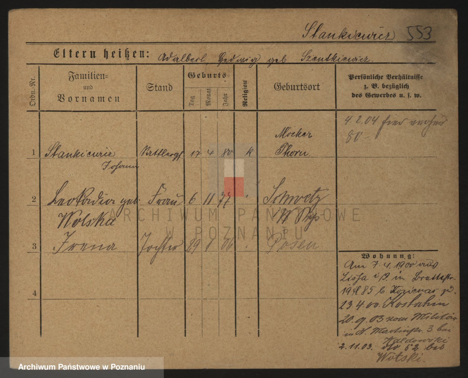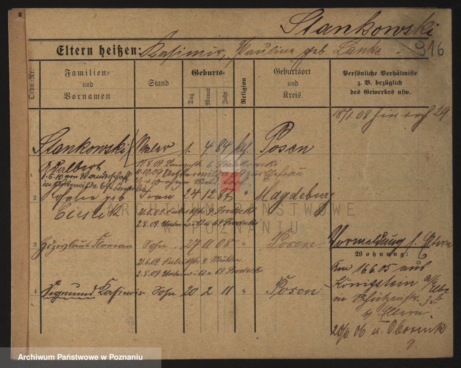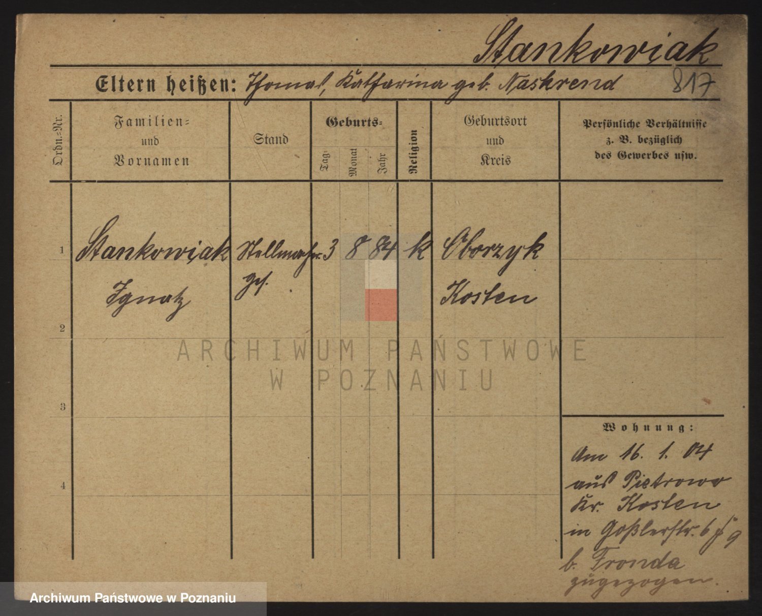 Podgląd karty osobowej dostępny jest po kliknięciu na nazwisko lub ikonkę karty. Można dokonywać powiększenia (ikony na górze) lub przechodzić między kolejnymi skanami (strzałki po bokach).