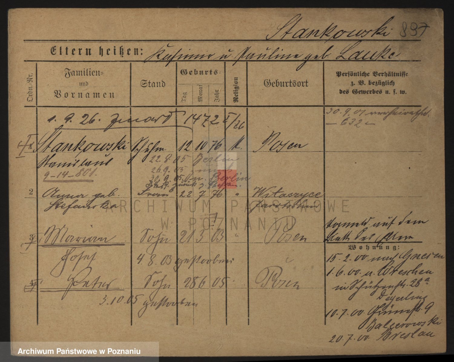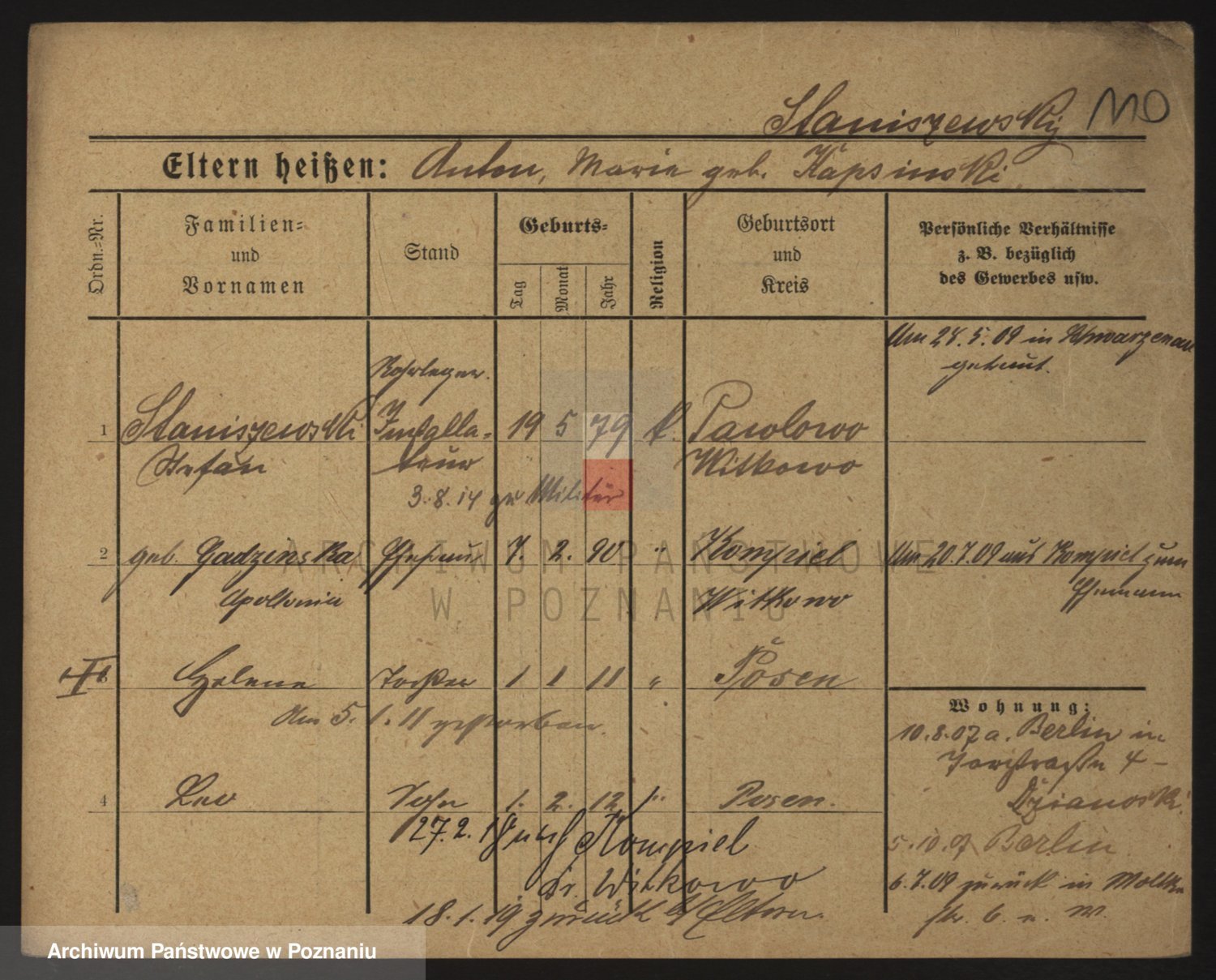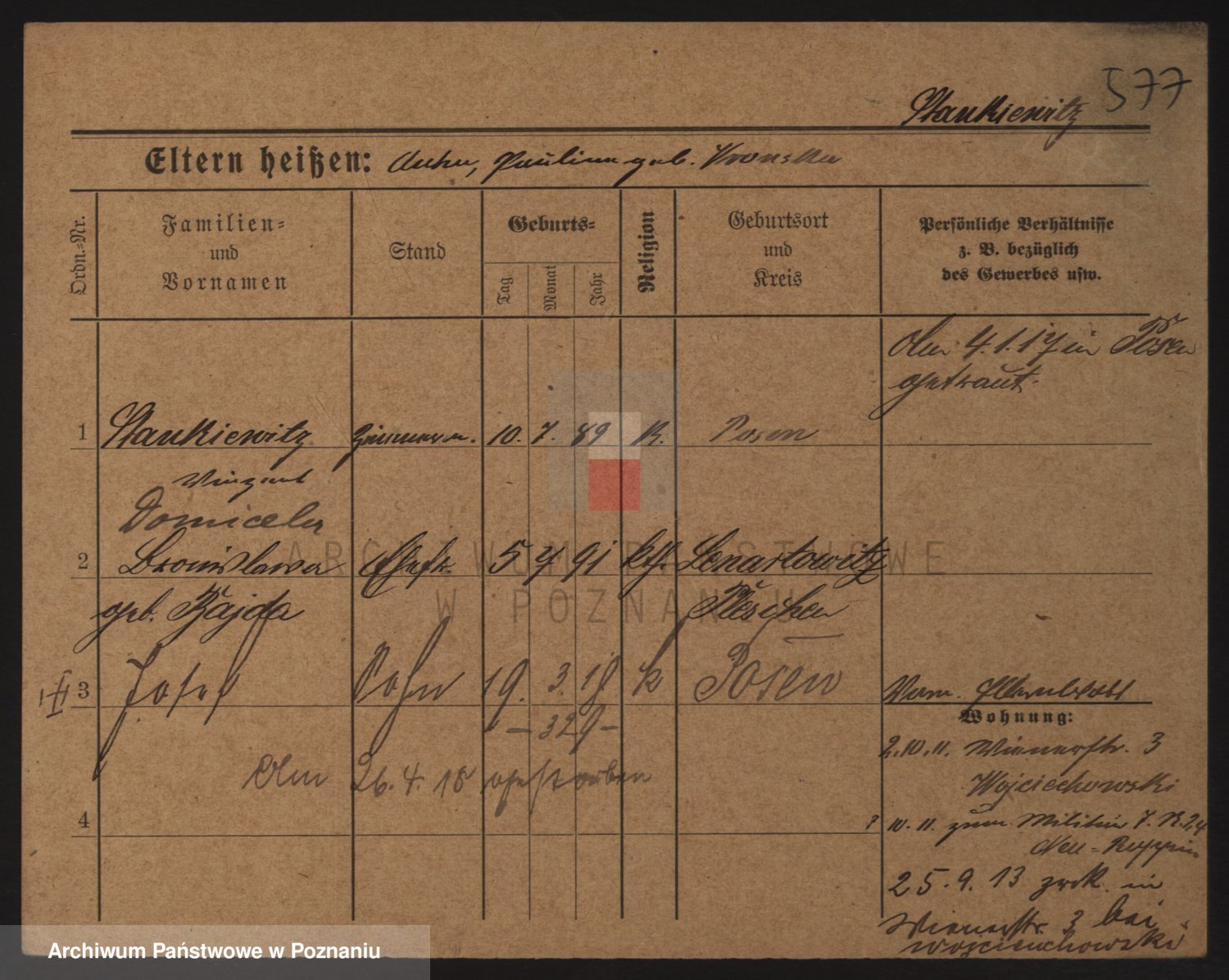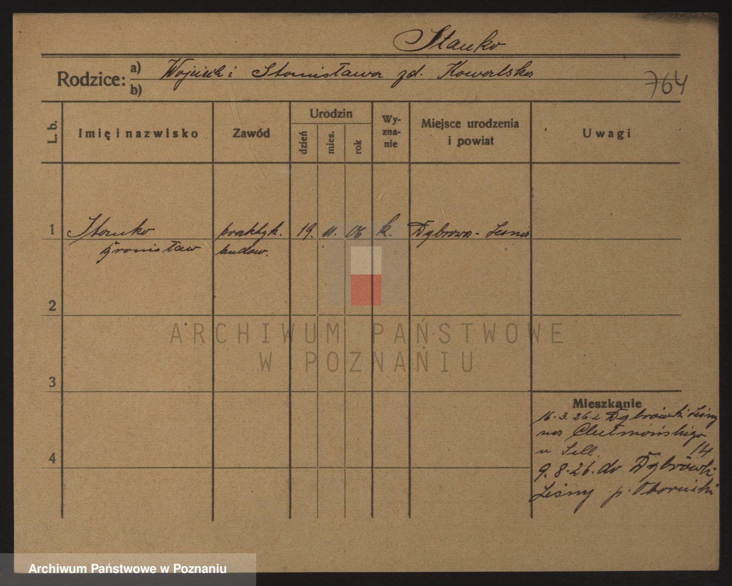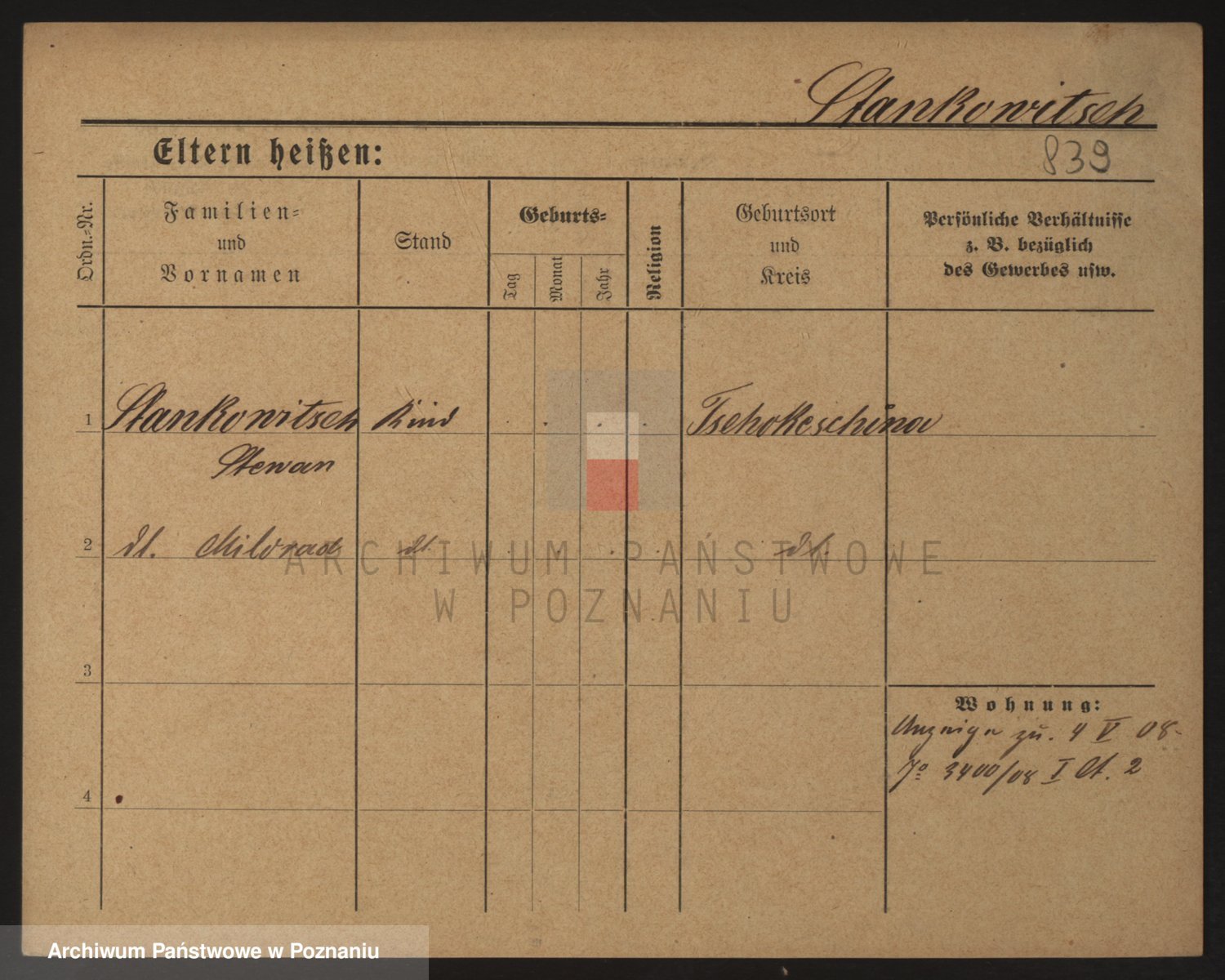 Podgląd karty osobowej dostępny jest po kliknięciu na nazwisko lub ikonkę karty. Można dokonywać powiększenia (ikony na górze) lub przechodzić między kolejnymi skanami (strzałki po bokach).