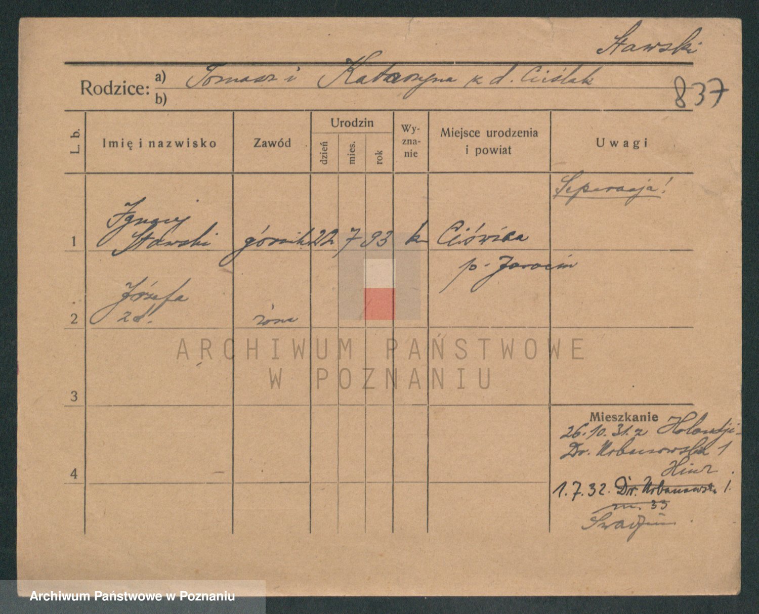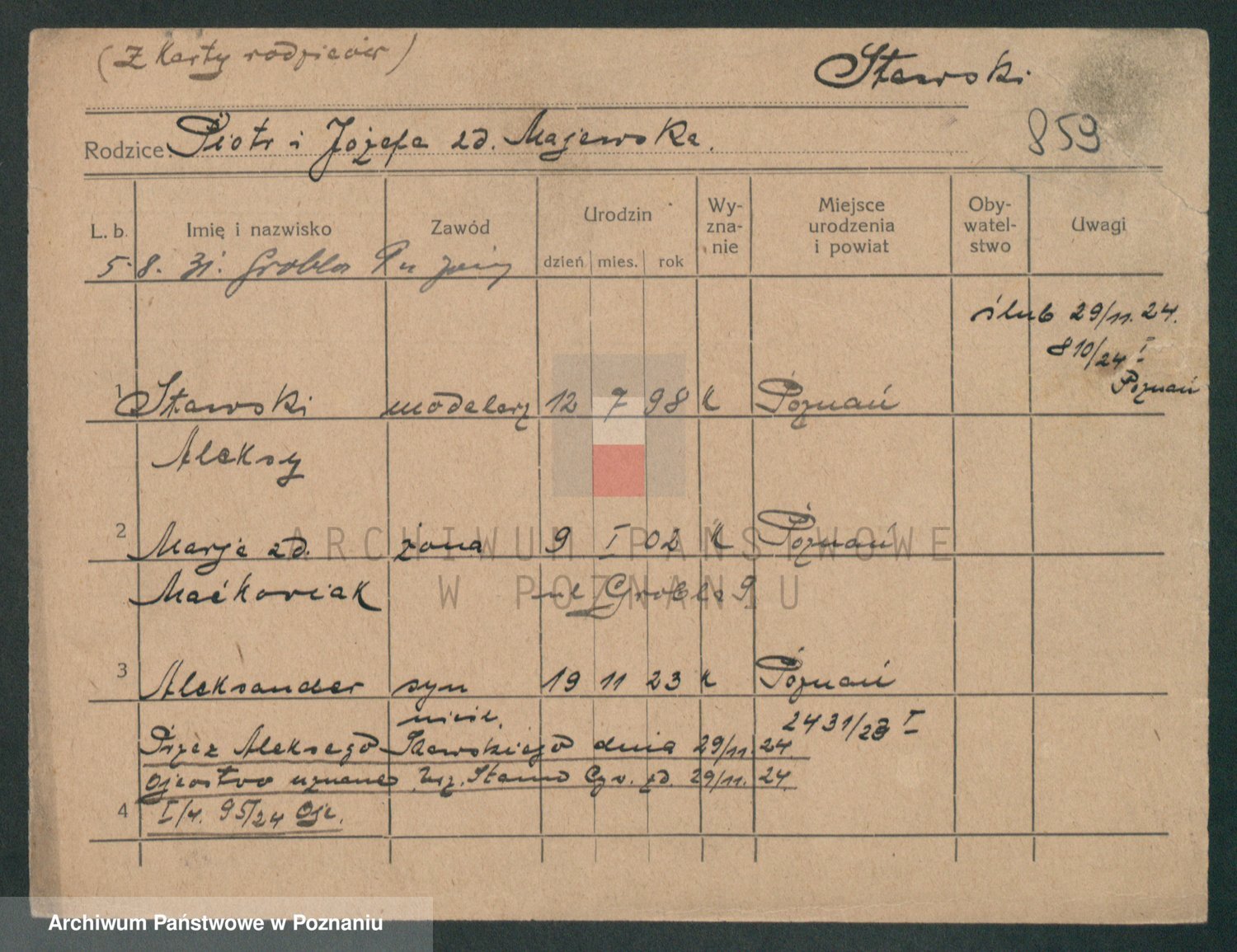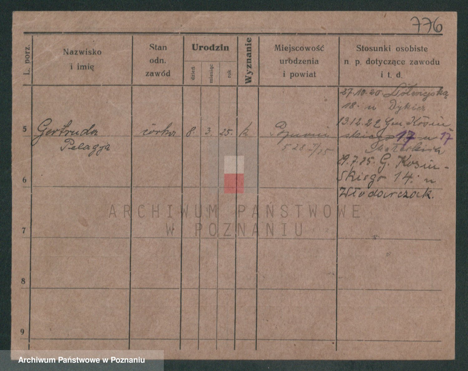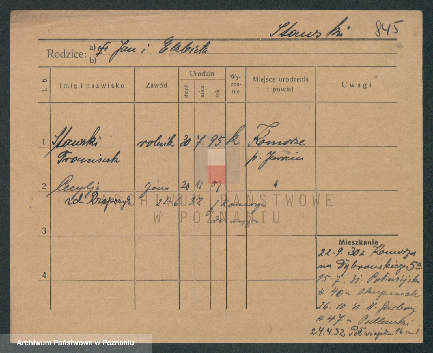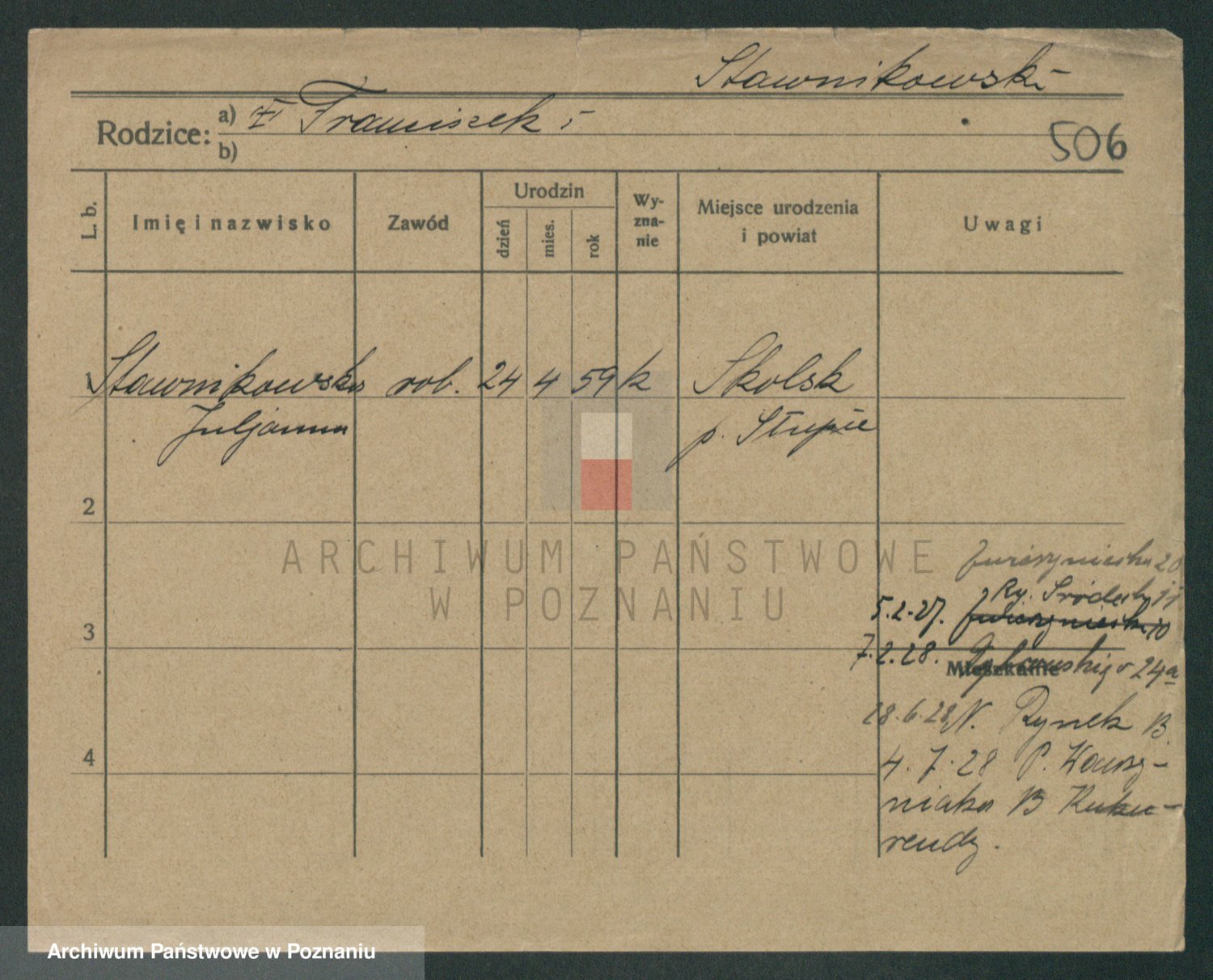 Podgląd karty osobowej dostępny jest po kliknięciu na nazwisko lub ikonkę karty. Można dokonywać powiększenia (ikony na górze) lub przechodzić między kolejnymi skanami (strzałki po bokach).
