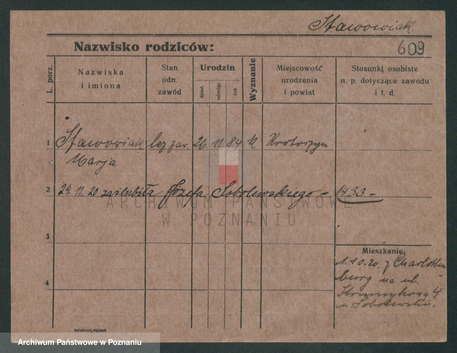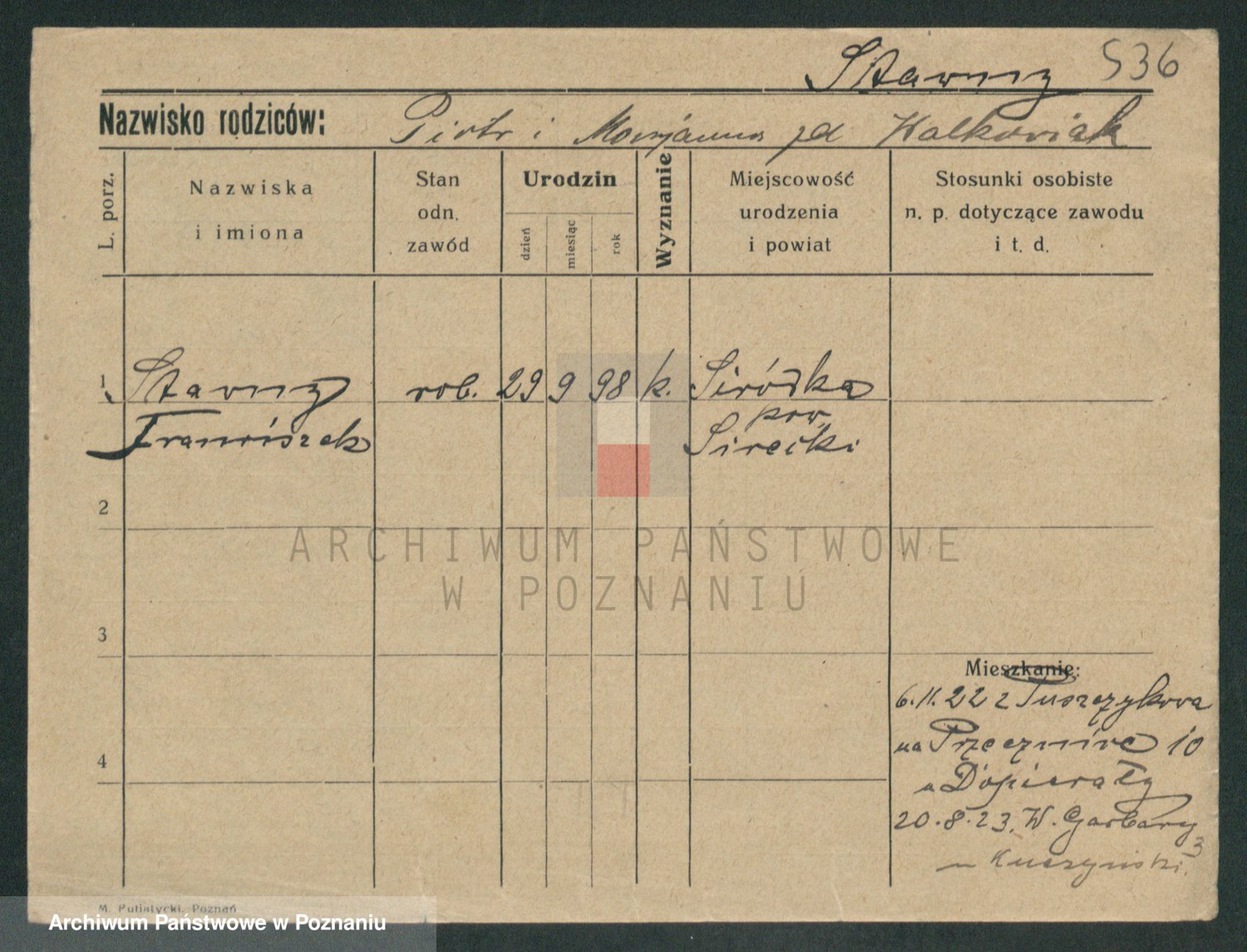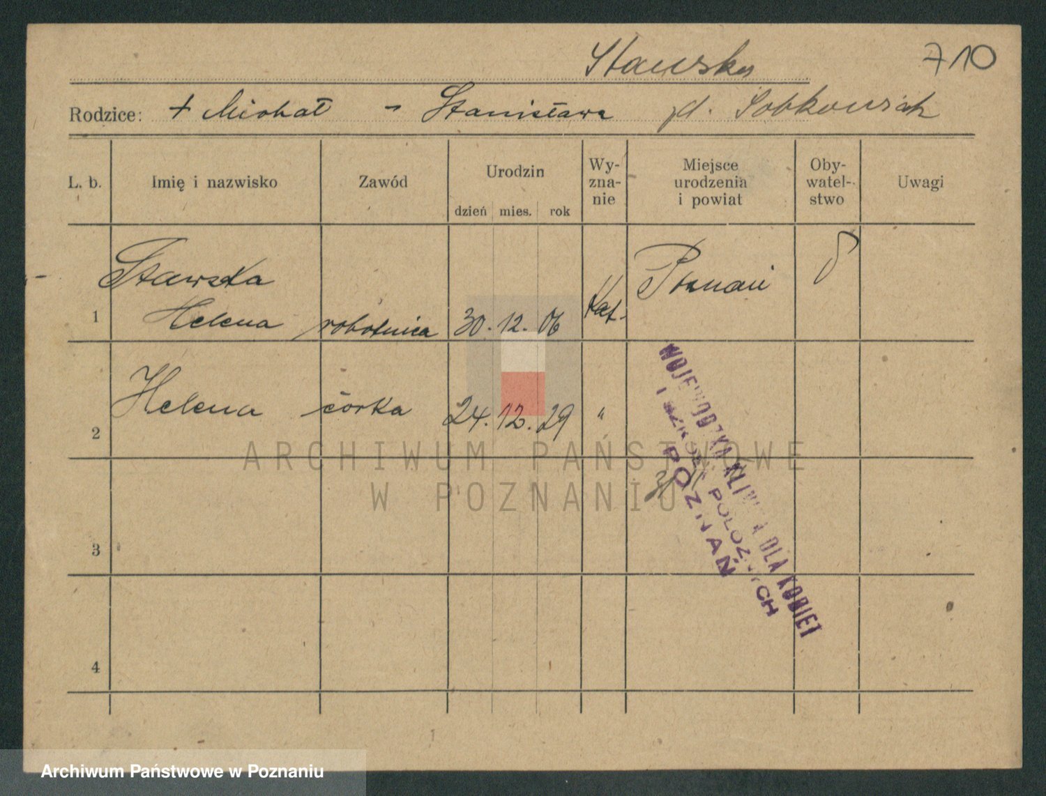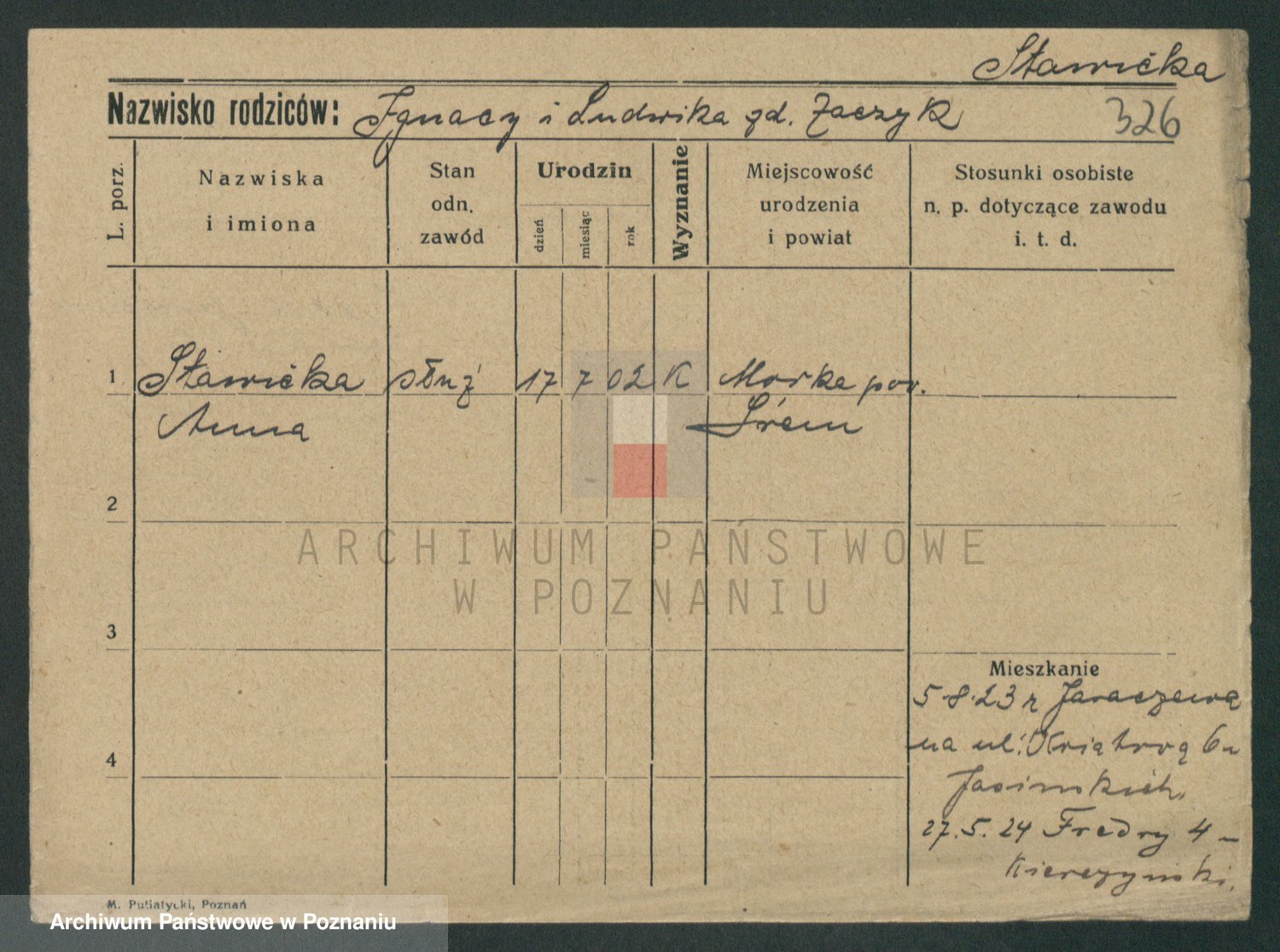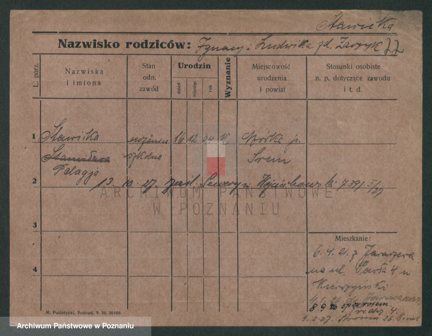 Podgląd karty osobowej dostępny jest po kliknięciu na nazwisko lub ikonkę karty. Można dokonywać powiększenia (ikony na górze) lub przechodzić między kolejnymi skanami (strzałki po bokach).