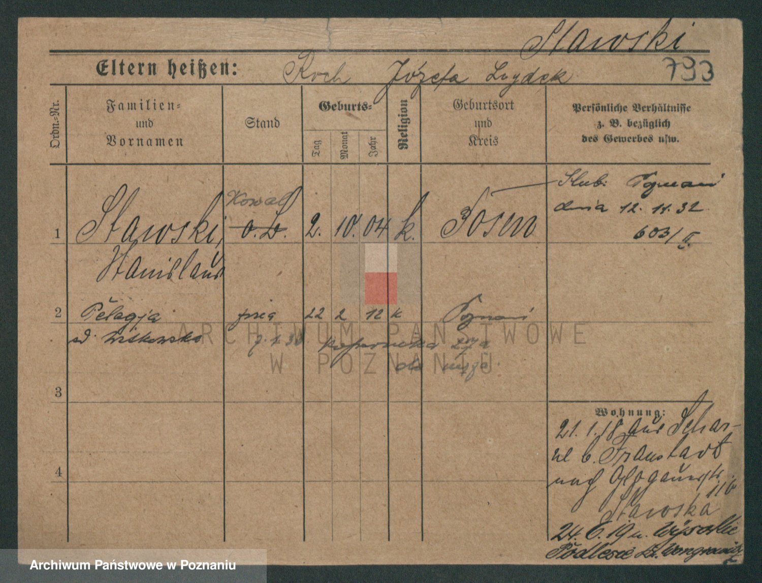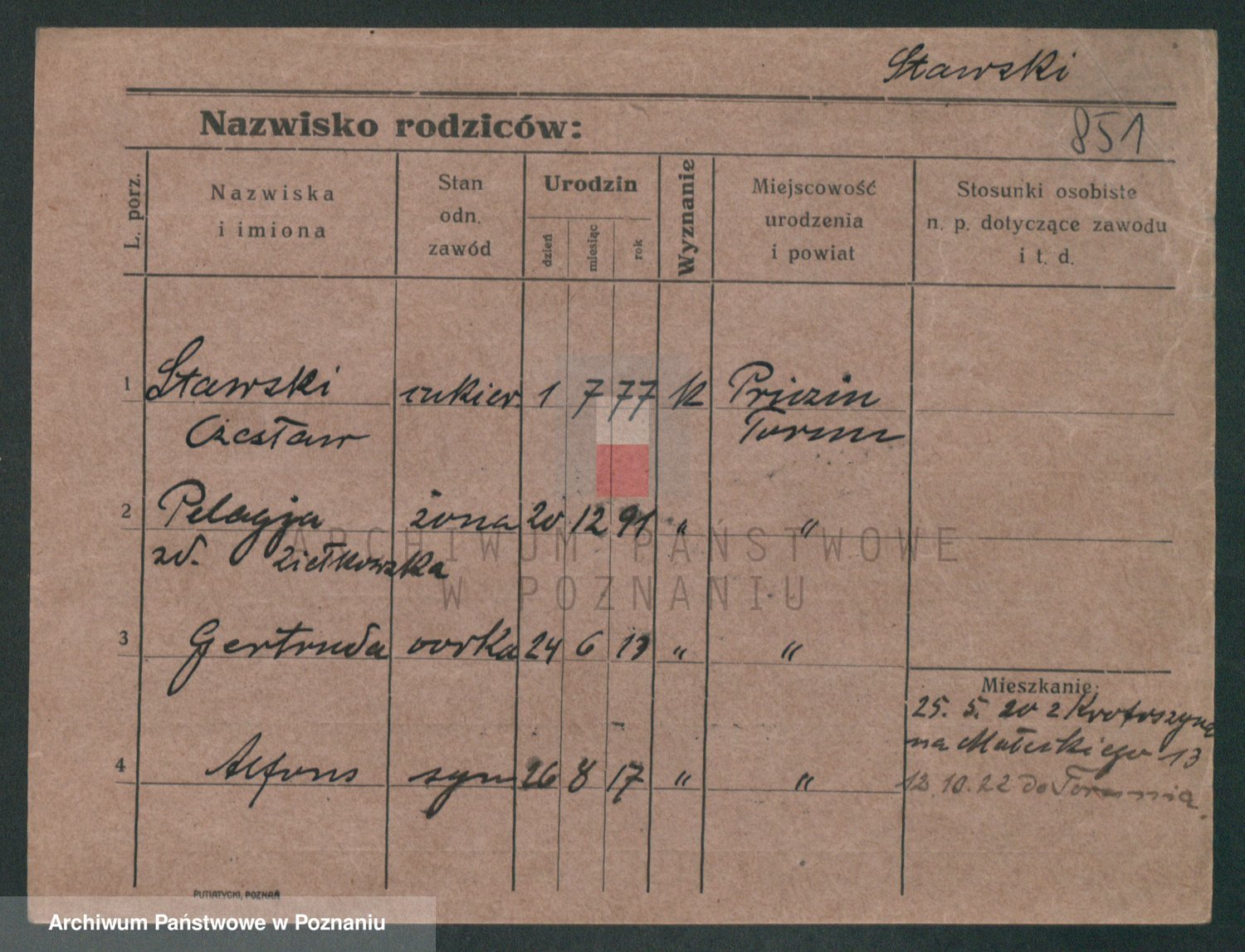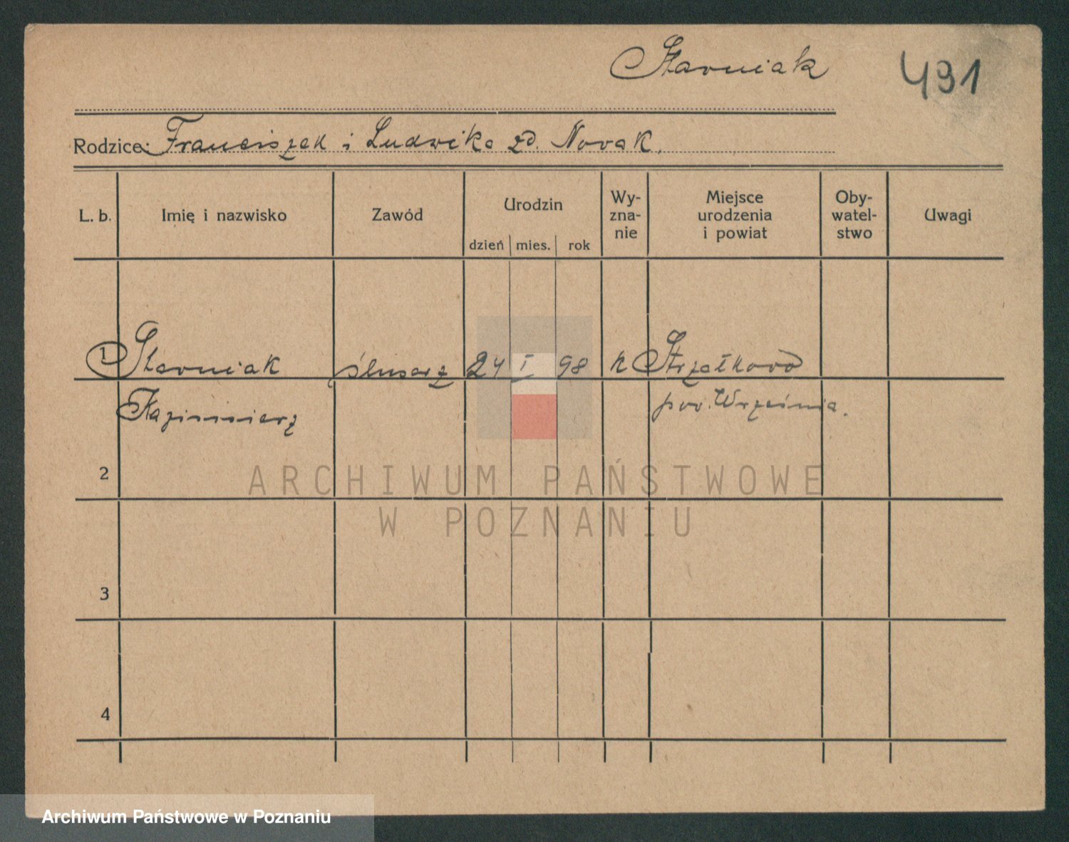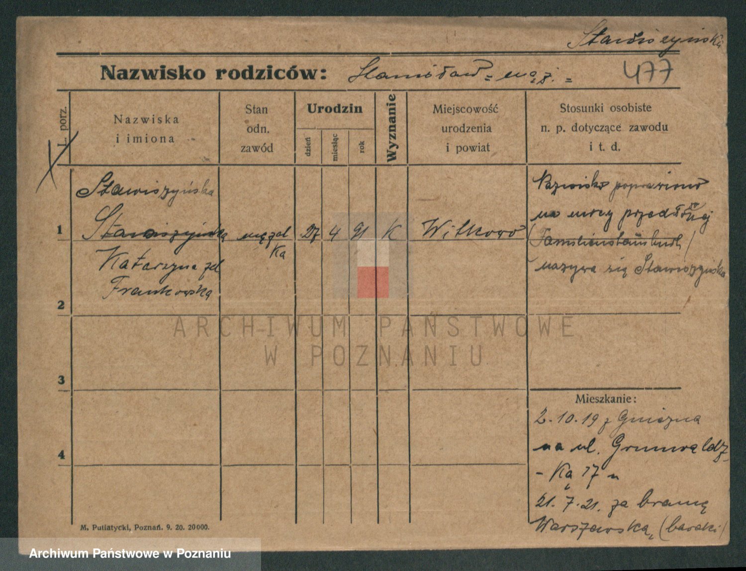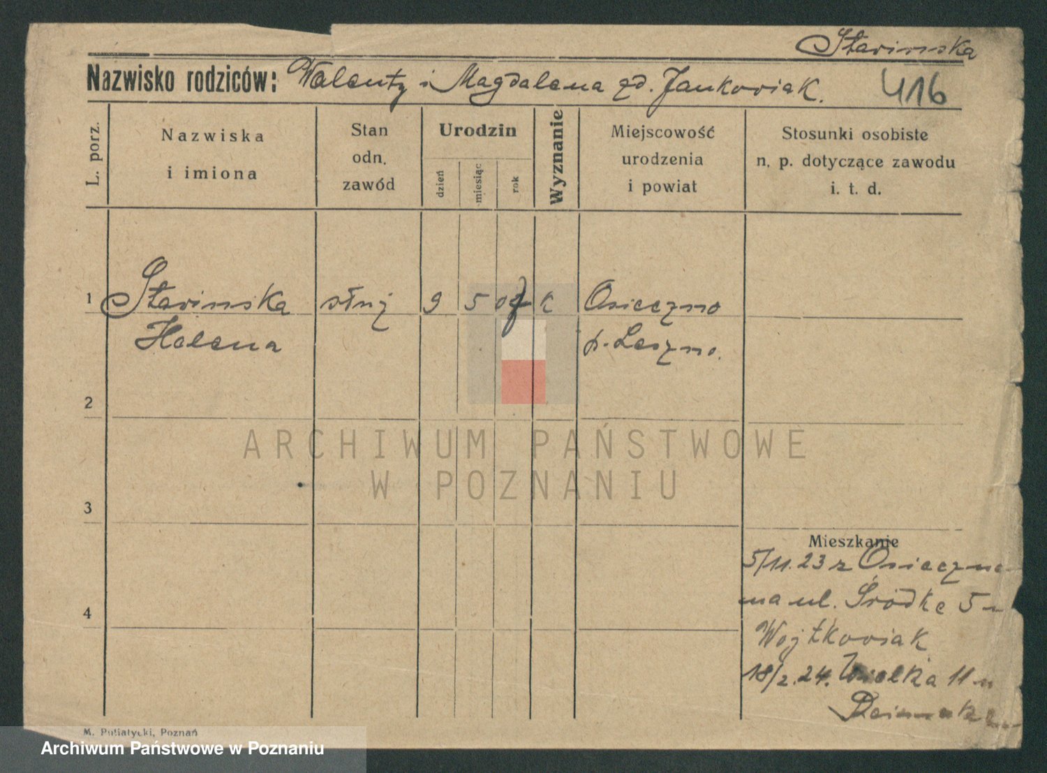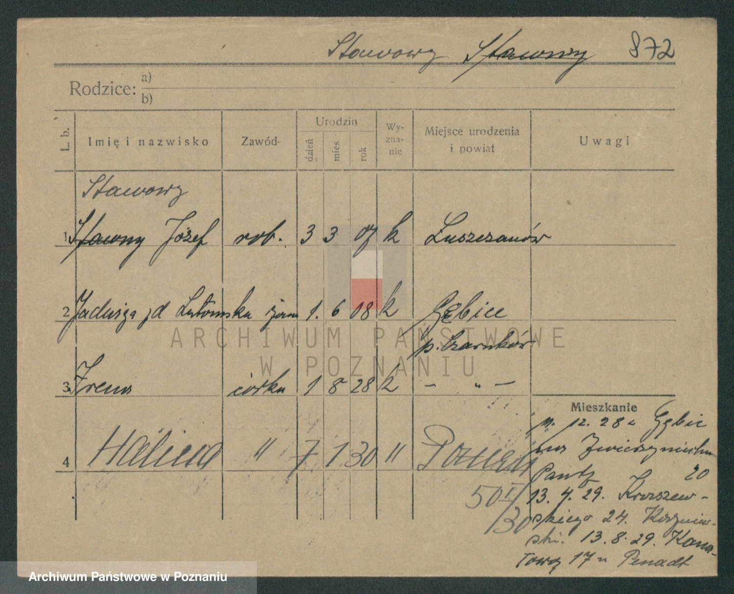Podgląd karty osobowej dostępny jest po kliknięciu na nazwisko lub ikonkę karty. Można dokonywać powiększenia (ikony na górze) lub przechodzić między kolejnymi skanami (strzałki po bokach).