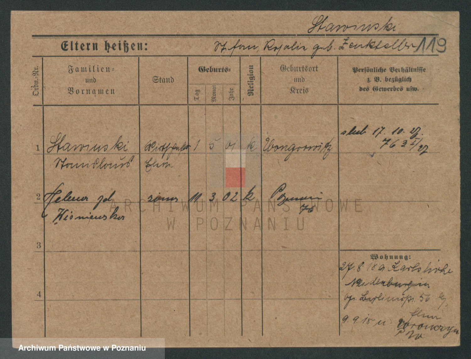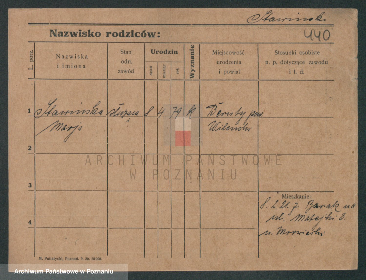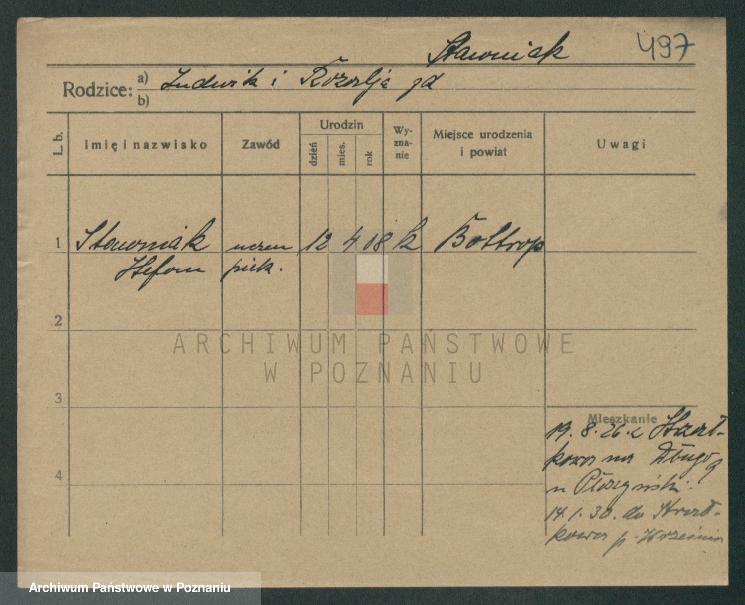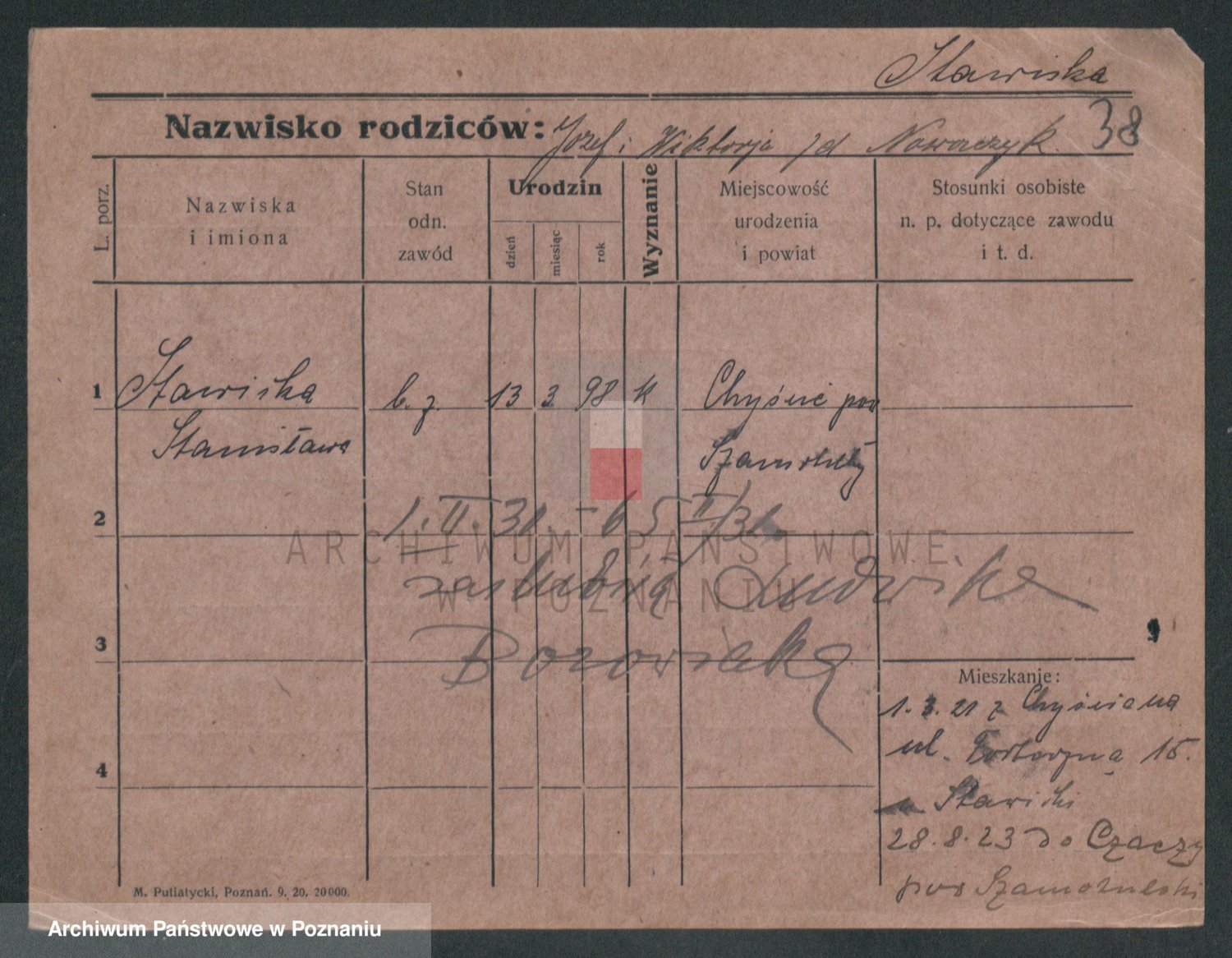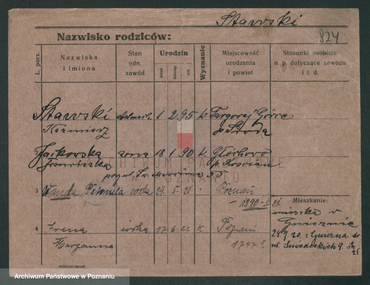 Podgląd karty osobowej dostępny jest po kliknięciu na nazwisko lub ikonkę karty. Można dokonywać powiększenia (ikony na górze) lub przechodzić między kolejnymi skanami (strzałki po bokach).