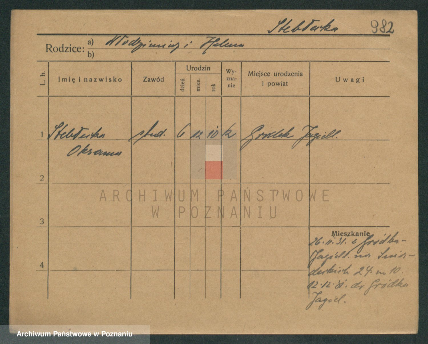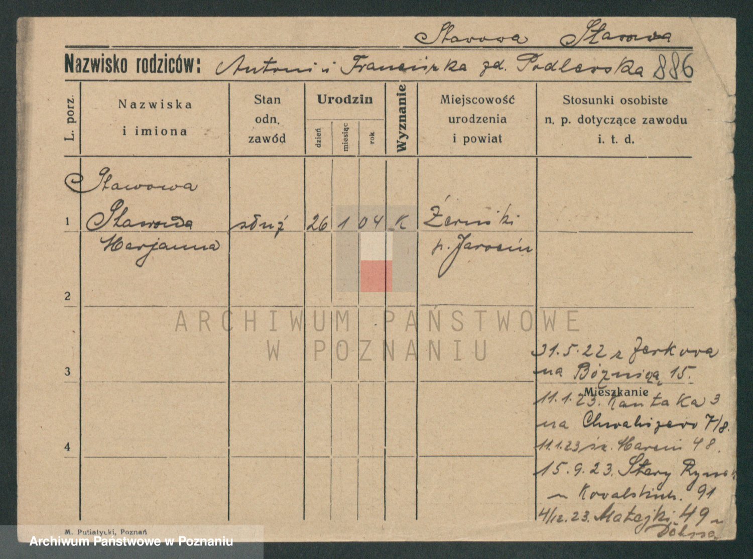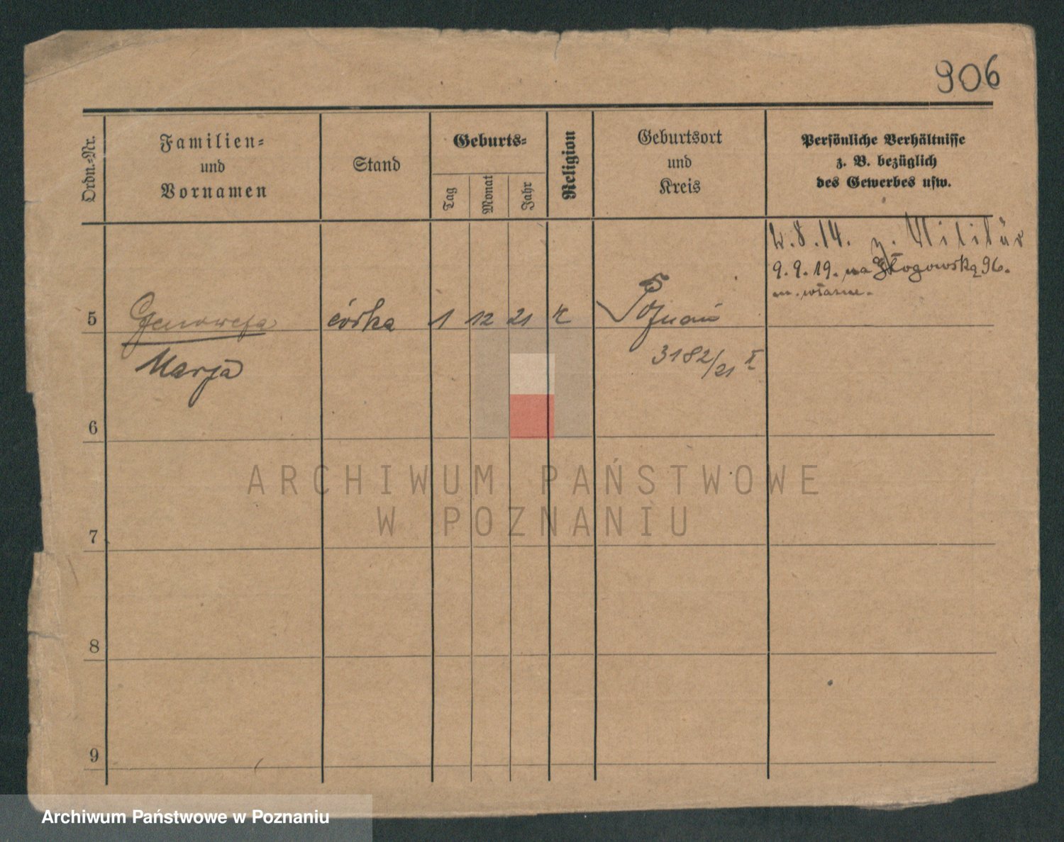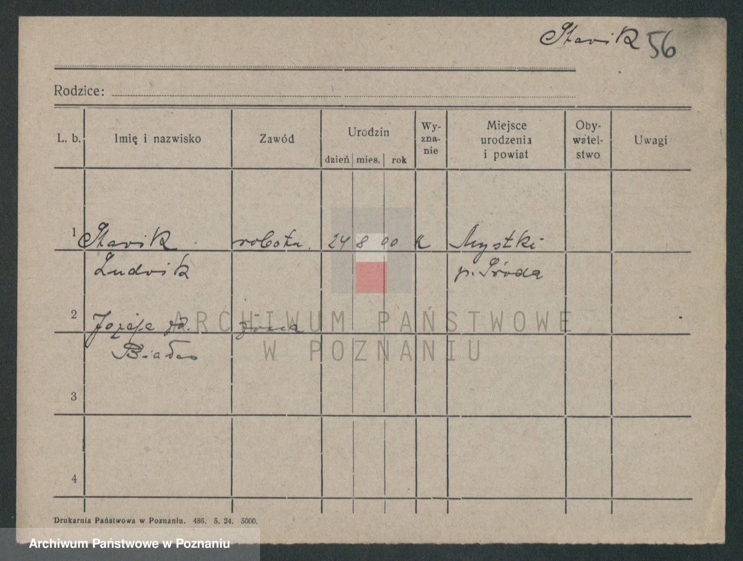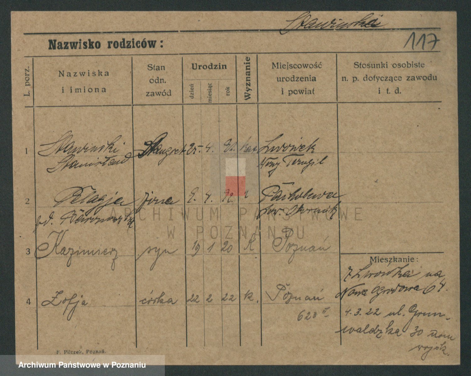 Podgląd karty osobowej dostępny jest po kliknięciu na nazwisko lub ikonkę karty. Można dokonywać powiększenia (ikony na górze) lub przechodzić między kolejnymi skanami (strzałki po bokach).