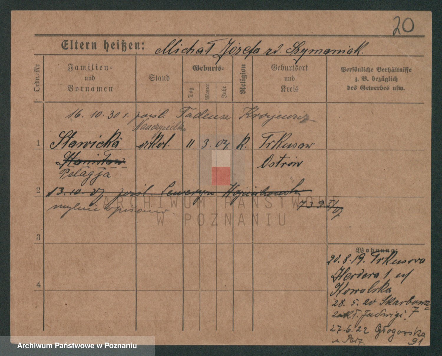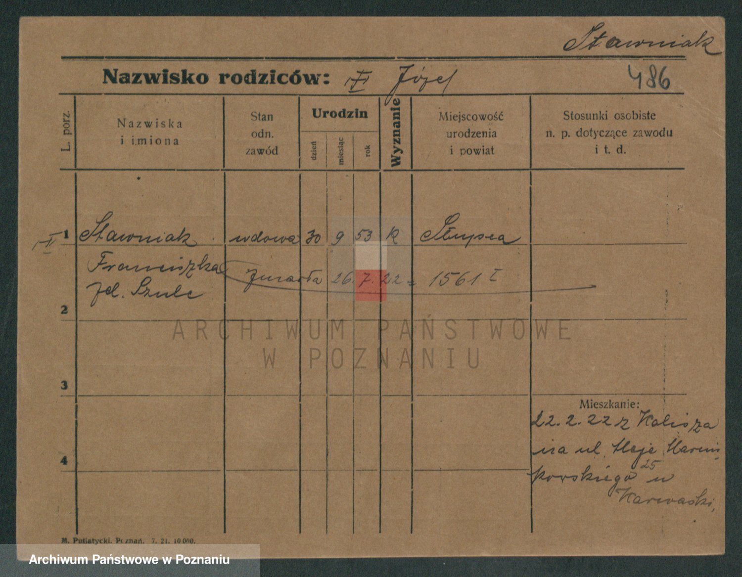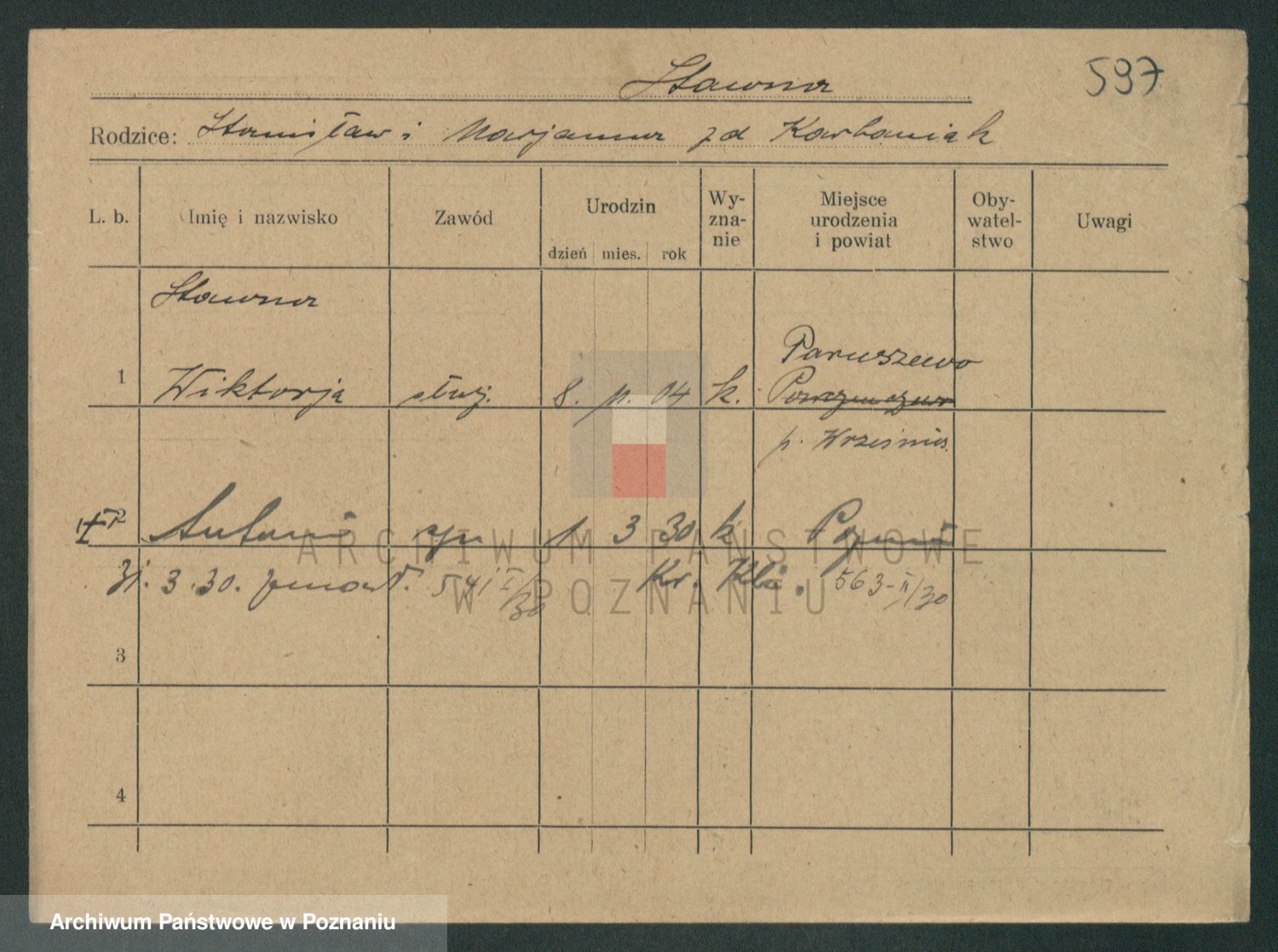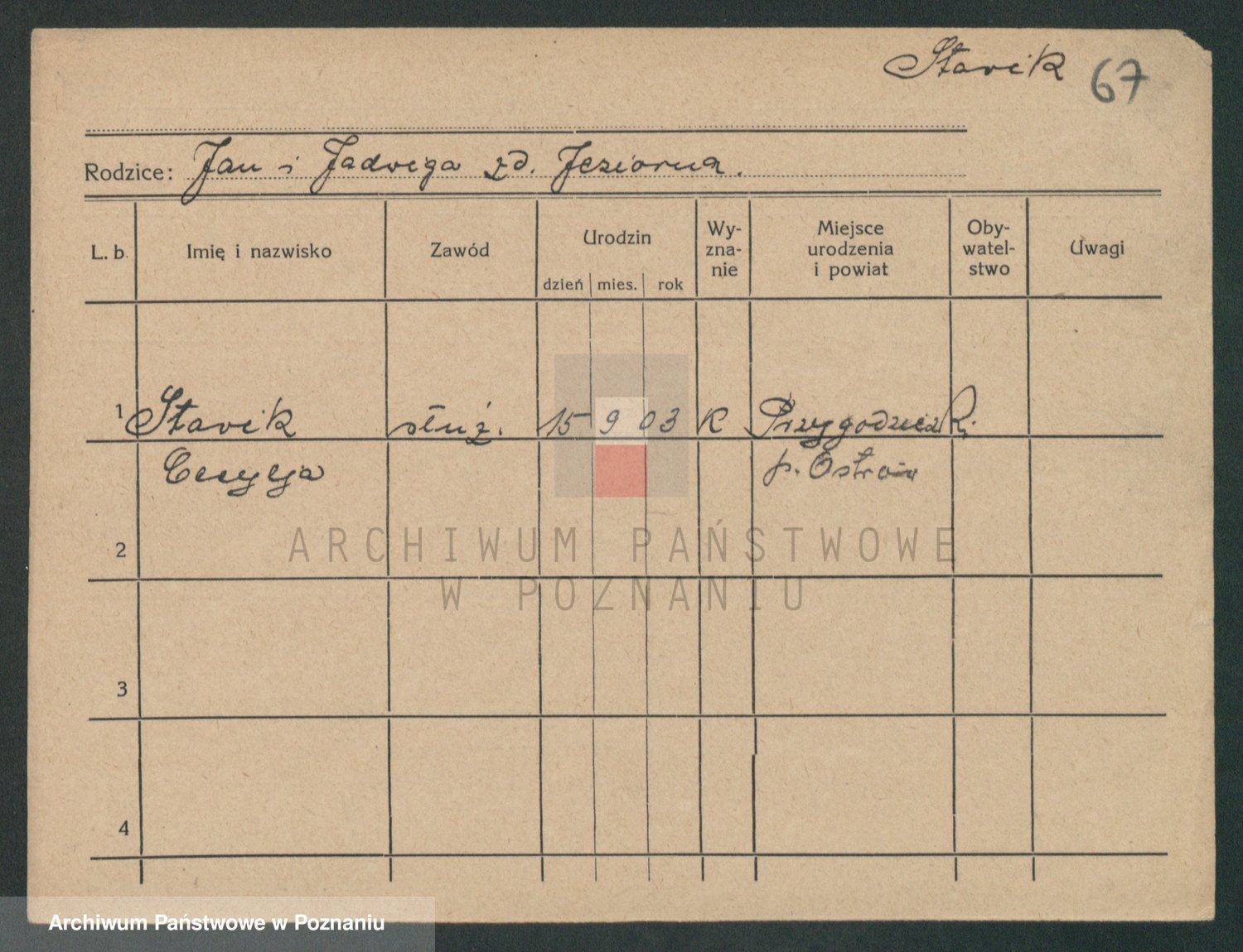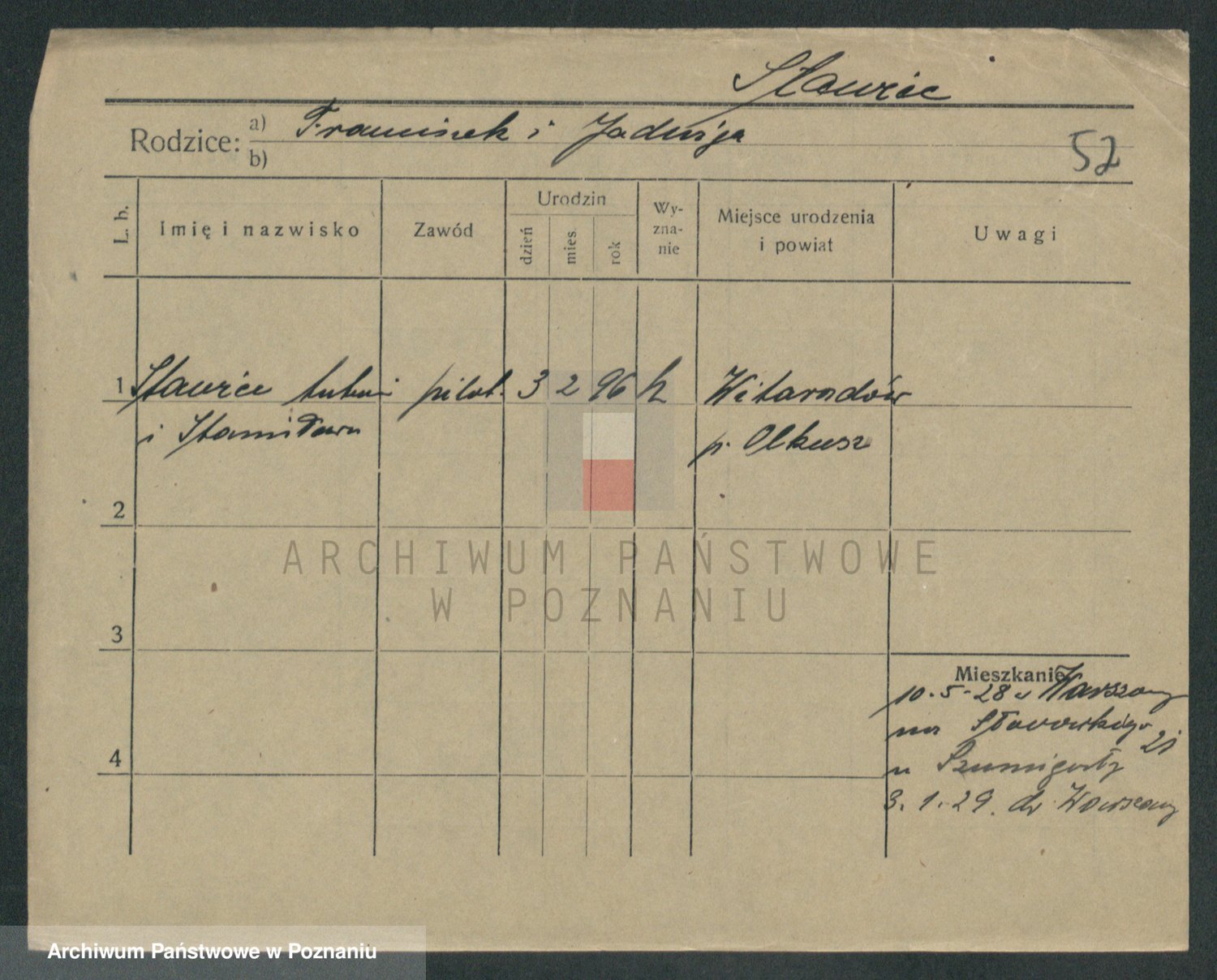 Podgląd karty osobowej dostępny jest po kliknięciu na nazwisko lub ikonkę karty. Można dokonywać powiększenia (ikony na górze) lub przechodzić między kolejnymi skanami (strzałki po bokach).