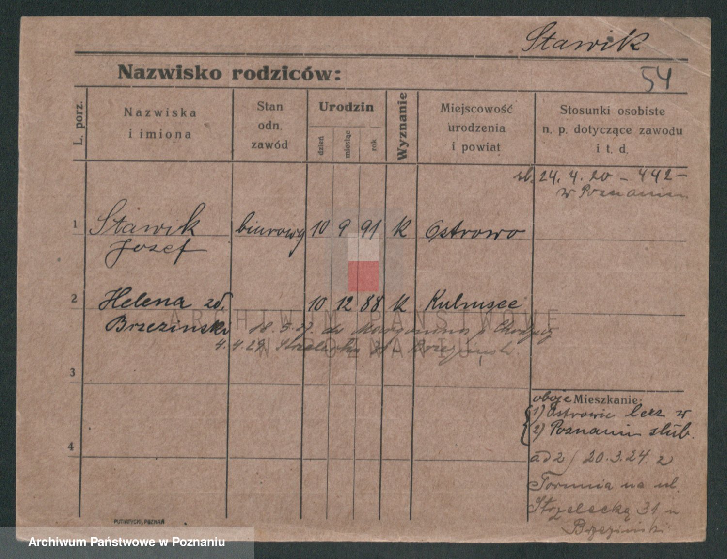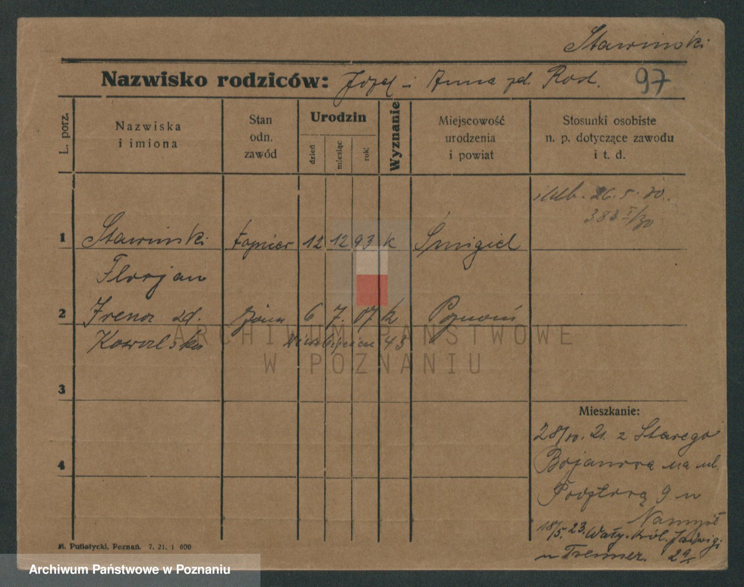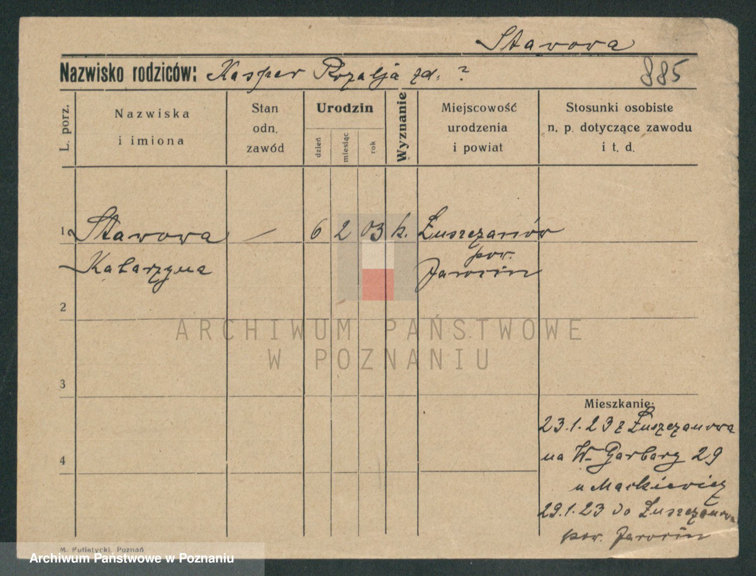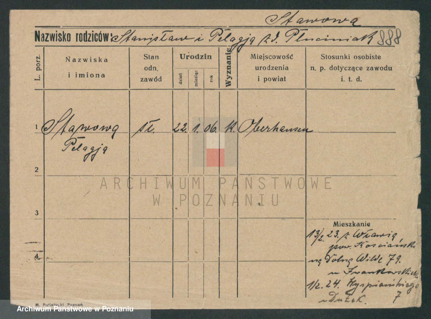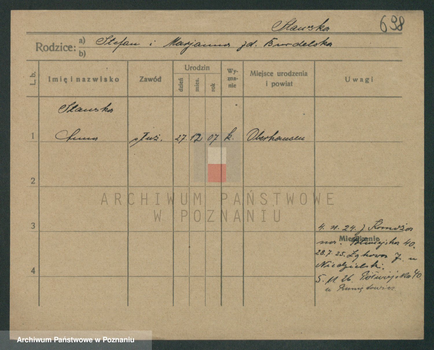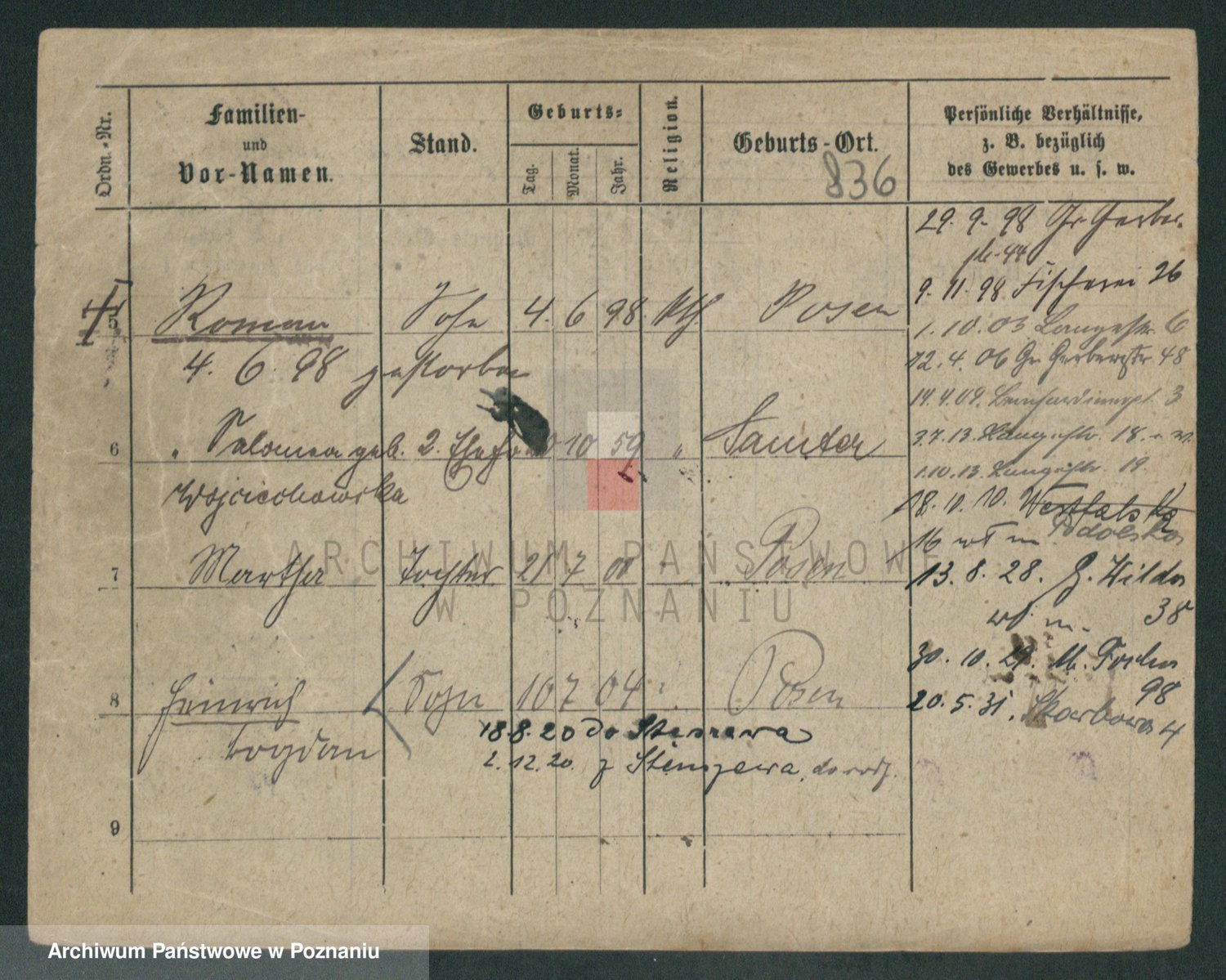 Podgląd karty osobowej dostępny jest po kliknięciu na nazwisko lub ikonkę karty. Można dokonywać powiększenia (ikony na górze) lub przechodzić między kolejnymi skanami (strzałki po bokach).