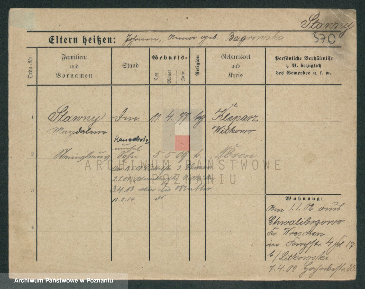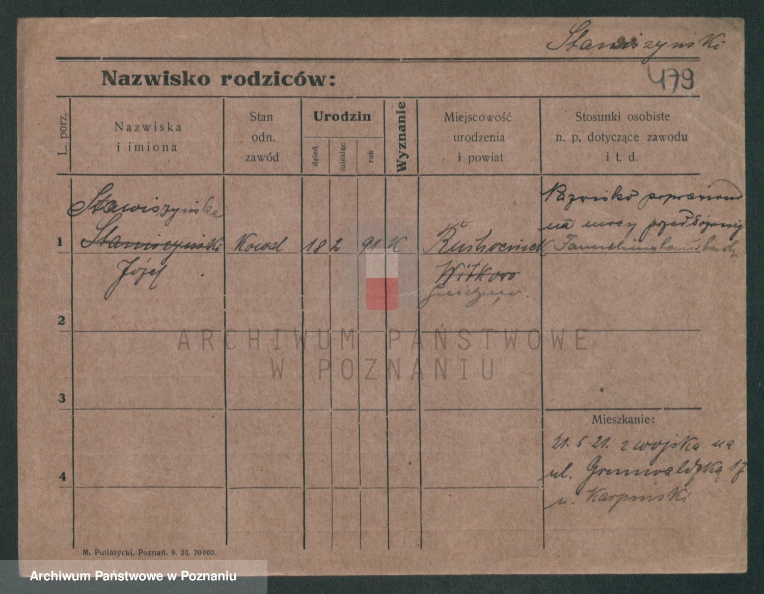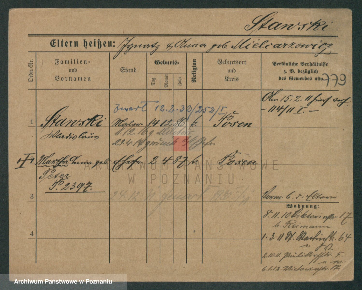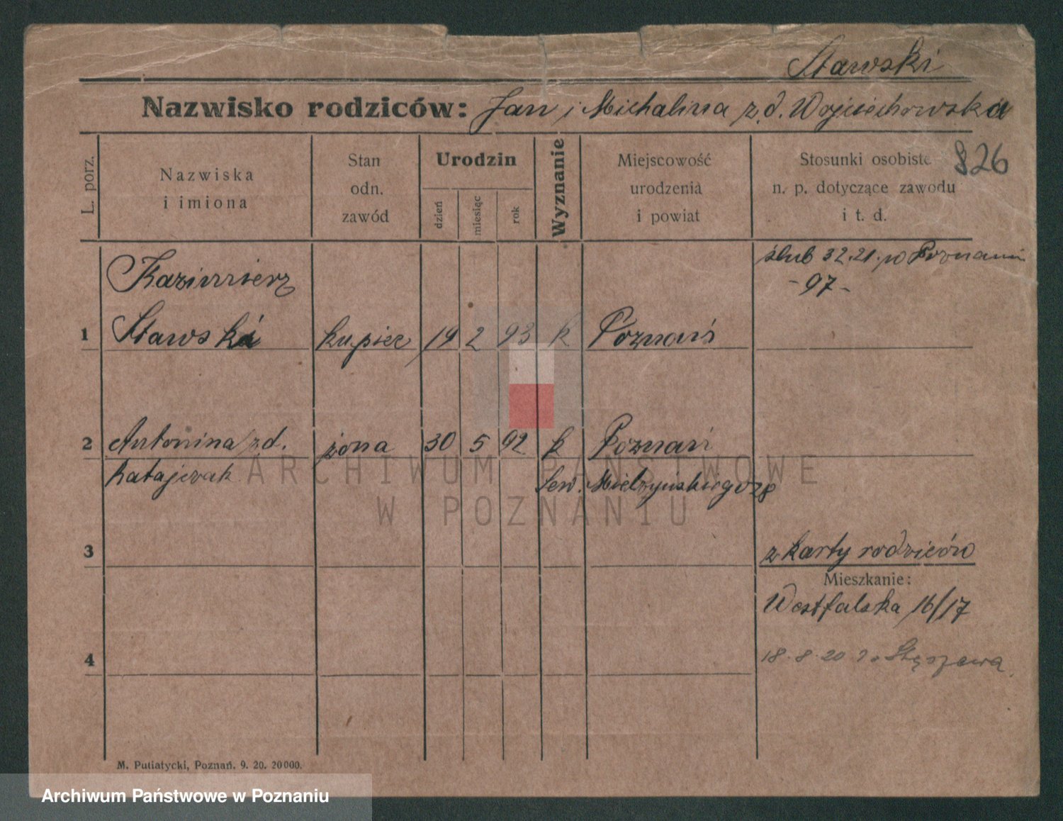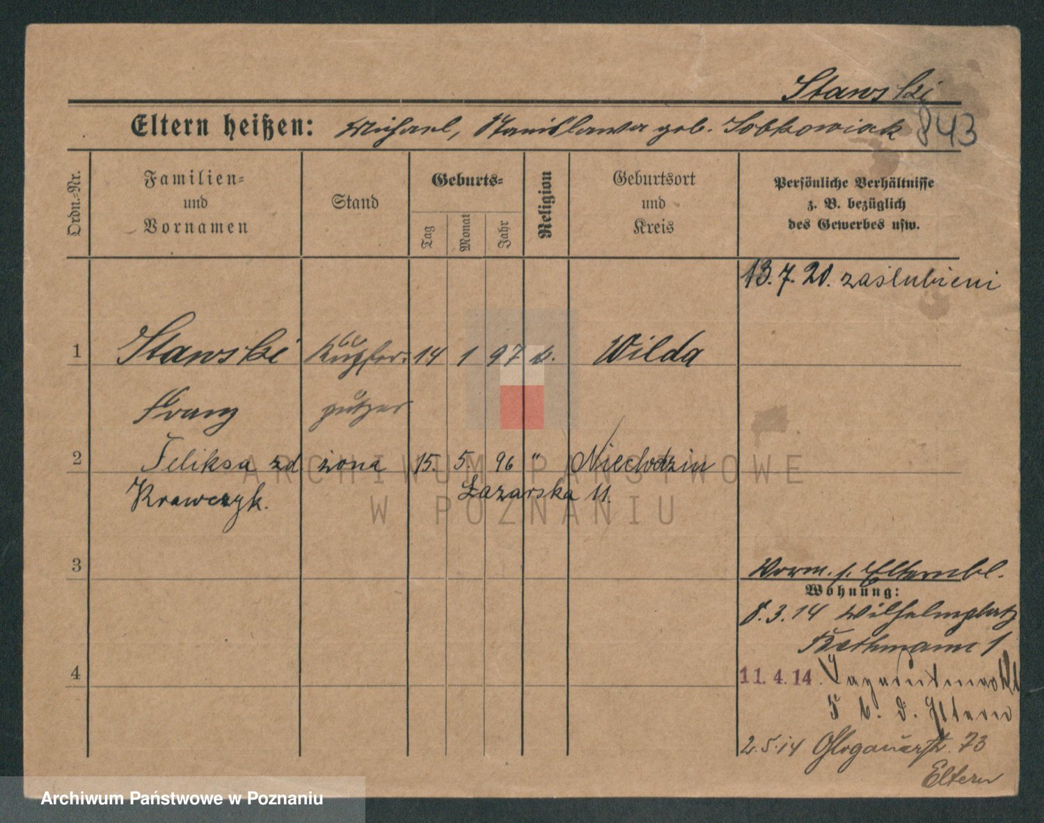 Podgląd karty osobowej dostępny jest po kliknięciu na nazwisko lub ikonkę karty. Można dokonywać powiększenia (ikony na górze) lub przechodzić między kolejnymi skanami (strzałki po bokach).