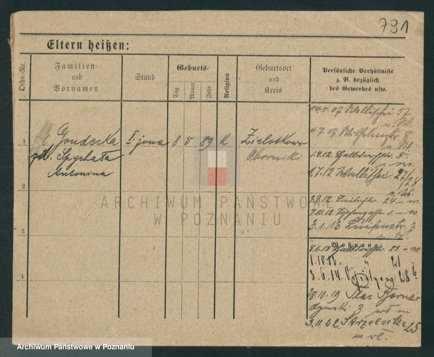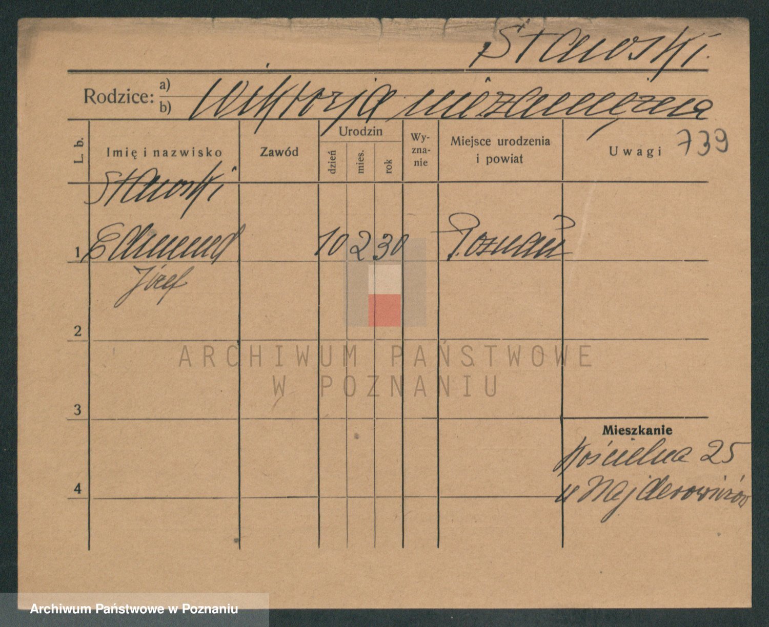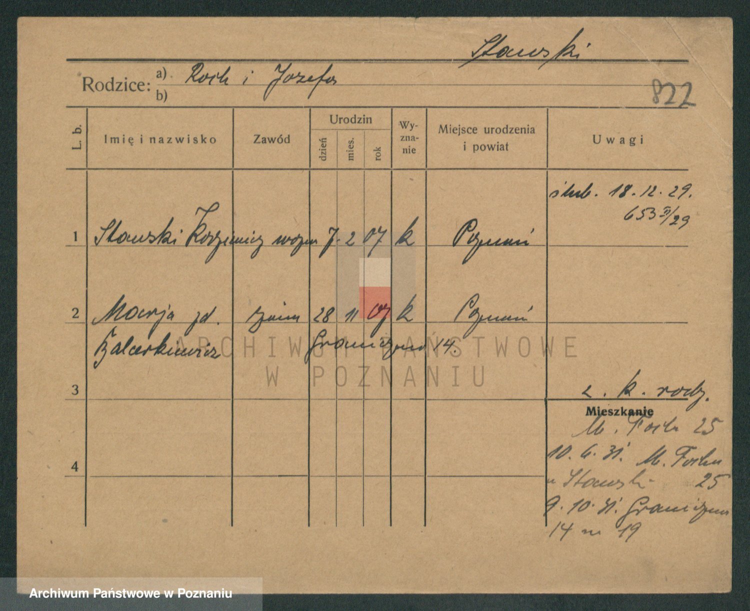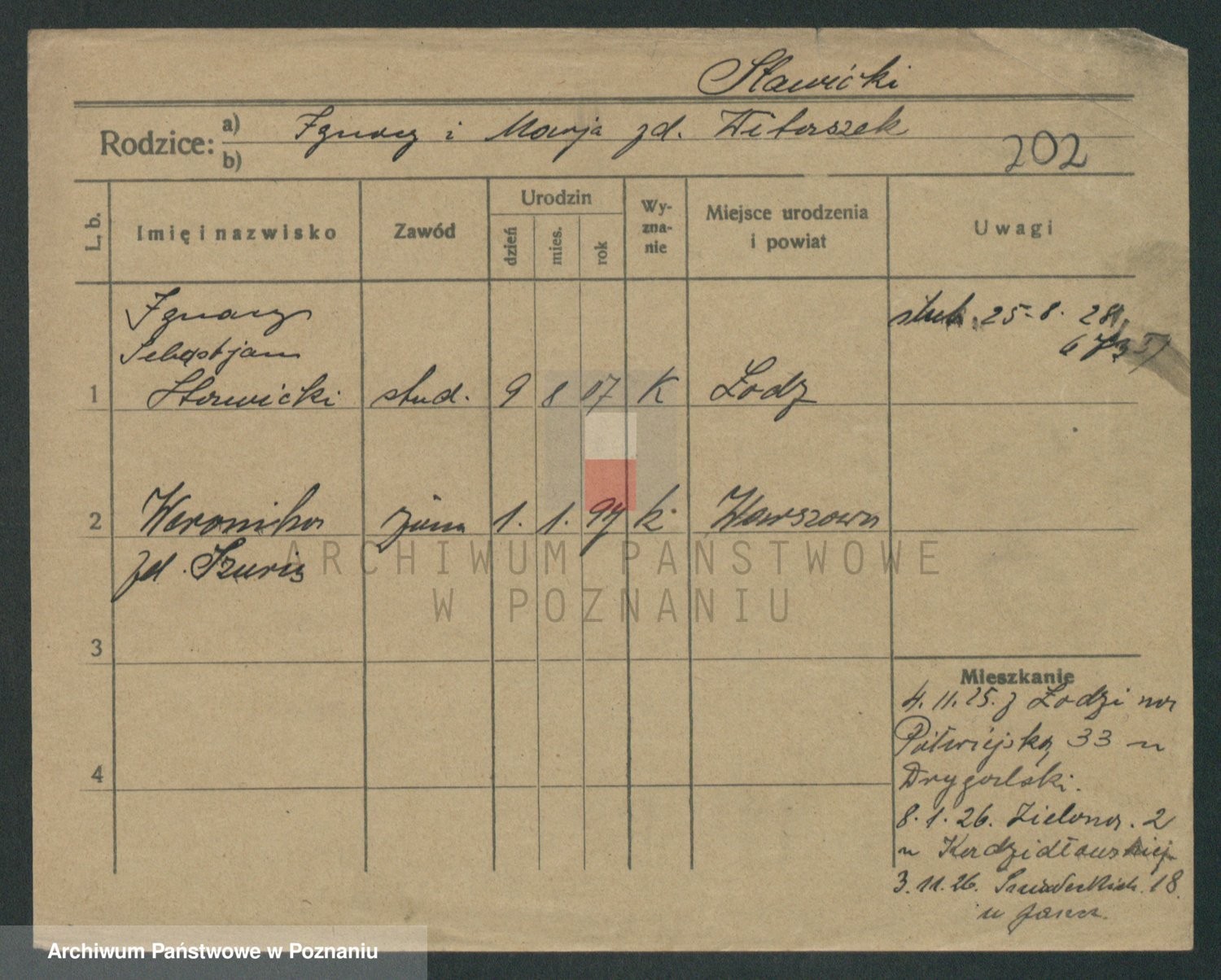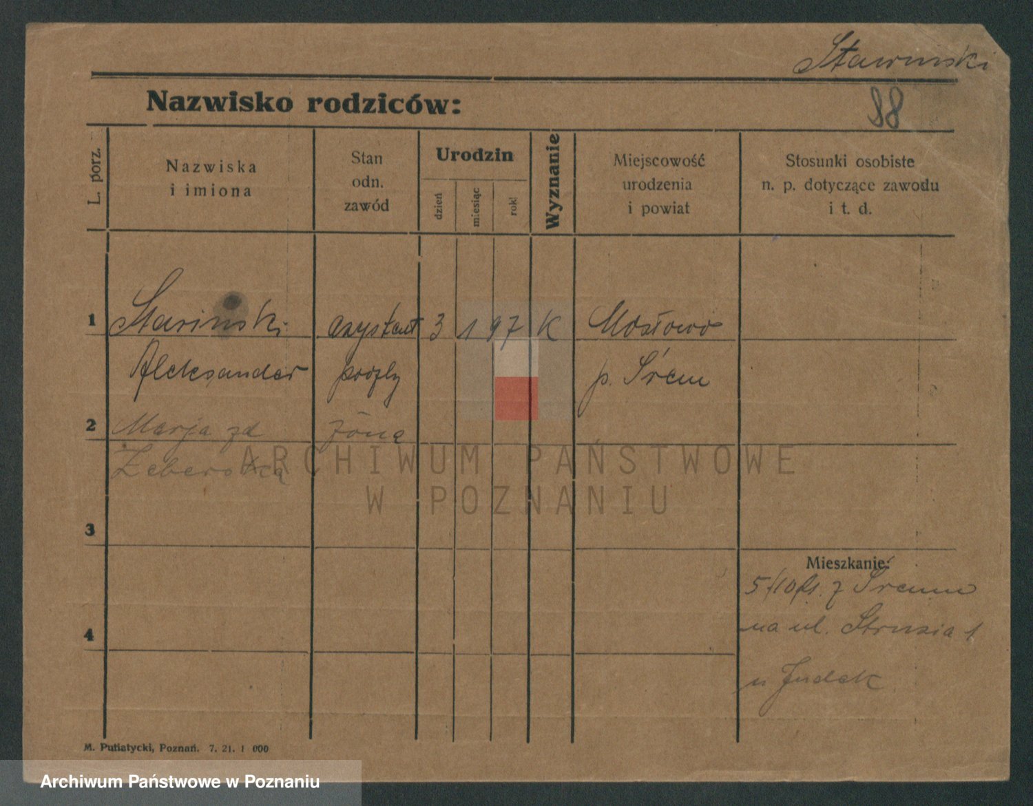 Podgląd karty osobowej dostępny jest po kliknięciu na nazwisko lub ikonkę karty. Można dokonywać powiększenia (ikony na górze) lub przechodzić między kolejnymi skanami (strzałki po bokach).