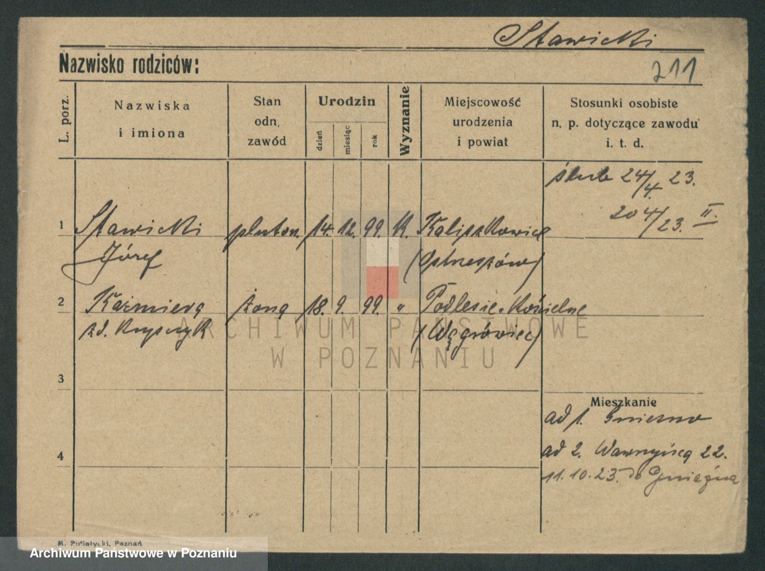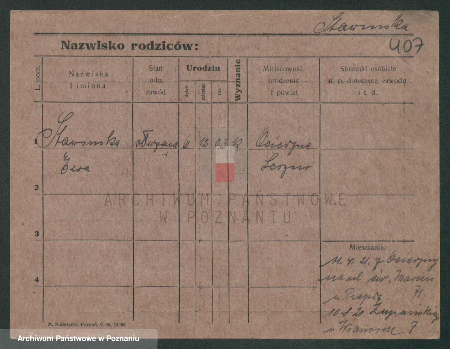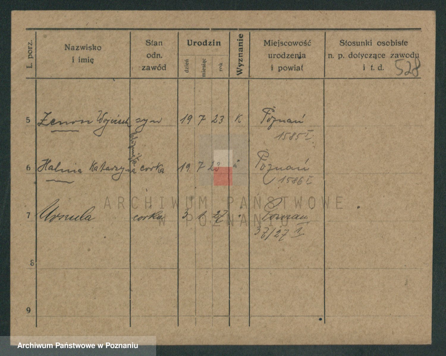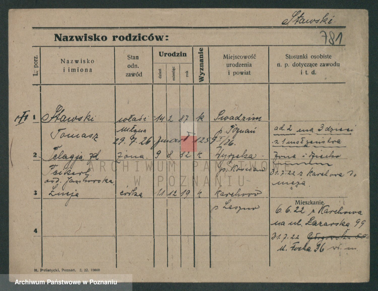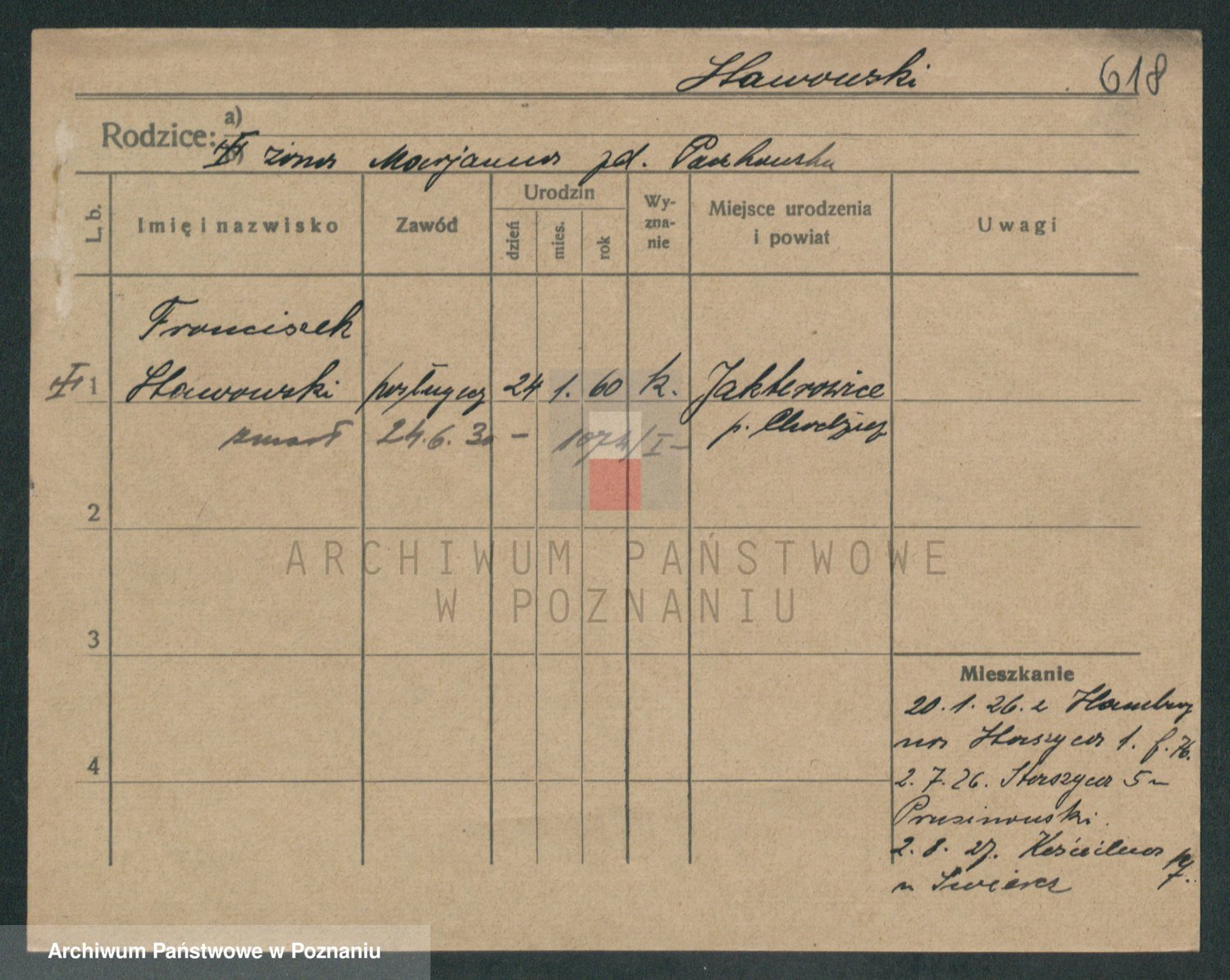Podgląd karty osobowej dostępny jest po kliknięciu na nazwisko lub ikonkę karty. Można dokonywać powiększenia (ikony na górze) lub przechodzić między kolejnymi skanami (strzałki po bokach).