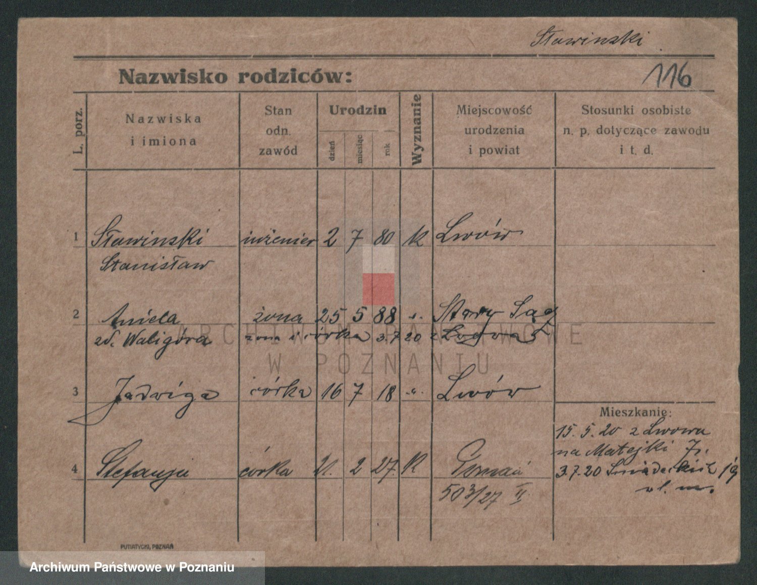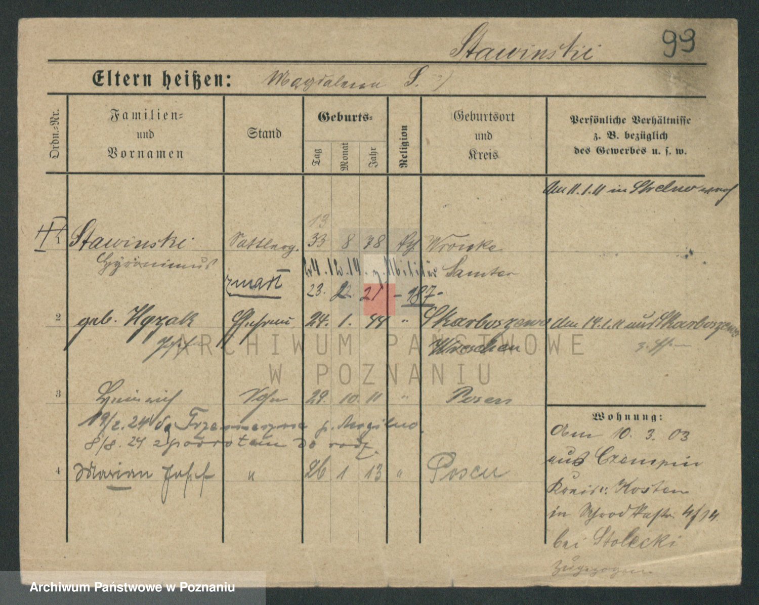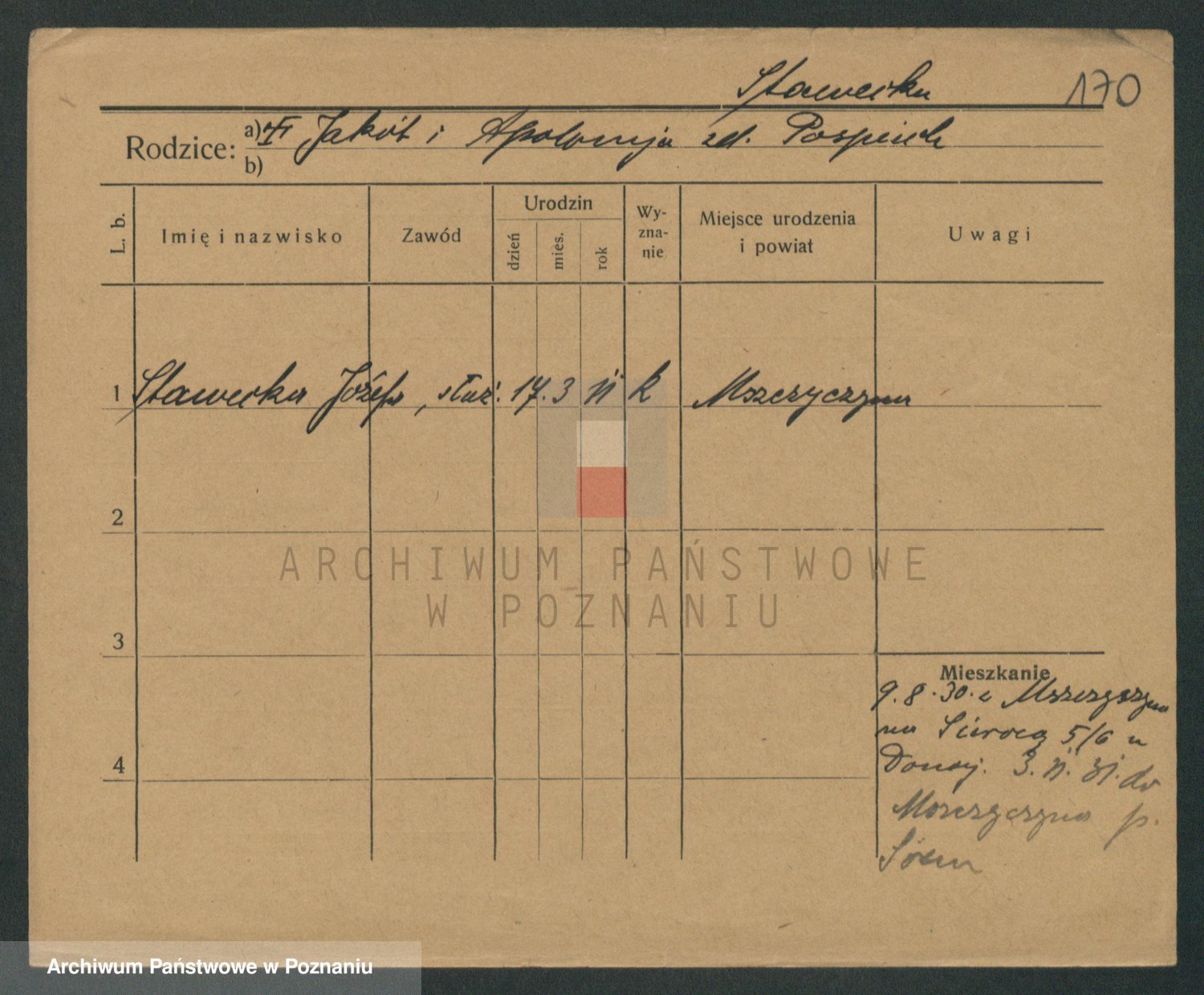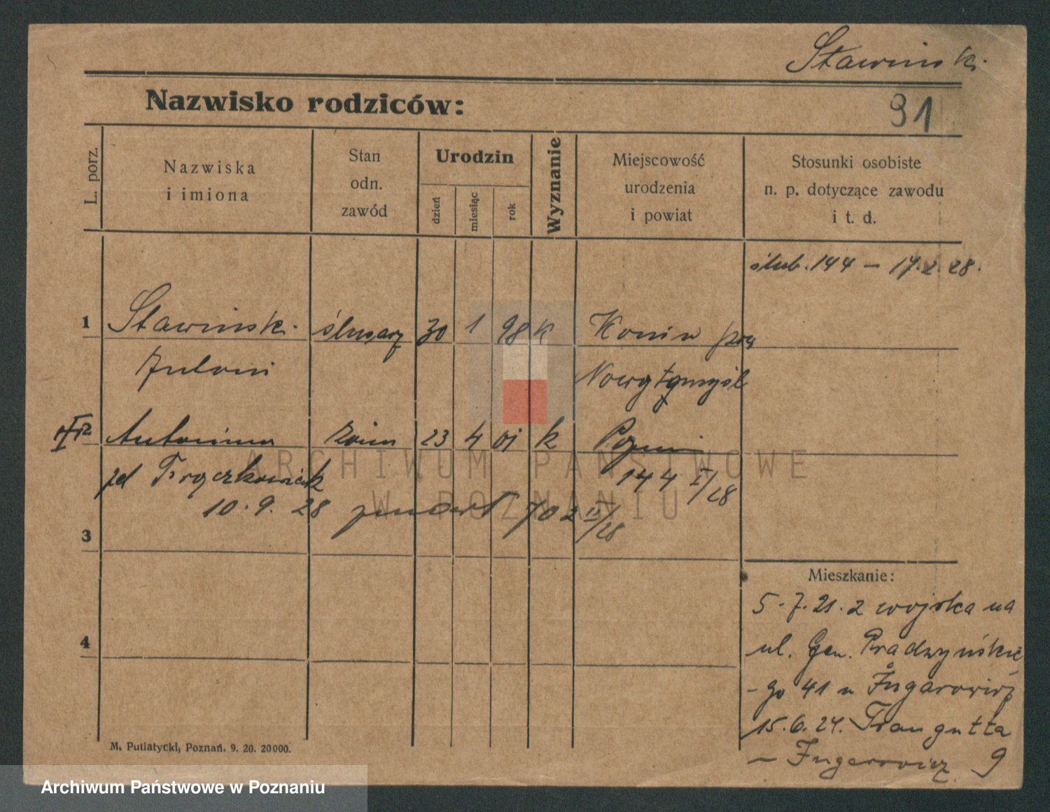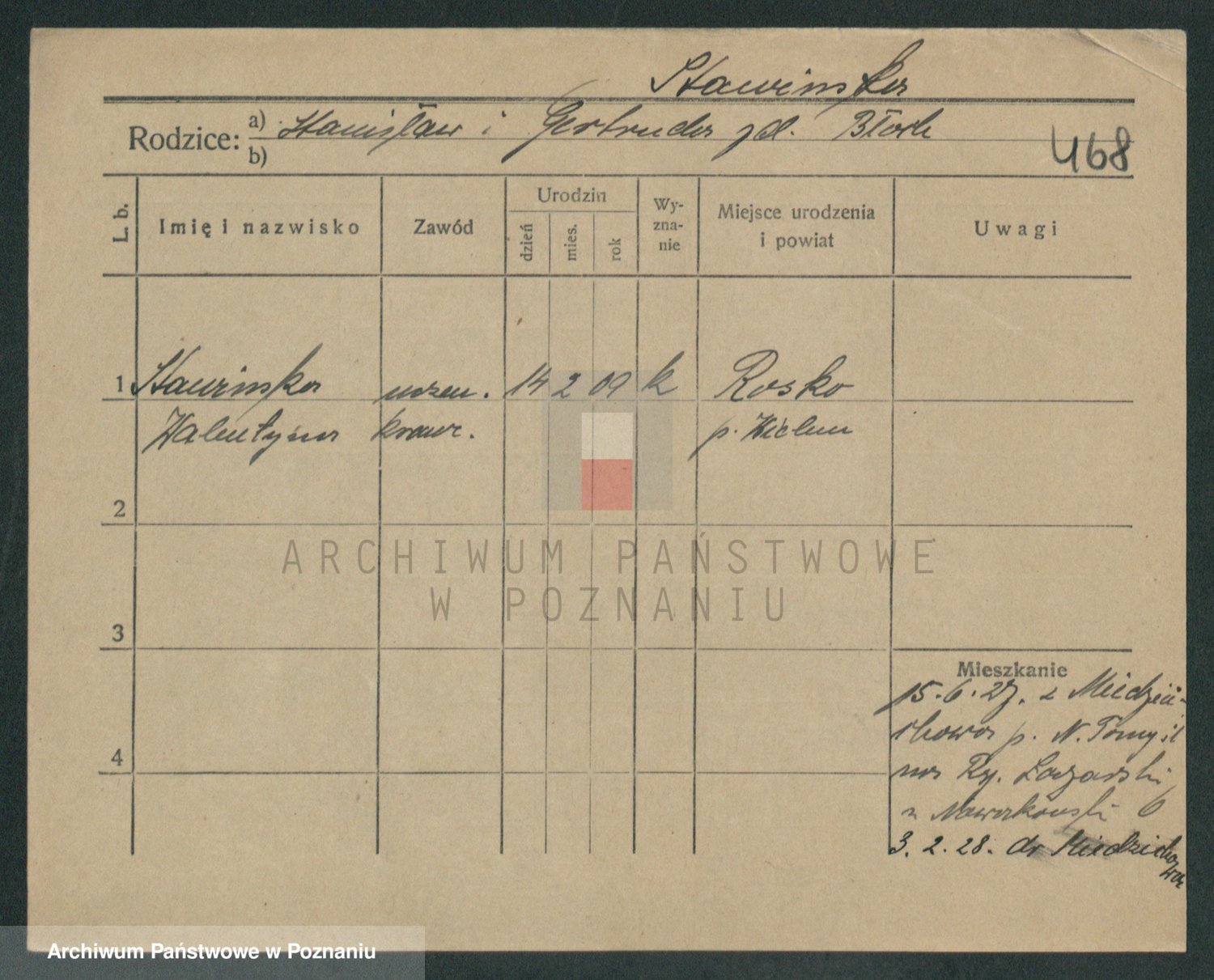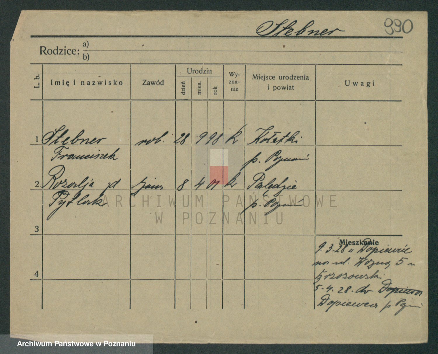 Podgląd karty osobowej dostępny jest po kliknięciu na nazwisko lub ikonkę karty. Można dokonywać powiększenia (ikony na górze) lub przechodzić między kolejnymi skanami (strzałki po bokach).